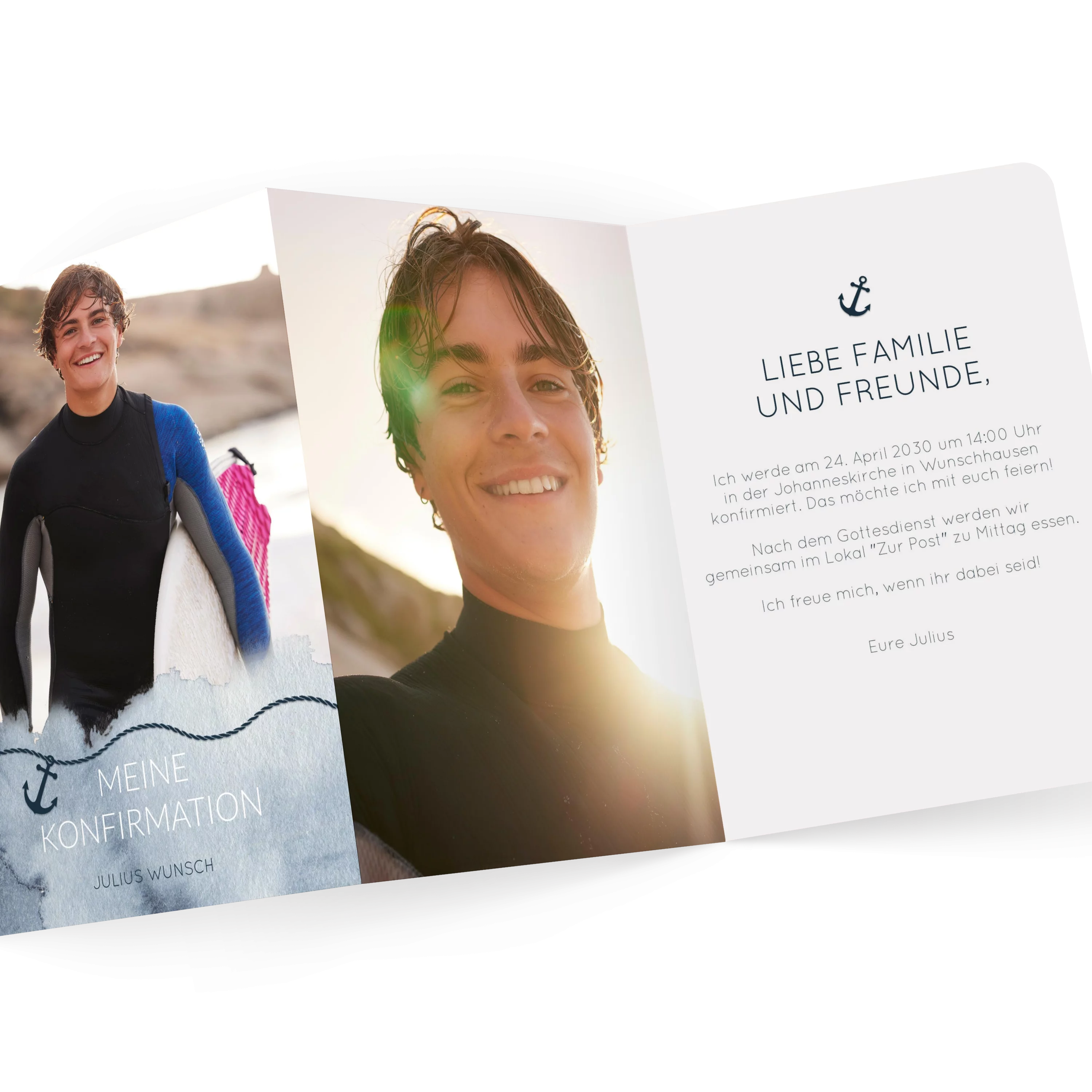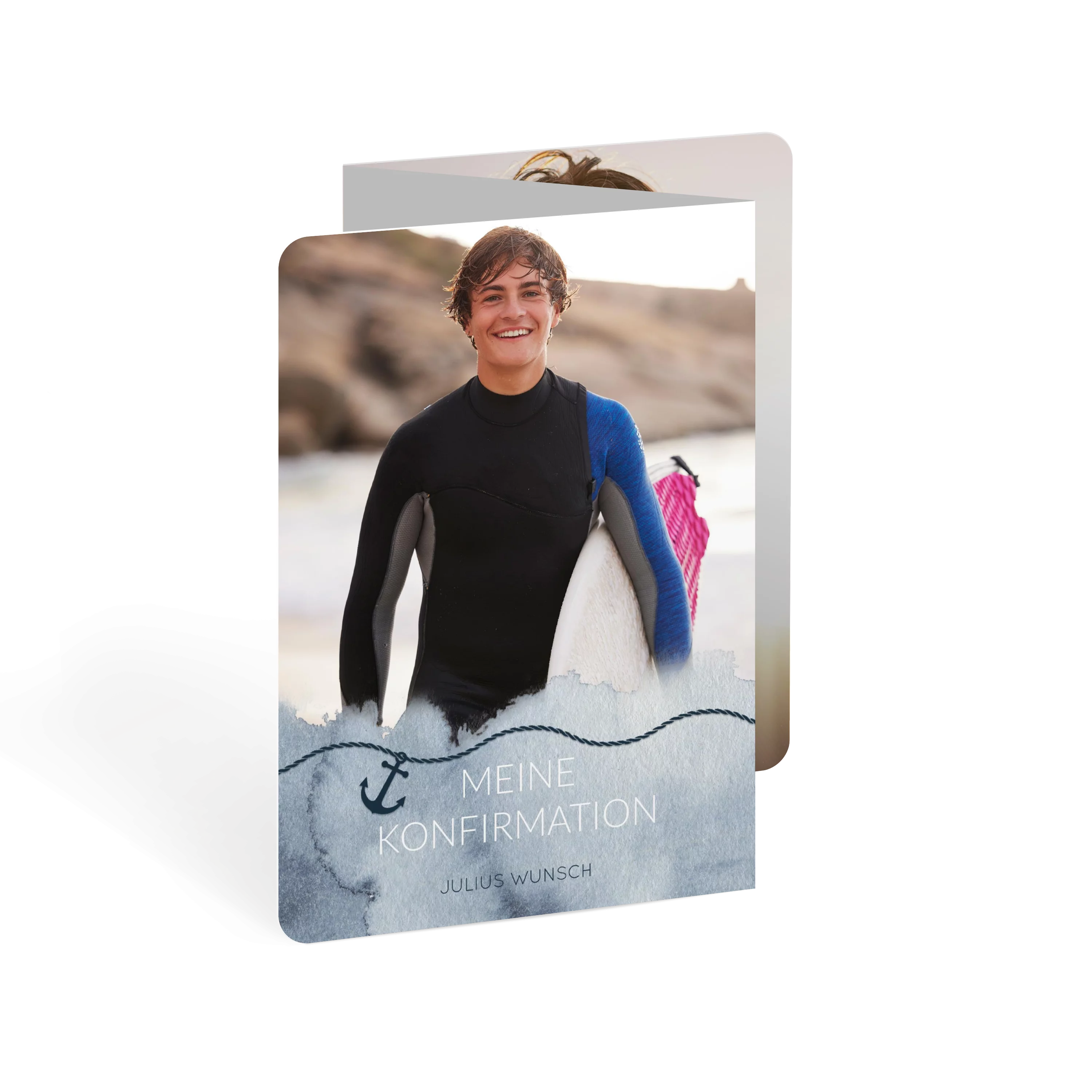 Ein Aquarellmeer mit einem kleinen Anker als Symbolmotiv bietet Platz für einen Schriftzug zur Konfirmation. Die sanften Blautöne geben der Karte eine leichte, maritime Note. Innen bleibt ebenfalls Platz für ein weiteres Foto.