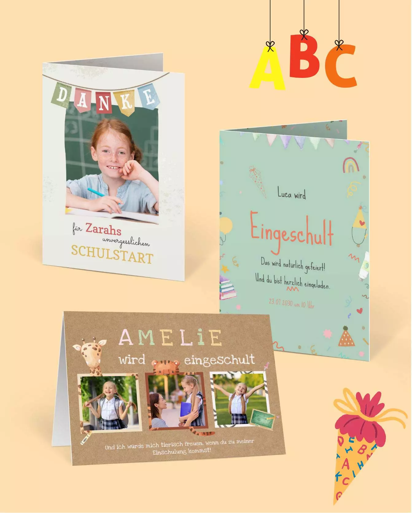Der Schulanfang naht und Ihr Kind steht in den Startlöchern für den ersten Schultag. Im Handumdrehen wird es zu einer kleinen ABC-Held*in werden und die ersten Rechenaufgaben lösen. Die Schuleinführung ist sowohl für angehende Schulkinder als auch für Sie ein bedeutender Tag, denn ein ganz neuer Lebensabschnitt beginnt. Mit jedem Tag, den der erste Schultag näher rückt, steigt die Aufregung und die Vorfreude auf die Schuleinführung. Mit originellen Einschulungskarten wird dieser bedeutsame Tag garantiert unvergesslich: Versenden Sie zauberhafte Einschulungskarten an Freunde, die Nachbarschaft und die Familie und laden Sie sie mit einzigartigen selbstgestalteten Einladungen zur Einschulung ein oder bedanken Sie sich mit Dankeskarten zur Einschulung bei allen, die Ihrem Schulkind gratuliert haben.