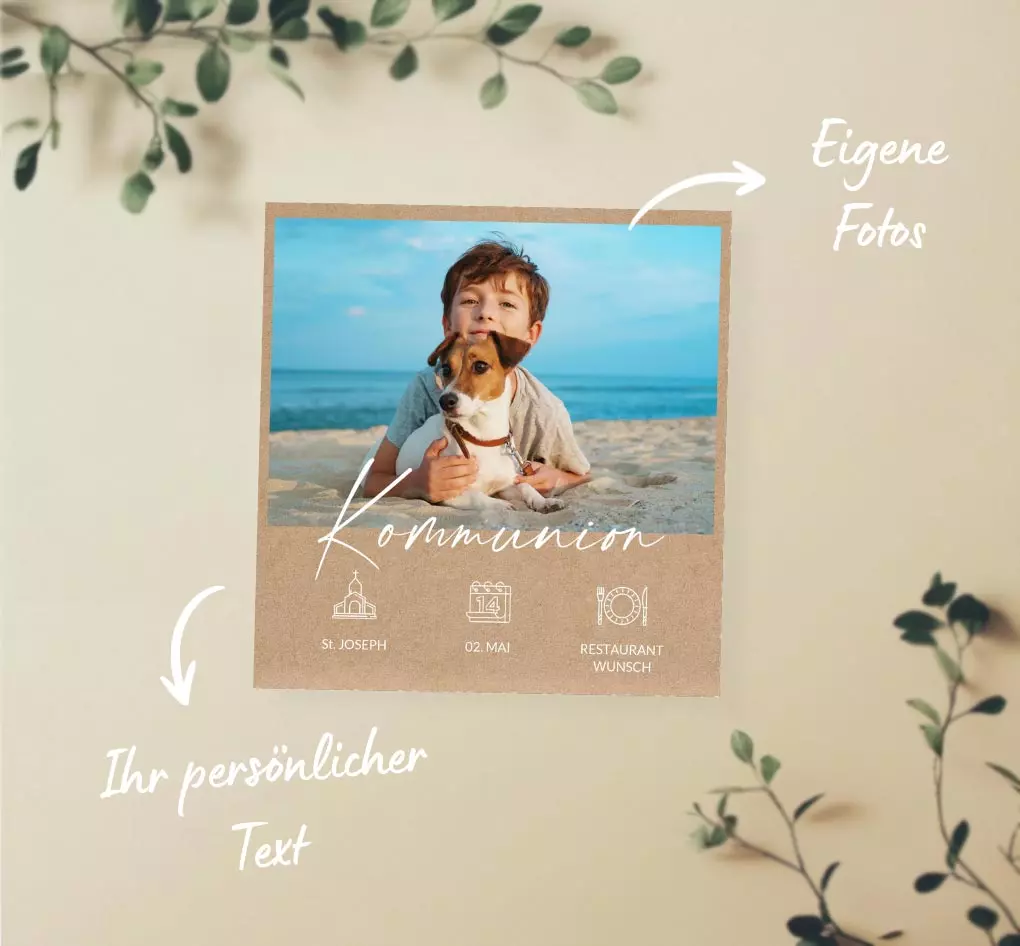 - Persönliche Gestaltung: Die folgenden Gestaltungsmöglichkeiten machen Ihre Karten zur Kommunion individuell und verleihen Persönlichkeit: