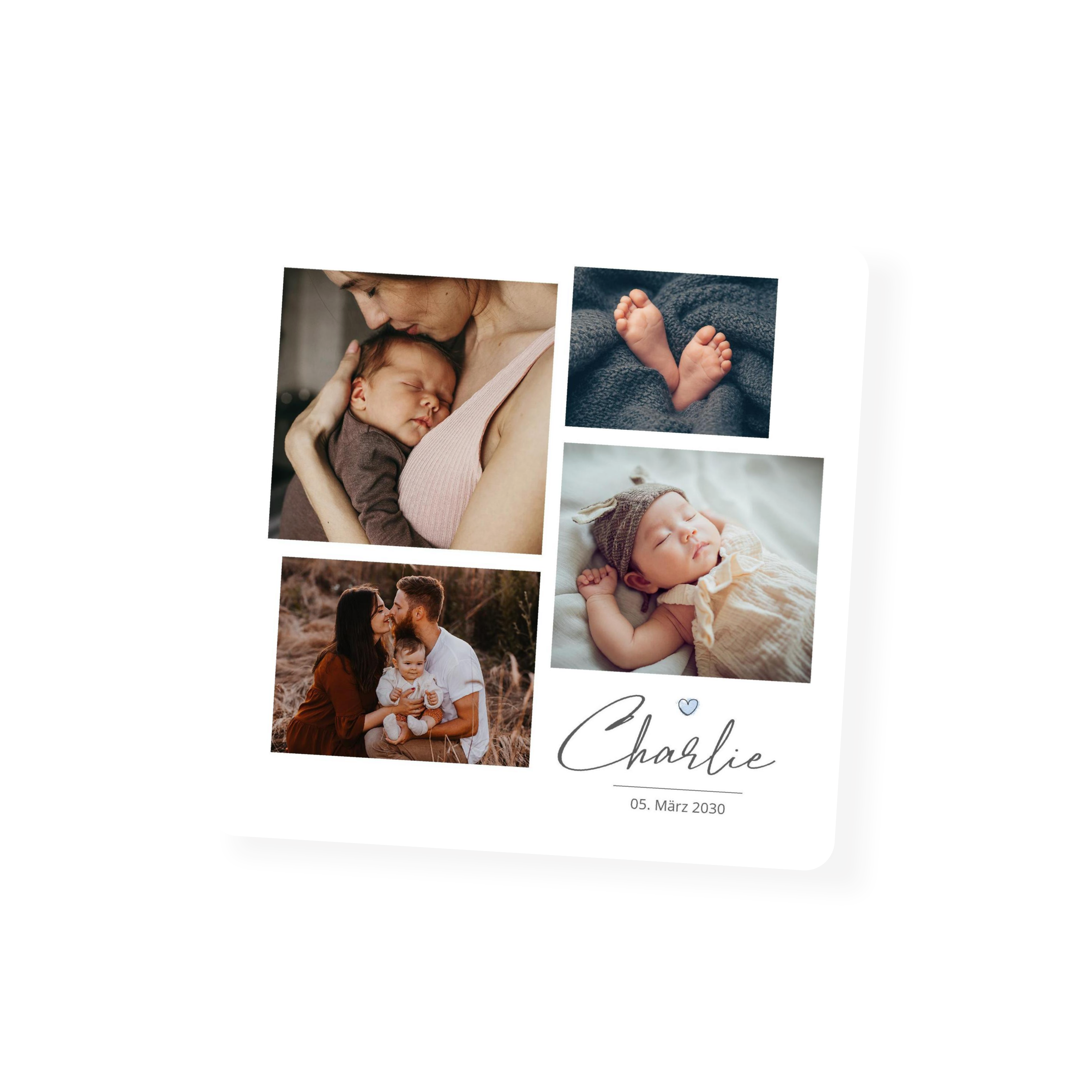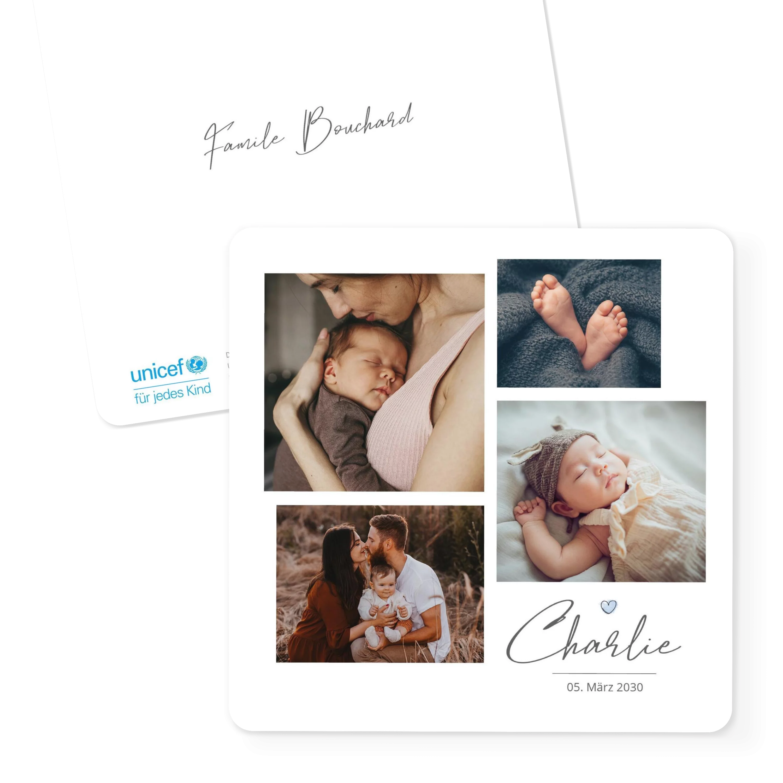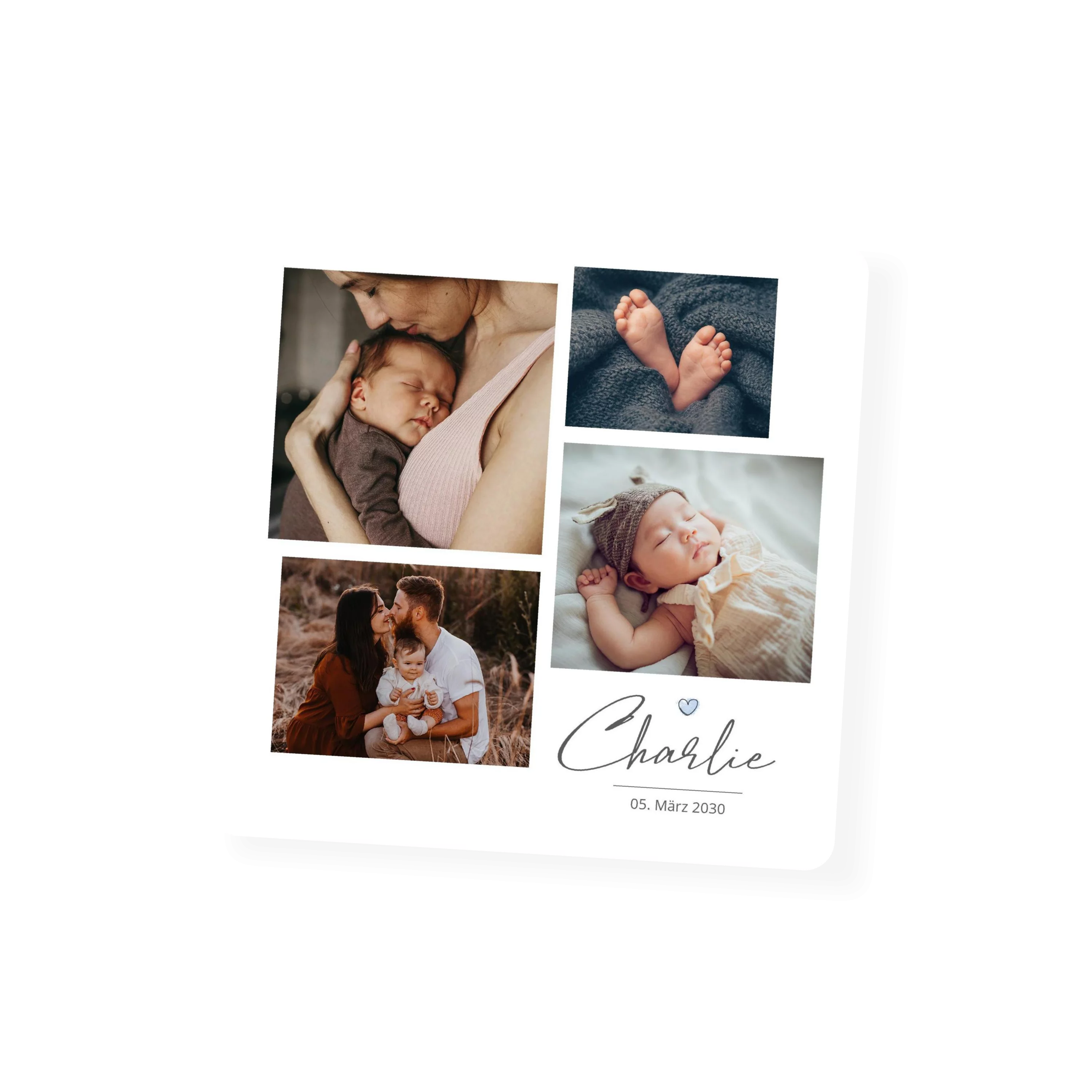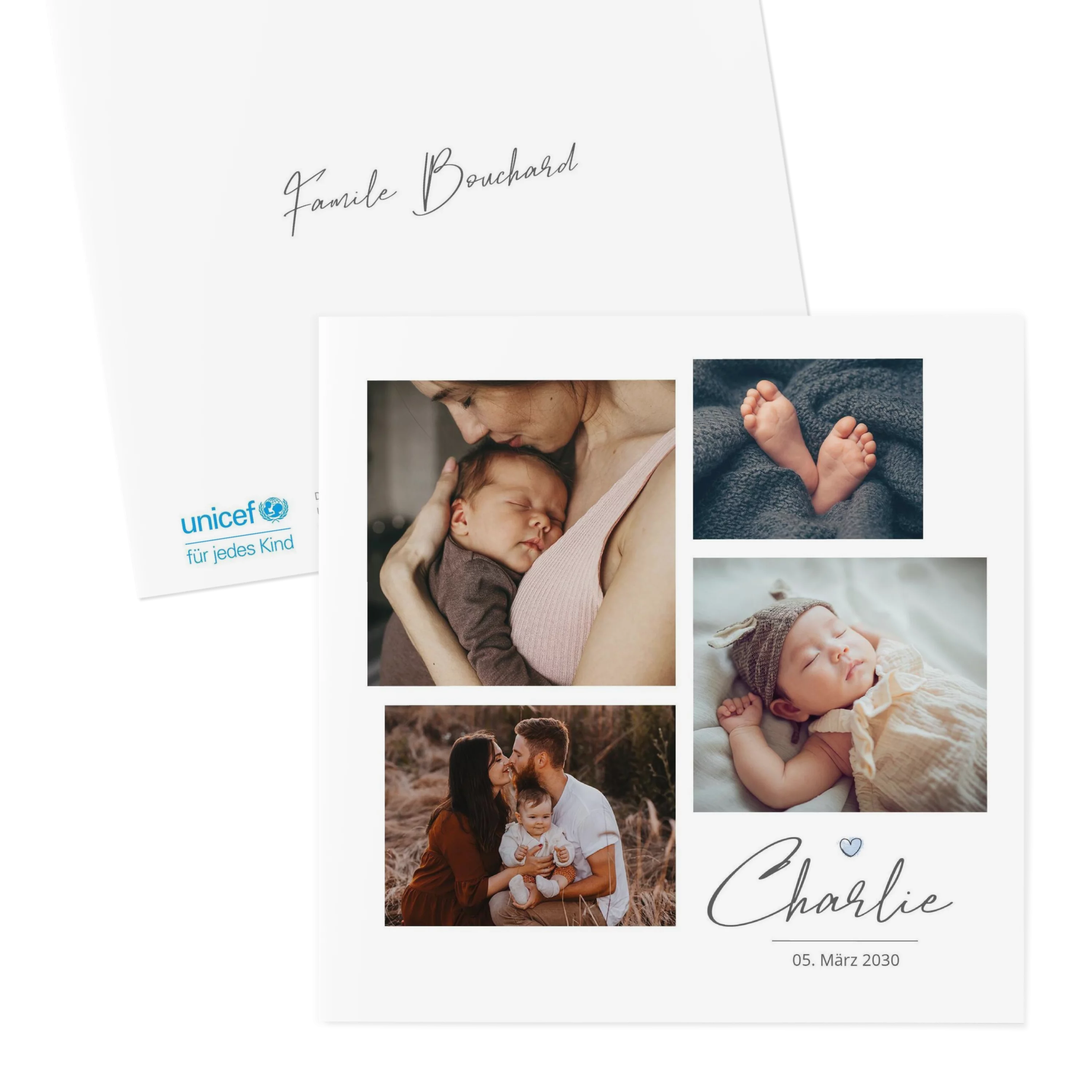 Mit ihrer quadratischen Bildaufteilung bietet diese Karte Raum für vier persönliche Aufnahmen, ergänzt durch feine Typografie und ein kleines Herz-Icon als liebevolles Detail. Die zurückhaltende Gestaltung auf Weiß bringt die Fotos dezent zur Geltung. Ideal, um Ihr Familienglück stilvoll bekannt zu machen.