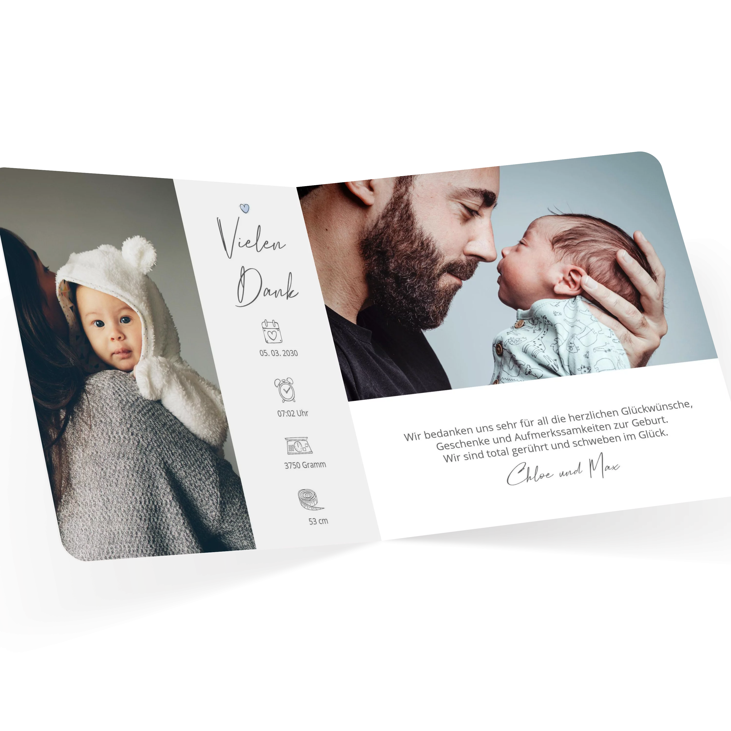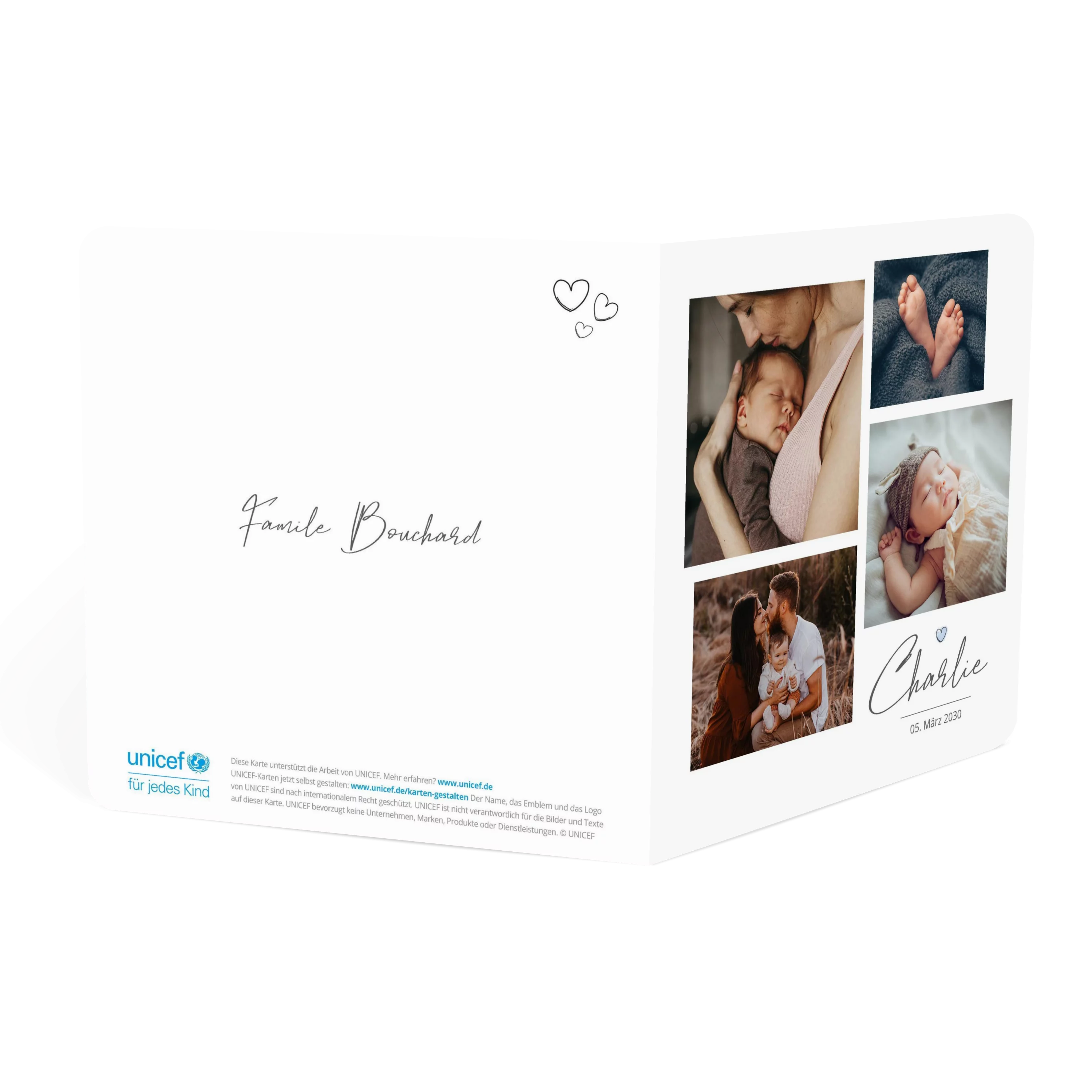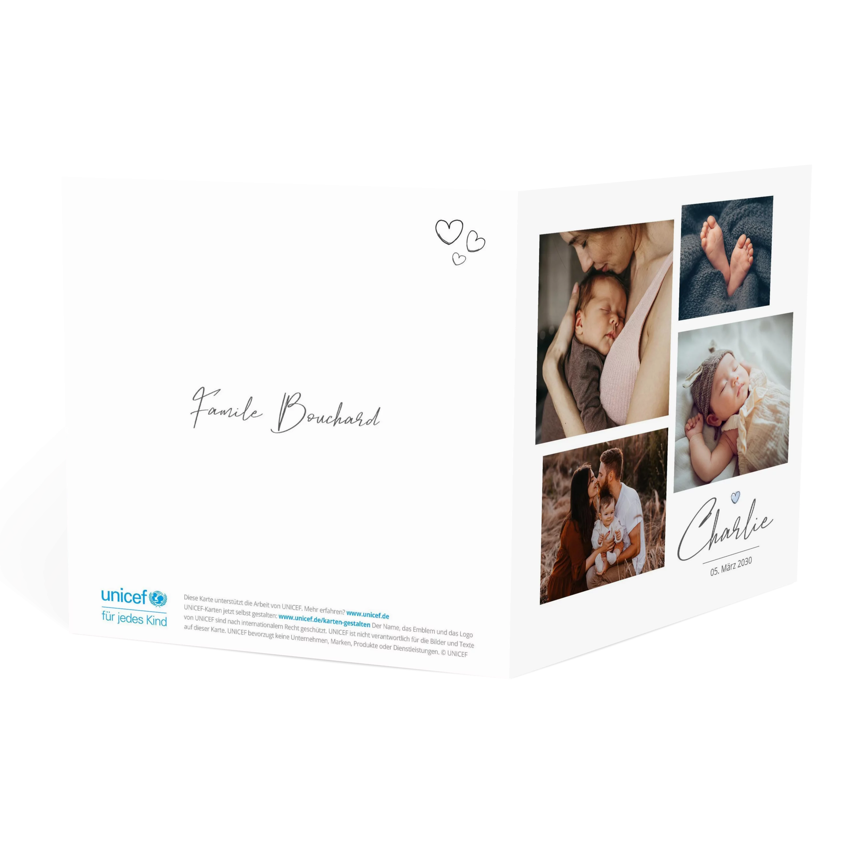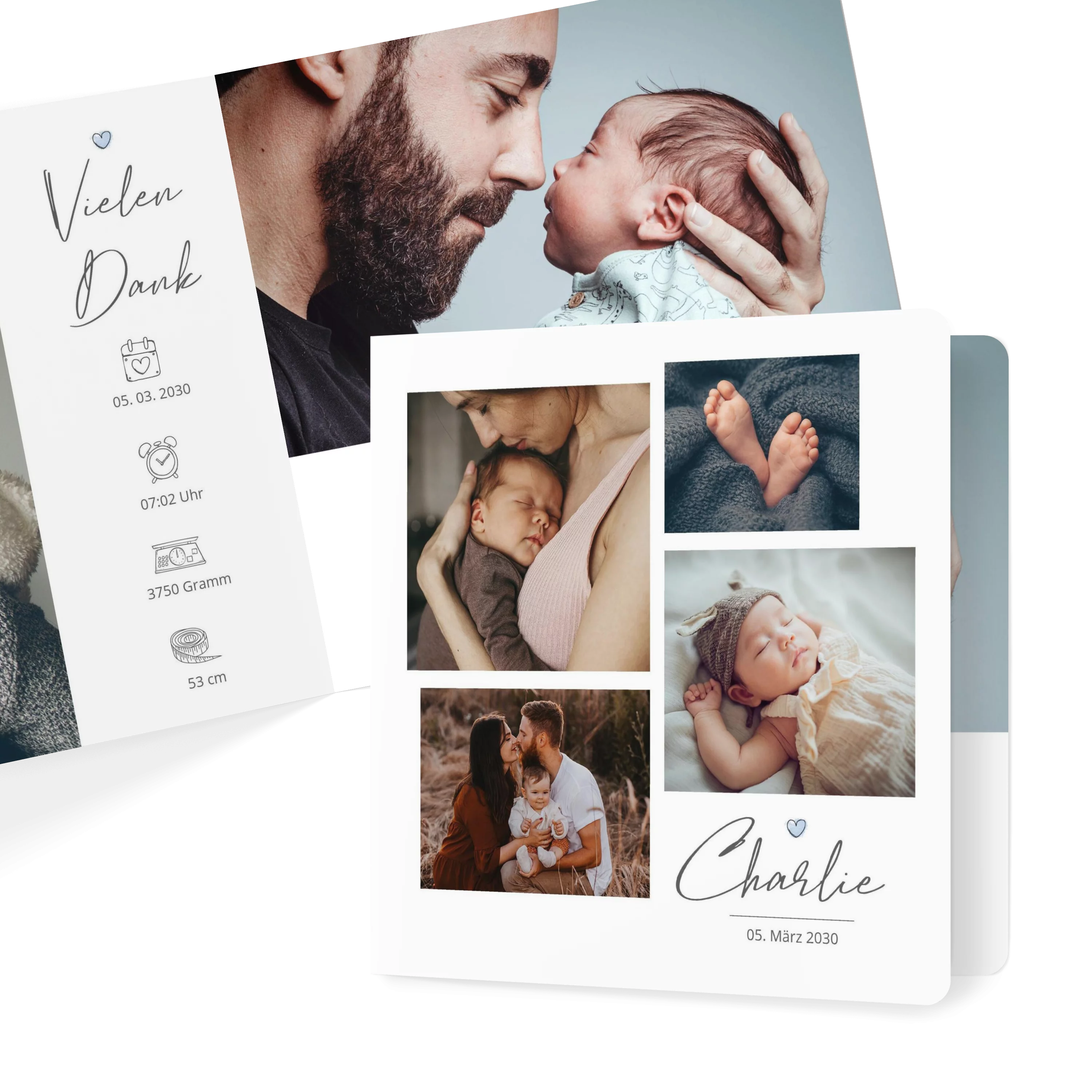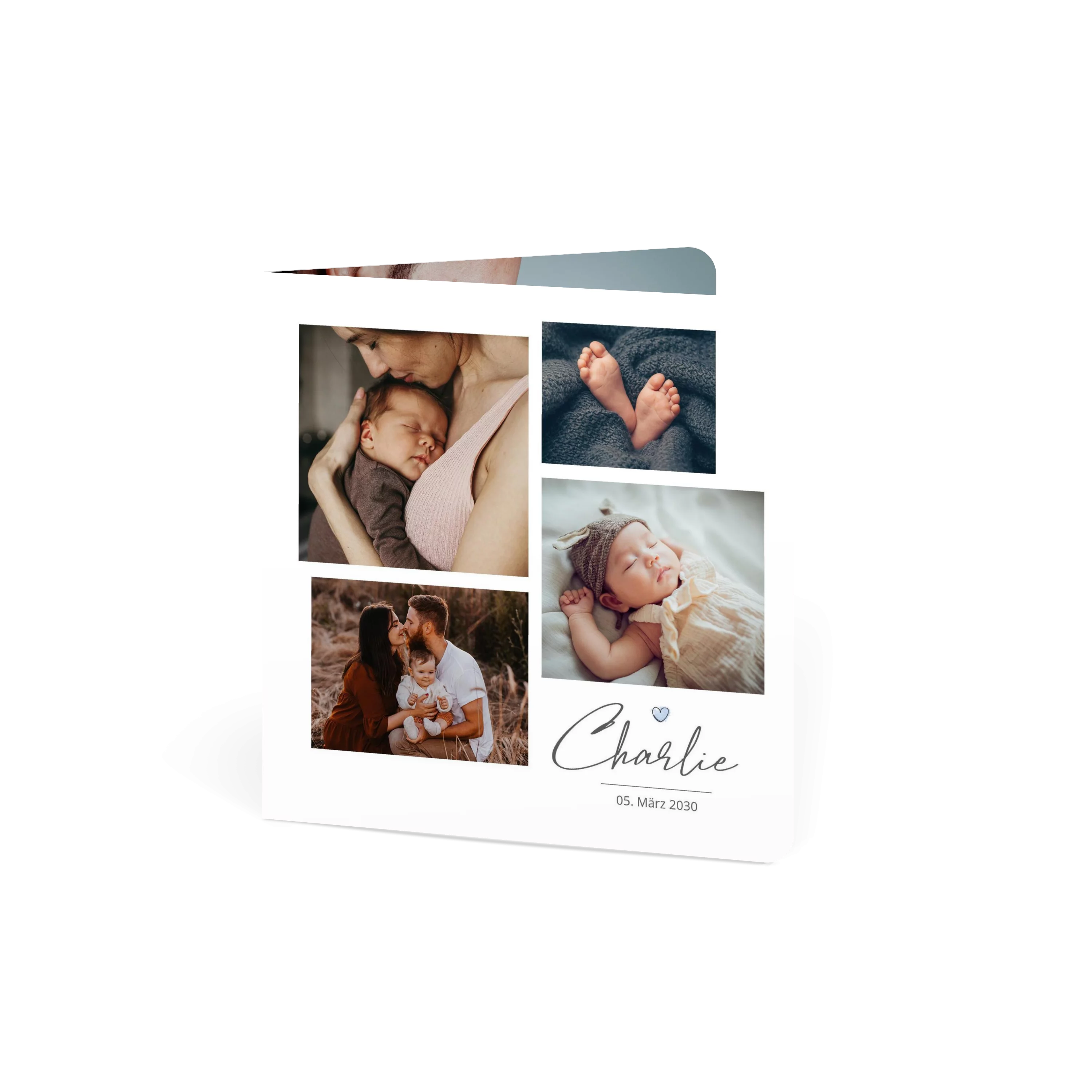 Mit ihrer quadratischen Bildaufteilung bietet diese Karte Raum für vier persönliche Aufnahmen, ergänzt durch feine Typografie und ein kleines Herz-Icon als liebevolles Detail. Die zurückhaltende Gestaltung auf Weiß bringt die Fotos dezent zur Geltung. Ideal, um Ihr Familienglück stilvoll bekannt zu machen.