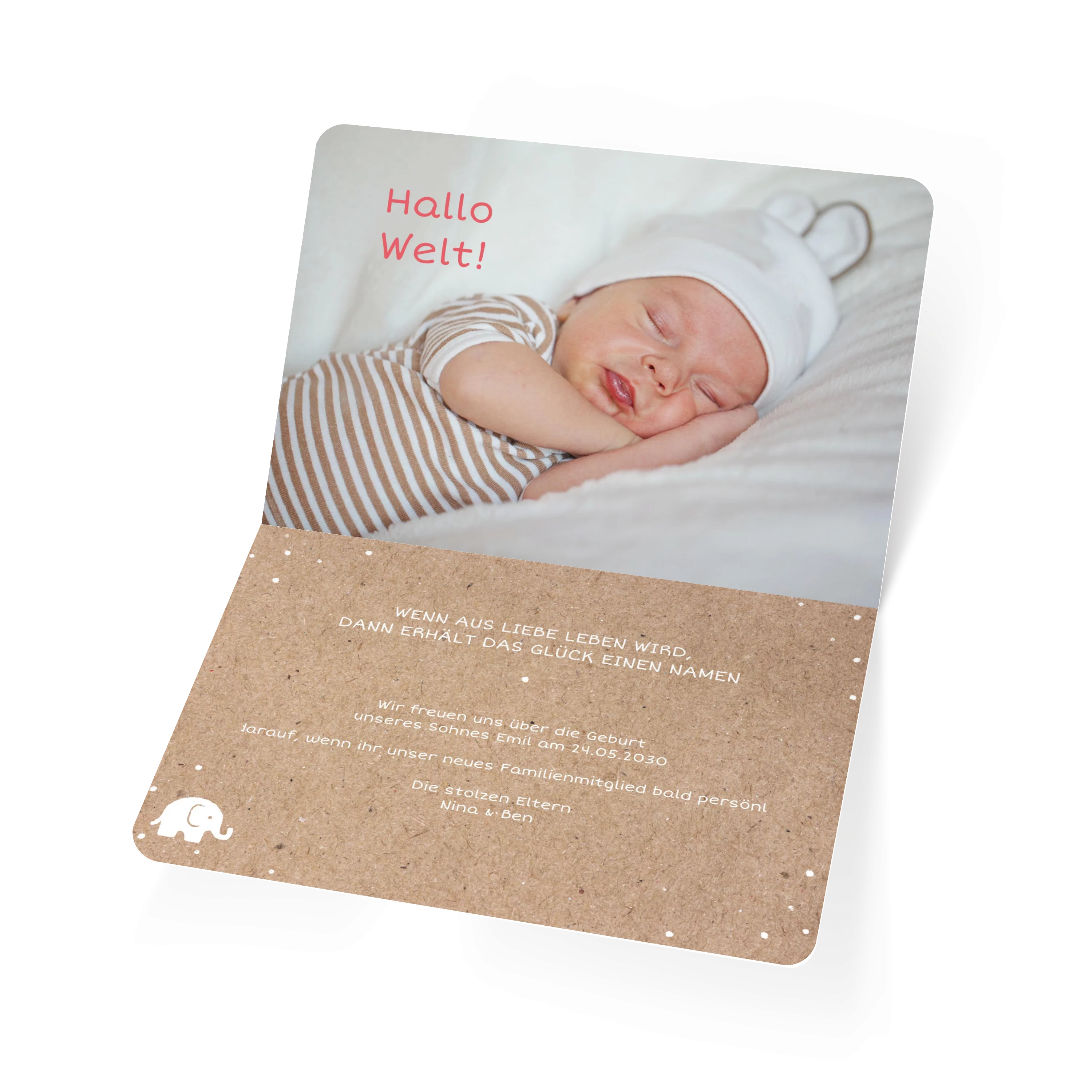 Mit einem natürlichen Kraftpapierlook, verspielter Illustration und Platz für das erste Lieblingsfoto macht diese Karte die Freude über den kleinen Neuankömmling sichtbar. Maße, Datum und Name sind liebevoll ins Design eingebunden – eine schöne Art, das große Glück mit Familie und Freund*innen zu teilen.