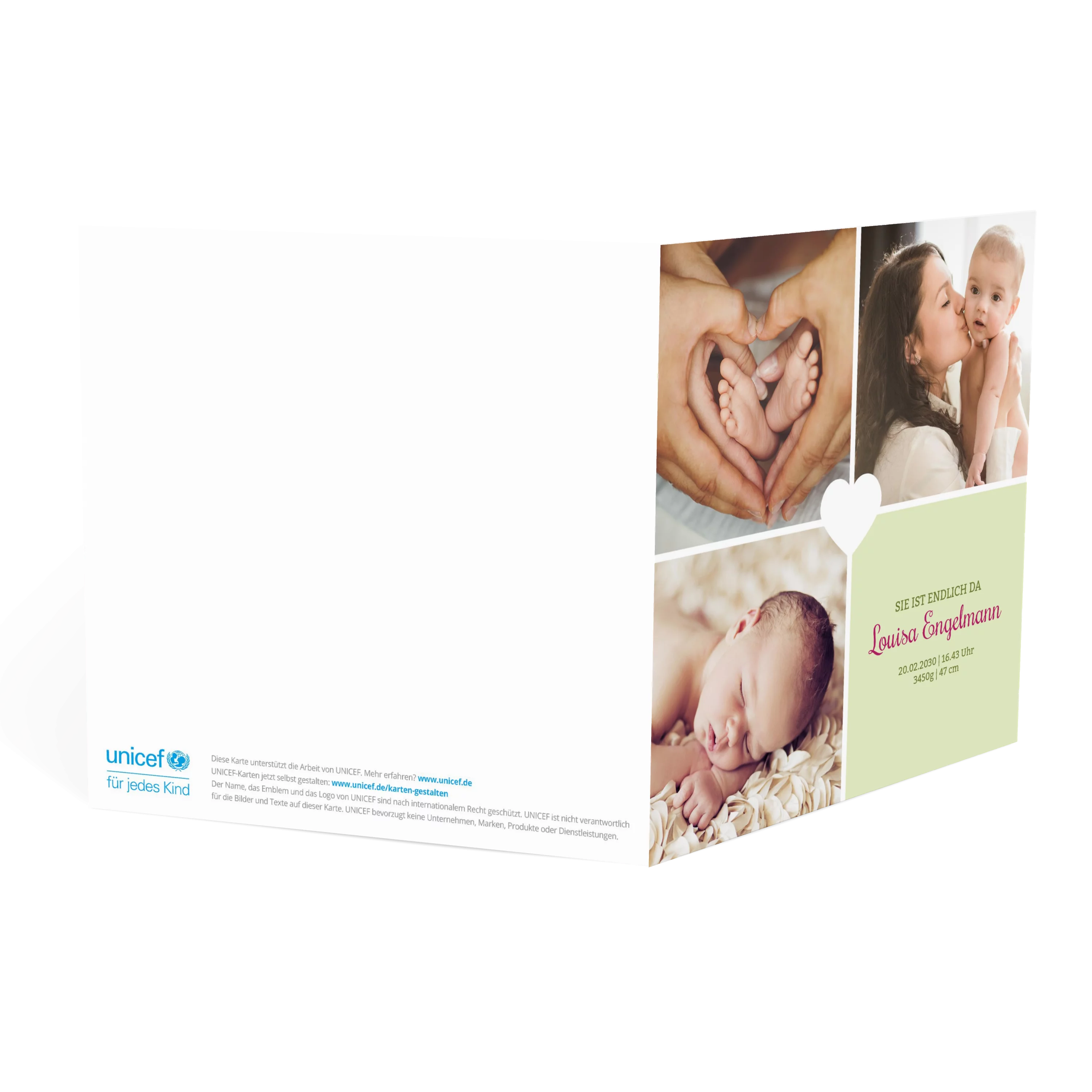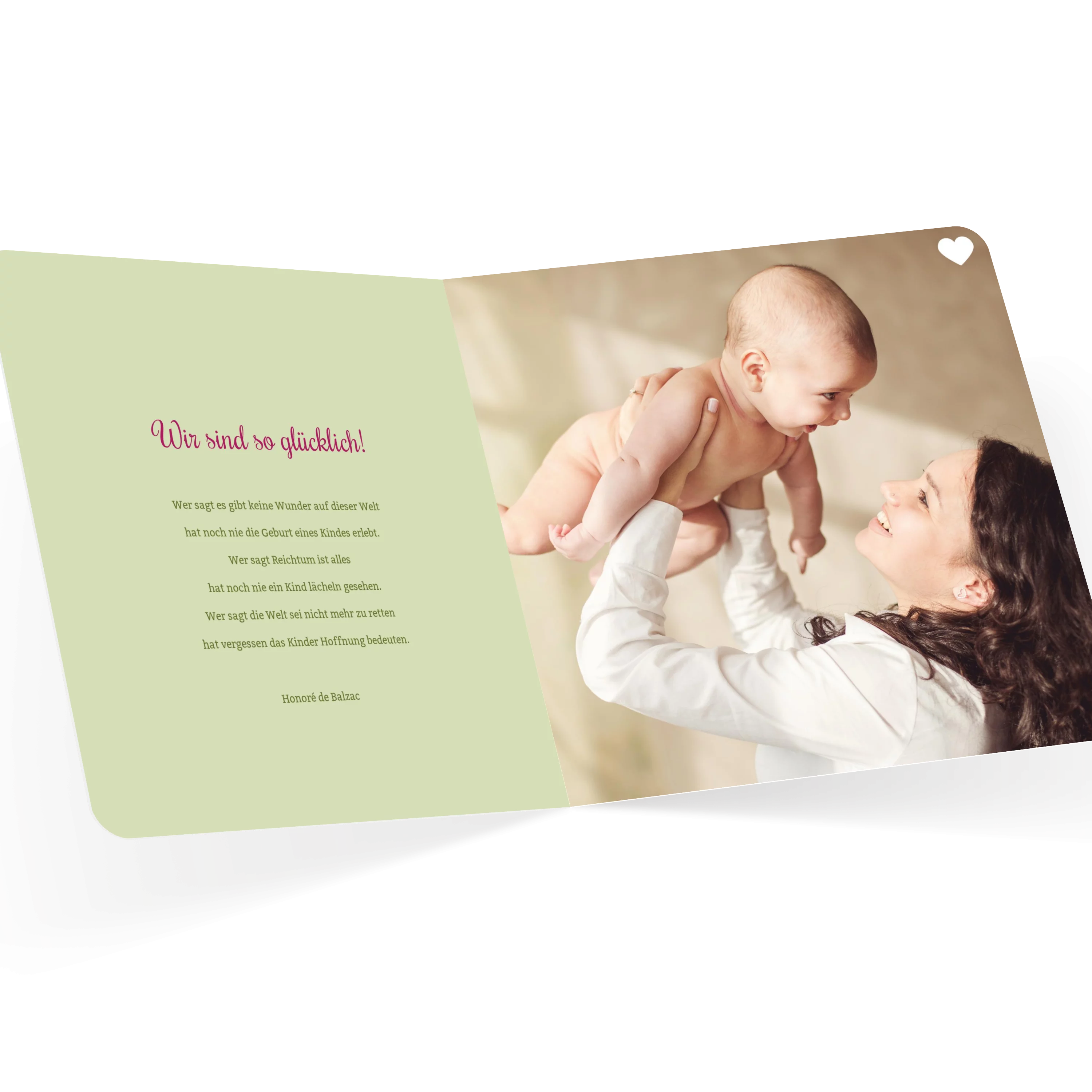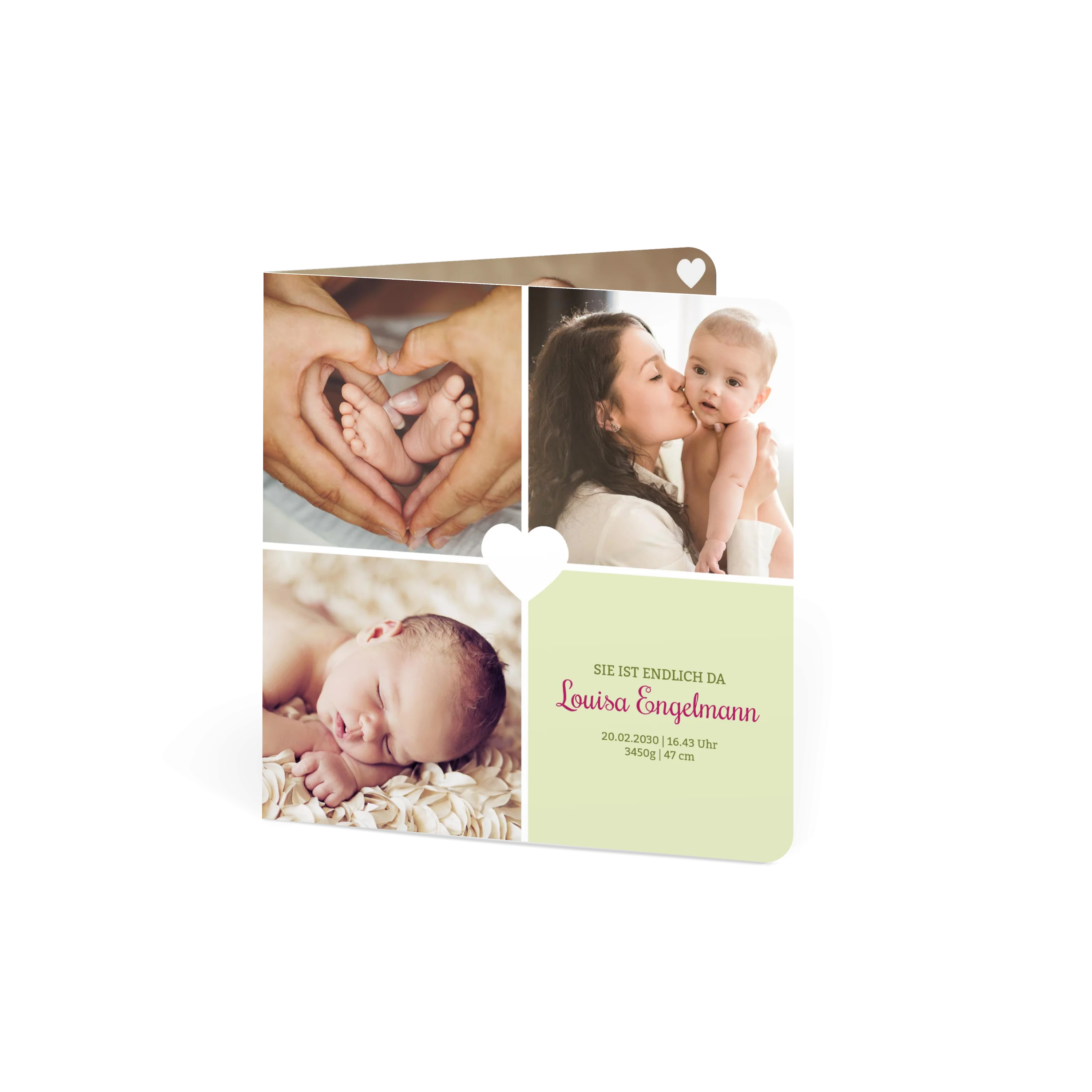 Unser kleines Herzchen ist in jedem Fall eine Geburtskarte mit Herz. Ohne viel Worte bietet Ihnen diese Babykarte die Möglichkeit, Ihr Baby auf den großzügig angelegten Fotofeldern „Hallo“ sagen zu lassen. Entscheiden Sie, wie ausdrucks-, eindrucks-, oder gefühlvoll sich Ihr kleines Herzchen in seiner ersten, eigenen Fotogalerie vorstellt.