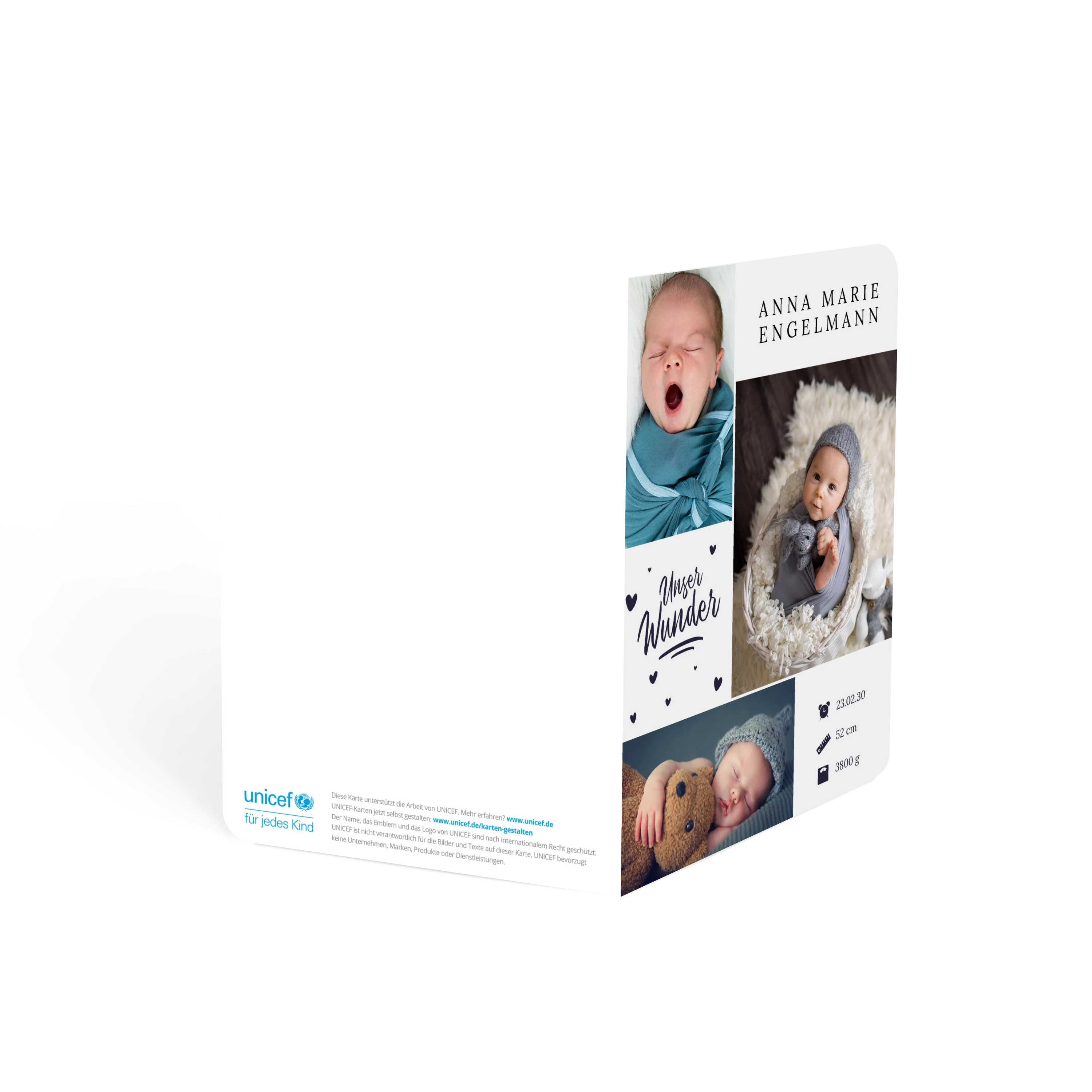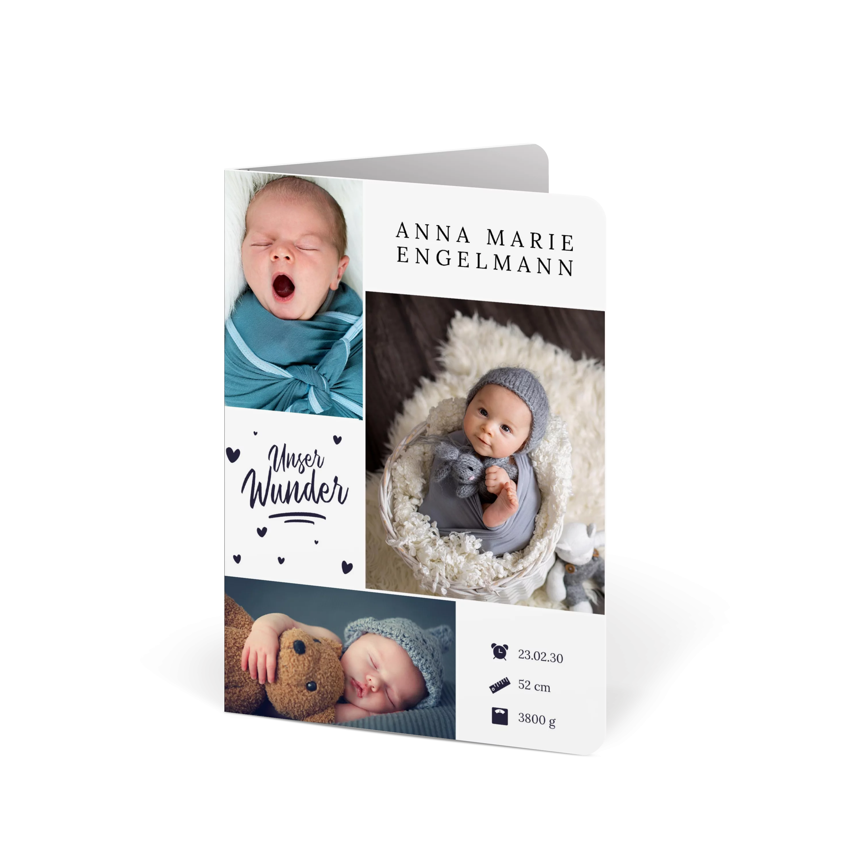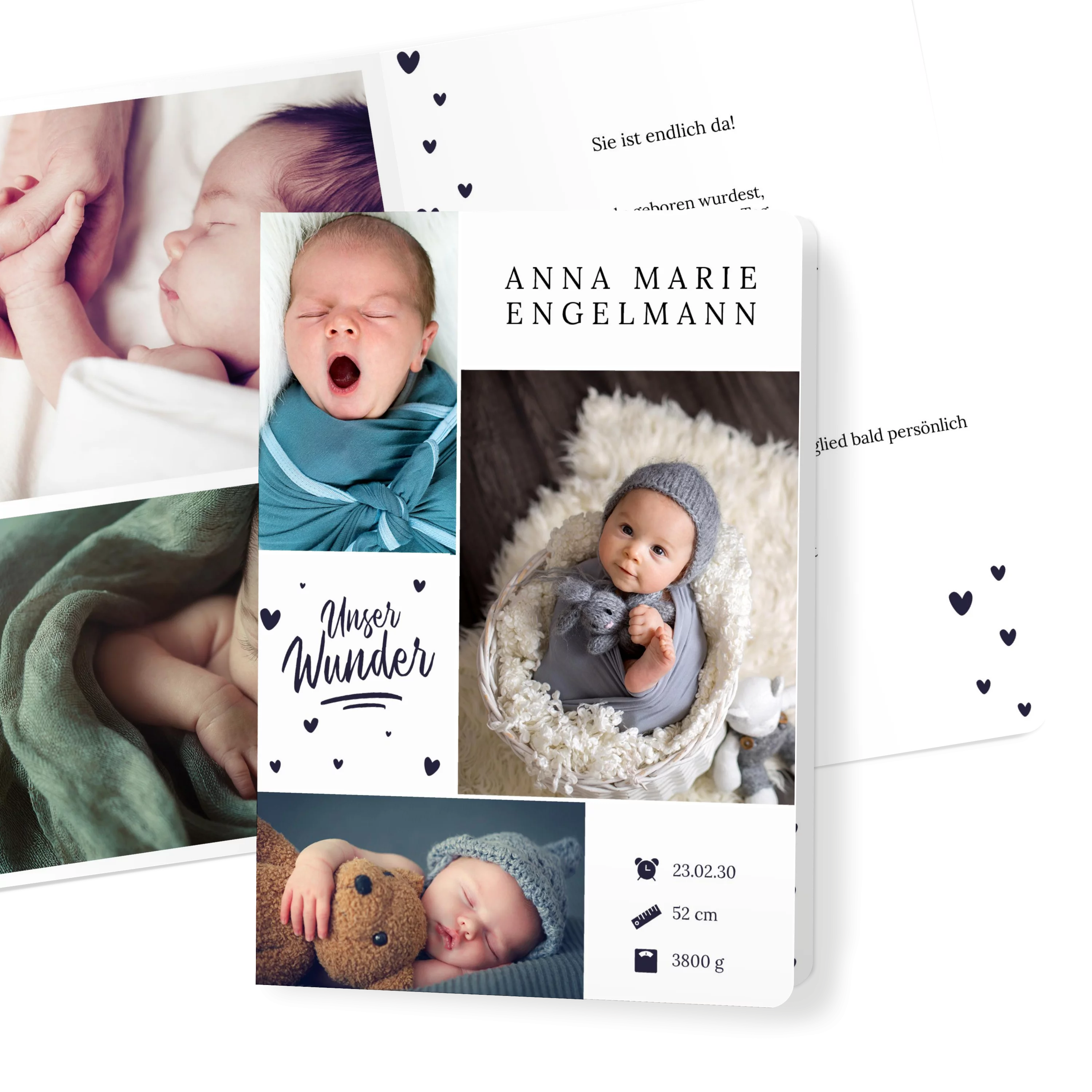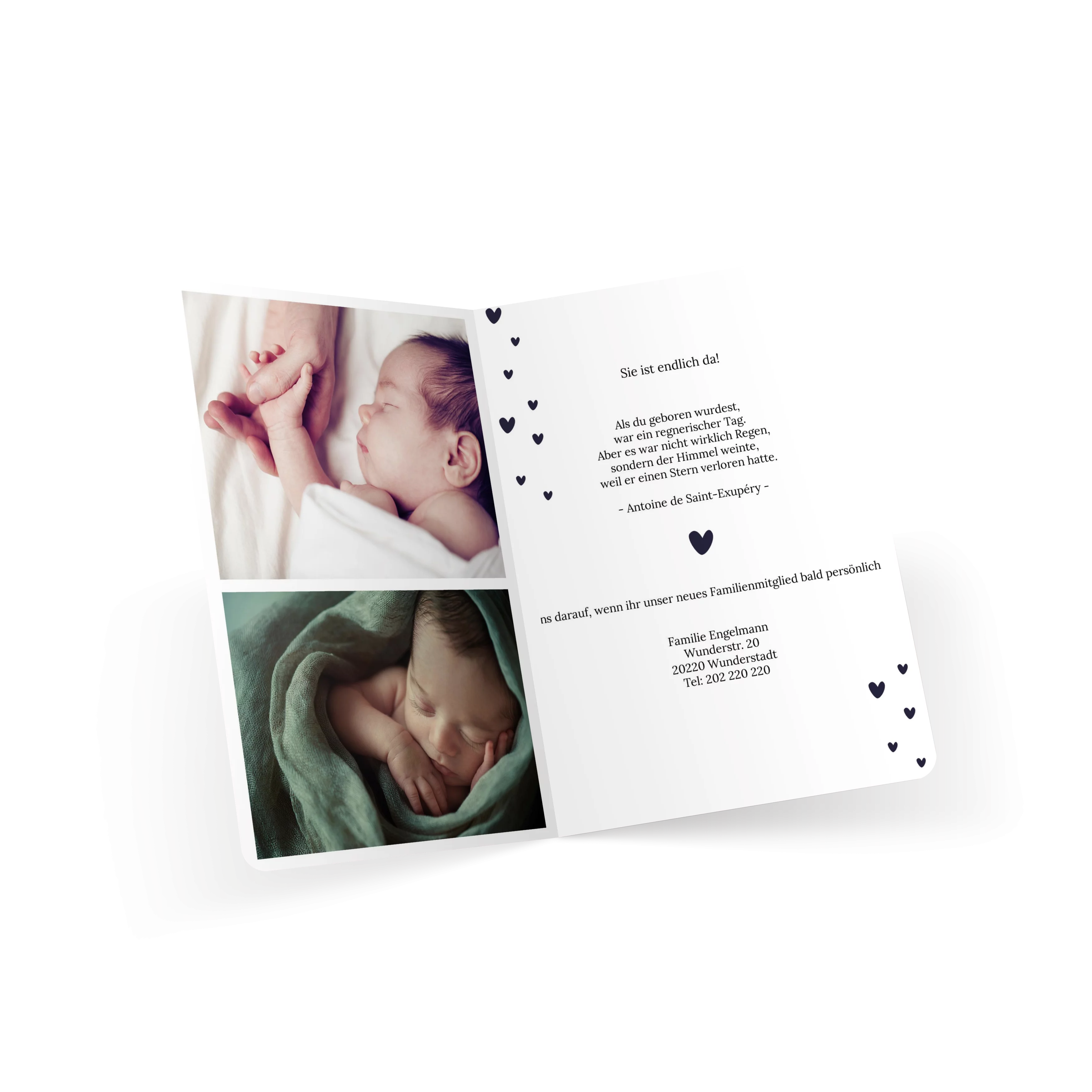 Ganz schlicht und voller Stil liegt der Fokus dieses Kartendesigns auf den Fotografien und dem Namen des Neugeborenen. Durch besondere, von Ihnen gewählte Bilder und wenige Worte wird dem Staunen und der Freude über Ihr kleines, großes Wunder auf der Vorderseite der Karte Ausdruck verliehen. Mit kleinen, dezent platzierten Herzen und persönlichen Worten im Innenteil bringt Ihre freudige Botschaft allen Empfängern ein Stück Babyglück ins Haus.