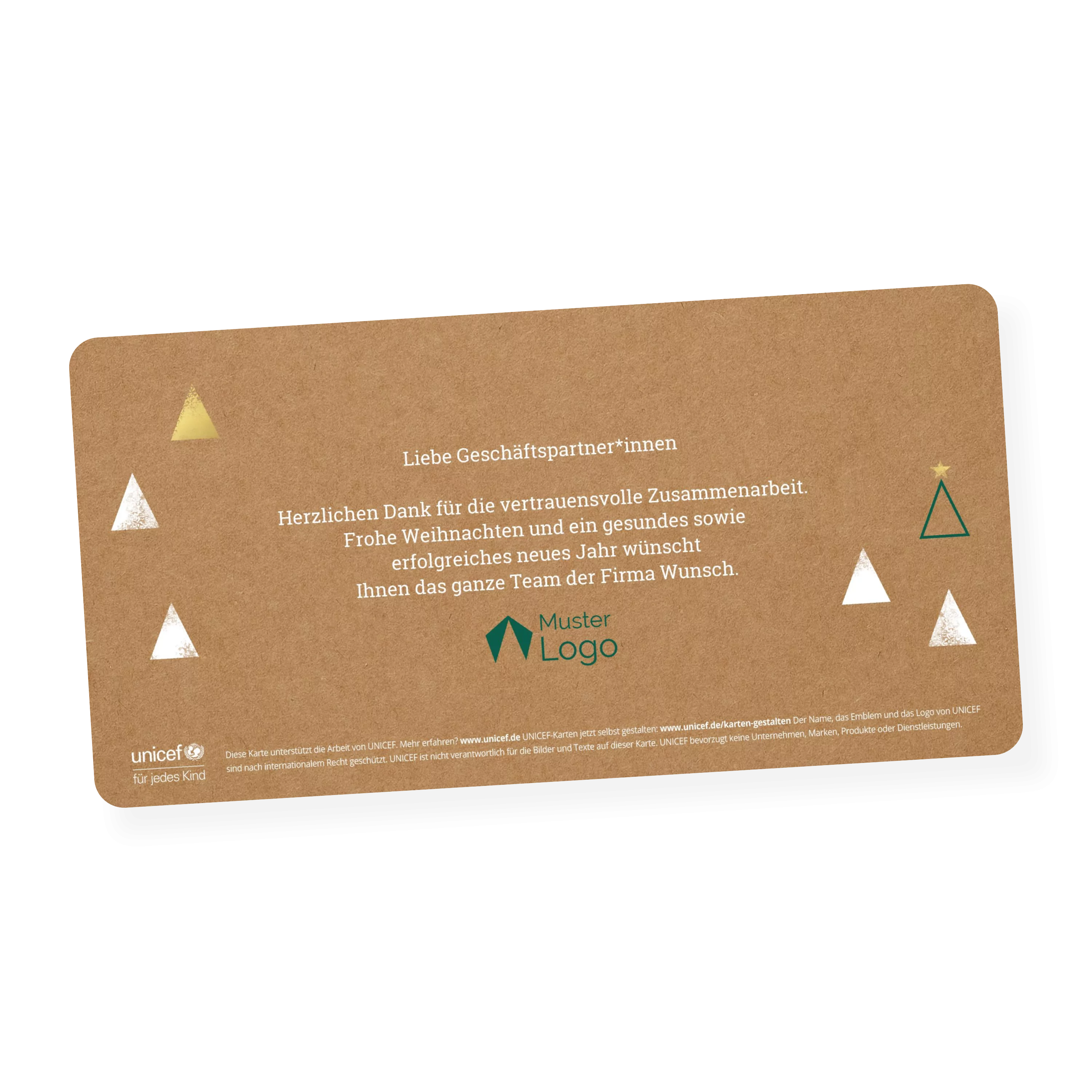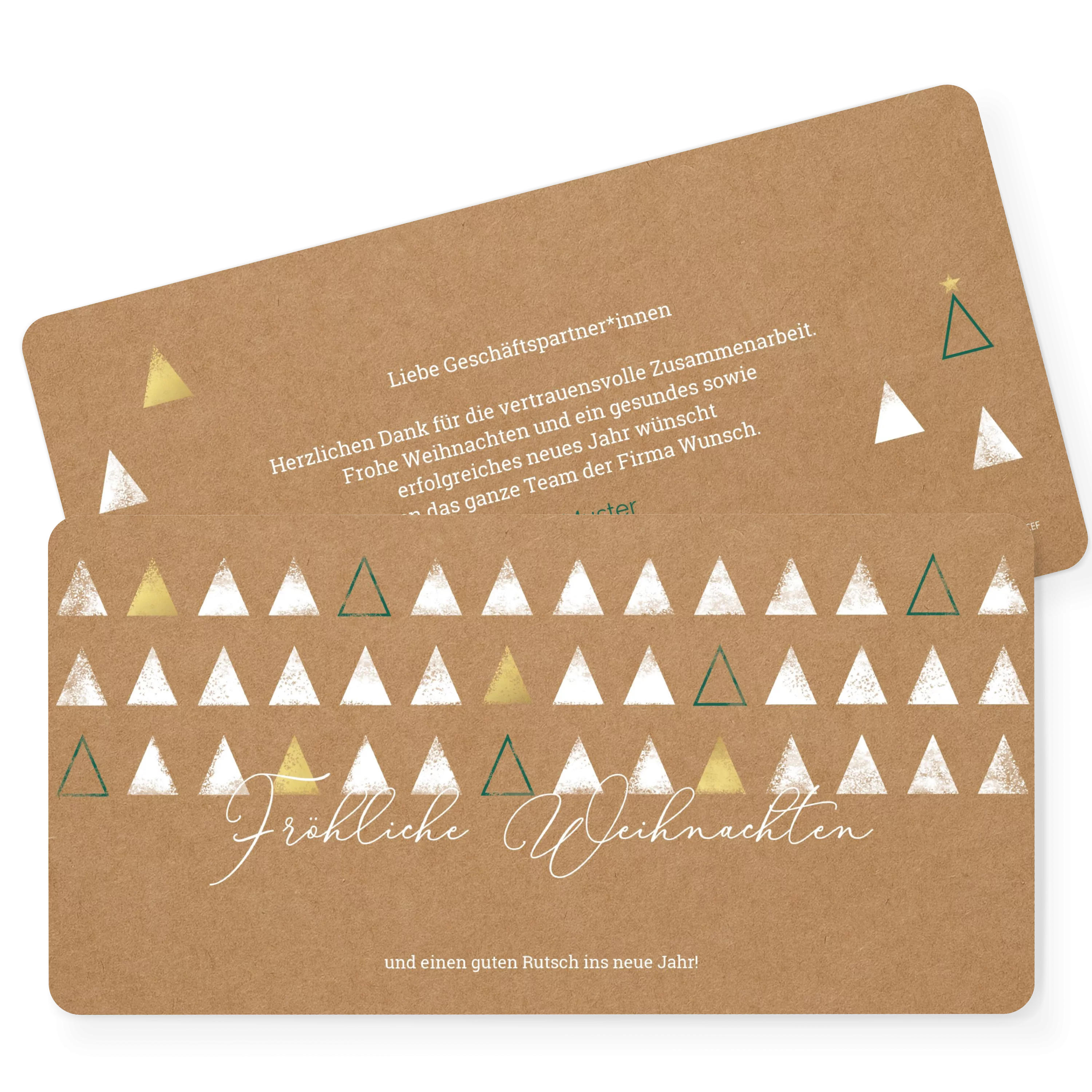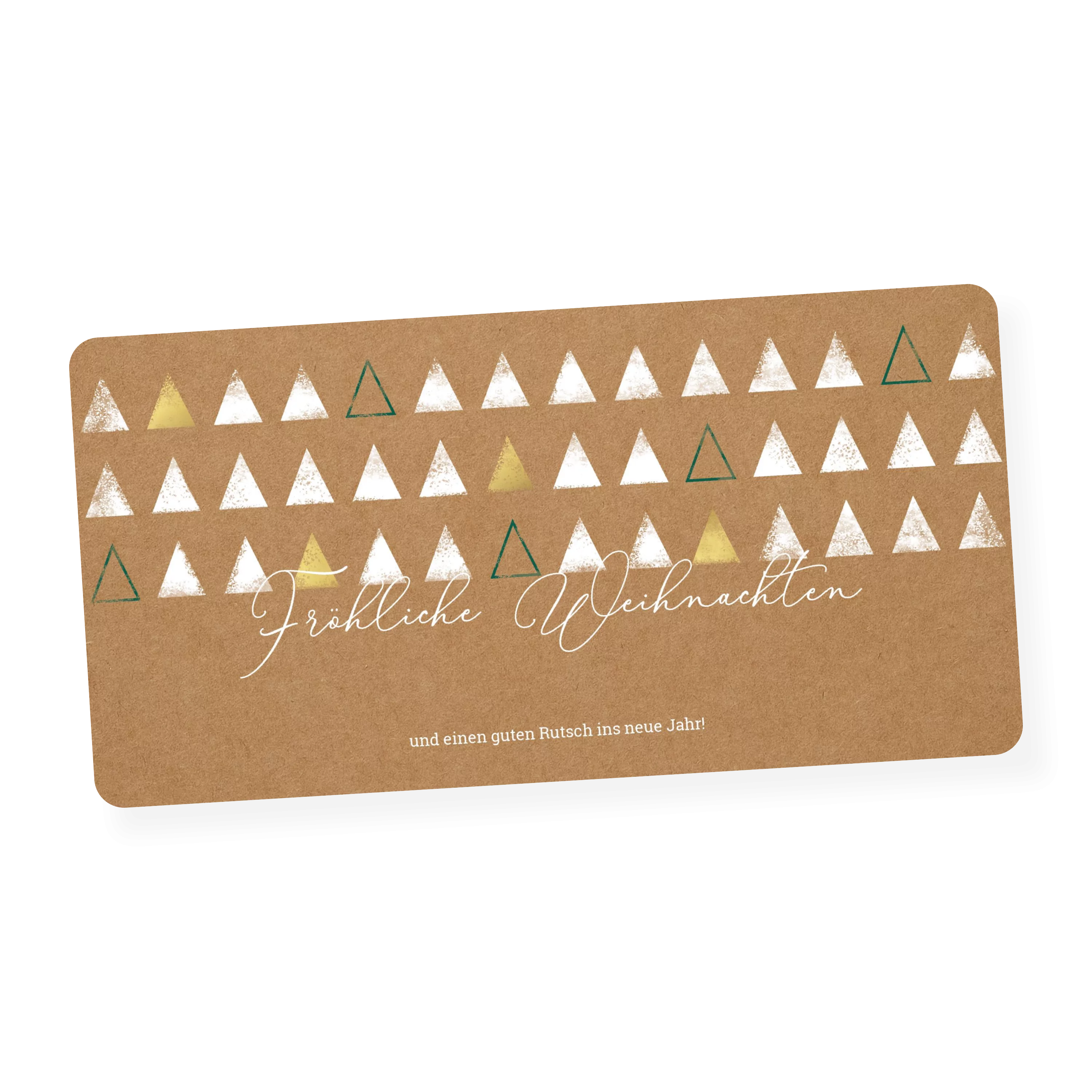 Weiße, goldene und grüne Tannen in Dreiecksform reihen sich grafisch über den kraftbraunen Hintergrund. Die feine weiße Schrift bringt einen ruhigen Akzent in das reduzierte Design – perfekt für moderne Weihnachtsgrüße mit handgemachter Note.