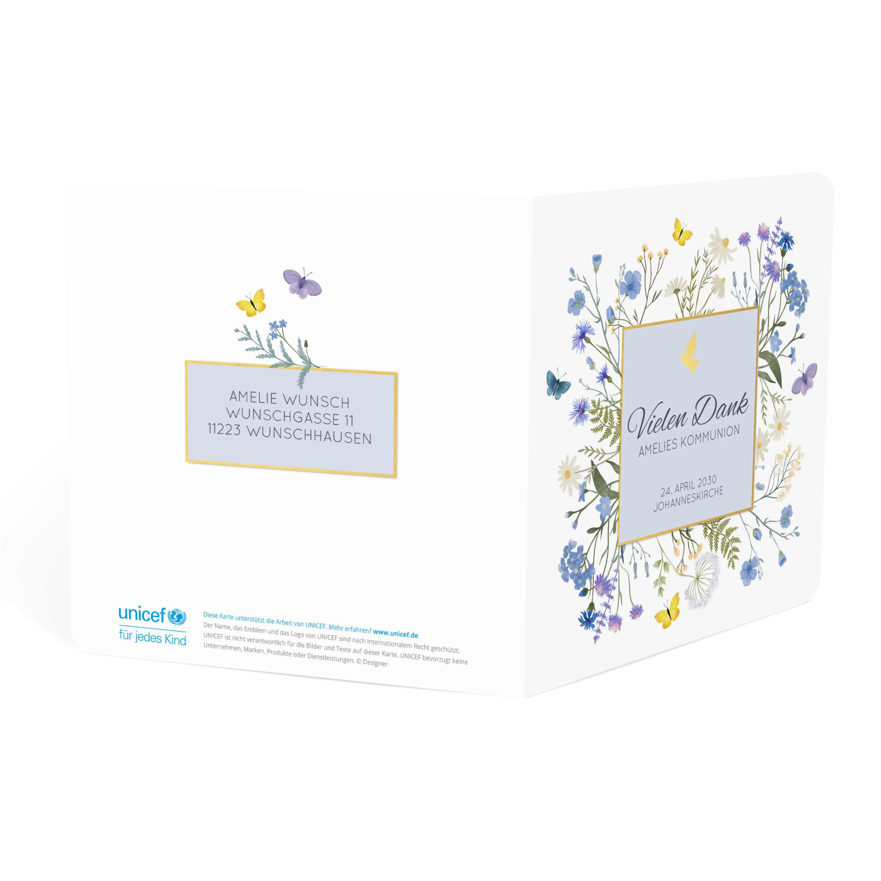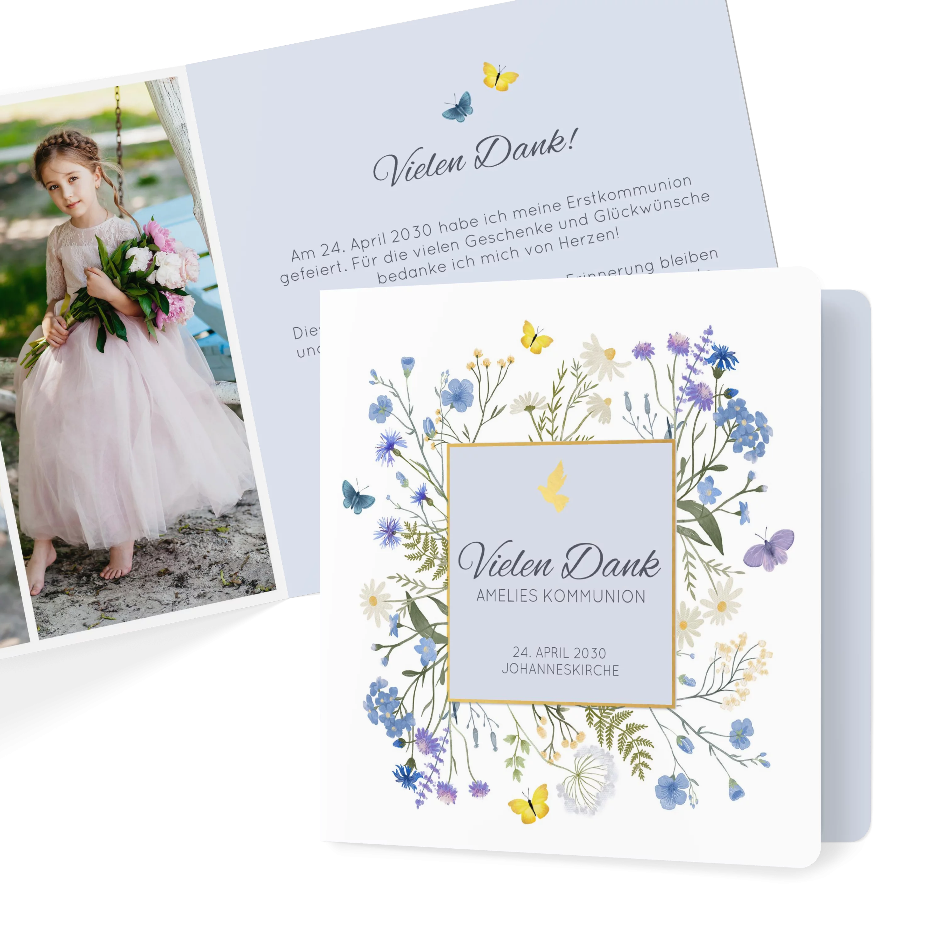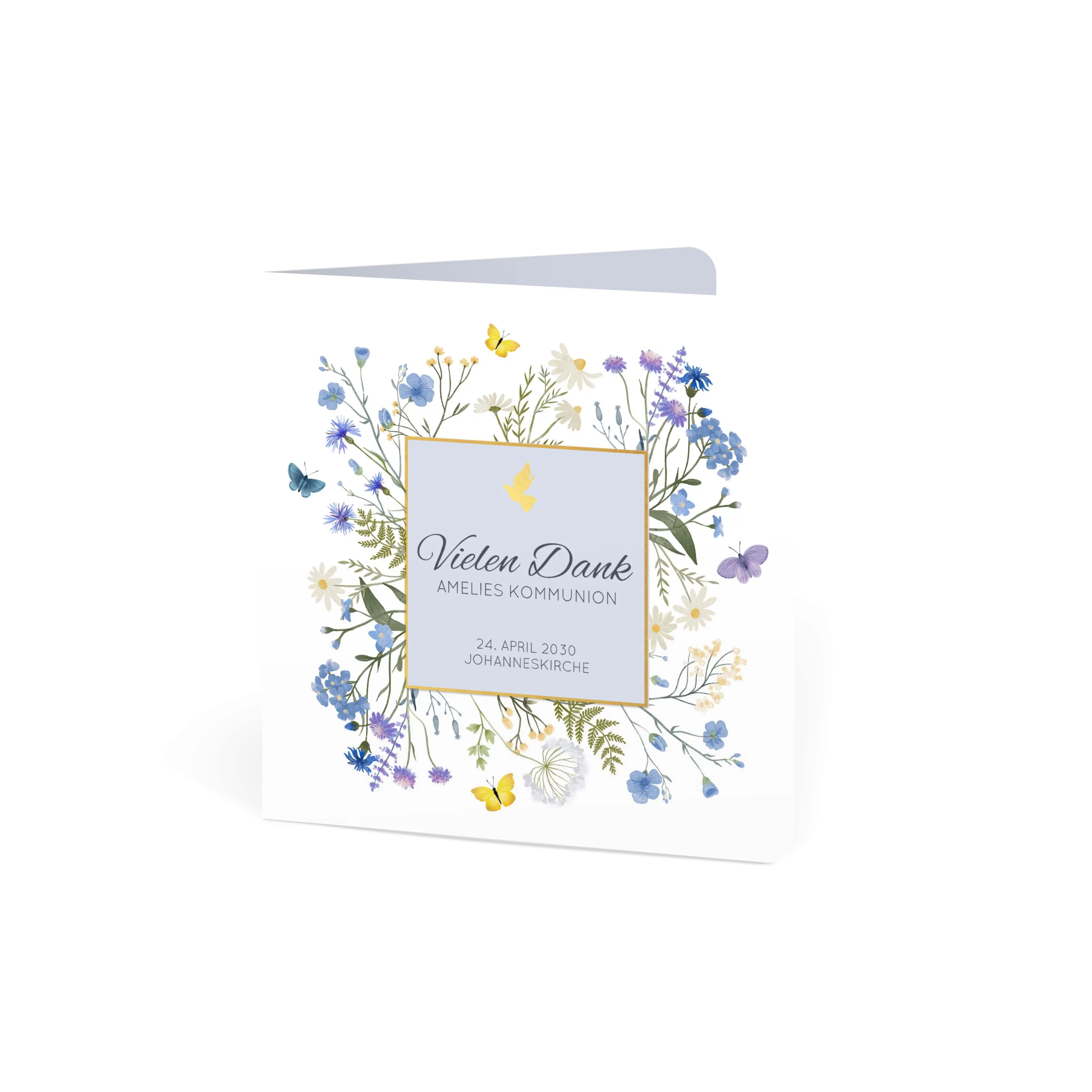 „Vielen Dank“ steht in einem feinen, quadratischen Goldrahmen, umgeben von lila-blauen Blütenillustrationen. Die sanfte Farbwelt und der klare Aufbau geben der Dankeskarte zur Kommunion eine leichte, freundliche Note.