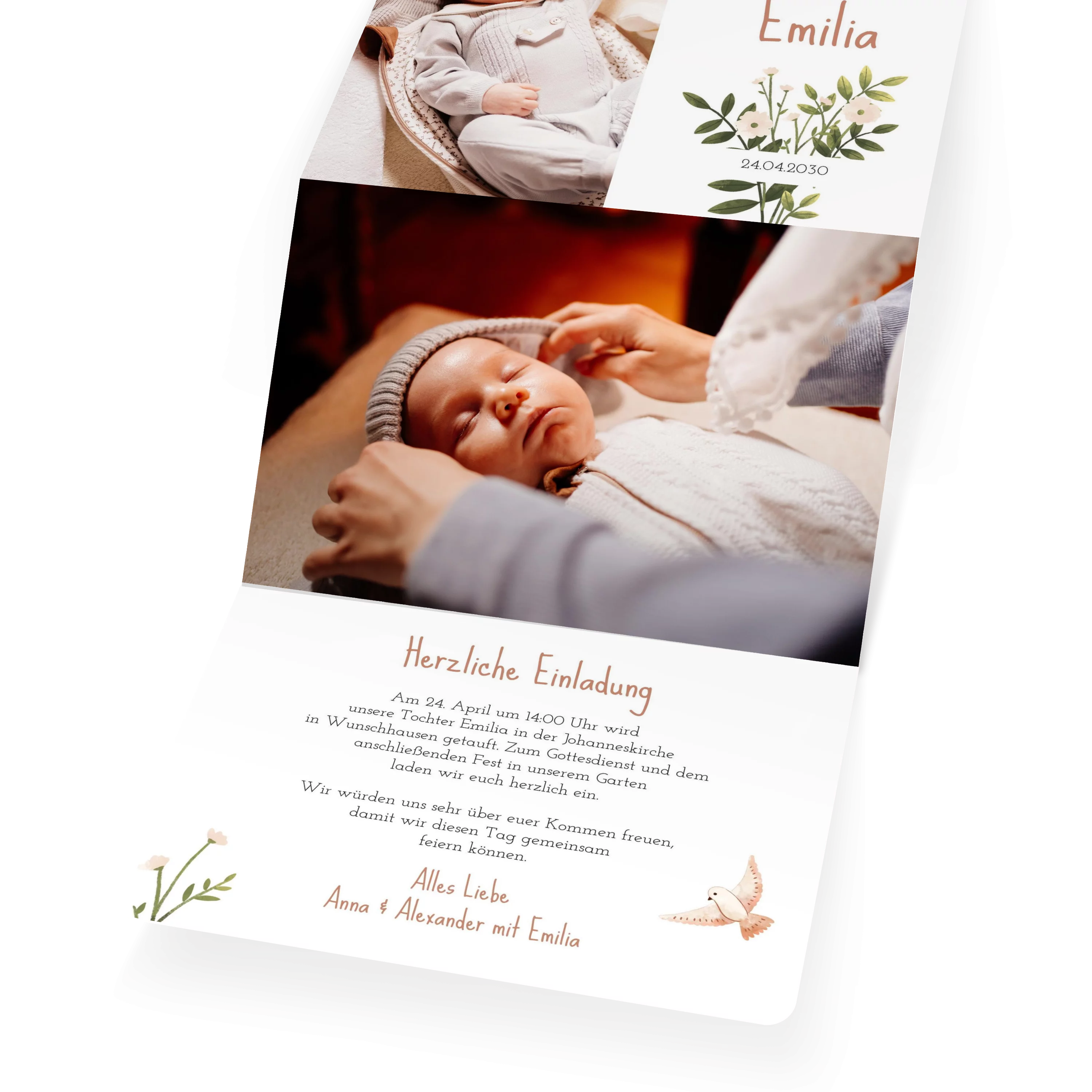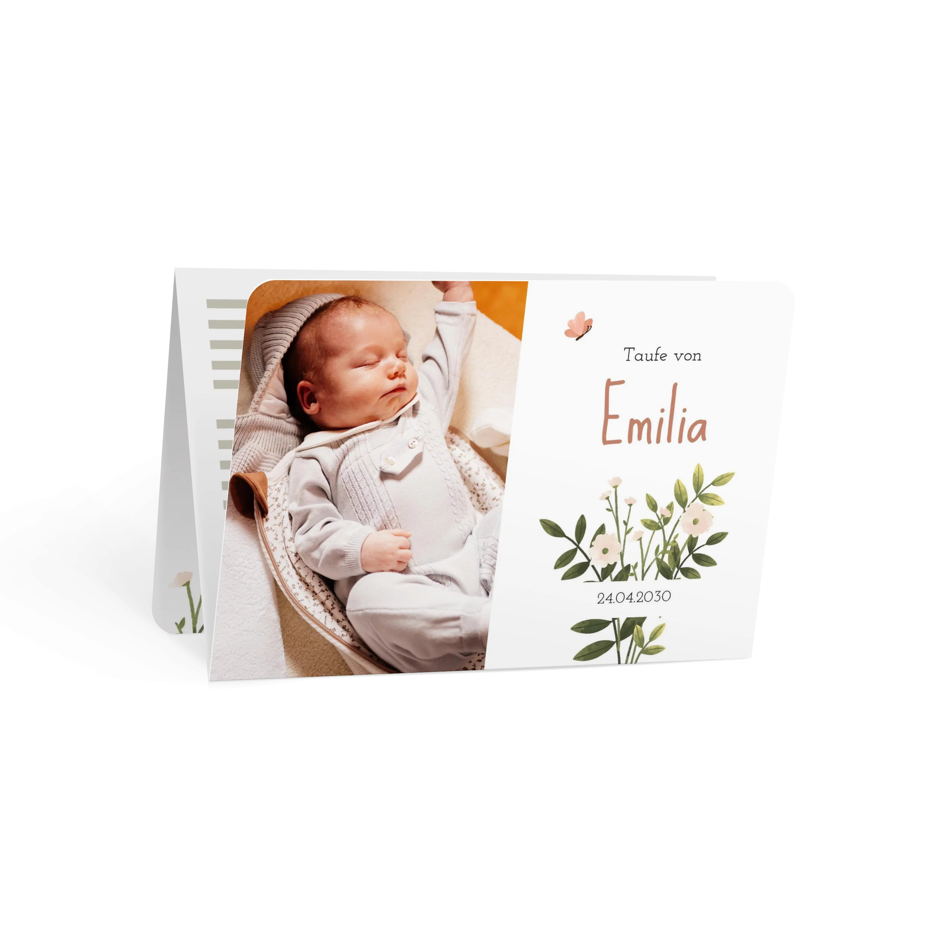 Ein sanftes Blumenelement trifft auf handgeschriebene Typo in warmem Rosé – zart, freundlich und persönlich. Die klare Aufteilung mit großem Fotobereich links und floraler Gestaltung rechts macht diese Taufkarte zu einem feinen Blickfang.