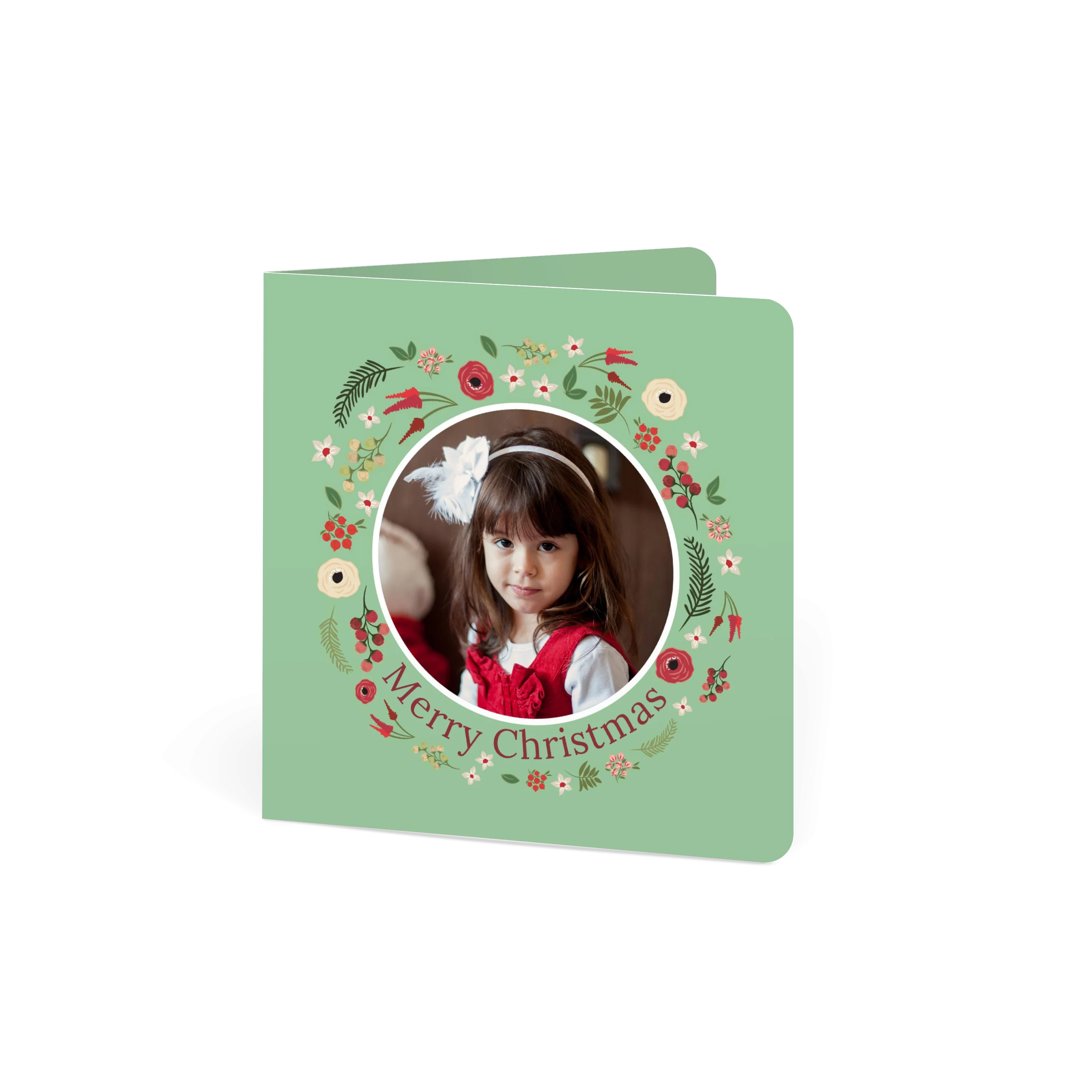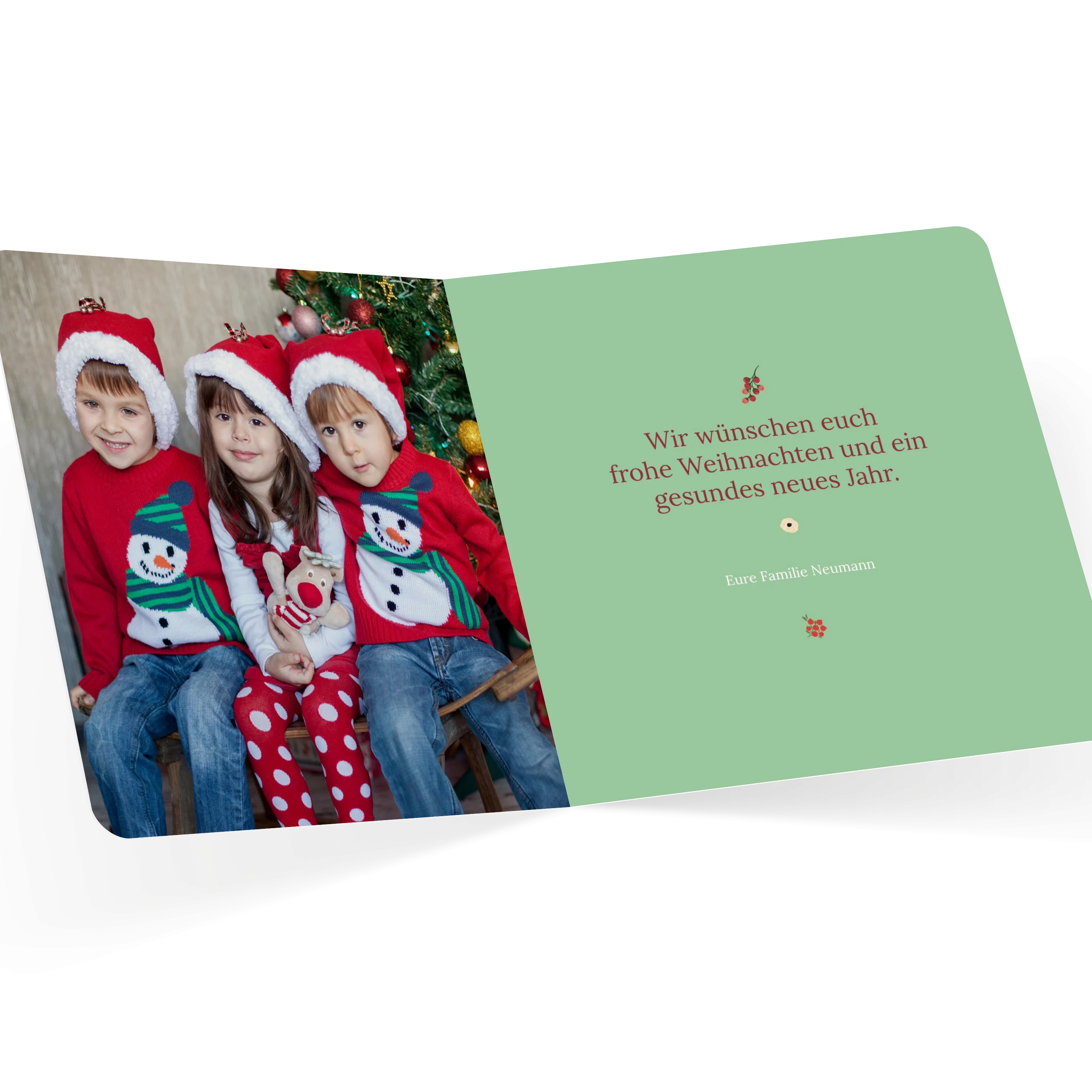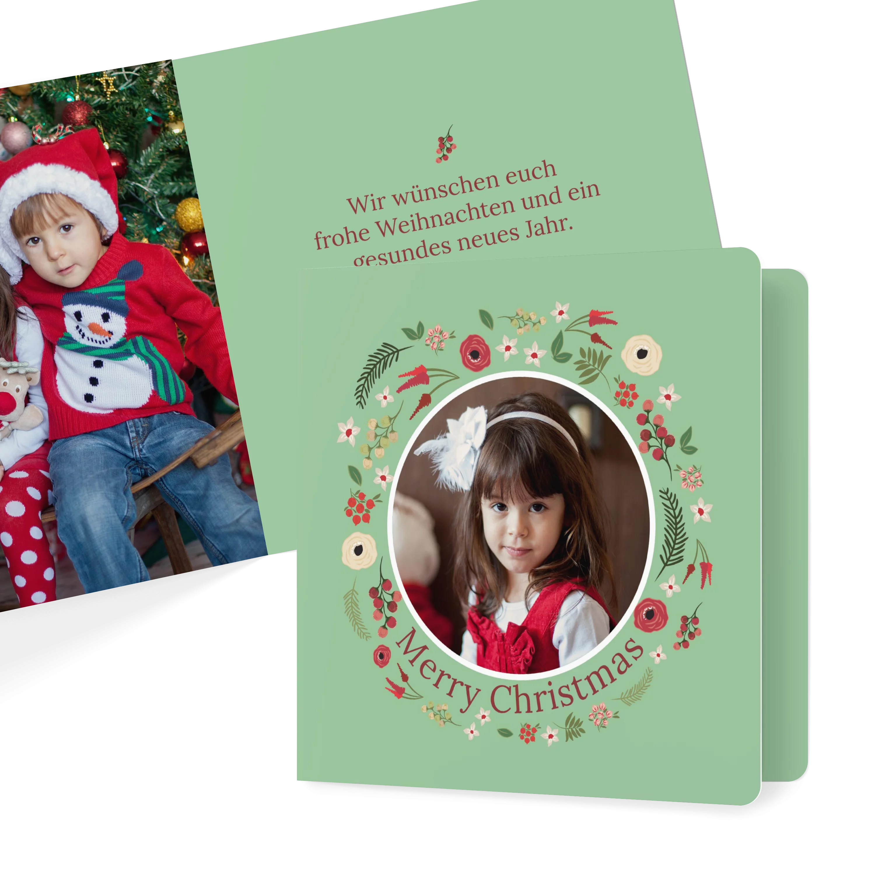 Mit floralem Rahmen, zartem Rosé, Mint oder Grau und einem Hauch von Ballettsaal-Romantik erinnert diese Karte an Nussknackerträume und festliche Bühnenmagie. Das kreisrunde Fotofenster wird von liebevollen Illustrationen umtanzt – ein verspielter, persönlicher Weihnachtsgruß mit nostalgischem Flair.