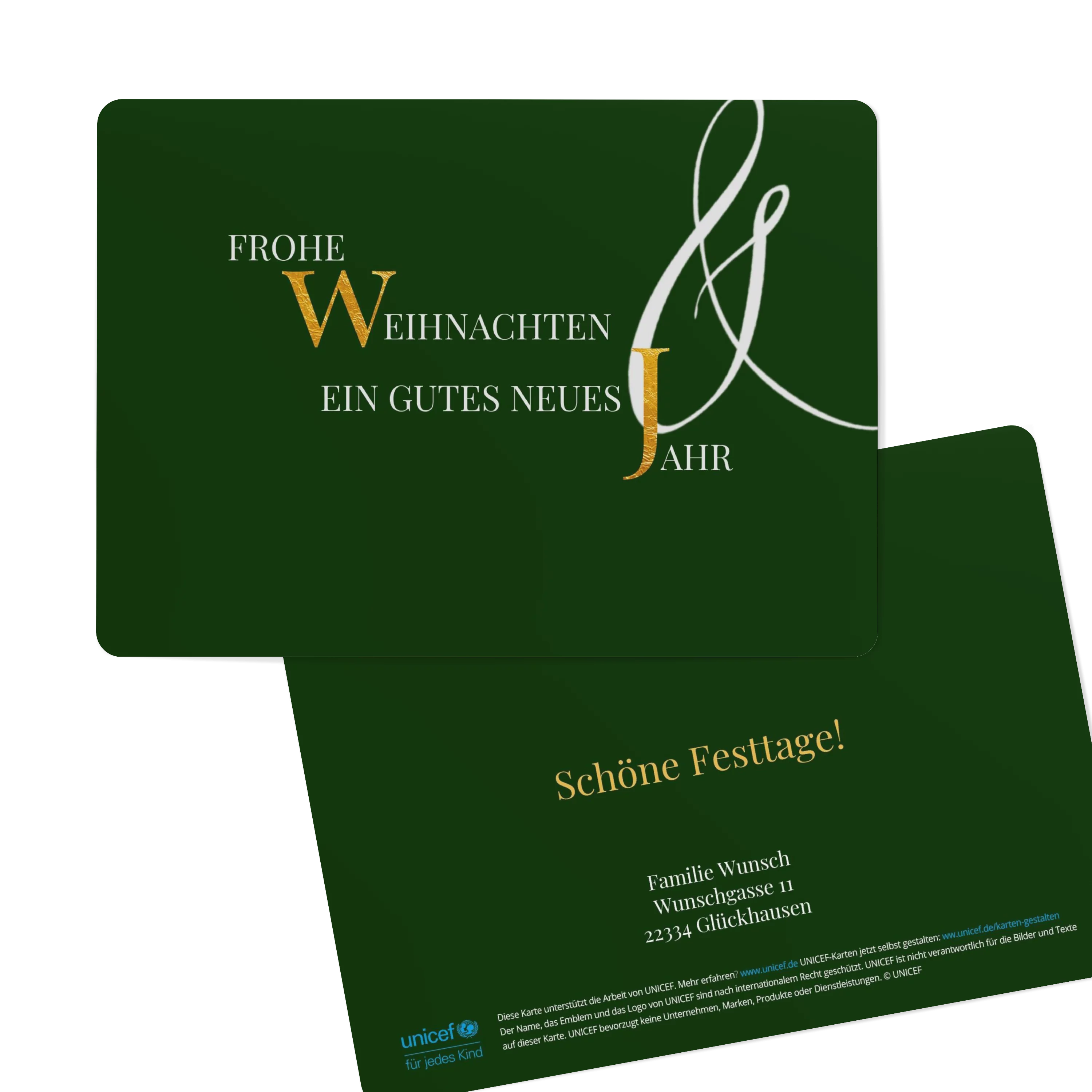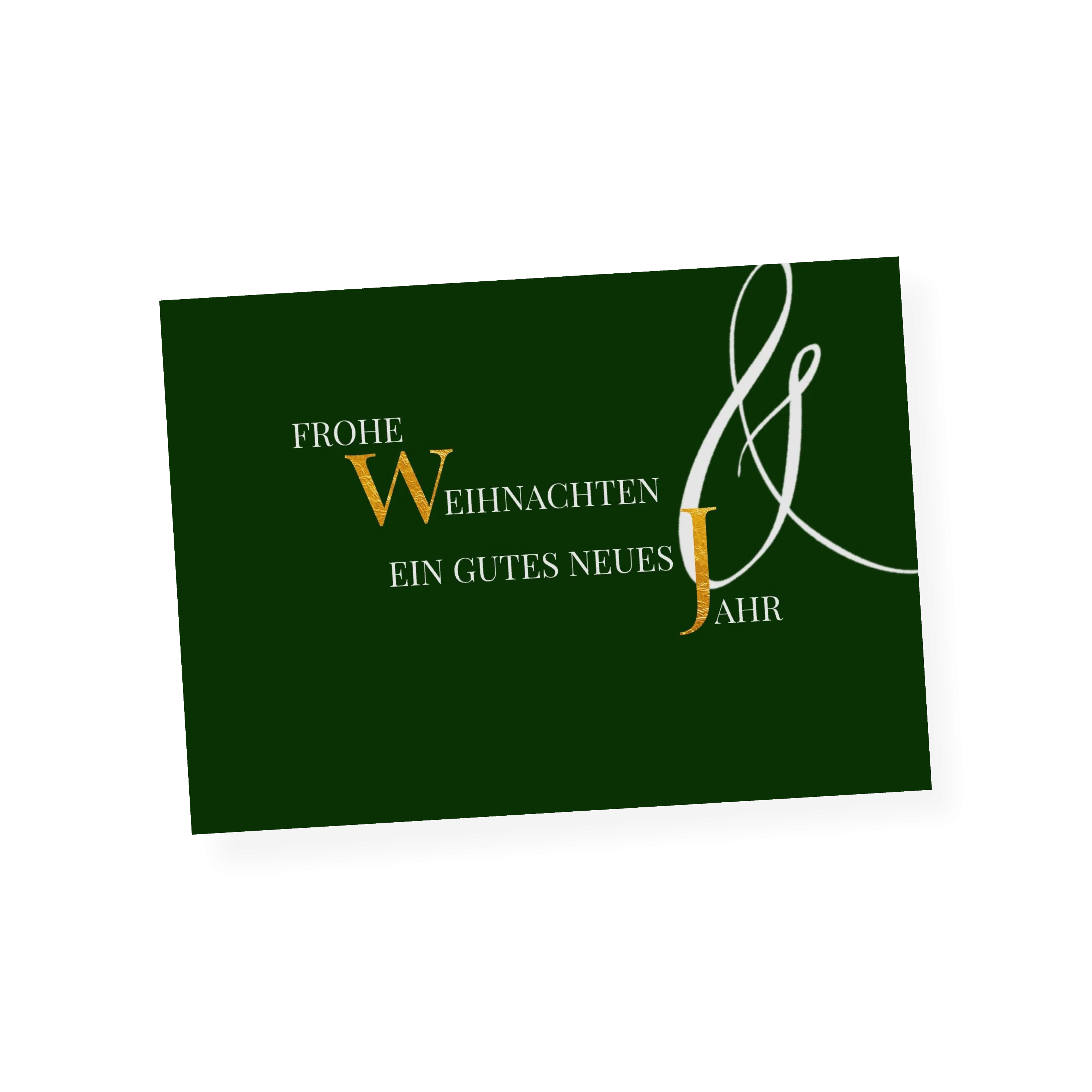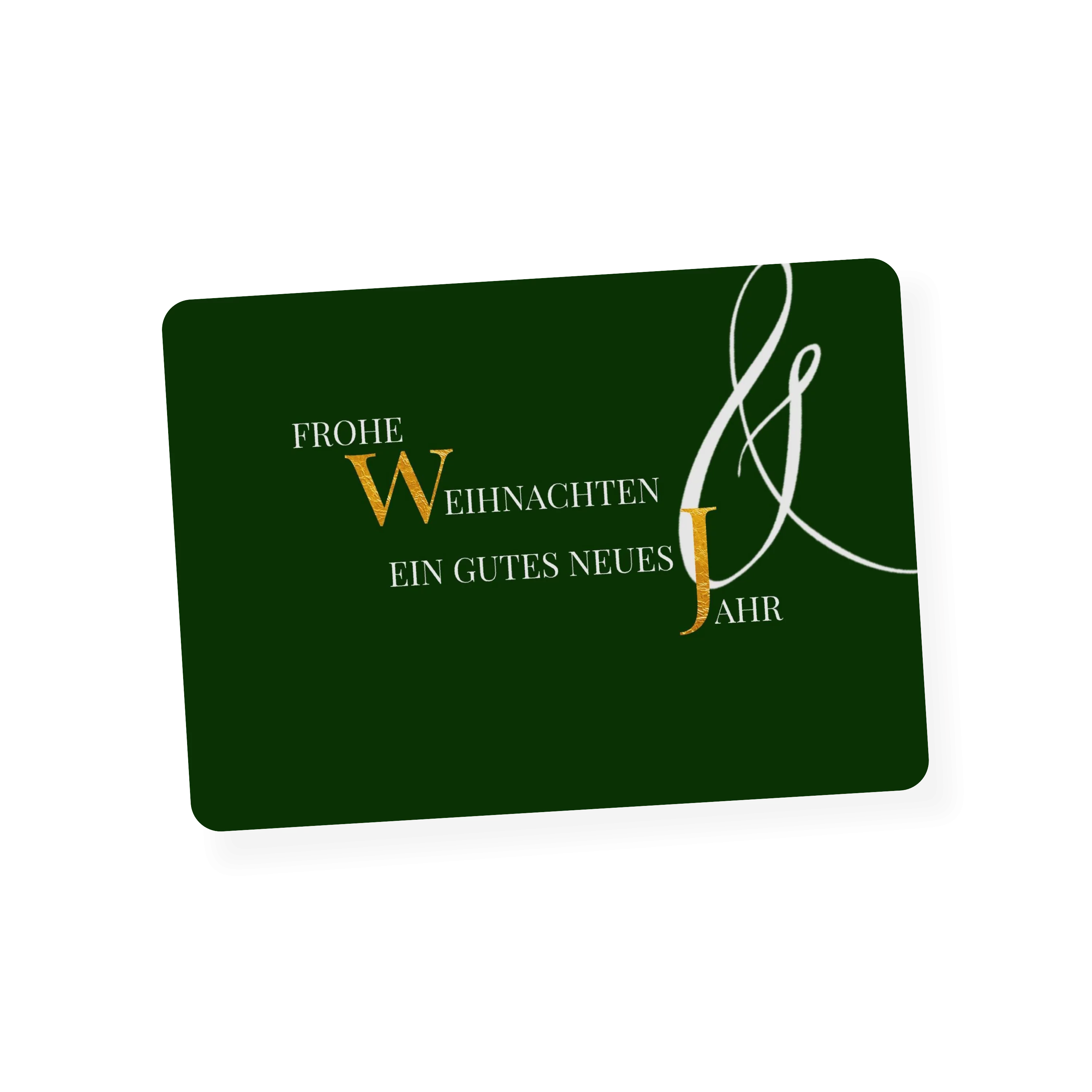 Diese Karte setzt auf reduzierte Eleganz: Goldene Initialen auf weihnachtlichen Farben und eine schwungvolle Ampersand-Grafik verbinden Weihnachten und Neujahr auf stilvolle Weise. Perfekt für klassische Grüße mit moderner Typografie.