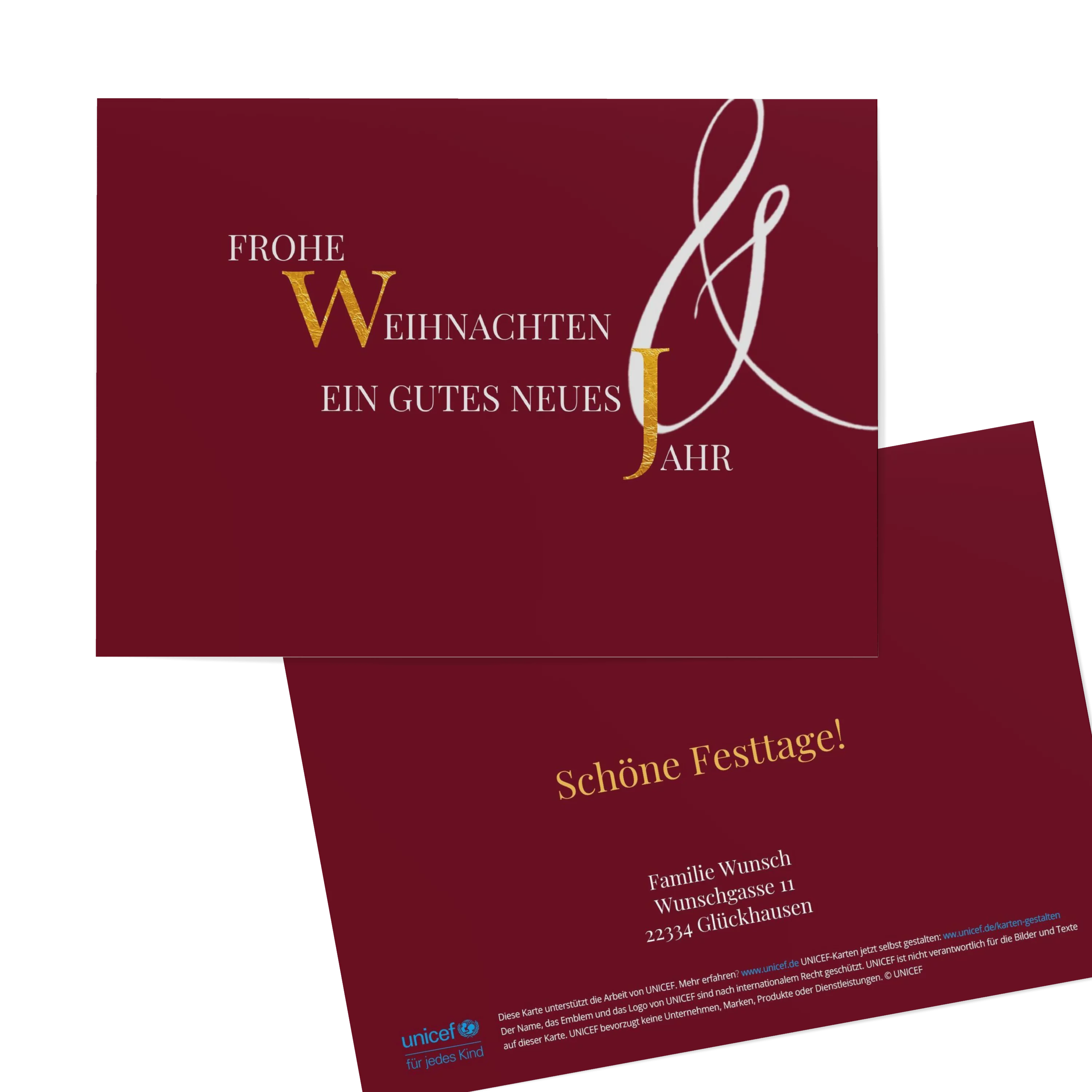 Diese Karte setzt auf reduzierte Eleganz: Goldene Initialen auf weihnachtlichen Farben und eine schwungvolle Ampersand-Grafik verbinden Weihnachten und Neujahr auf stilvolle Weise. Perfekt für klassische Grüße mit moderner Typografie.