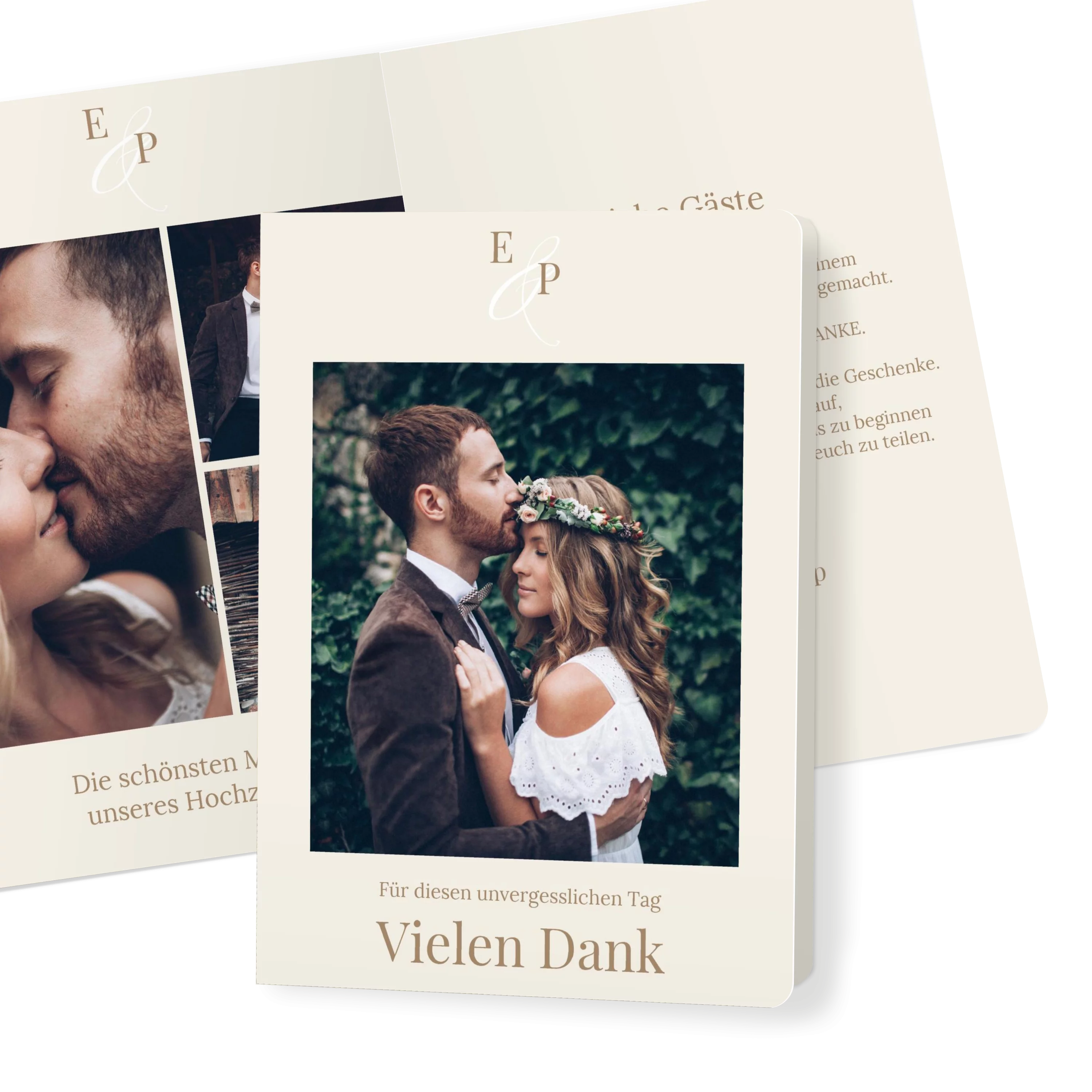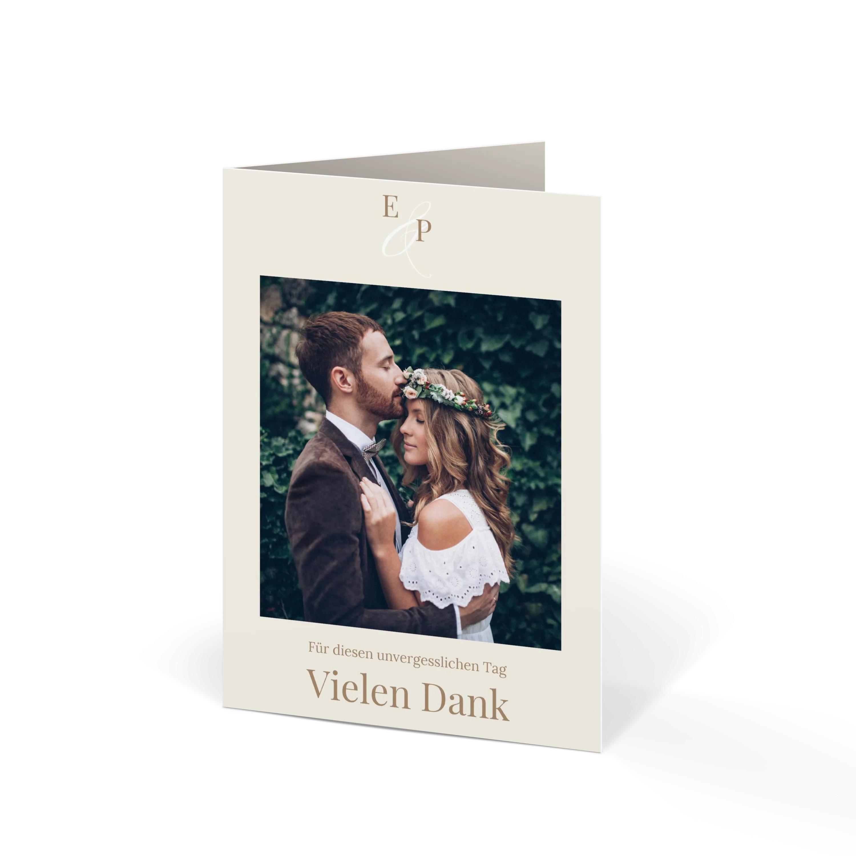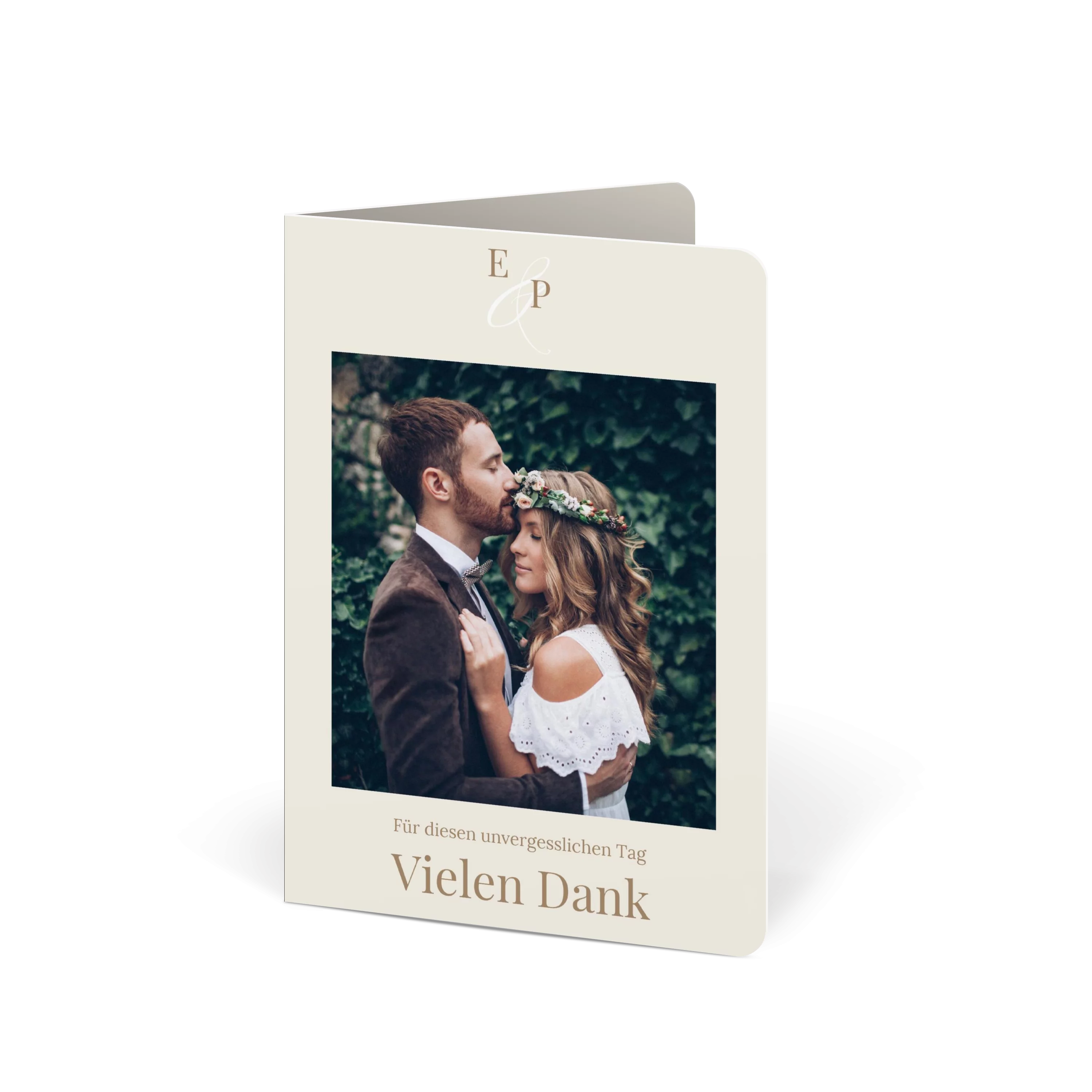Mit ihrem natürlichen Creme-Ton und dem liebevoll gewählten Foto schafft diese Karte einen sanften Rahmen für Ihr Dankeschön. Ideal, um Ihren Liebsten für all die schönen Momente und herzlichen Gesten an Ihrem großen Tag zu danken – persönlich, authentisch und von Herzen.