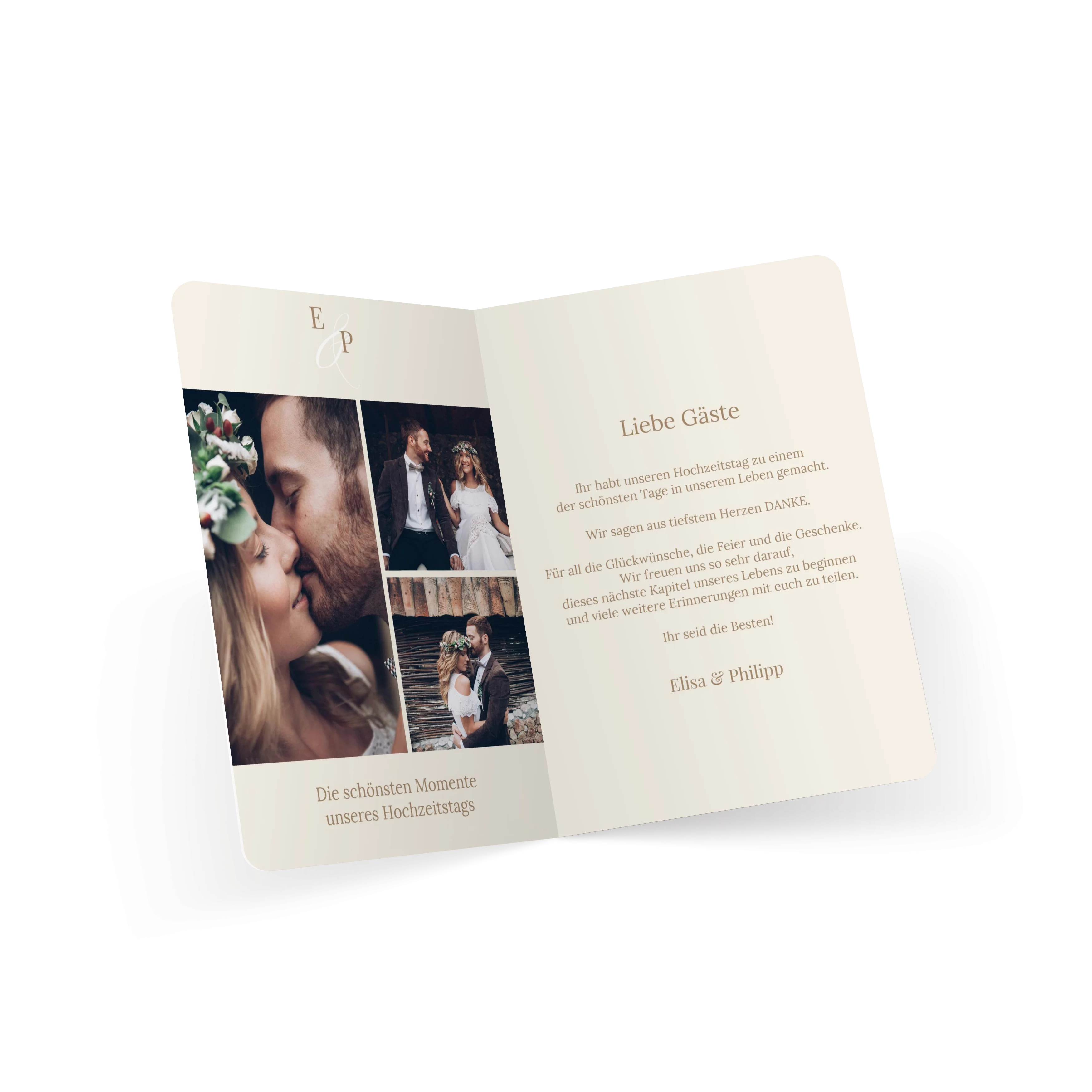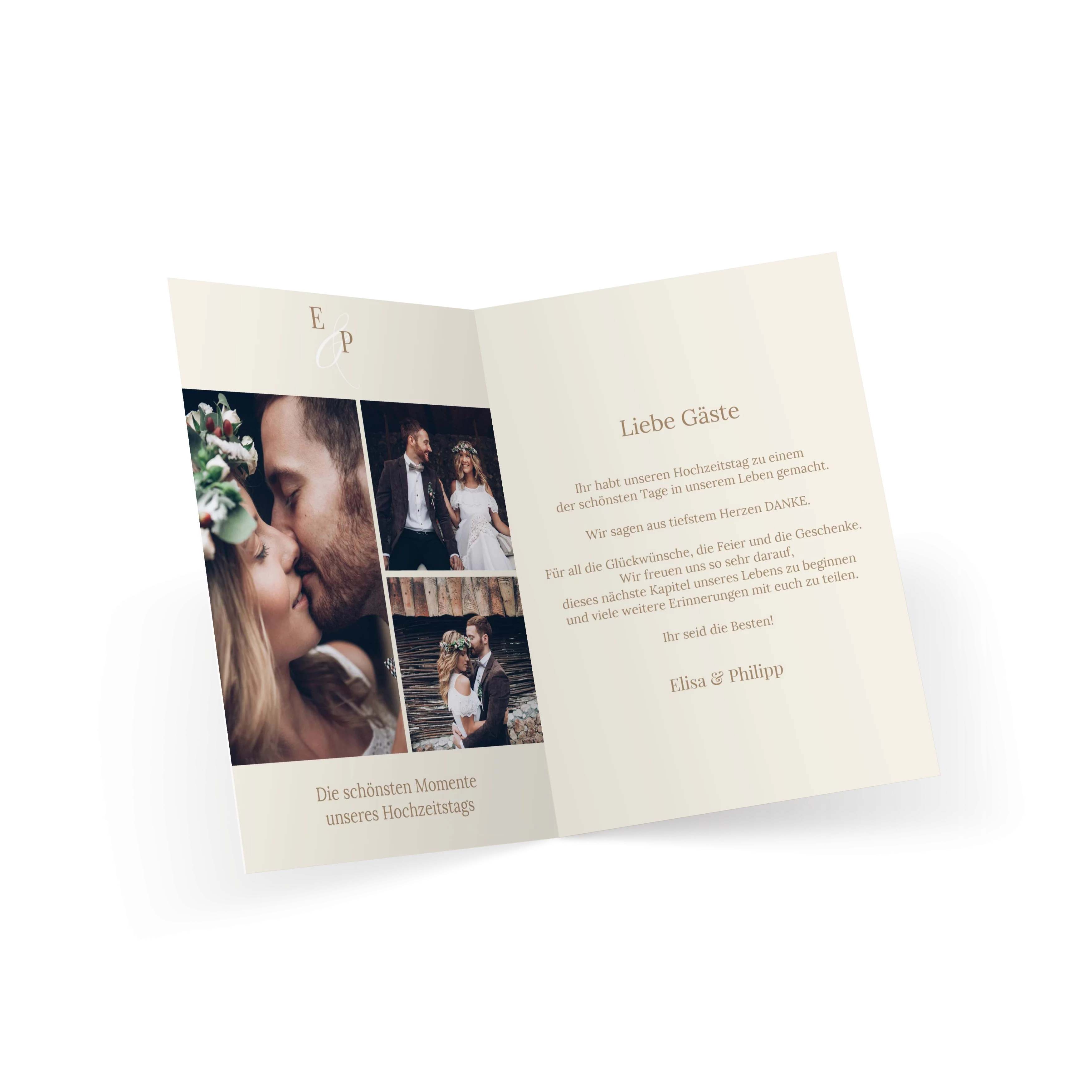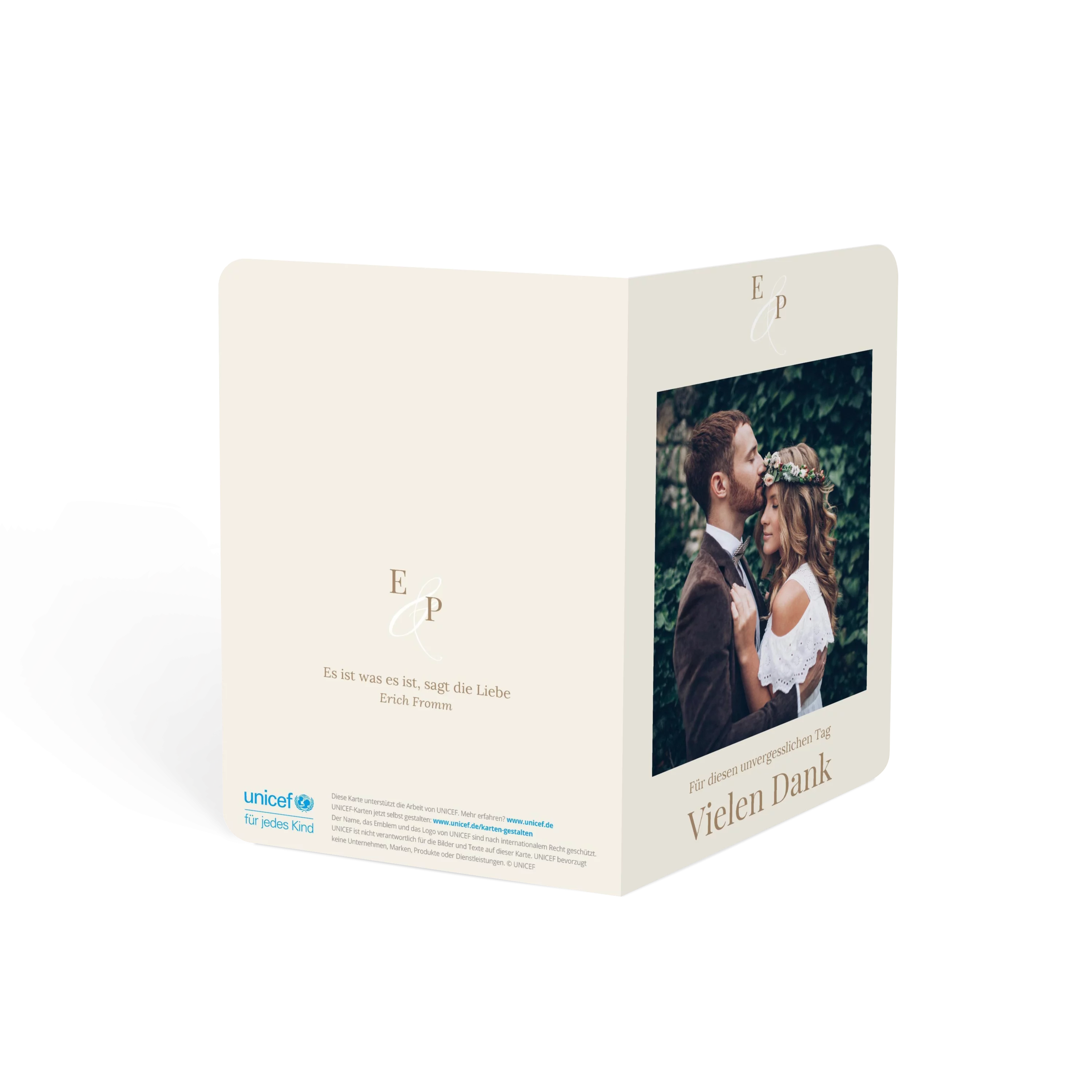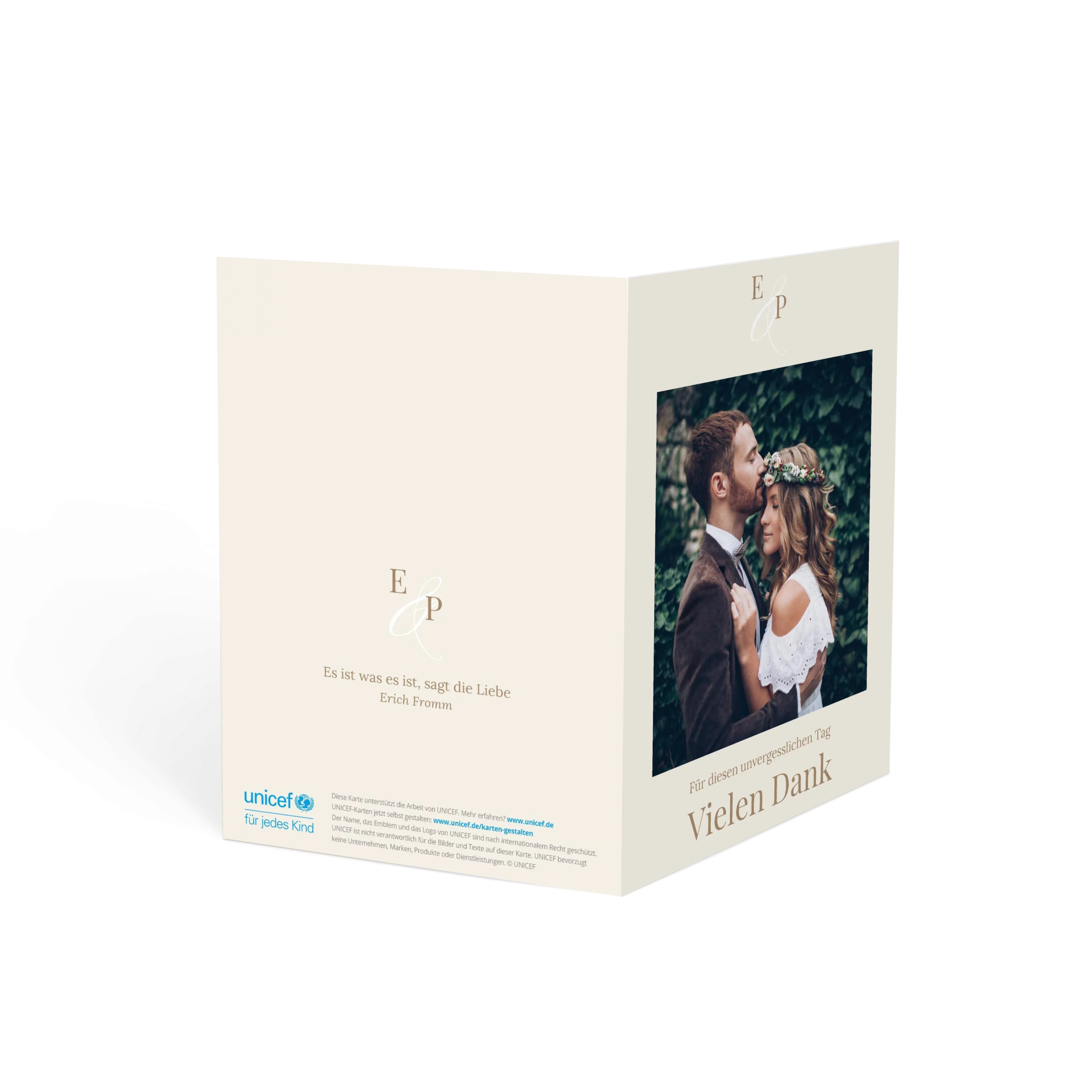 Mit ihrem natürlichen Creme-Ton und dem liebevoll gewählten Foto schafft diese Karte einen sanften Rahmen für Ihr Dankeschön. Ideal, um Ihren Liebsten für all die schönen Momente und herzlichen Gesten an Ihrem großen Tag zu danken – persönlich, authentisch und von Herzen.