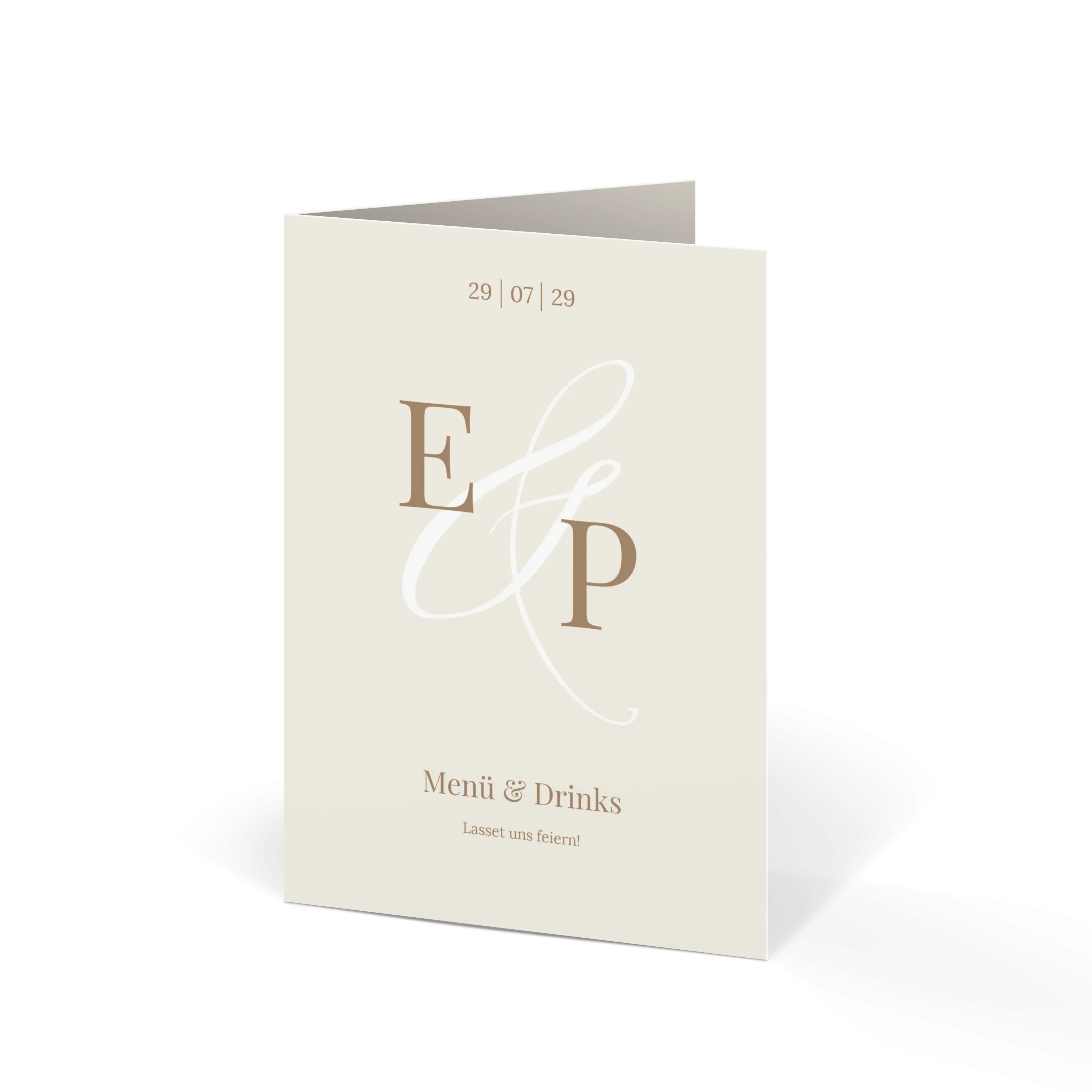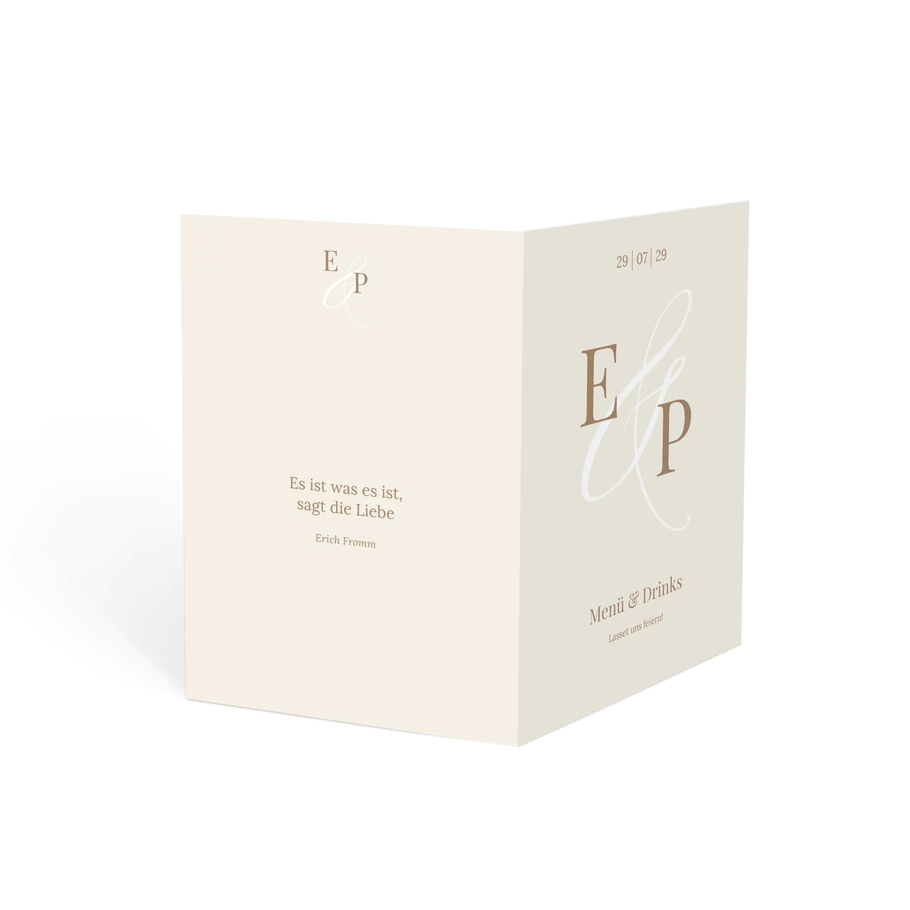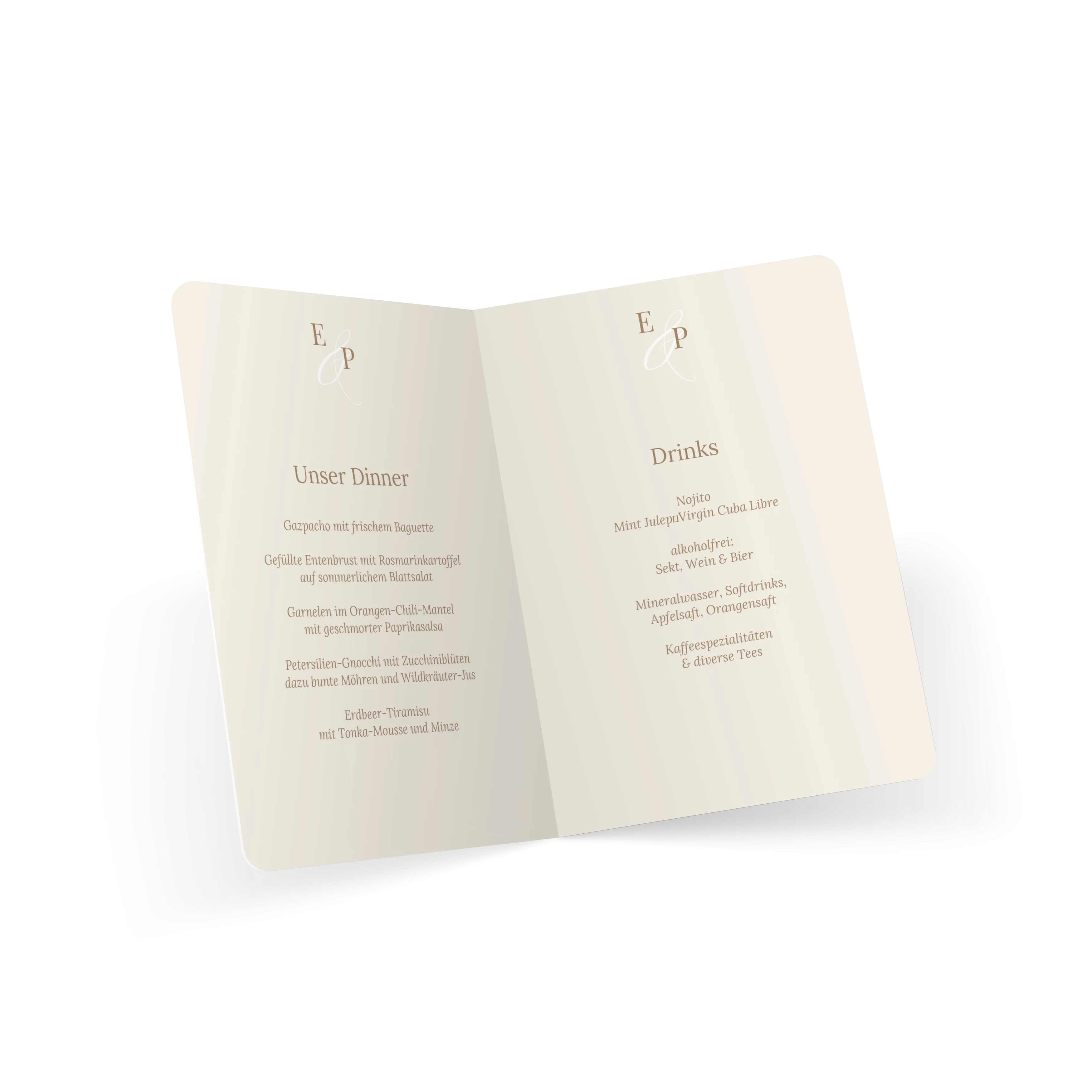 Mit großen Initialen und einem feinen &-Zeichen begleitet diese Menükarte Ihre Hochzeit auf persönliche Weise. Das zurückhaltende Design in Creme oder Minze lässt Raum für Rituale, Lieder und all die besonderen Momente, die diesen Tag unvergesslich machen.