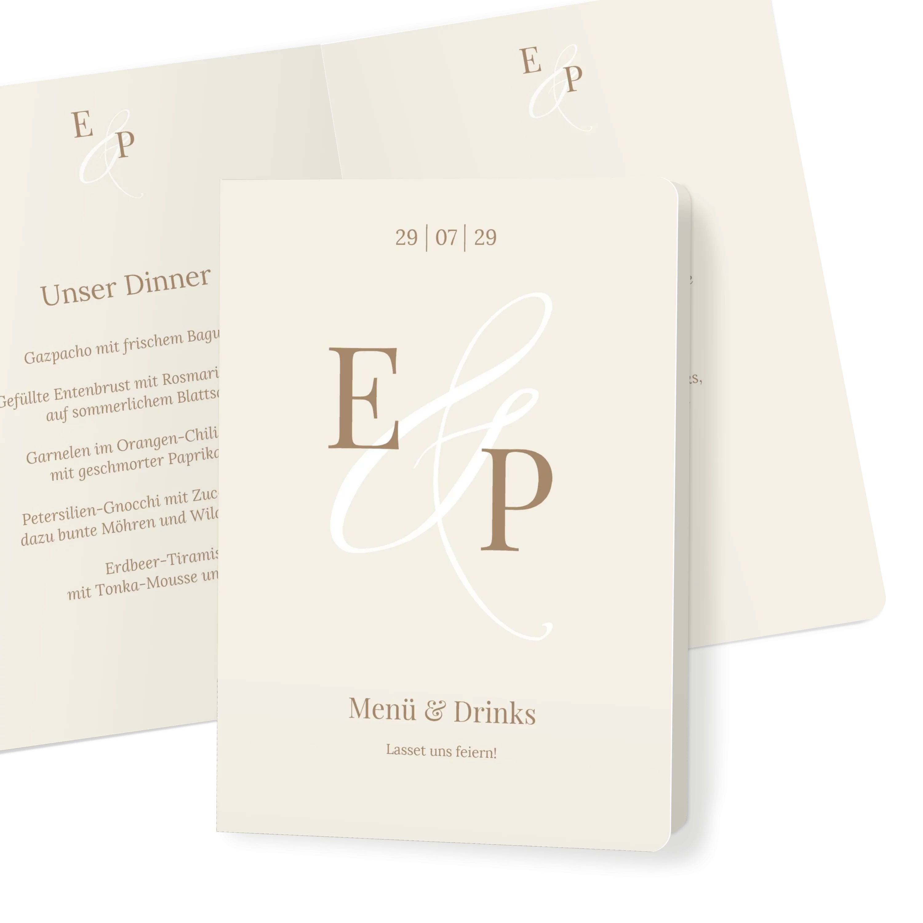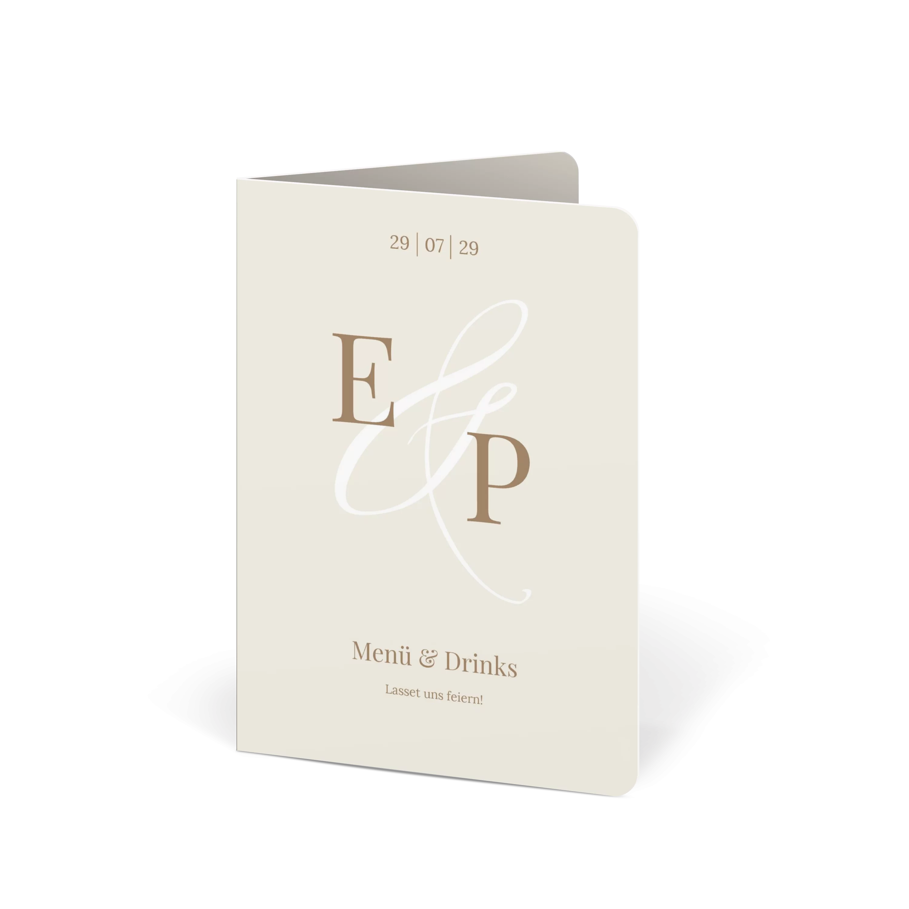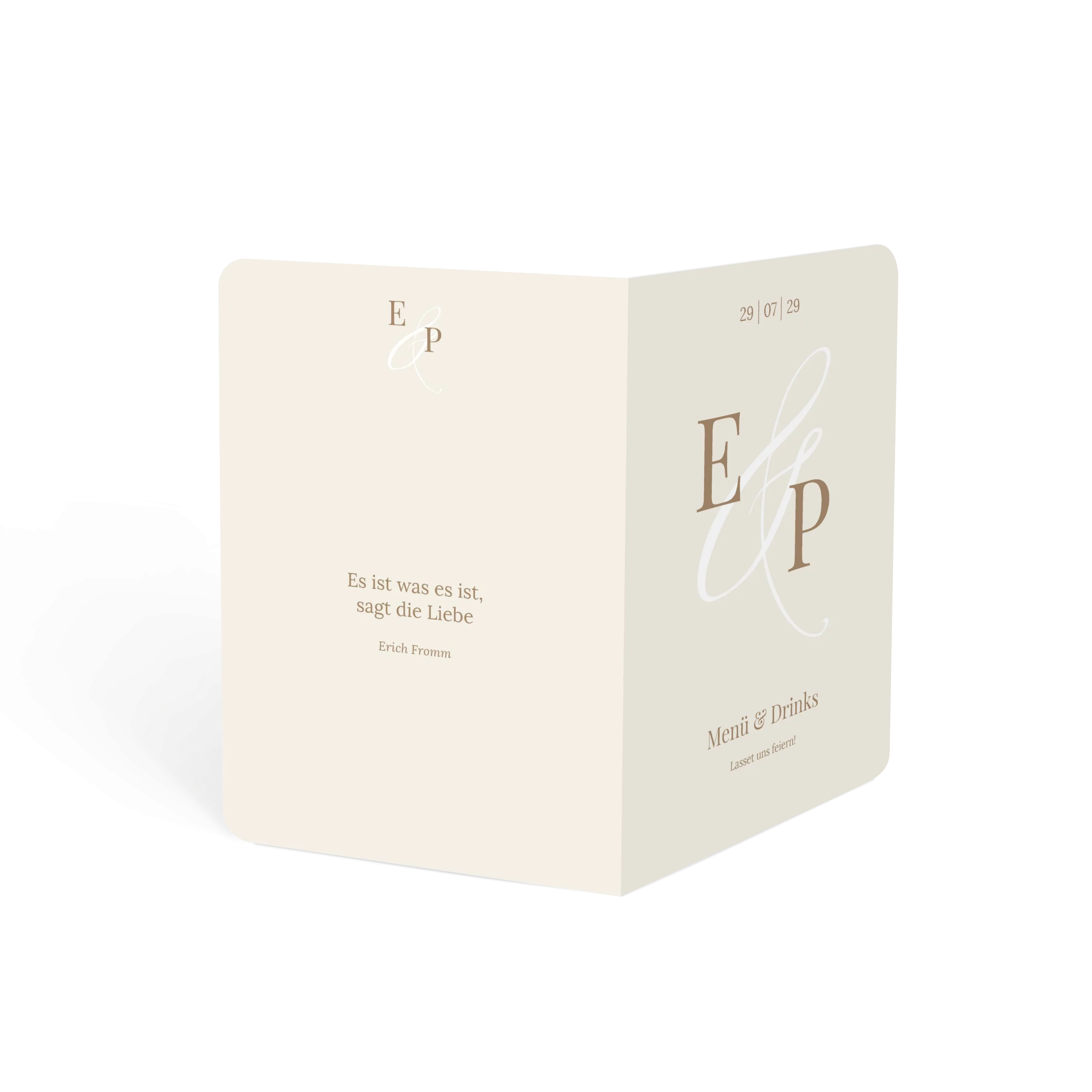 Mit großen Initialen und einem feinen &-Zeichen begleitet diese Menükarte Ihre Hochzeit auf persönliche Weise. Das zurückhaltende Design in Creme oder Minze lässt Raum für Rituale, Lieder und all die besonderen Momente, die diesen Tag unvergesslich machen.