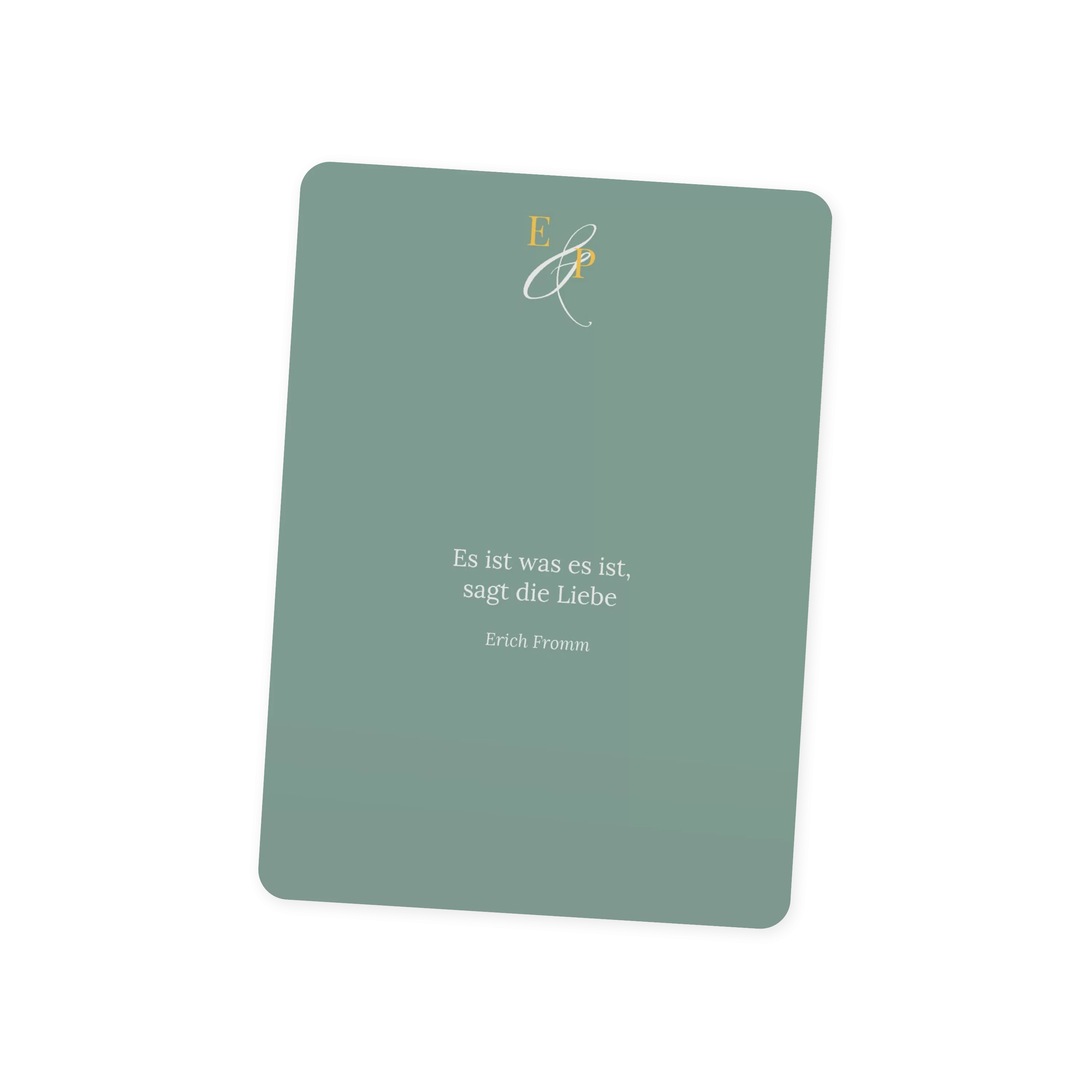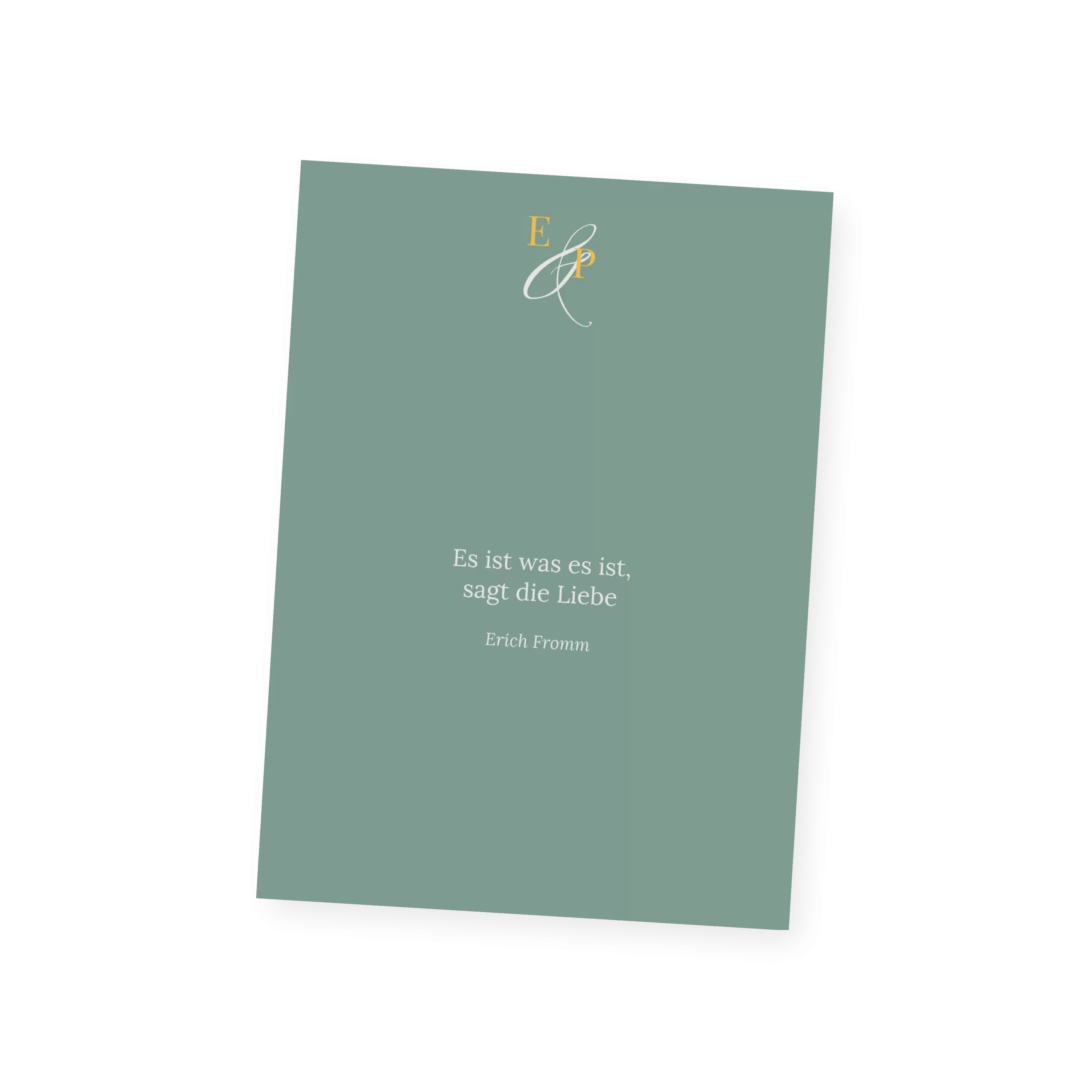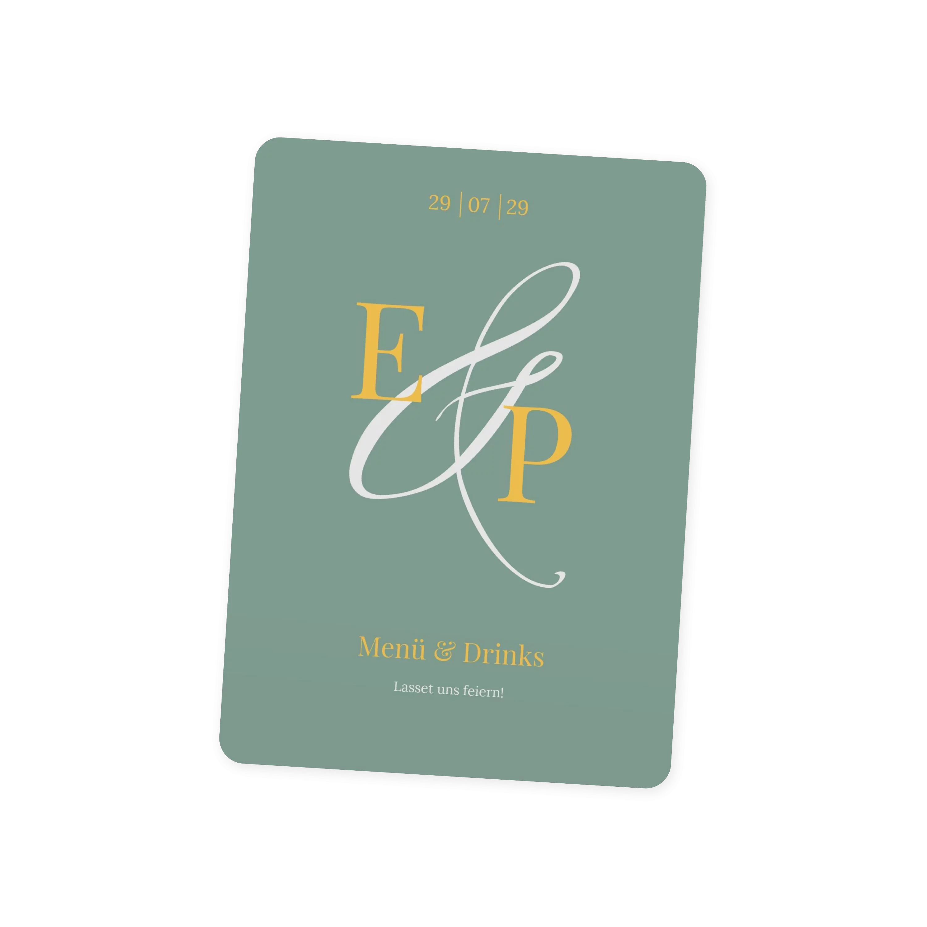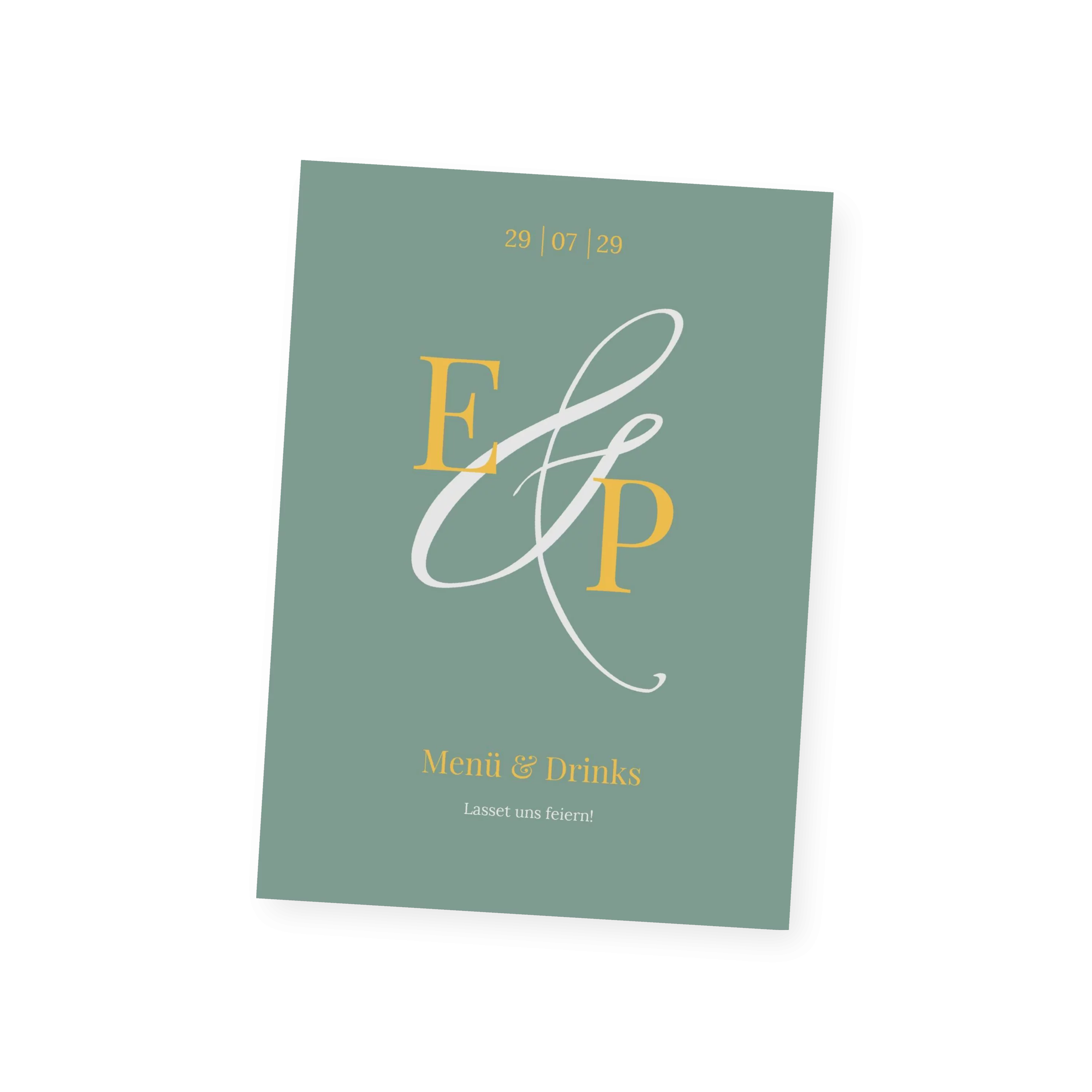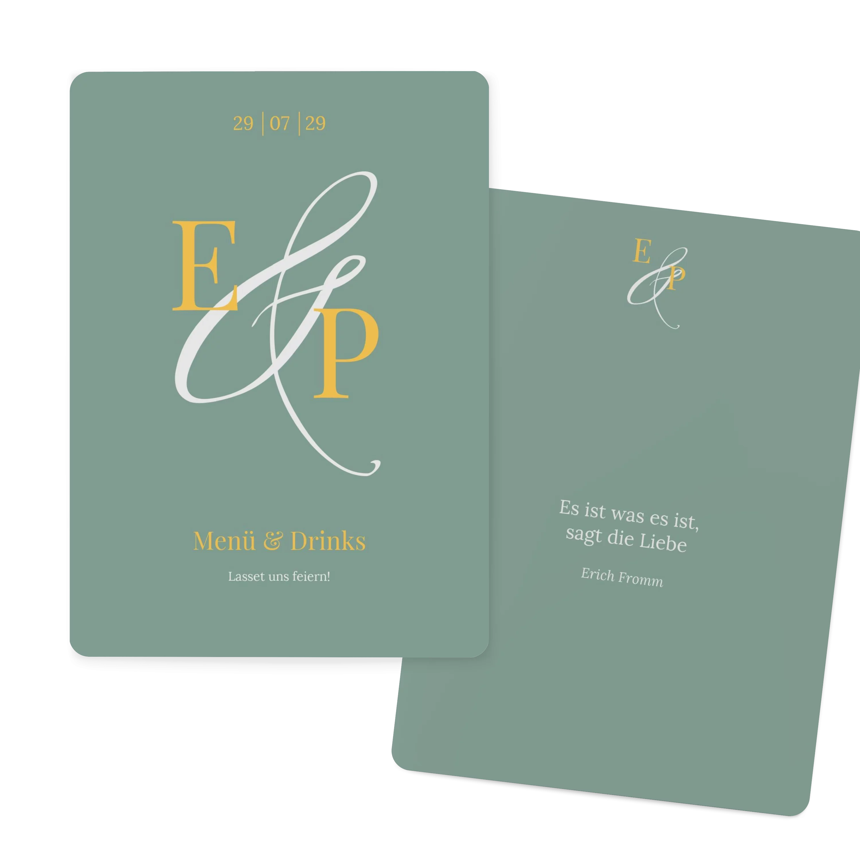 Mit großen Initialen und einem feinen &-Zeichen begleitet diese Menükarte Ihre Hochzeit auf persönliche Weise. Das zurückhaltende Design in Creme oder Minze lässt Raum für Rituale, Lieder und all die besonderen Momente, die diesen Tag unvergesslich machen.