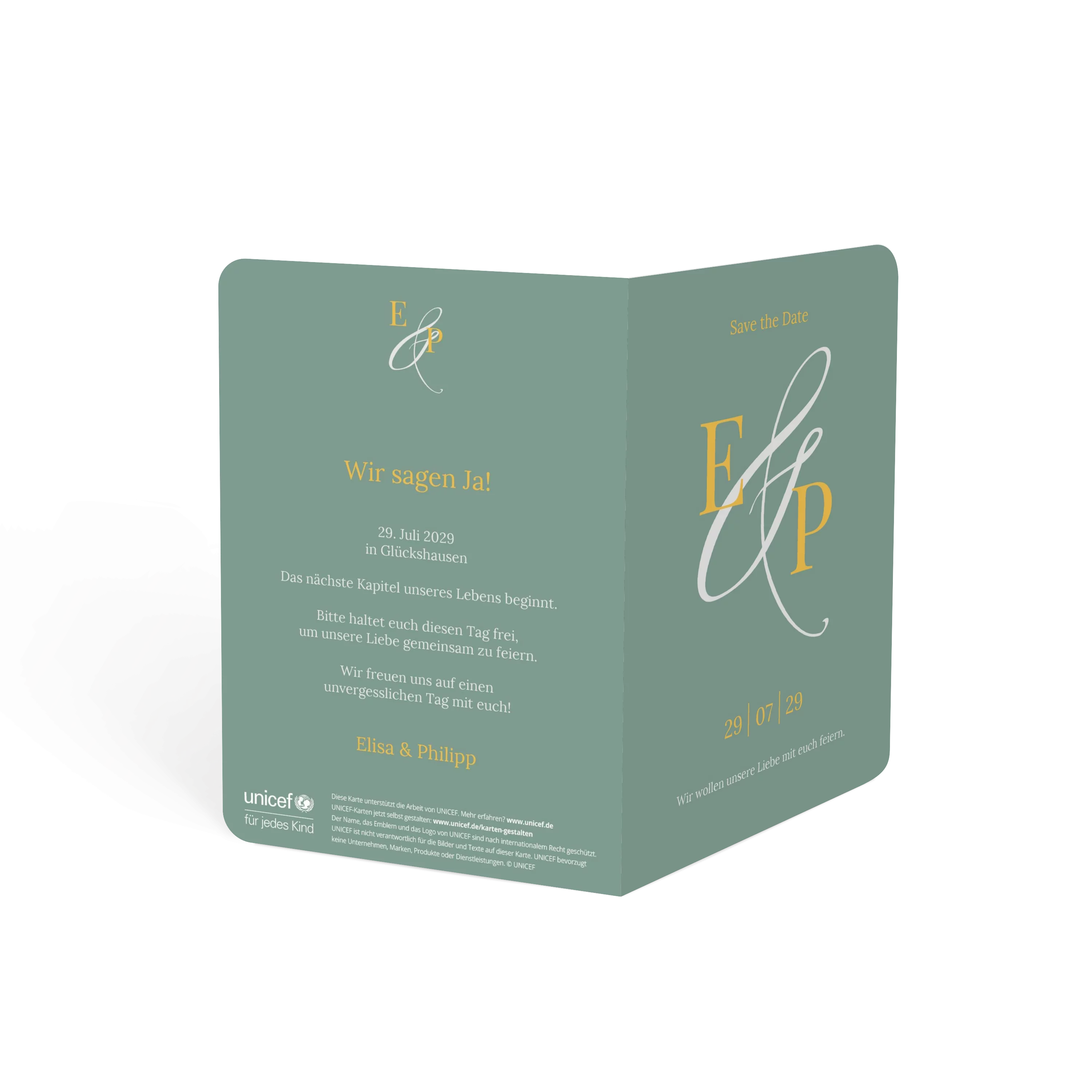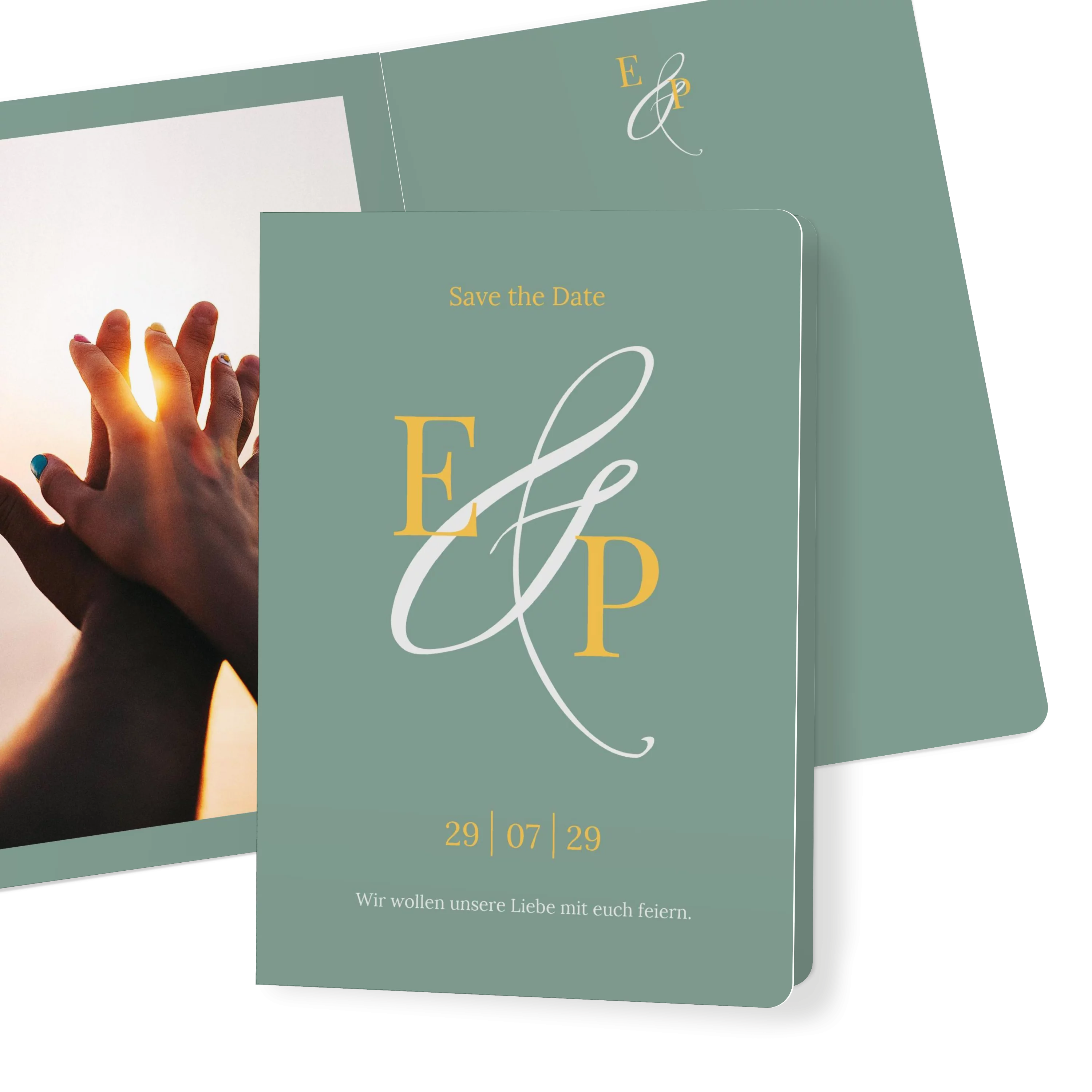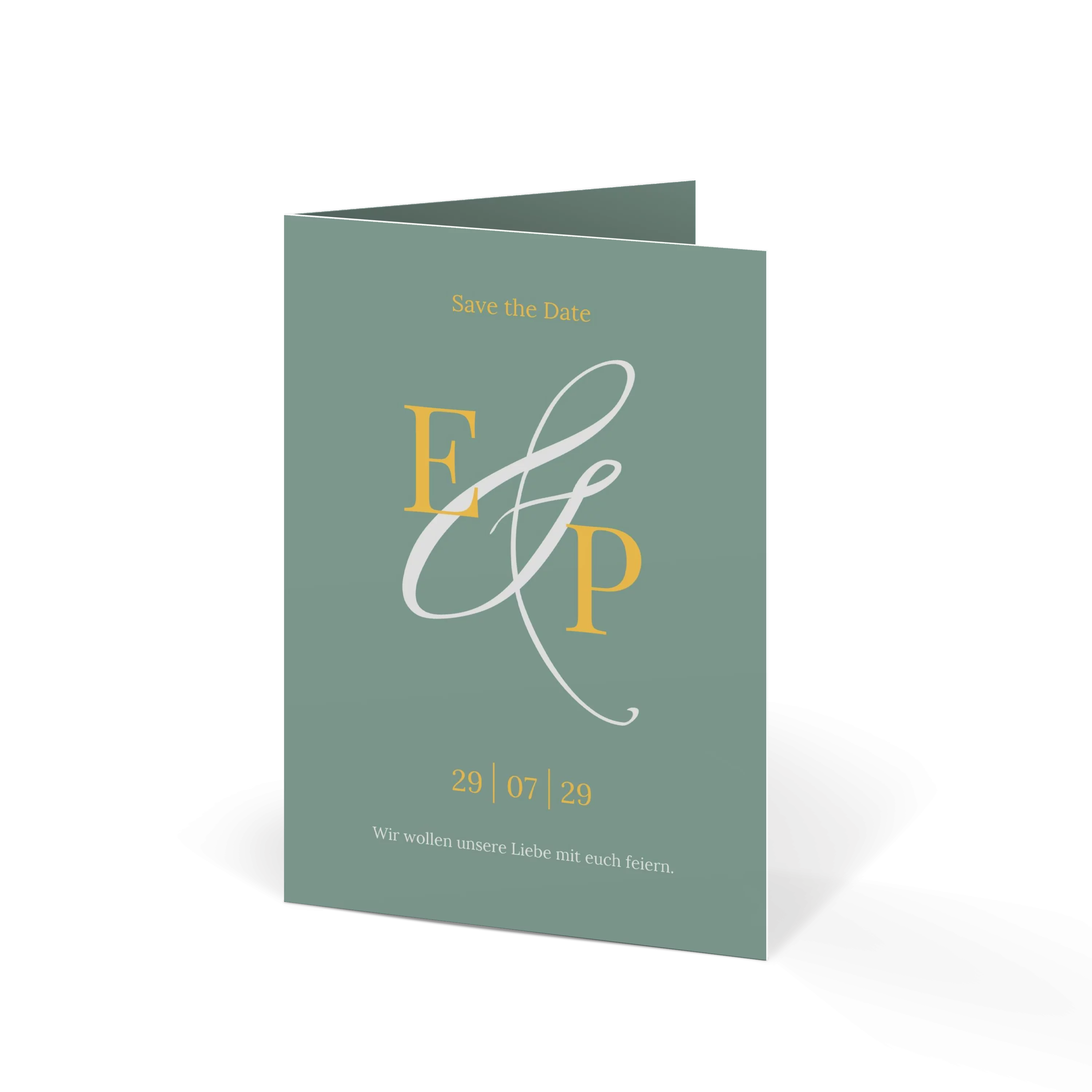 Mit ihren großen Initialen und dem geschwungenen &-Zeichen setzt diese Save-the-Date-Karte ein erstes, starkes Zeichen der Liebe. Das zurückhaltende Design in Creme oder Minze gibt Ihrem Hochzeitstermin auf ganz persönliche Weise Raum – ruhig, edel und mit Vorfreude.
