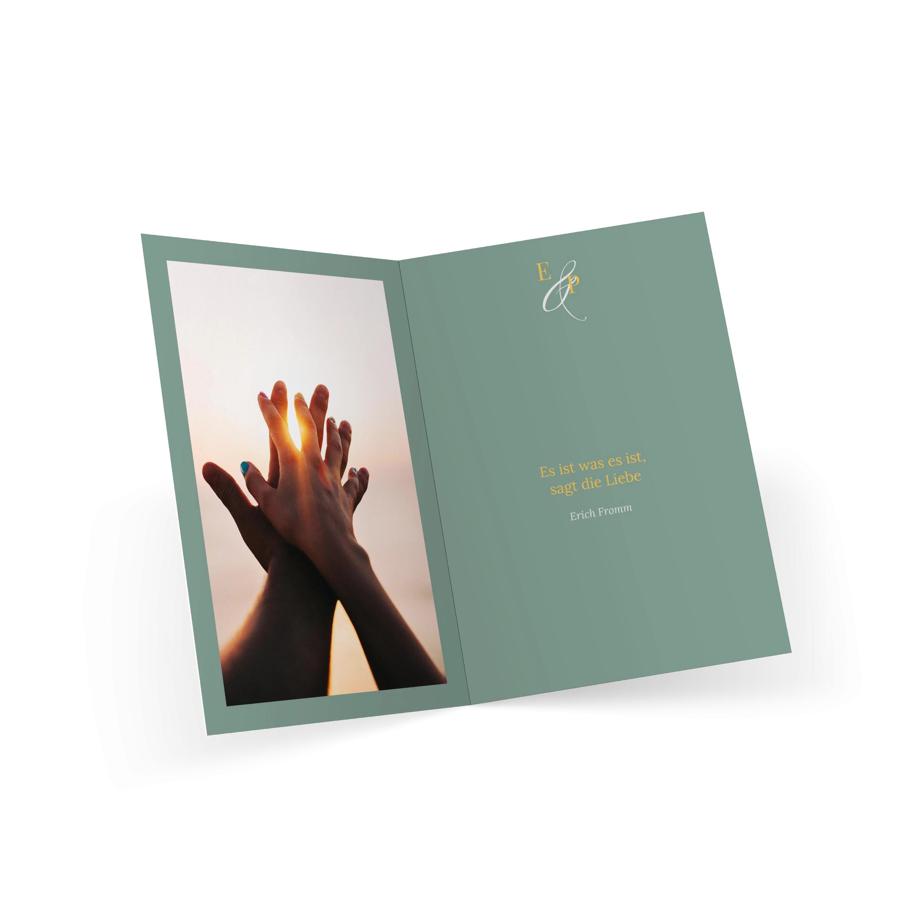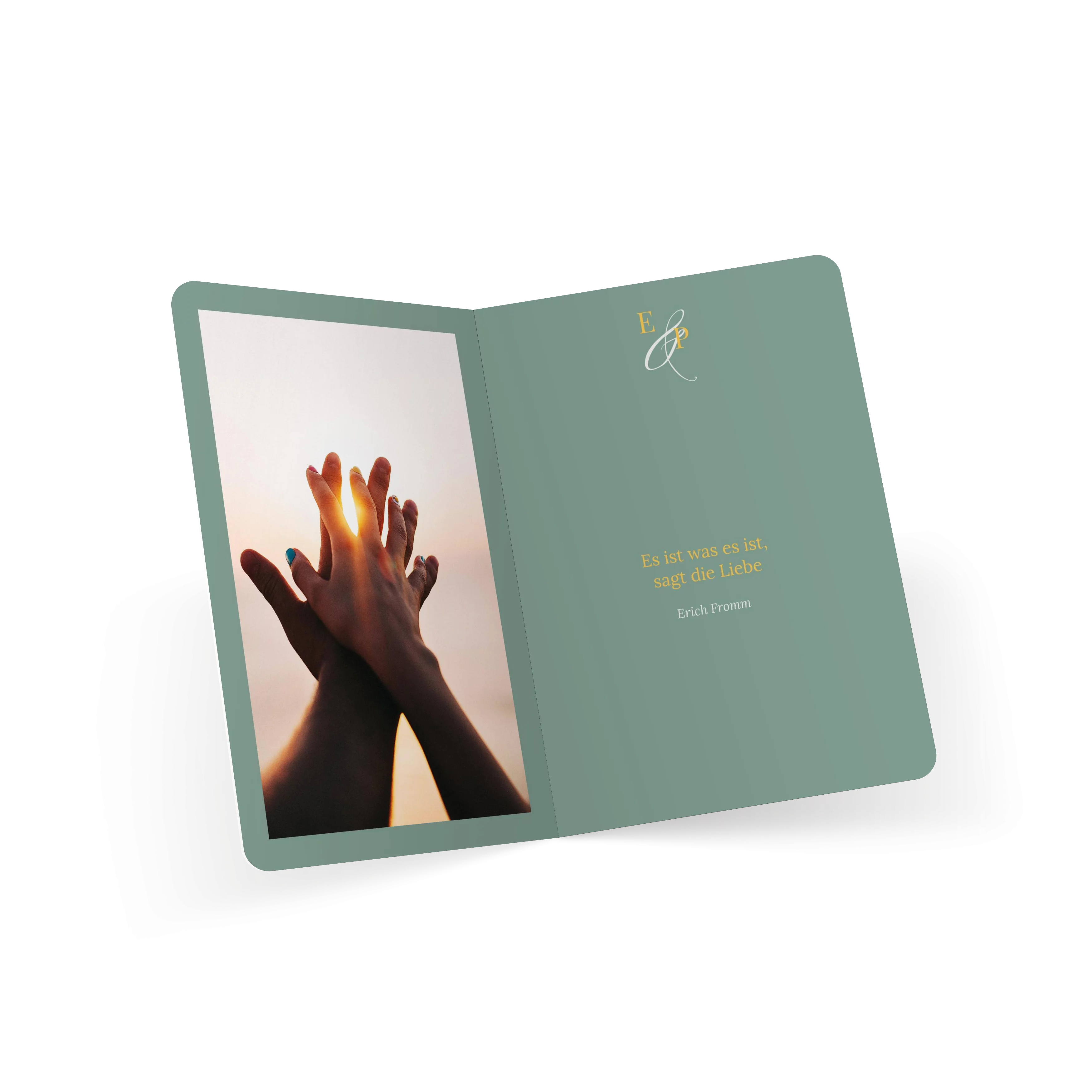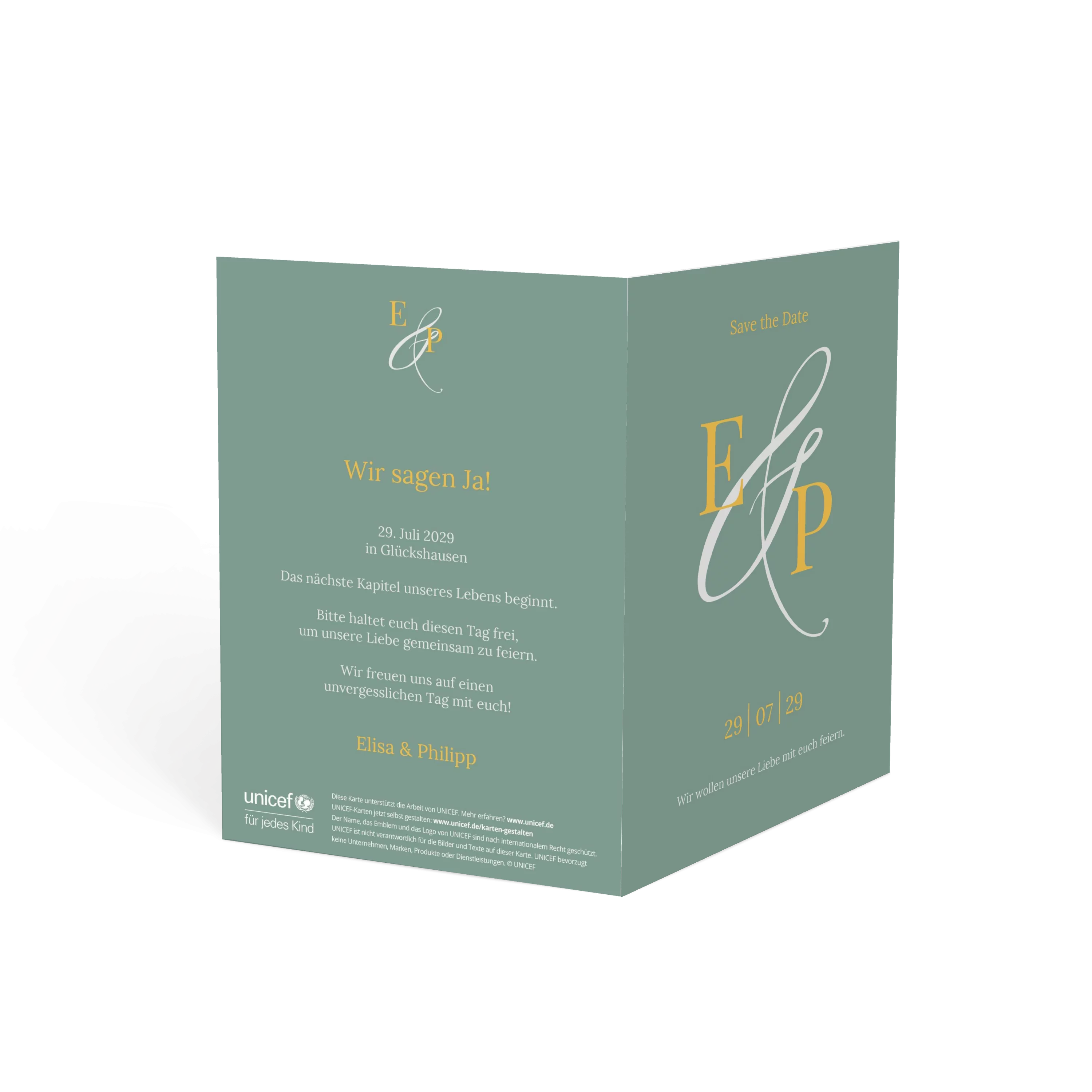 Mit ihren großen Initialen und dem geschwungenen &-Zeichen setzt diese Save-the-Date-Karte ein erstes, starkes Zeichen der Liebe. Das zurückhaltende Design in Creme oder Minze gibt Ihrem Hochzeitstermin auf ganz persönliche Weise Raum – ruhig, edel und mit Vorfreude.
