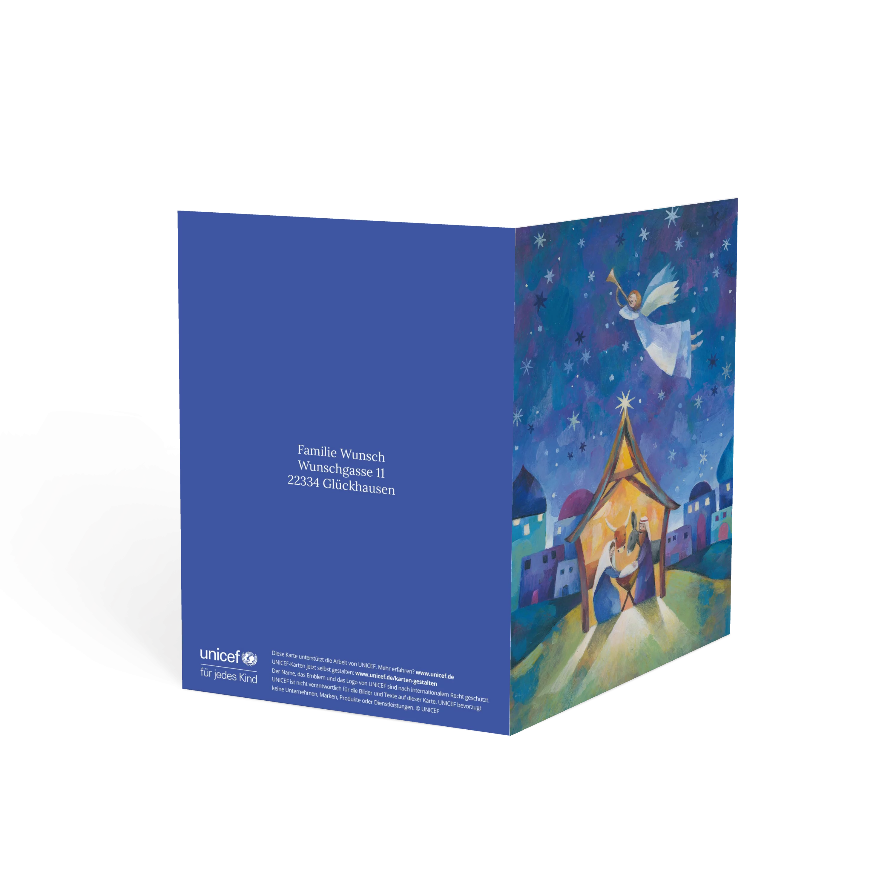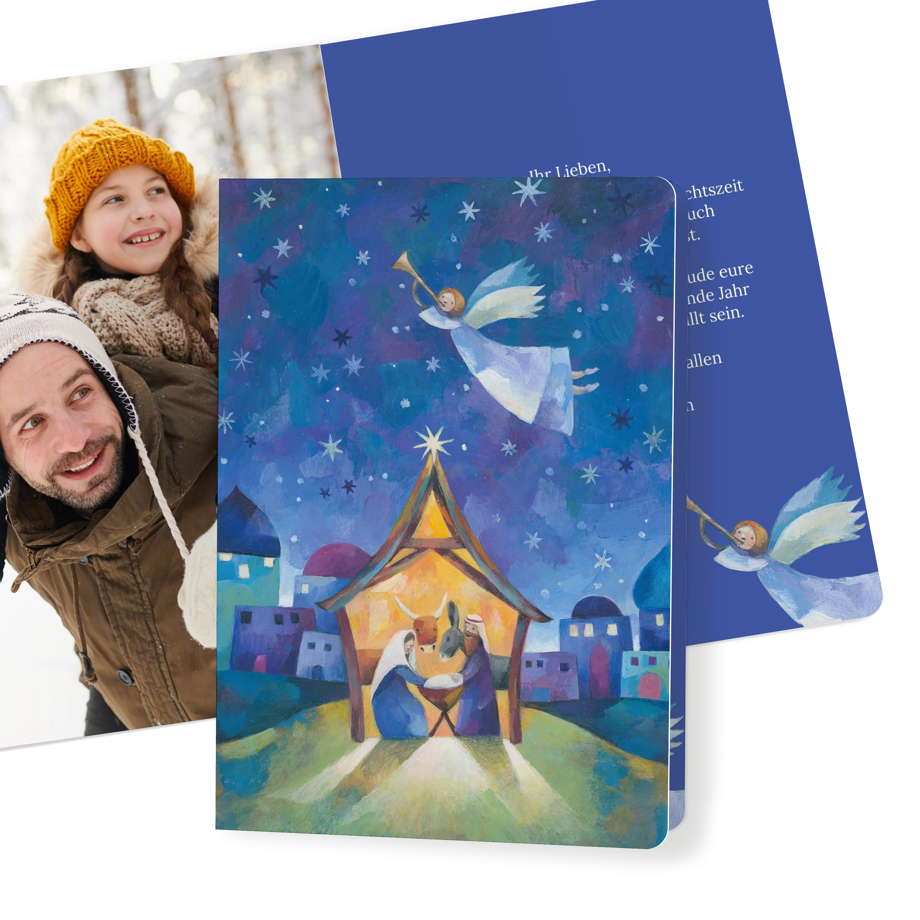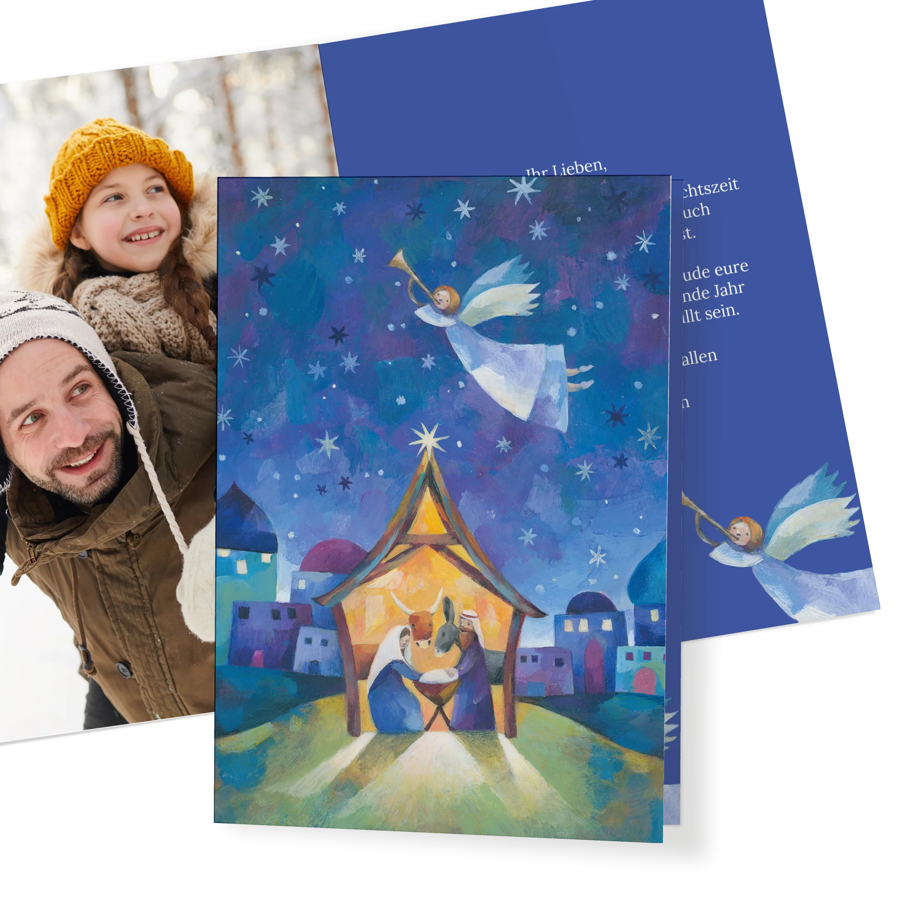 Die bekannteste Szene der Weihnachtsgeschichte illustriert in märchenhaften Farben. Inmitten eines funkelnden Nachthimmels strahlt die Krippenszene in warmem Licht- für Ihre bezaubernden Weihnachtsgrüße.