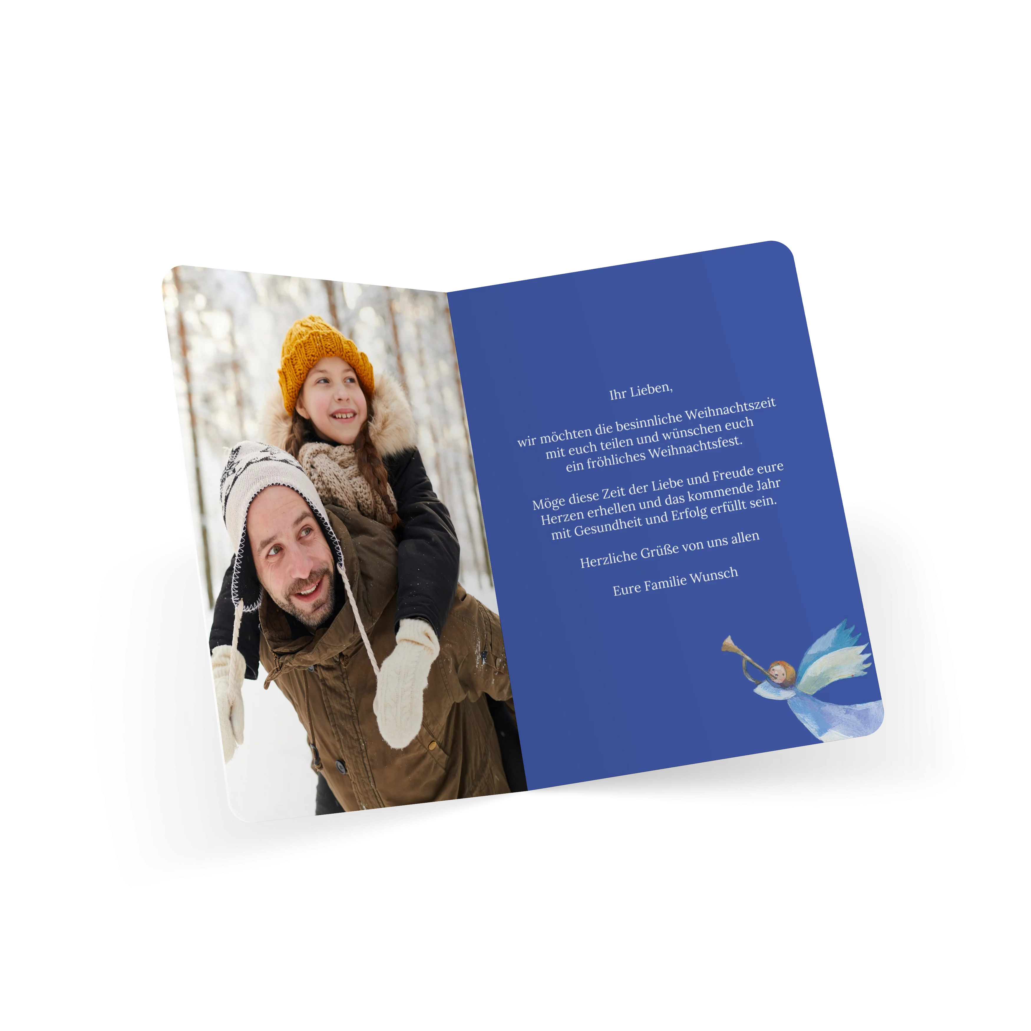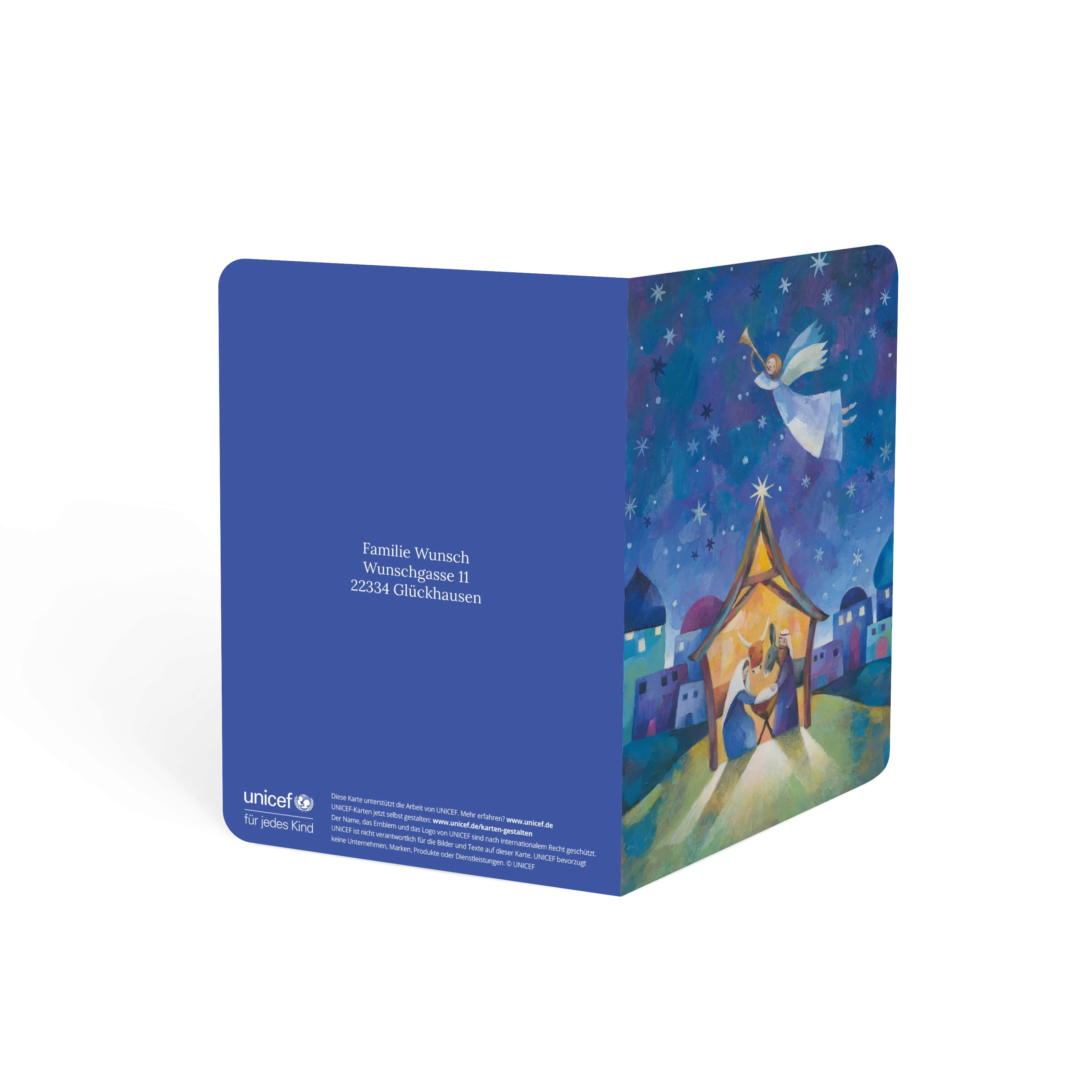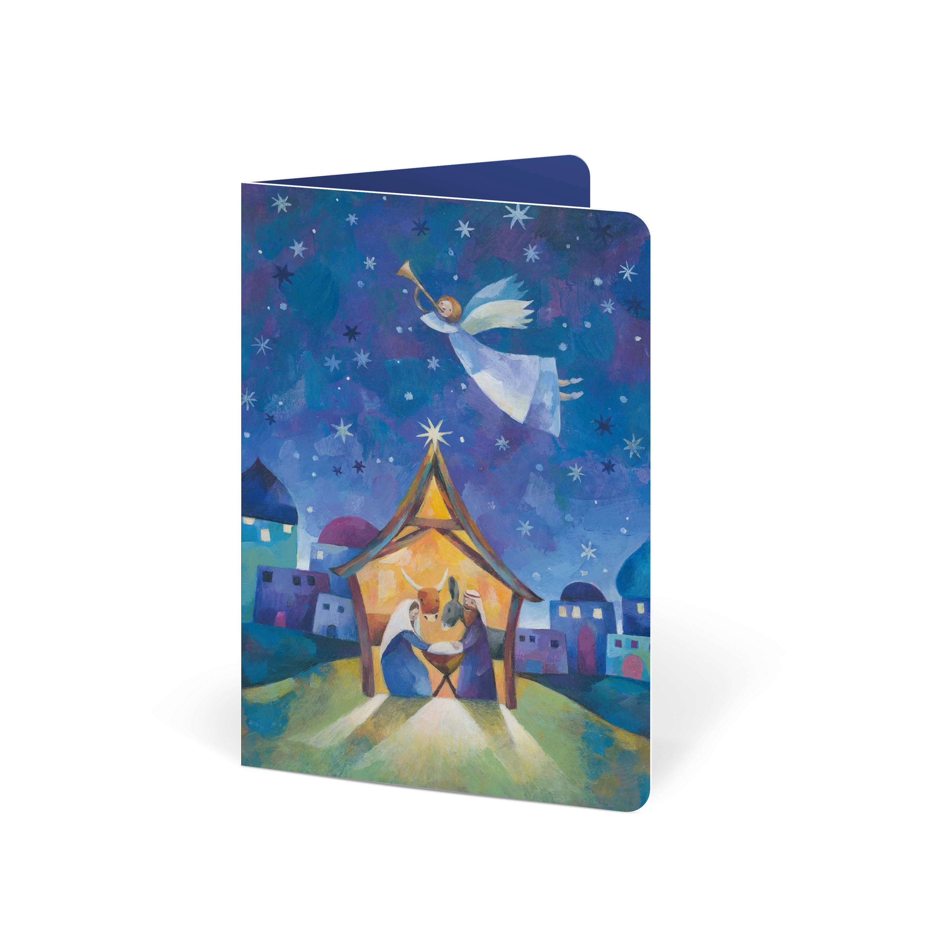 Die bekannteste Szene der Weihnachtsgeschichte illustriert in märchenhaften Farben. Inmitten eines funkelnden Nachthimmels strahlt die Krippenszene in warmem Licht- für Ihre bezaubernden Weihnachtsgrüße.
