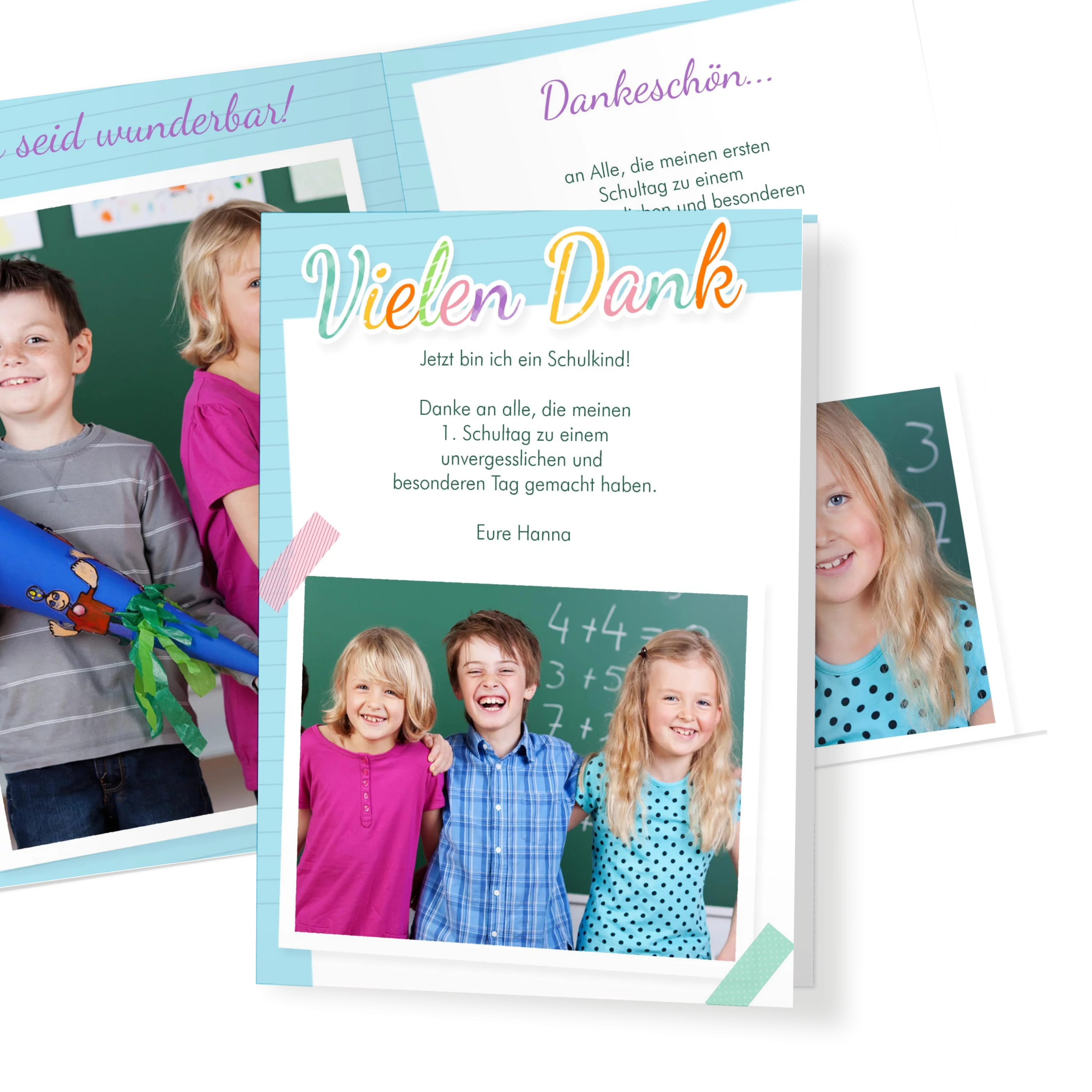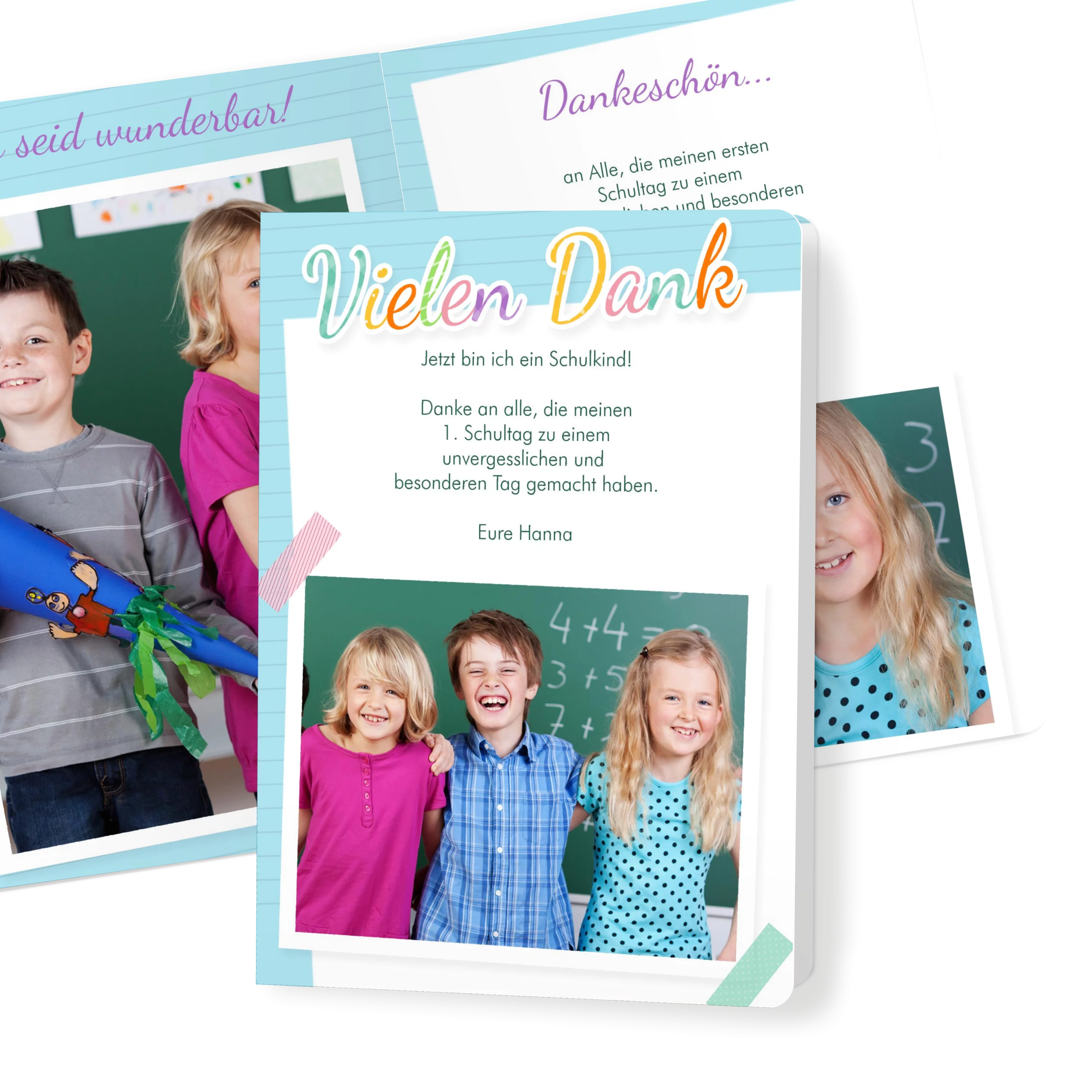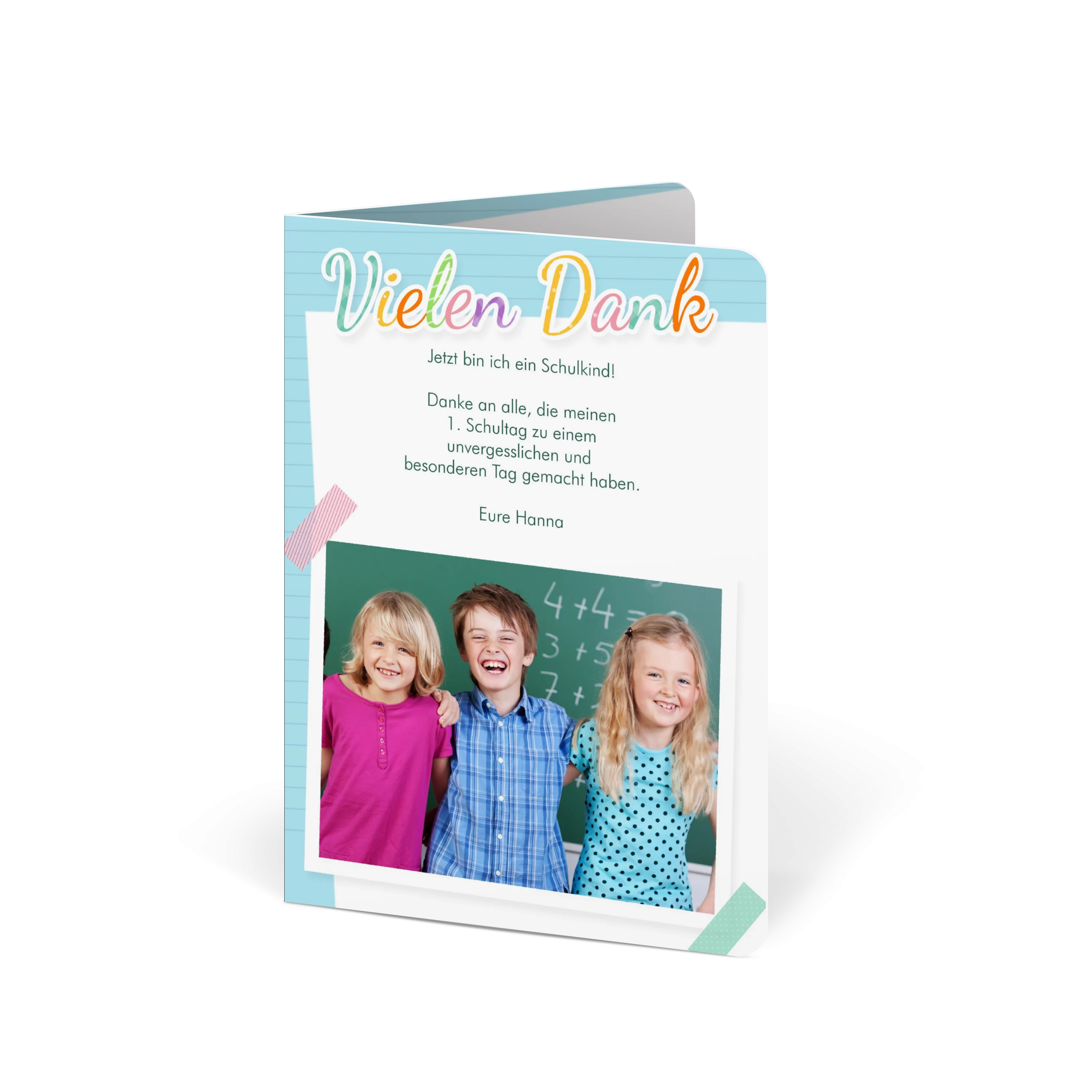 Der verspielte Schreibpapier-Look und das große Foto machen diese Karte zu einem lebendigen Dankeschön nach der Einschulung. Ideal, um sich bei allen Gästen für einen unvergesslichen Tag zu bedanken – persönlich und mit einem Lächeln.