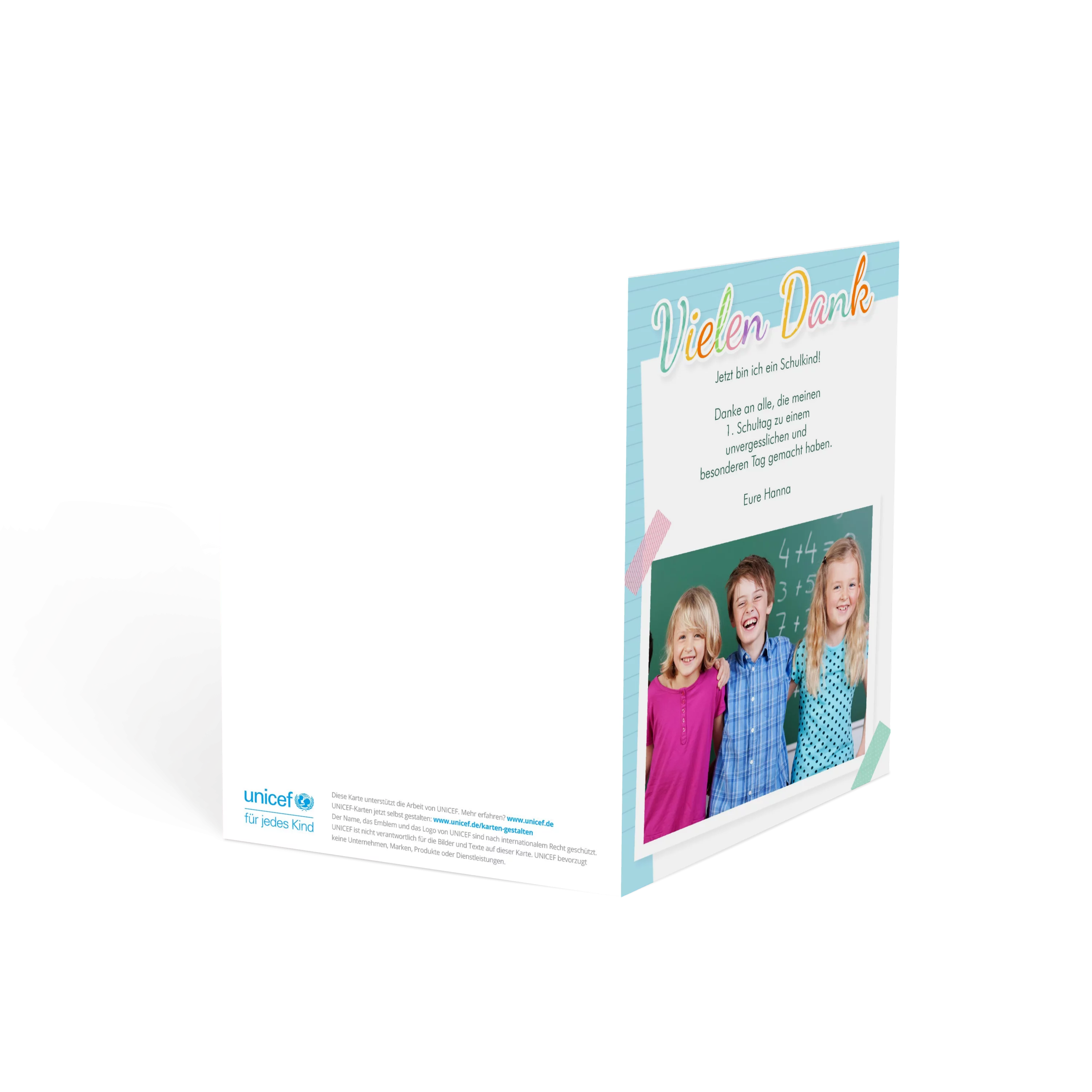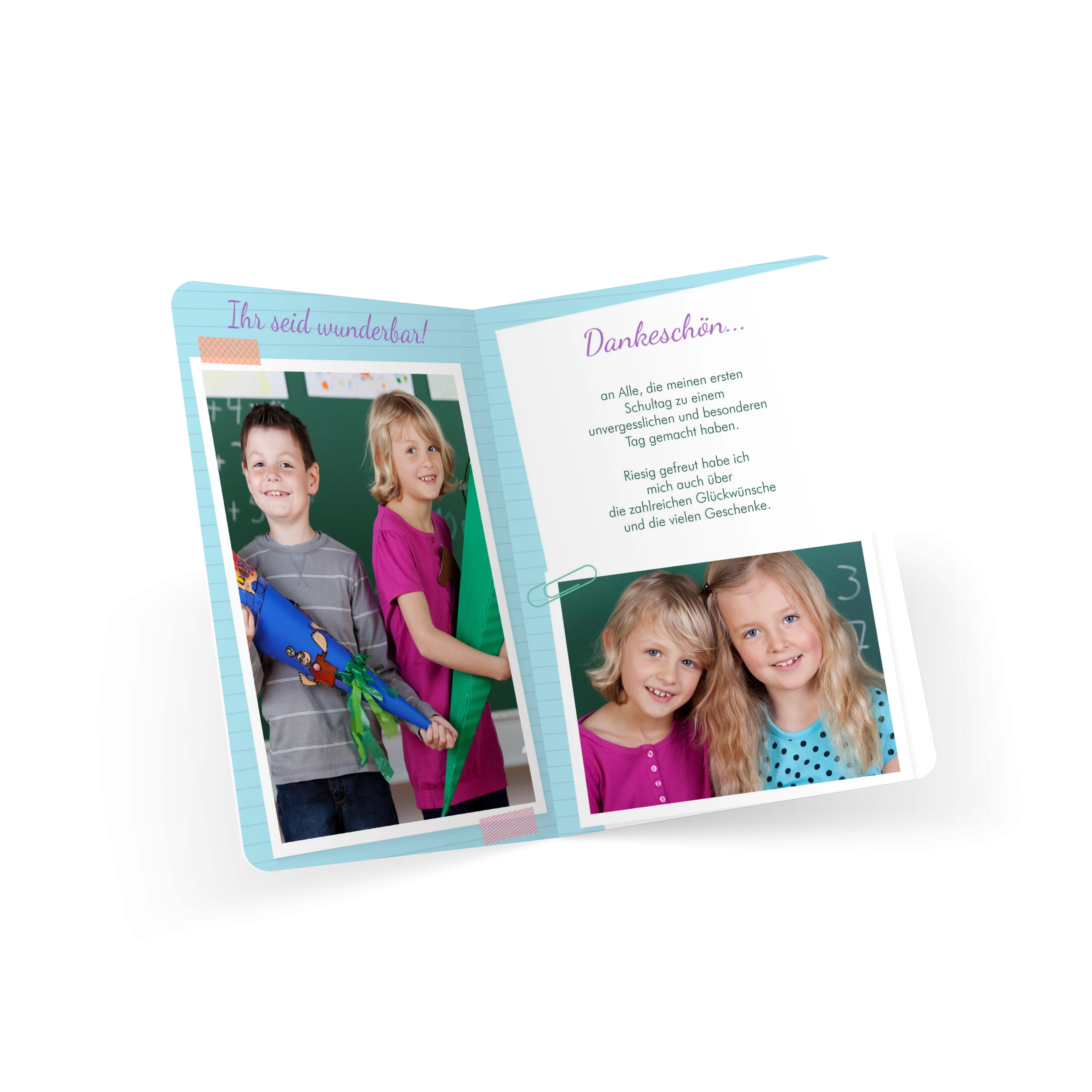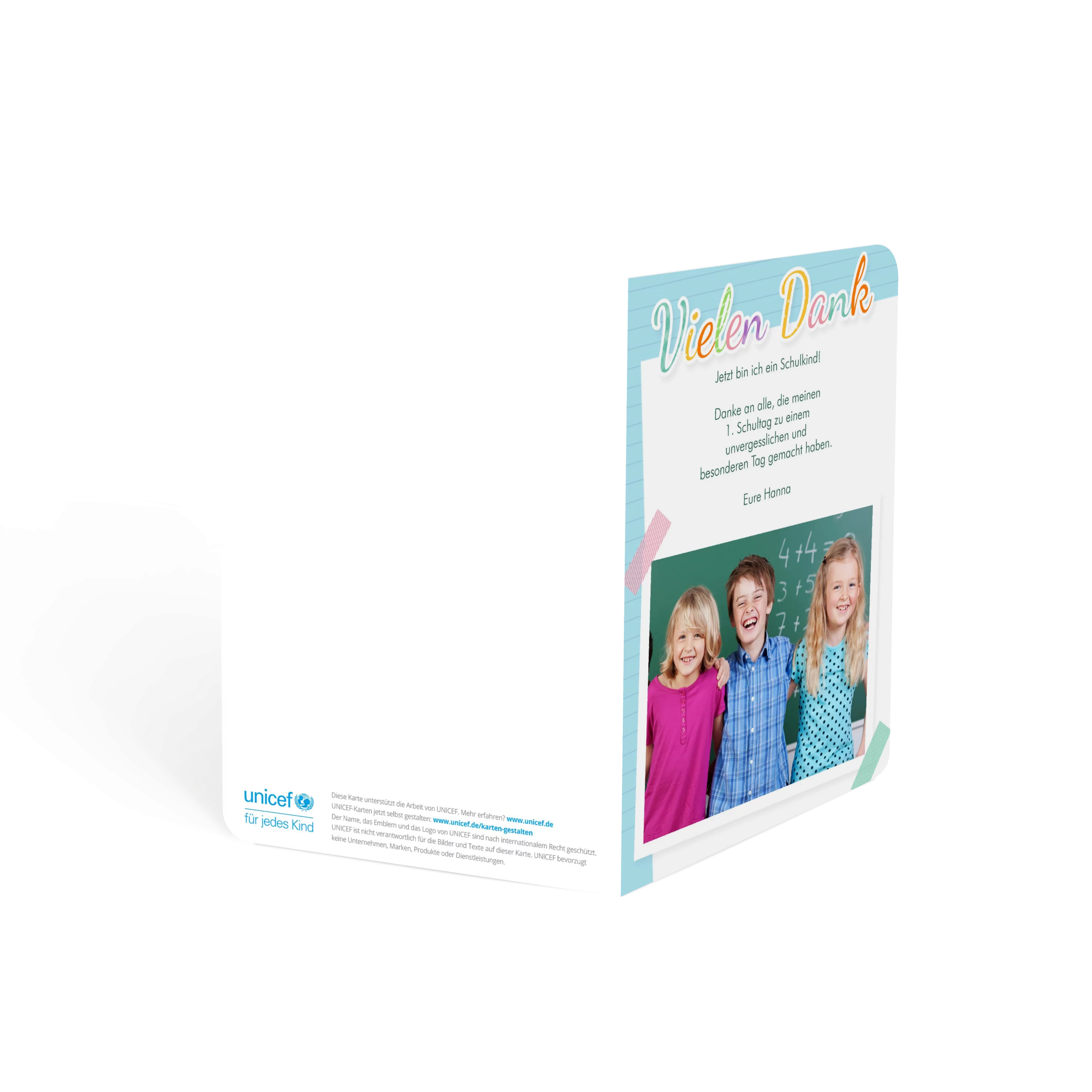 Der verspielte Schreibpapier-Look und das große Foto machen diese Karte zu einem lebendigen Dankeschön nach der Einschulung. Ideal, um sich bei allen Gästen für einen unvergesslichen Tag zu bedanken – persönlich und mit einem Lächeln.