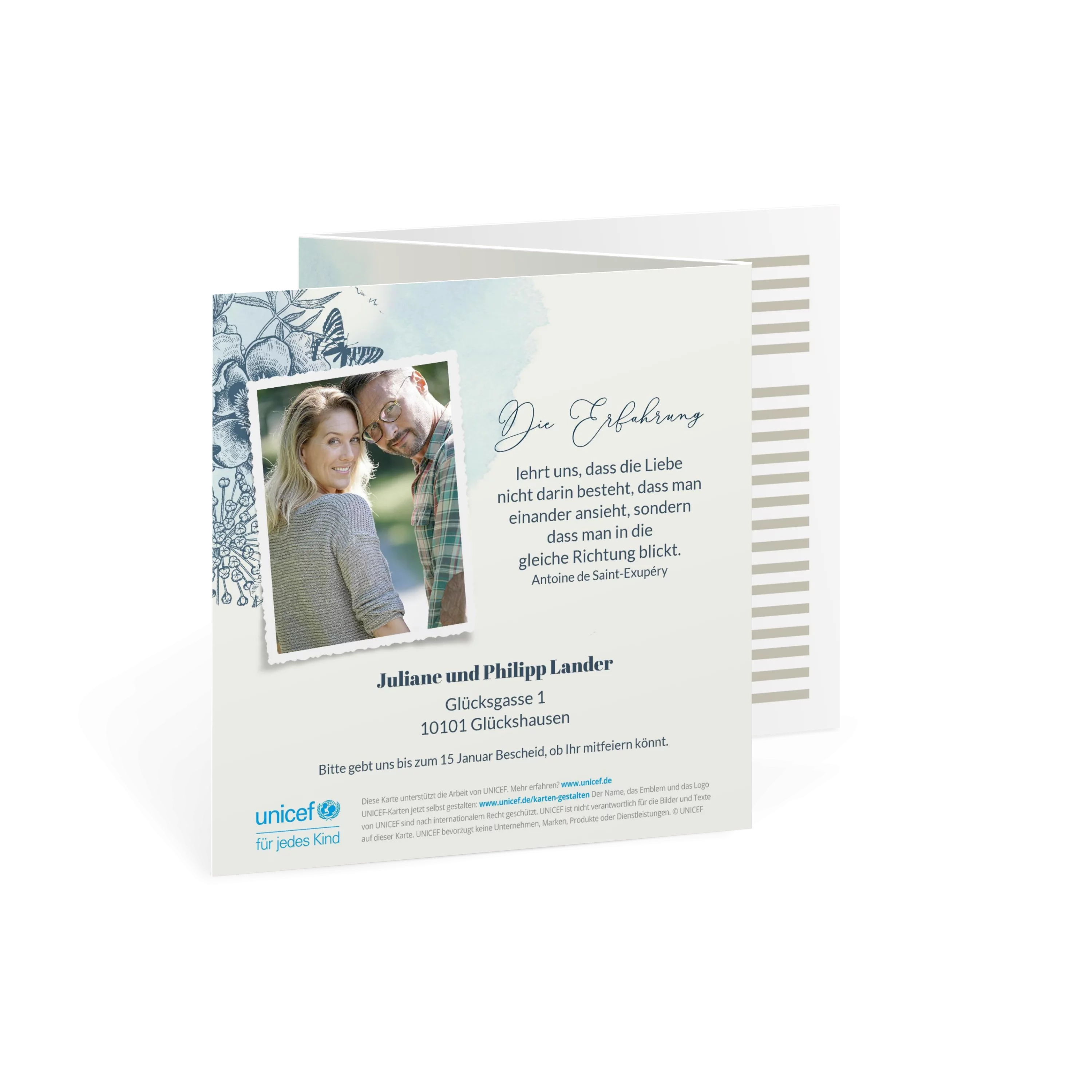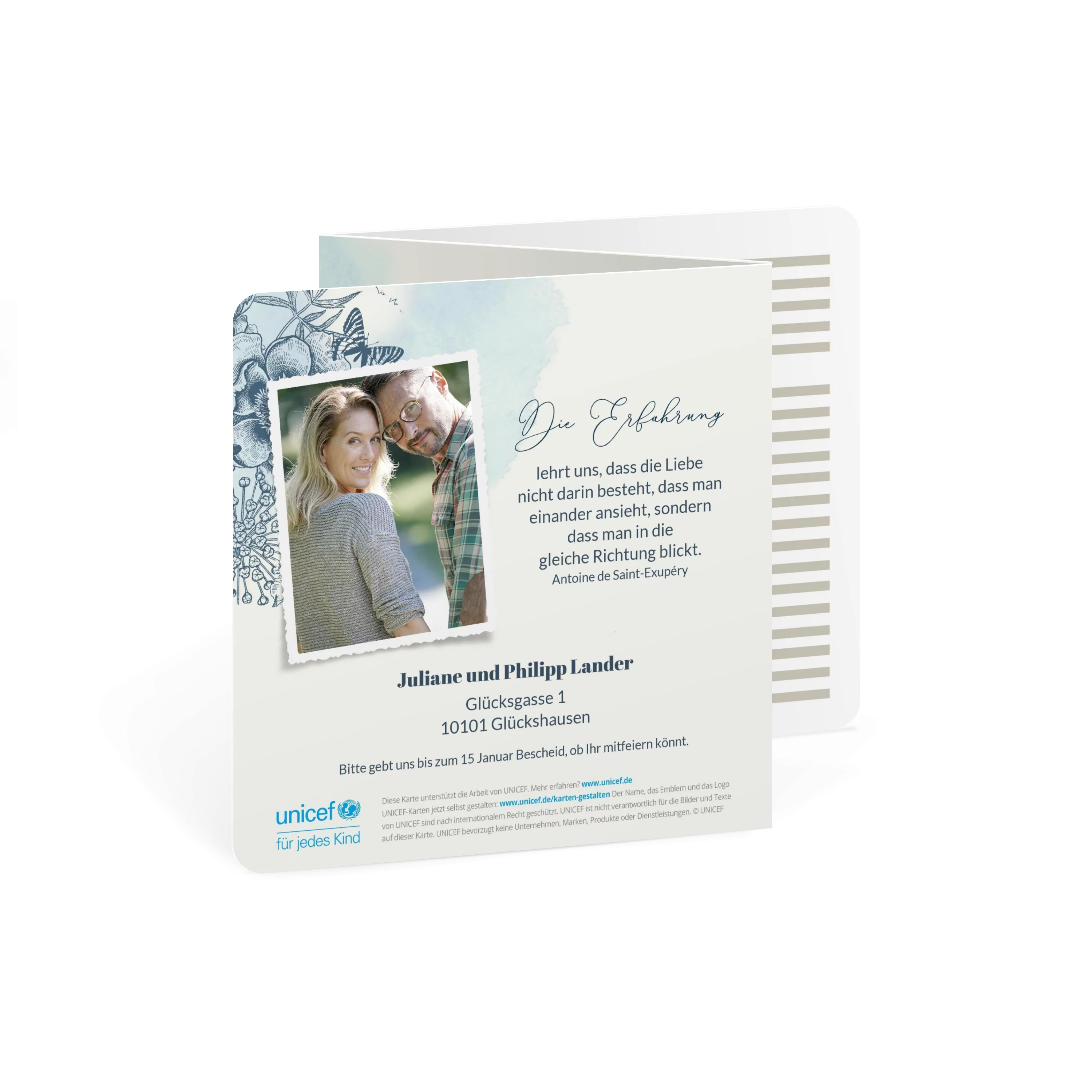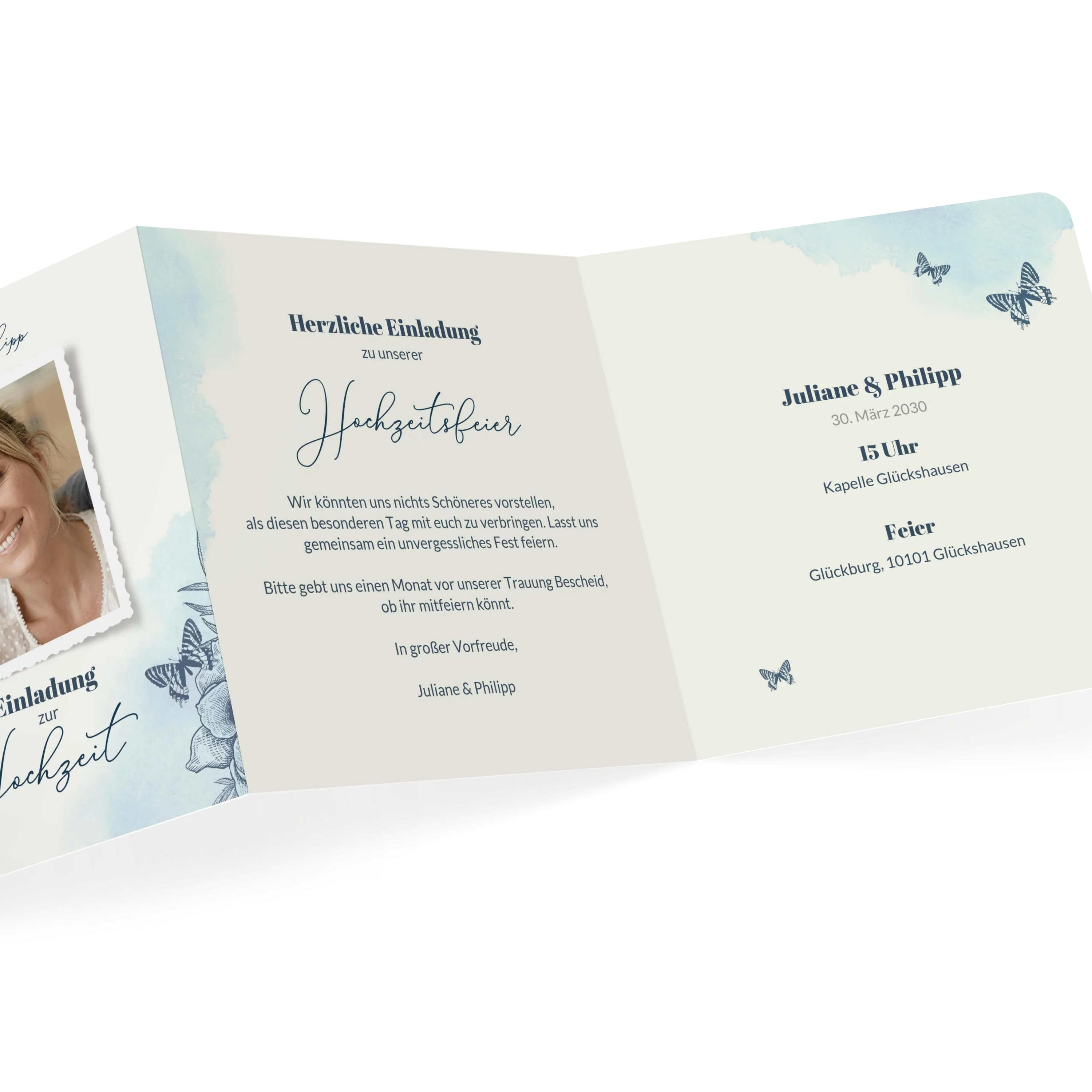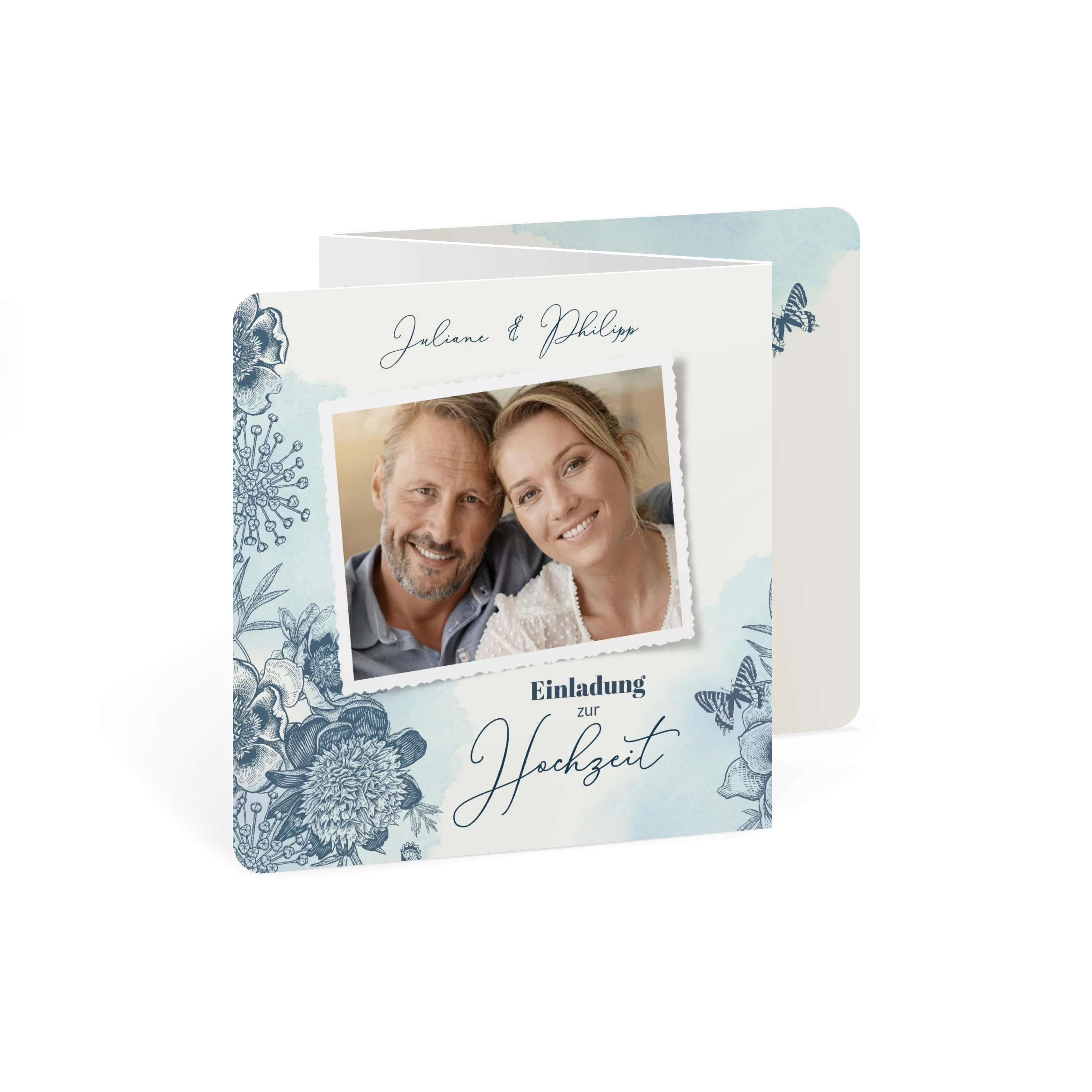 Die Einladungskarte kombiniert florale Illustrationen mit leicht blauen Aquarelltönen und schafft so eine sanfte, romantische Stimmung. Ihr eigenes Foto steht im Mittelpunkt und macht die Karte ganz persönlich. Ein liebevoller Auftakt für Ihren Hochzeitstag – leicht, floral und voller Gefühl.