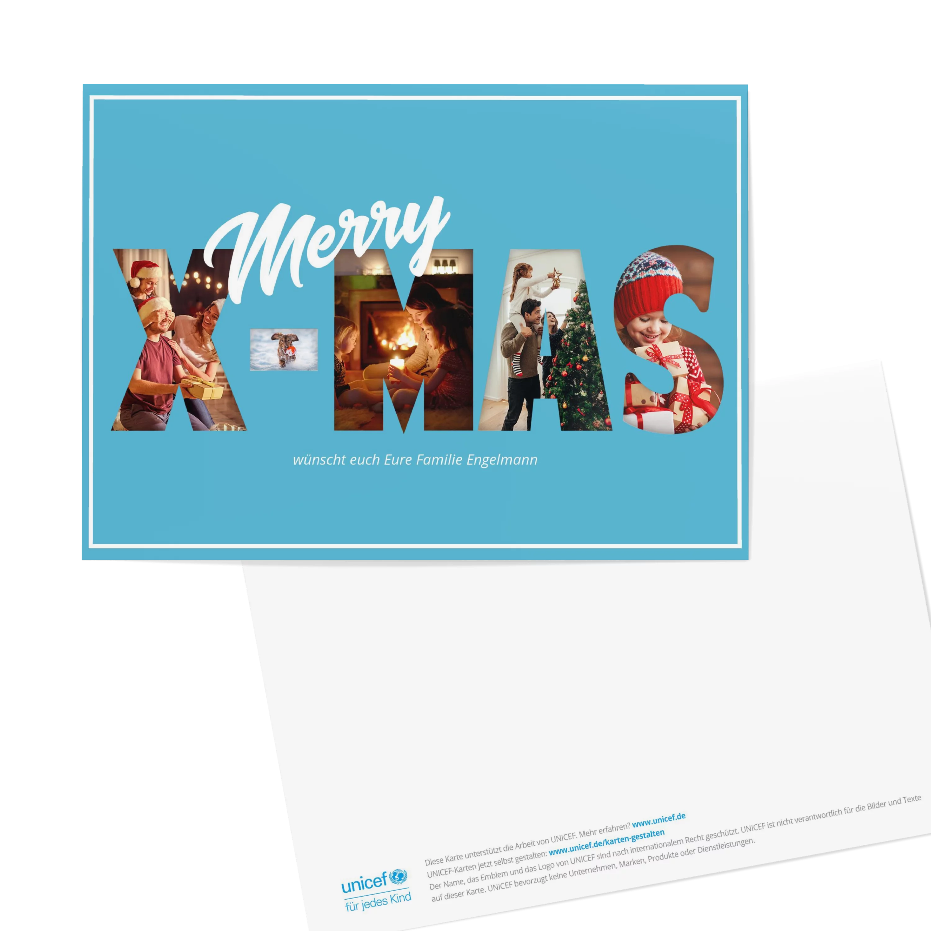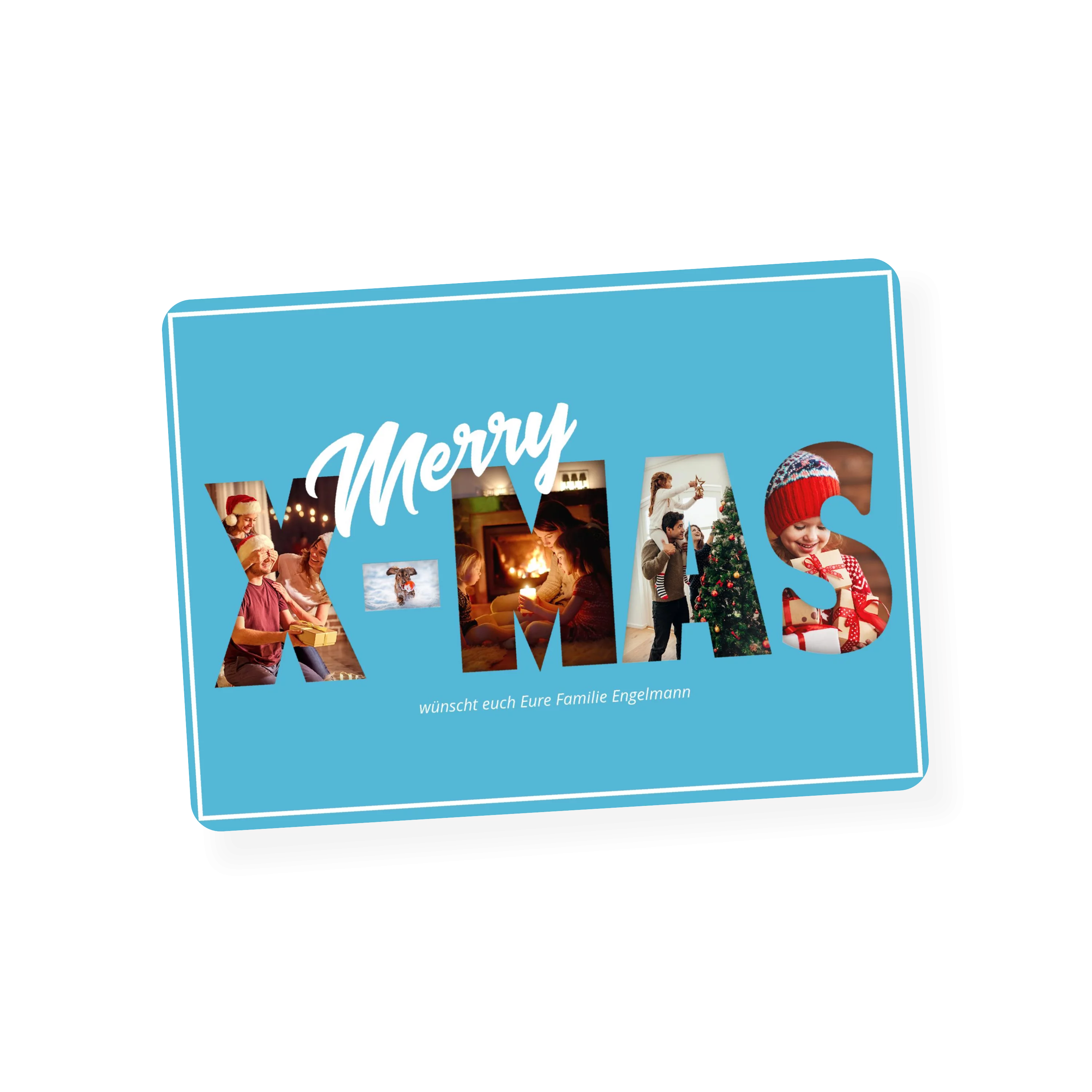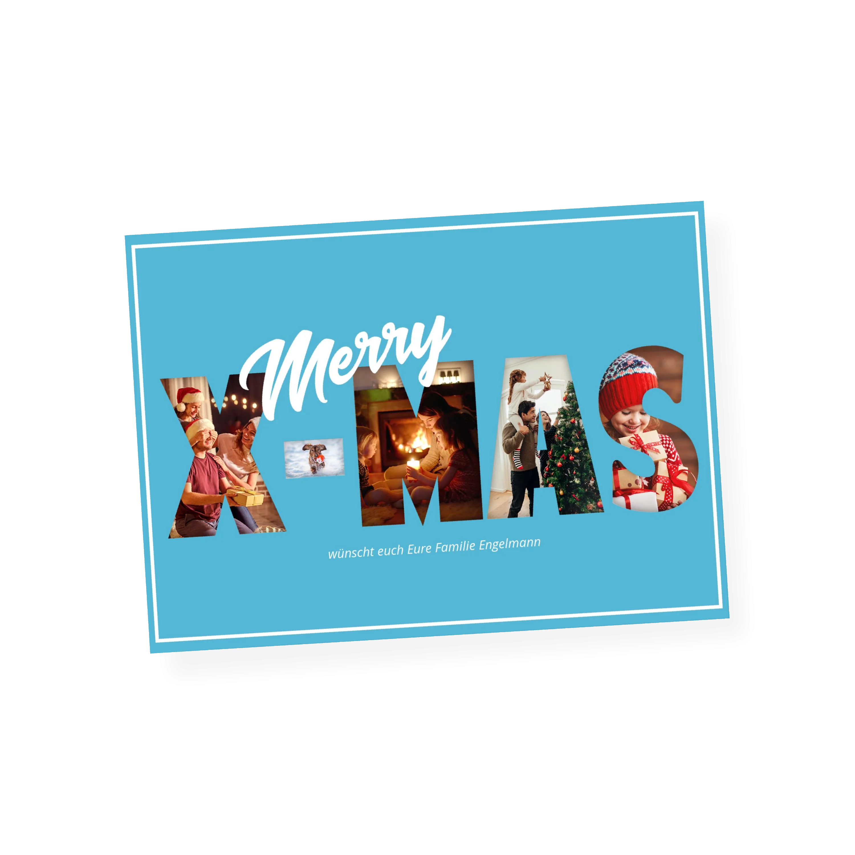 Plakatives Motiv mit großen Foto-Buchstaben und weißer Vintage-Schrift vor knalligem Blau. Gestalten Sie Ihr X-MAS ganz individuell mit den Fotos Ihrer Wahl und verschicken Sie Freude im Advent!