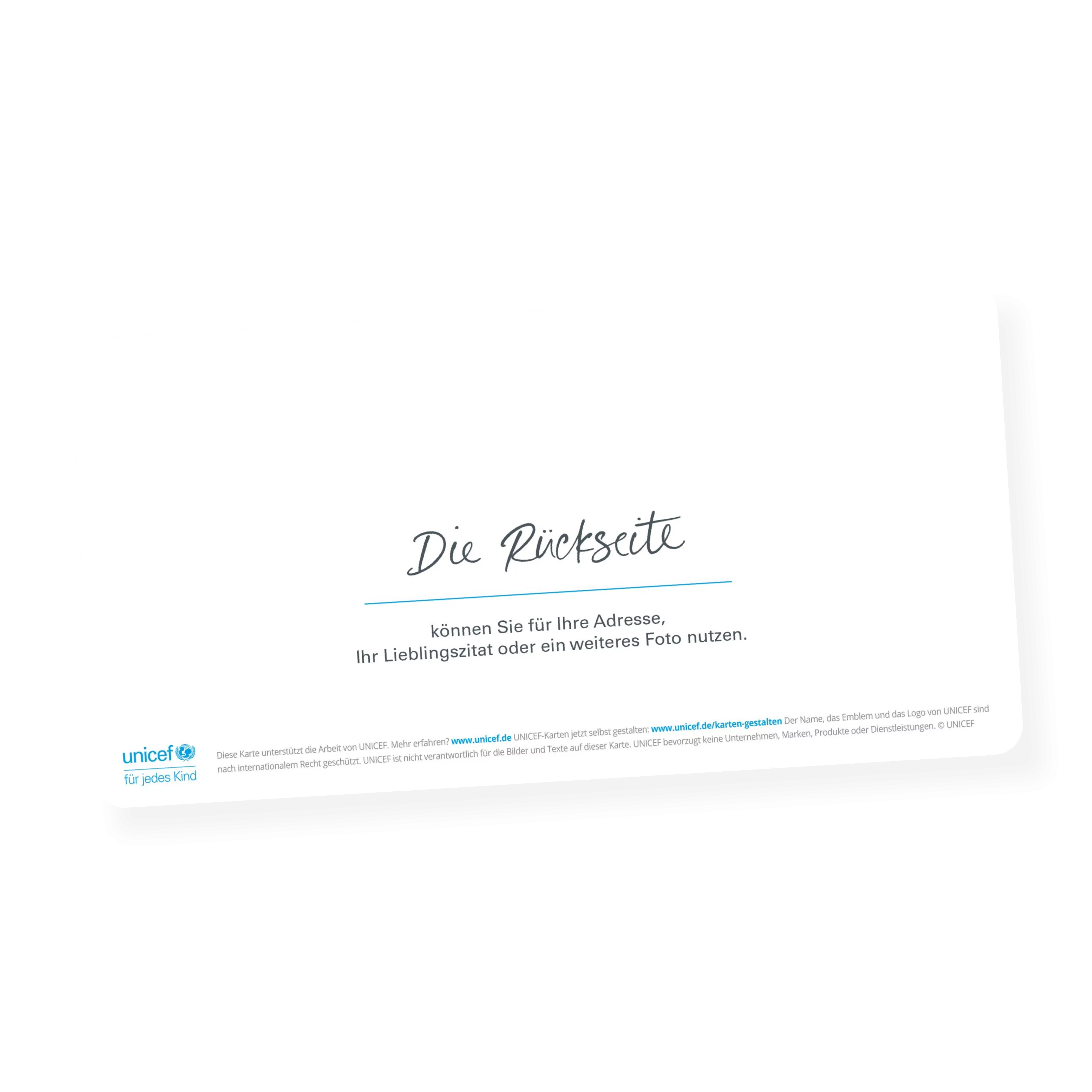 Alle UNICEF-Karten werden unter Einhaltung strenger internationaler Richtlinien hinsichtlich Qualität, Sicherheit, sozialer Verantwortung und Umweltschutz hergestellt. Denn UNICEF ist den Kindern und ihren Familien verpflichtet.