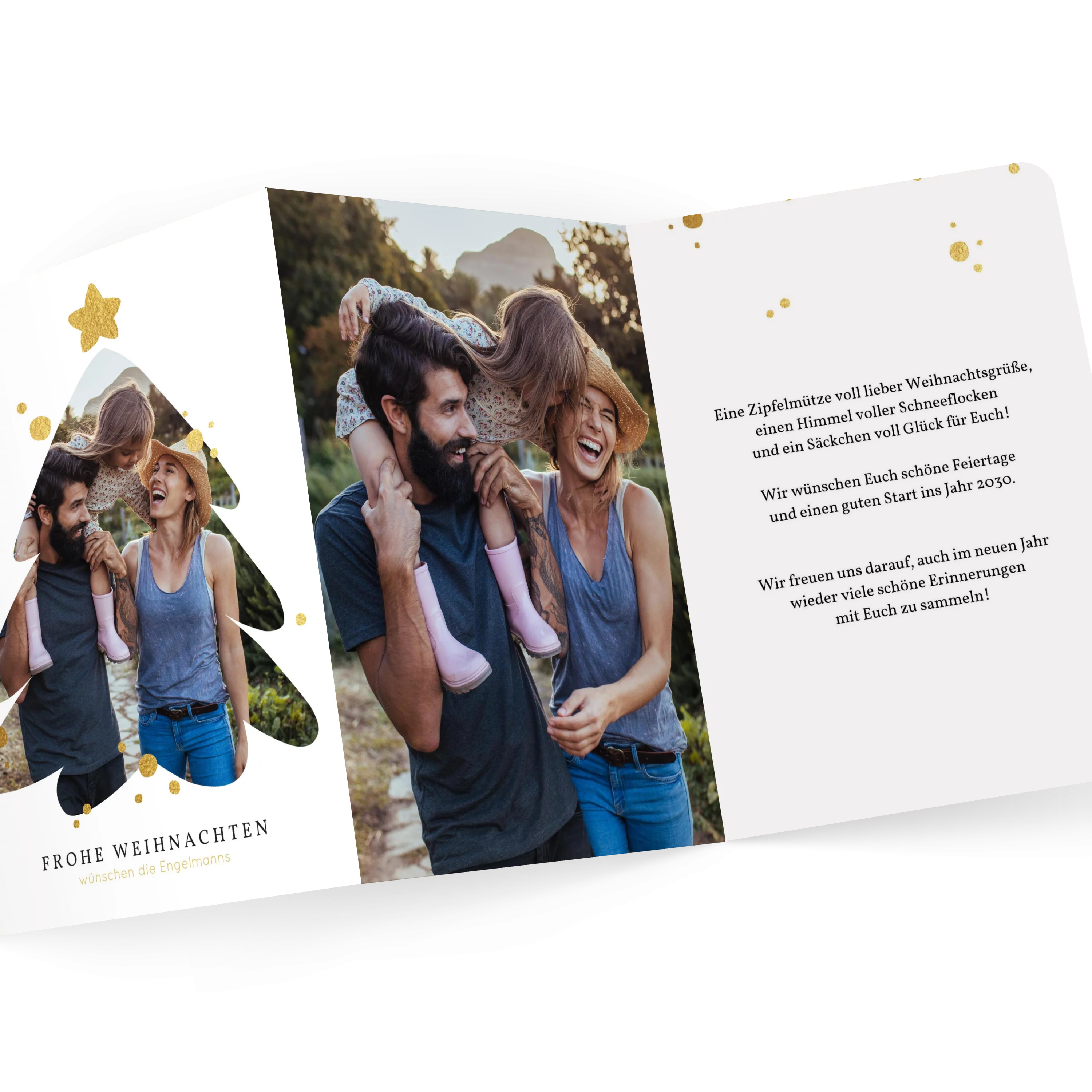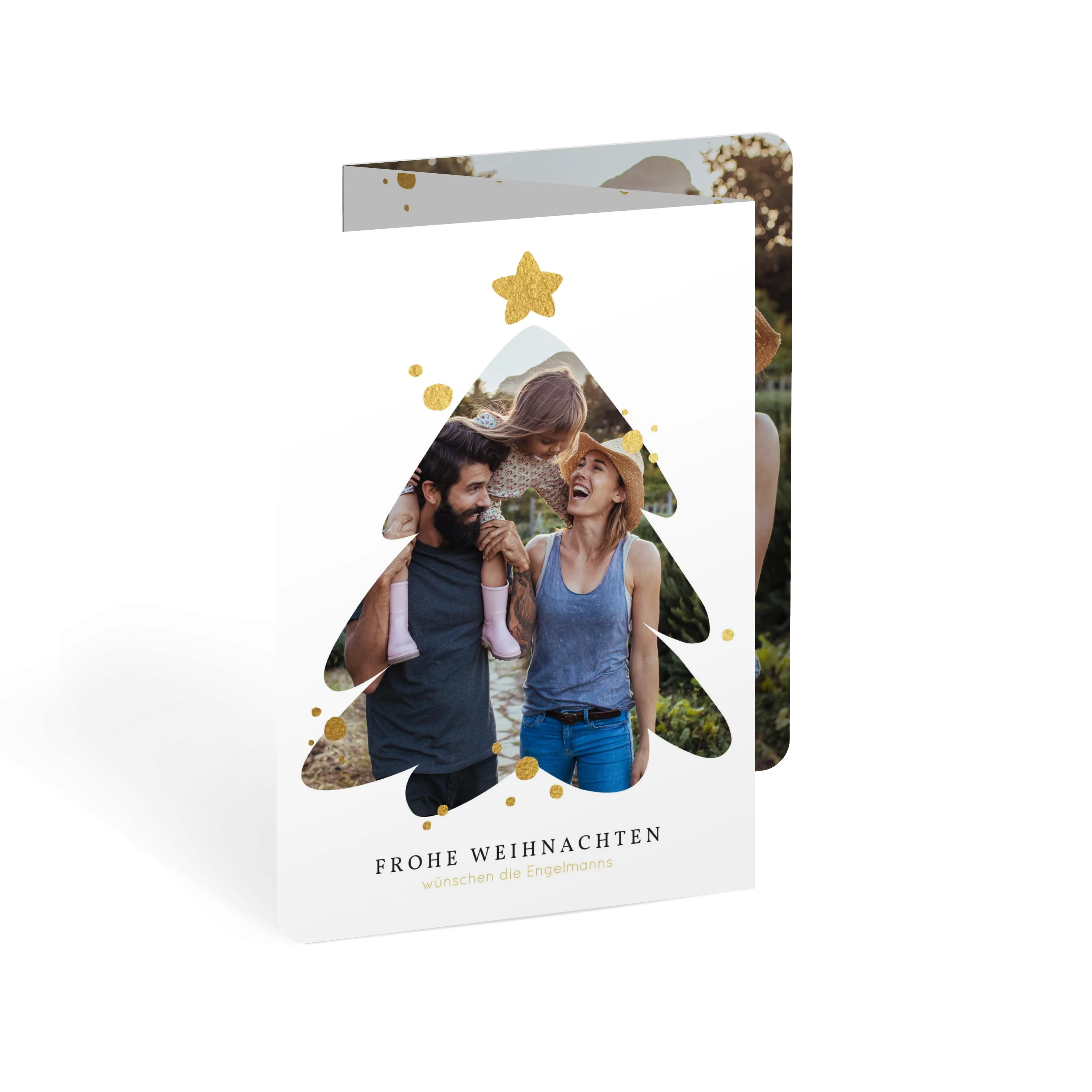 Weihnachtskarten gestalten mit dem Motiv „Fototanne“: Das Foto Ihrer Wahl wird in Tannenform gezeigt, abgerundet mit goldenen Akzenten und stilvolle Blockbuchstaben. Klappkarte 11,8 cm x 16,6 cm, auch erhältlich als flache Karte oder Doppelklappkarte. Gestalten Sie Ihre Karten zu Weihnachten mit eigenen Fotos und persönlichem Text. Wir nutzen Papier aus nachhaltiger Forstwirtschaft und eine plastikfreie Verpackung. Mit dem Kauf von UNICEF Weihnachtskarten helfen Sie Kindern in Not.