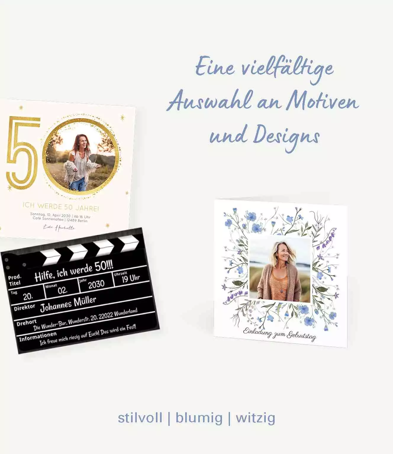Egal ob auf dem PC, Tablet oder Handy – gestalten Sie als Geburtstagskind Ihre Einladungskarten zur Feier des 50. Geburtstag ganz nach Ihren Wünschen bequem online im Handumdrehen: