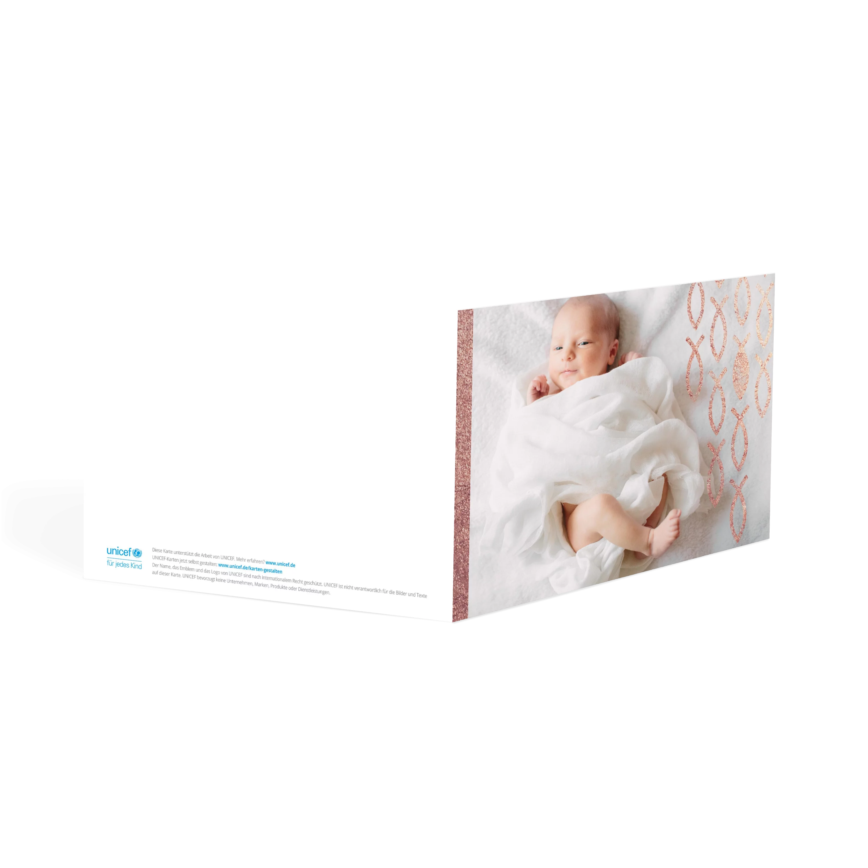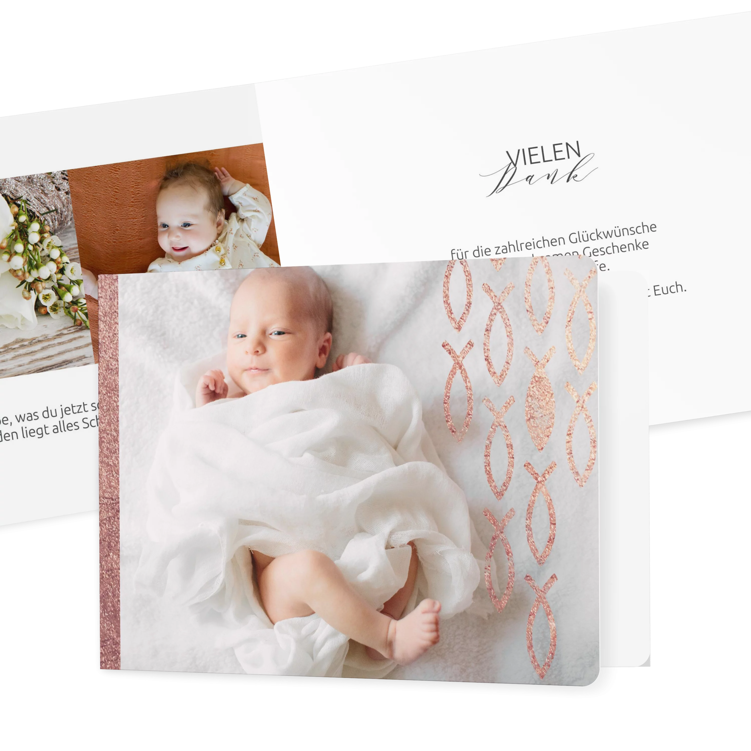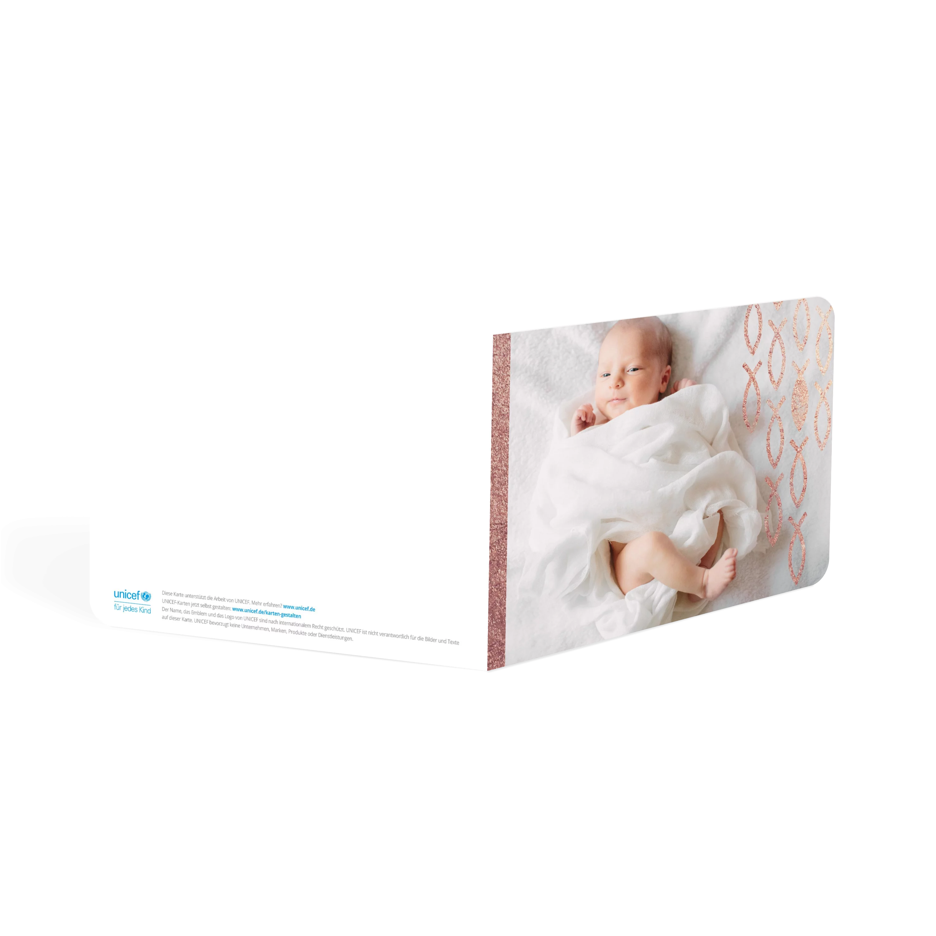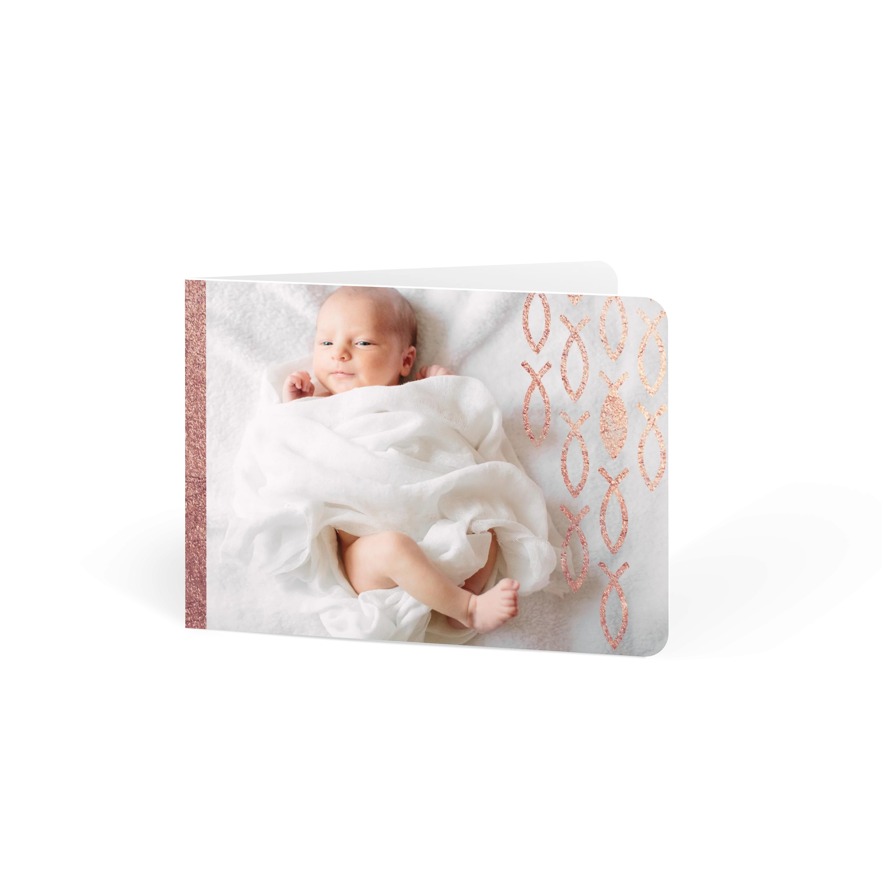 Zarte Fischsymbole schmücken diese Geburtskarte und setzen in Roségold, Silber oder Gold einen edlen Akzent. Der strukturierte Hintergrund und das großzügige Fotofeld bieten Raum für Ihr Lieblingsbild – schlicht und feierlich zugleich. Eine besondere Wahl für Familien, die Tradition und modernes Design verbinden möchten.