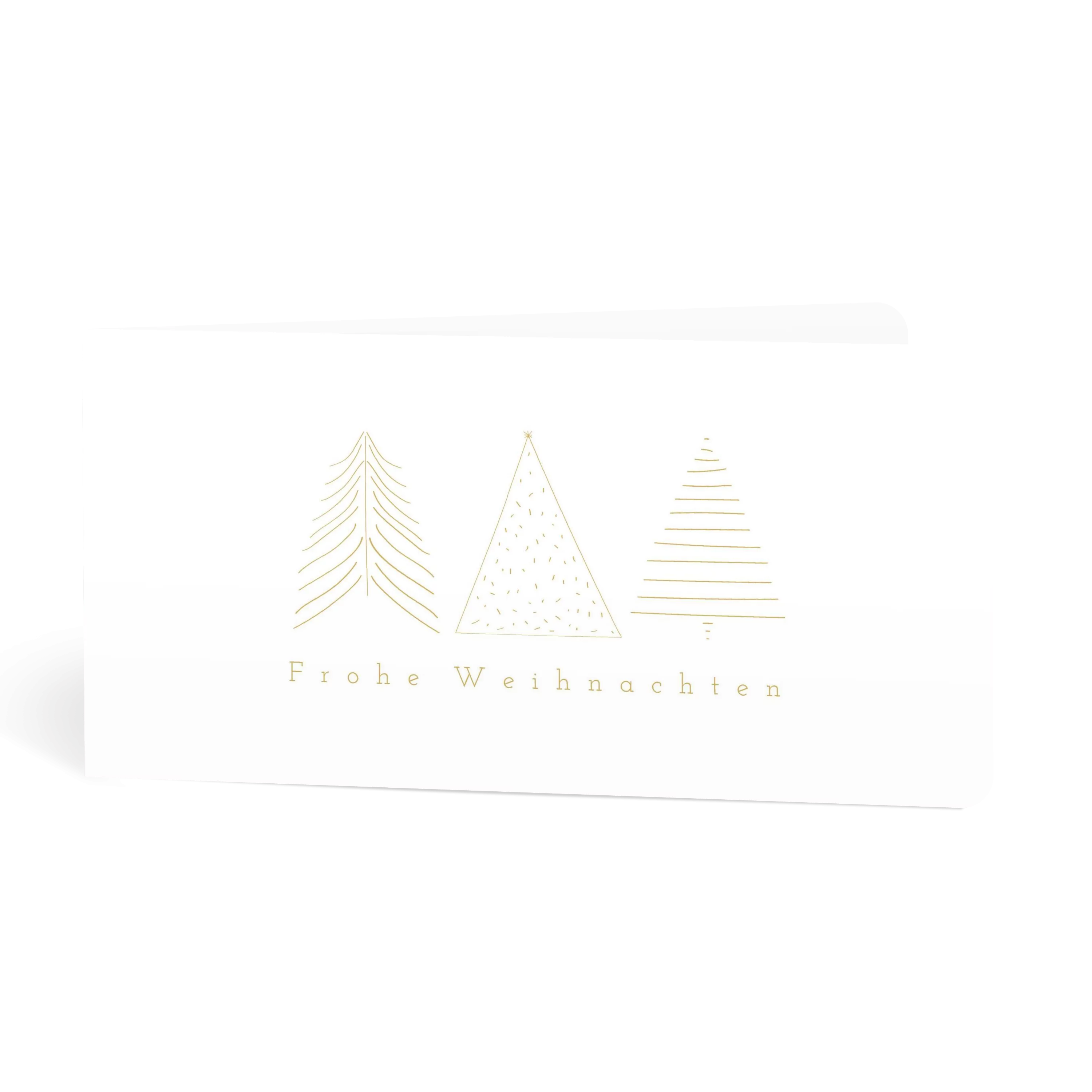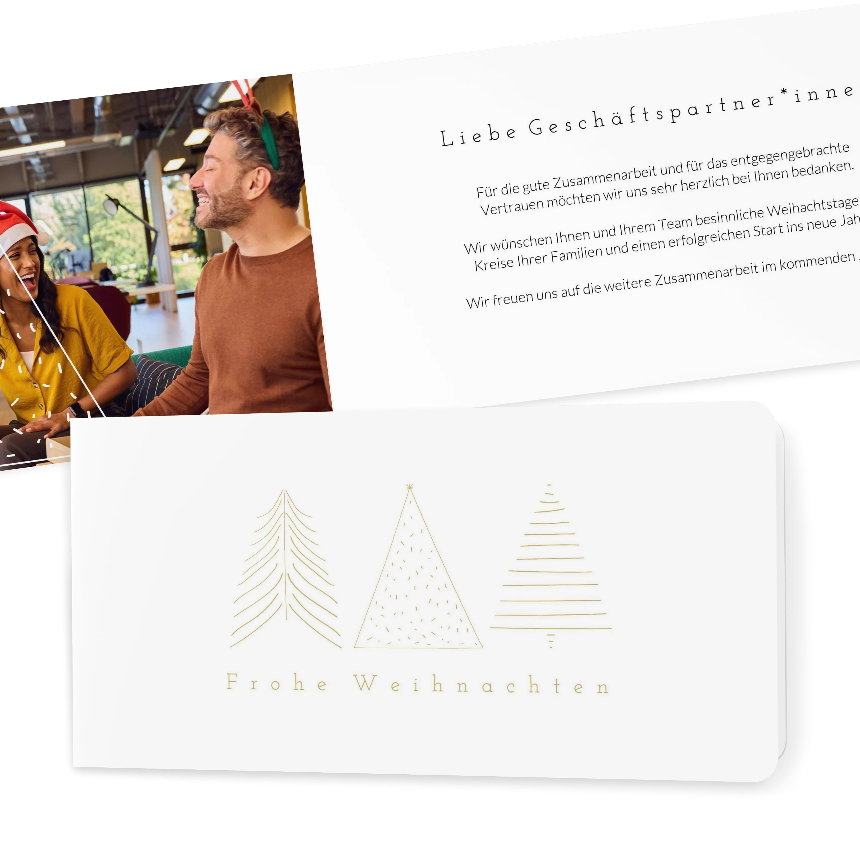 Geschäftliche Weihnachtskarten gestalten mit dem Motiv „Goldene Linien“. Drei stilvoll illustrierte Tannenbäume aus goldenen Linien, darunter ein zarter Weihnachtsgruß. Weihnachtskarten für Geschäftspartner im Format 21 x 10,5 cm, erhältlich als flache Karte oder Klappkarte. Gestalten Sie Ihre Weihnachtskarten für Geschäftspartner mit Fotos im Innenteil und persönlichem Text.