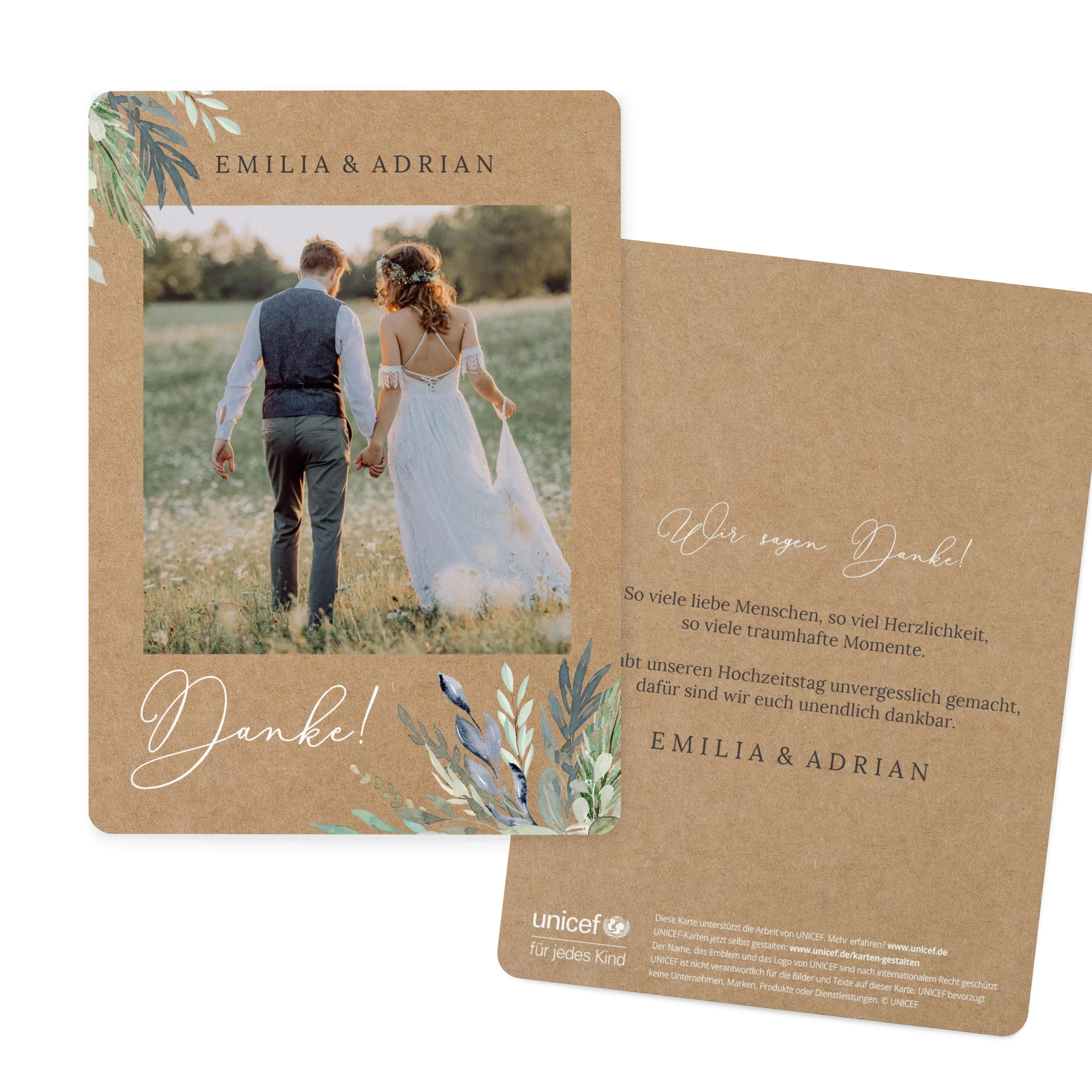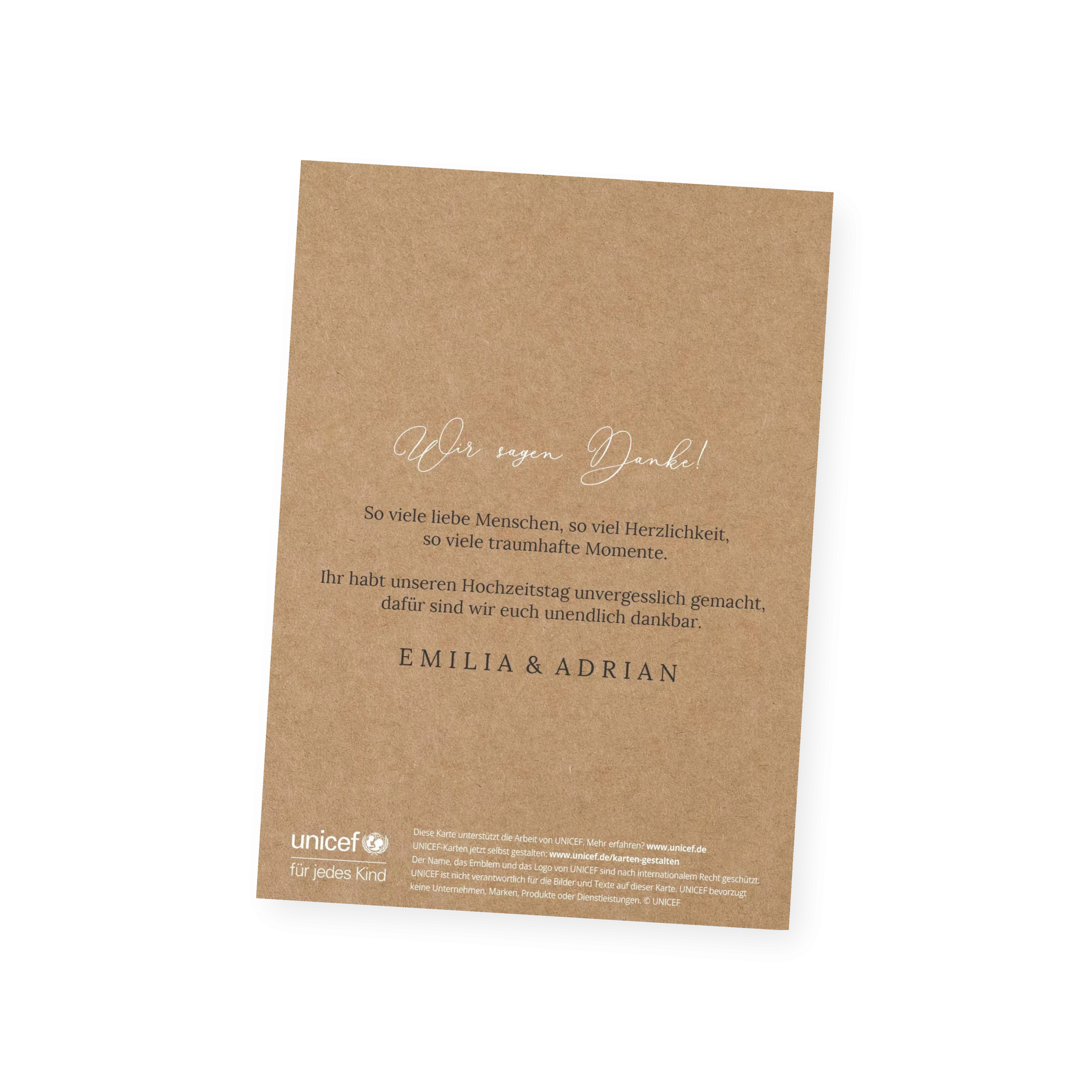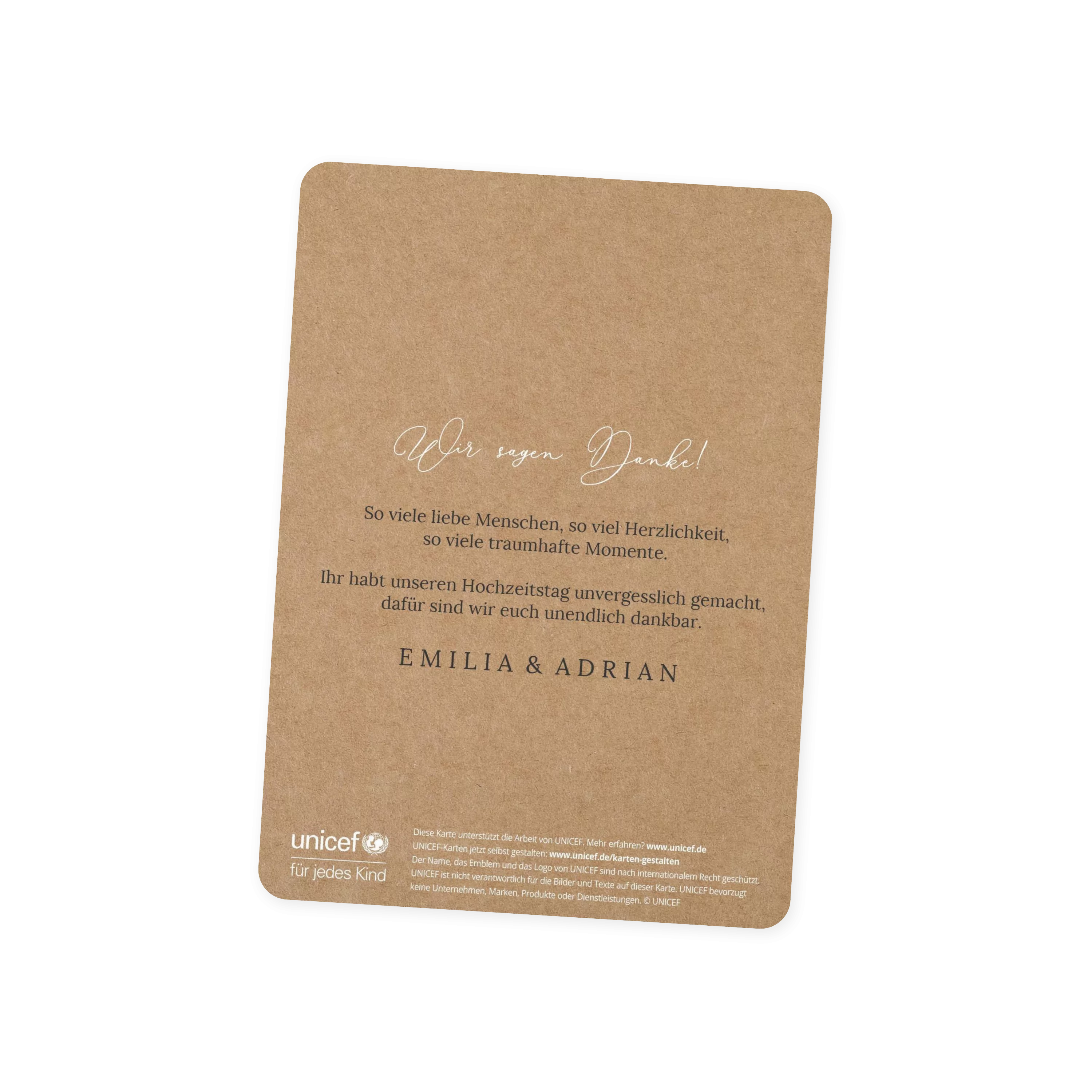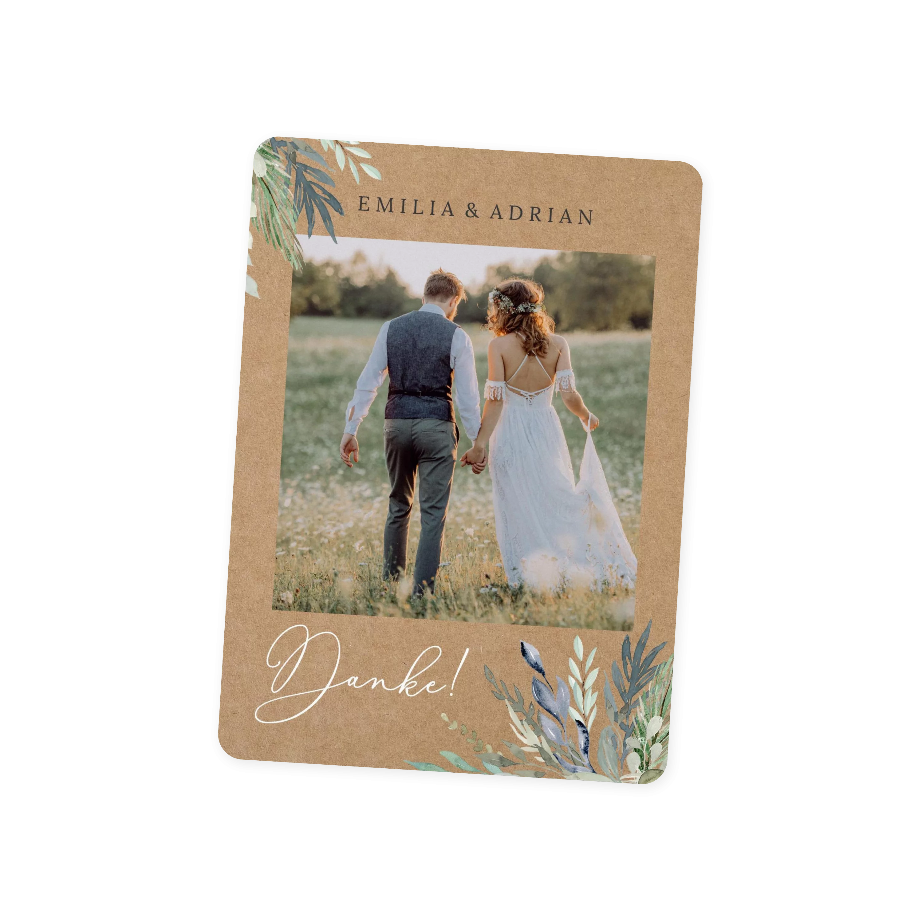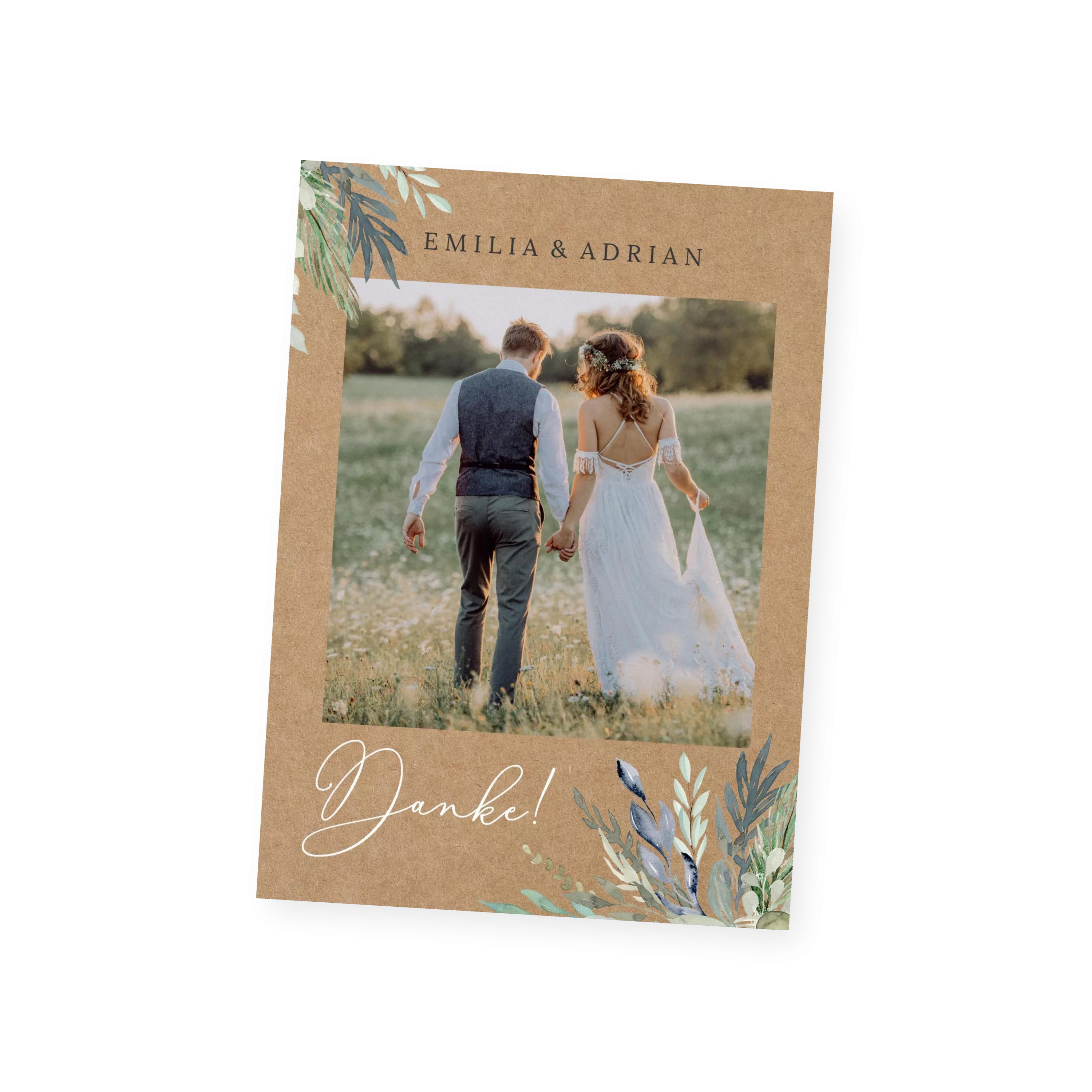 Ein persönliches Foto eingebettet in zarte Blätterranken, schlichte Serifenschrift und elegante Goldakzent bietet den passenden Rahmen für Ihre persönliche Danksagung nach der Hochzeit. Natürlich, leicht und voller Wärme – für Worte, die von Herzen kommen.