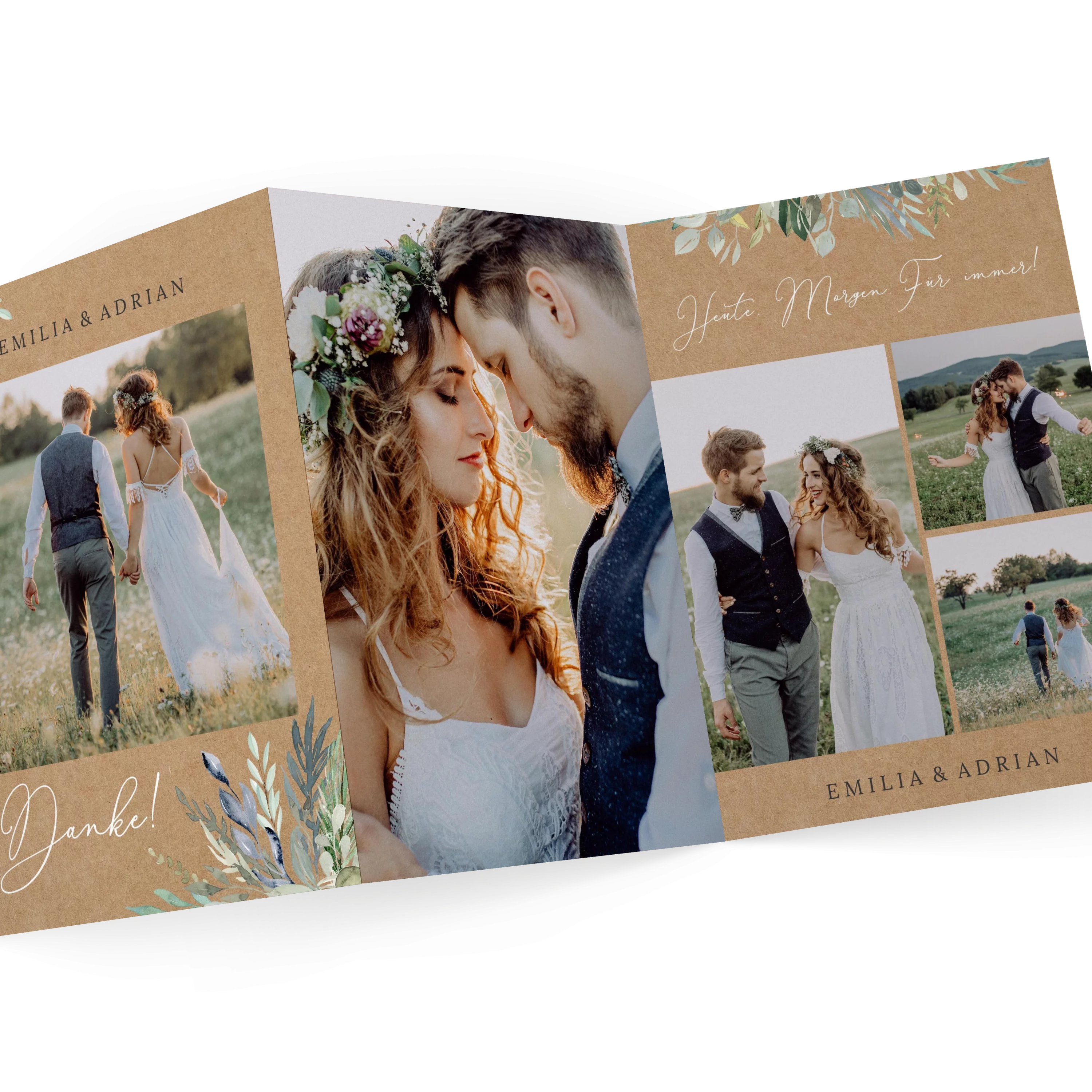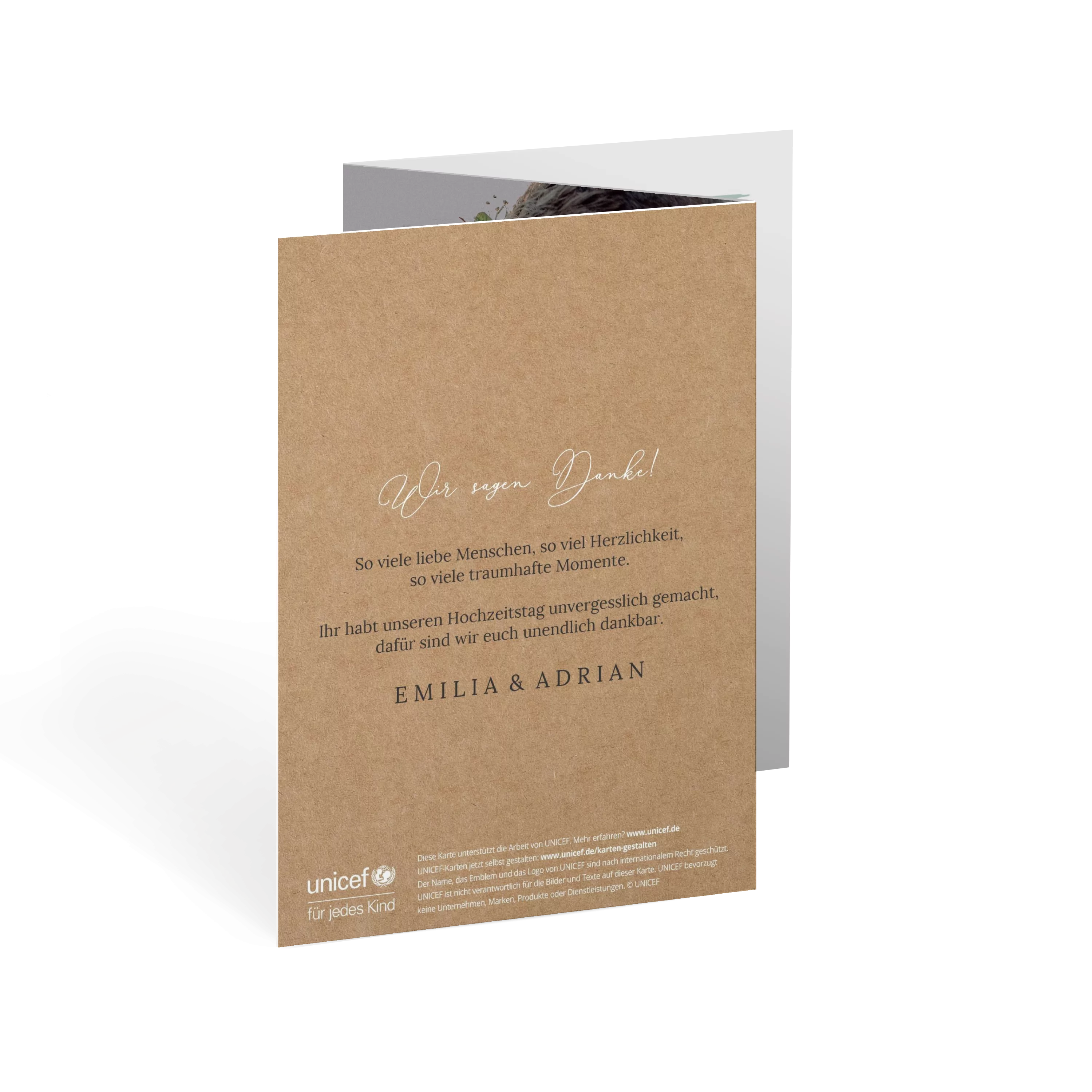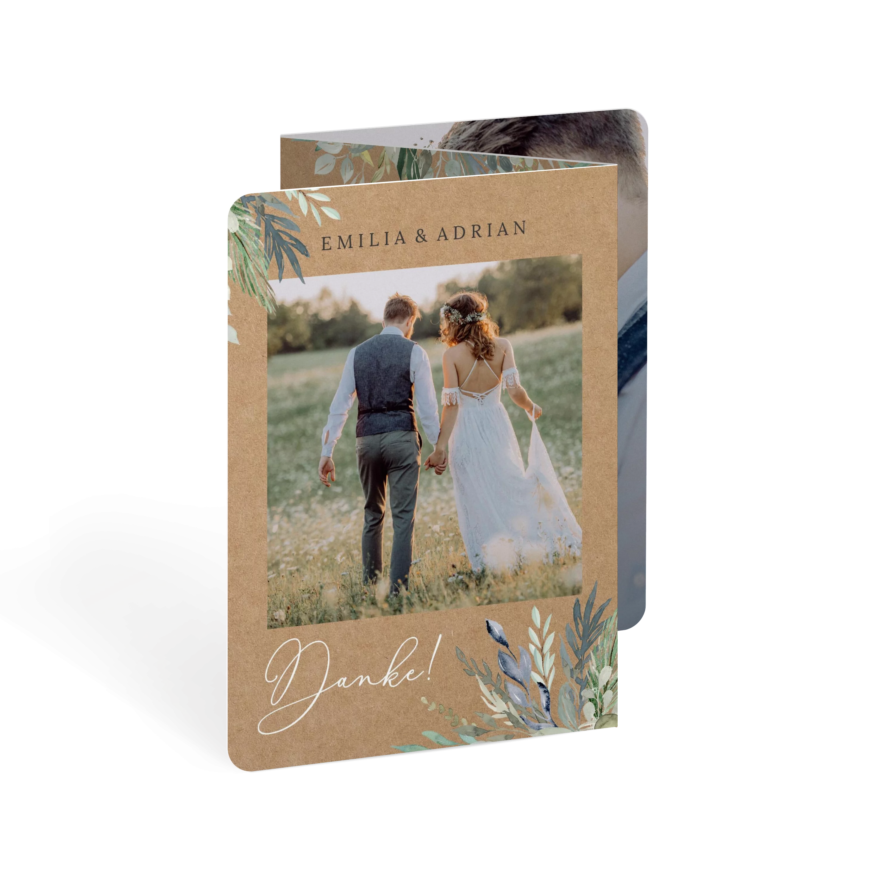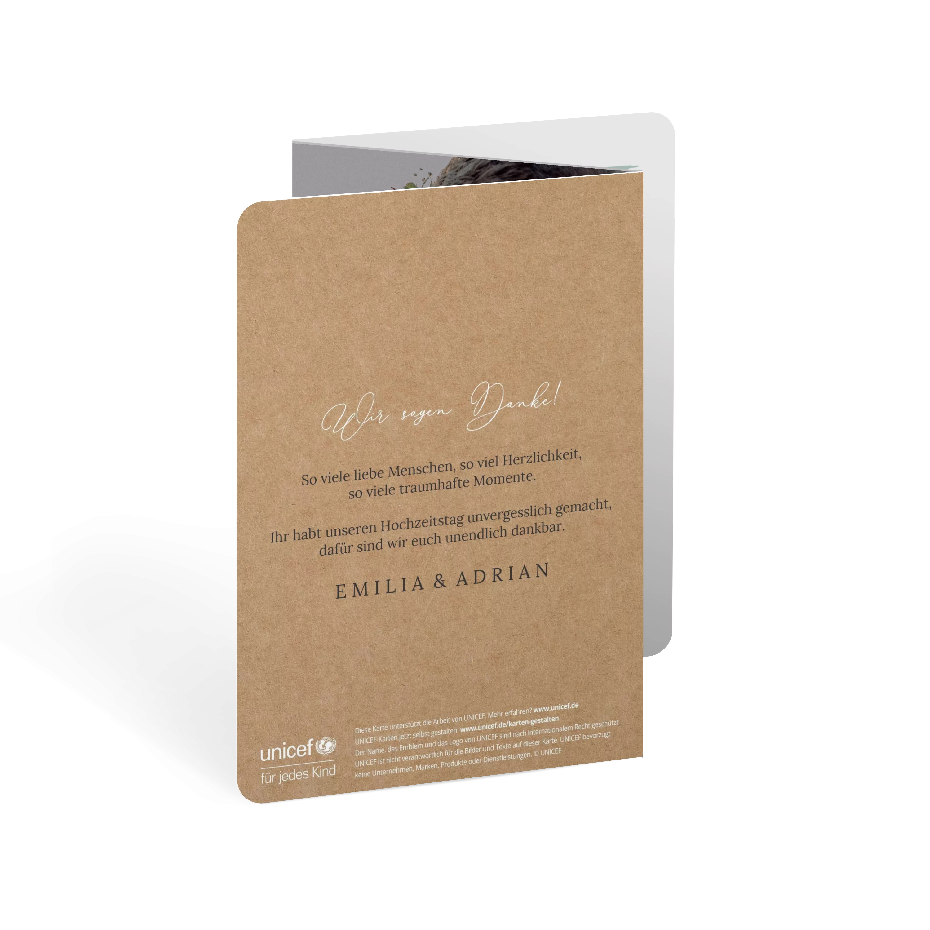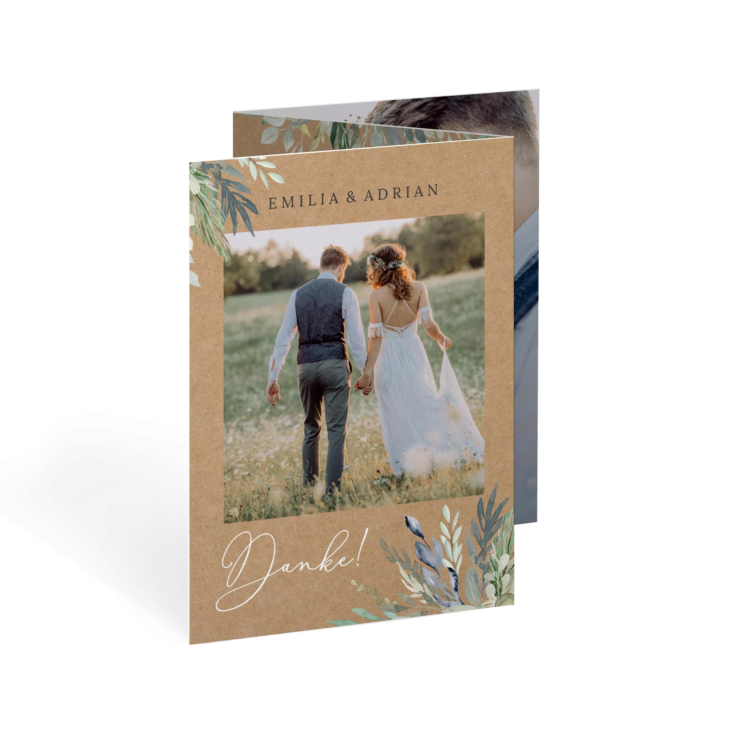 Ein persönliches Foto eingebettet in zarte Blätterranken, schlichte Serifenschrift und elegante Goldakzent bietet den passenden Rahmen für Ihre persönliche Danksagung nach der Hochzeit. Natürlich, leicht und voller Wärme – für Worte, die von Herzen kommen.