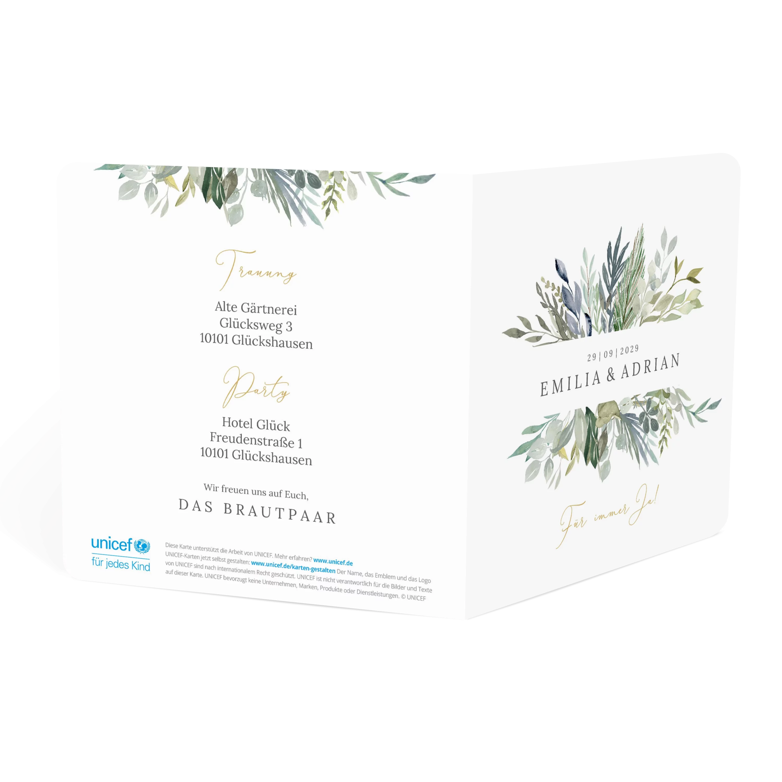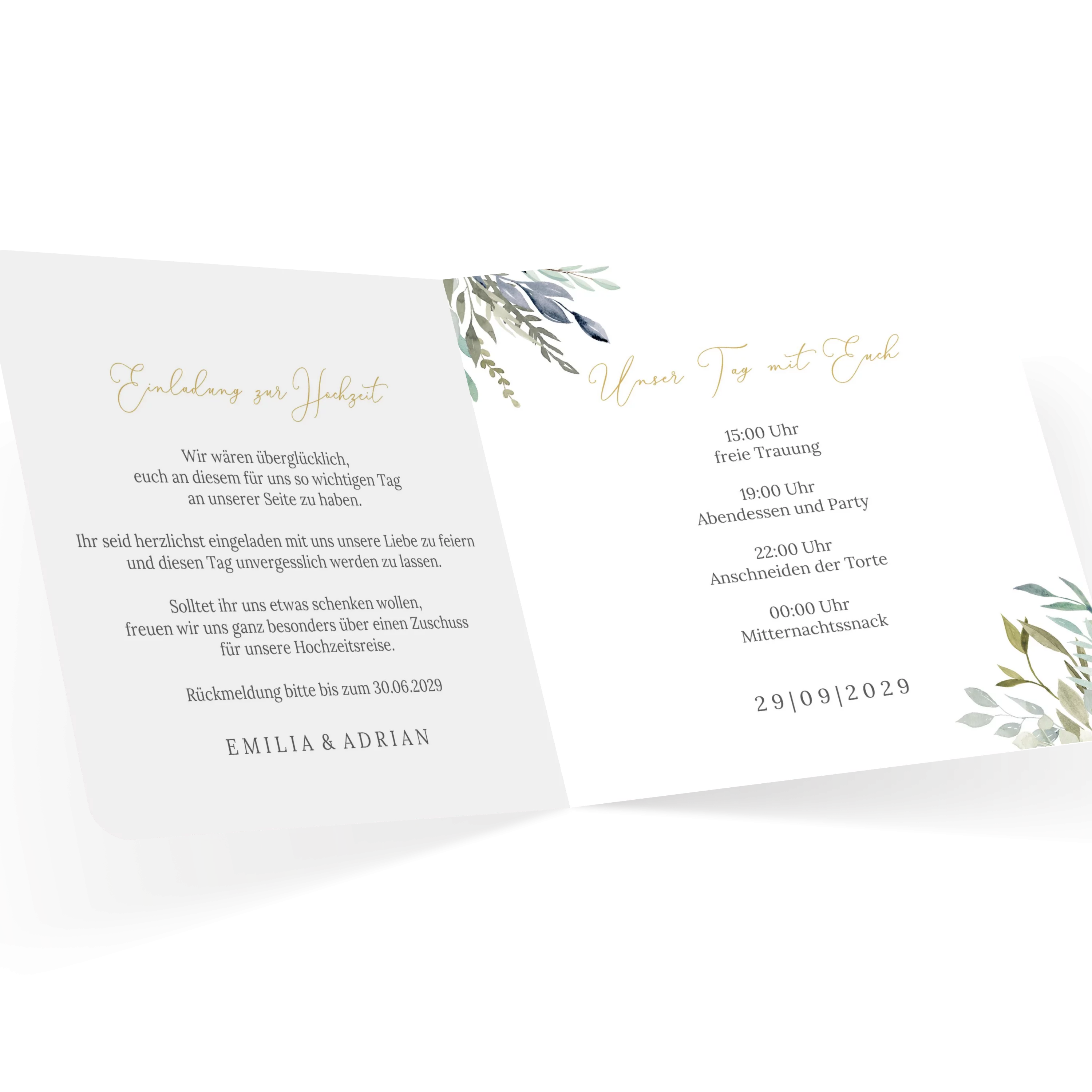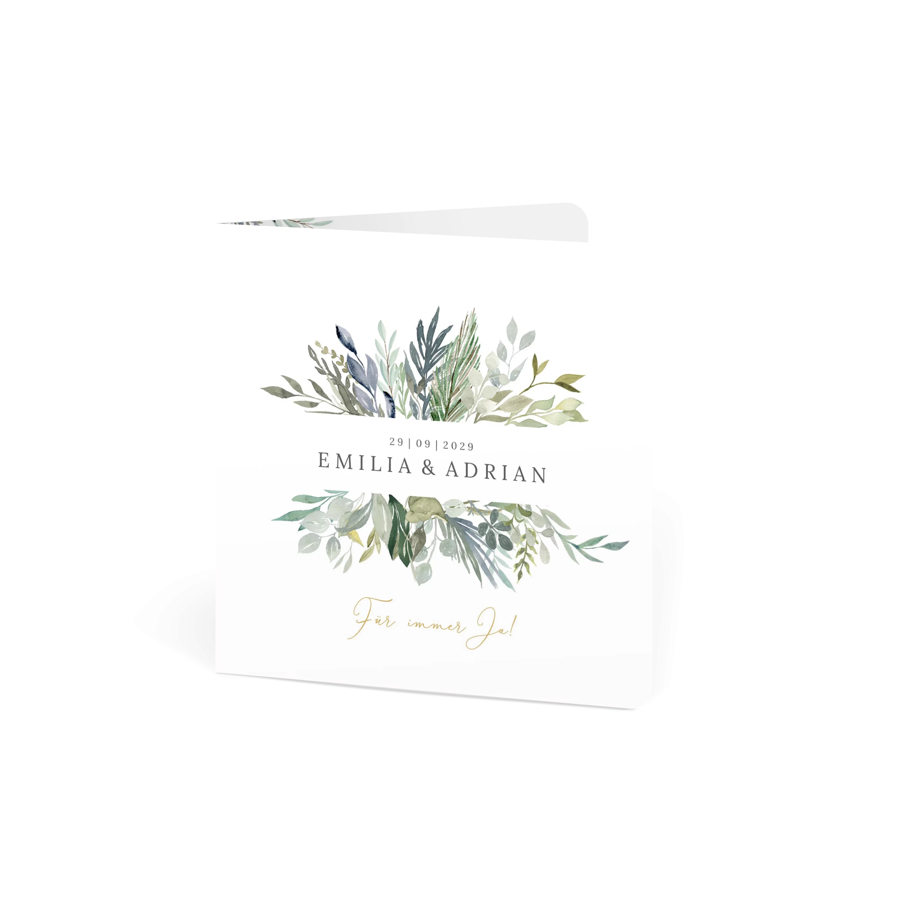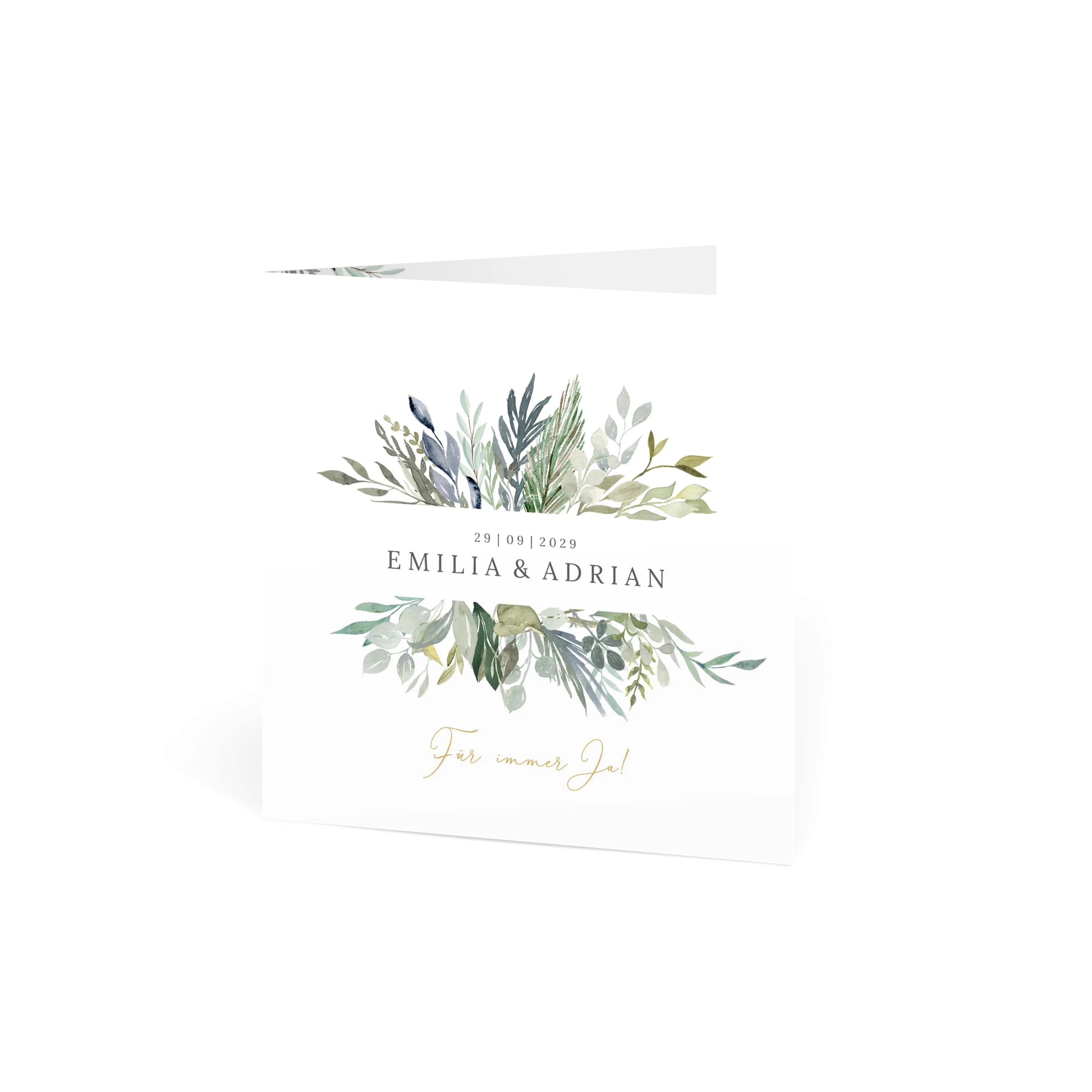 Grüne Blätter, feine Zweige und ein Hauch Eukalyptus – diese Einladungskarte bringt frische Naturtöne und Leichtigkeit in Ihre Hochzeitsankündigung. Minimalistisches Design trifft auf liebevolle Details.