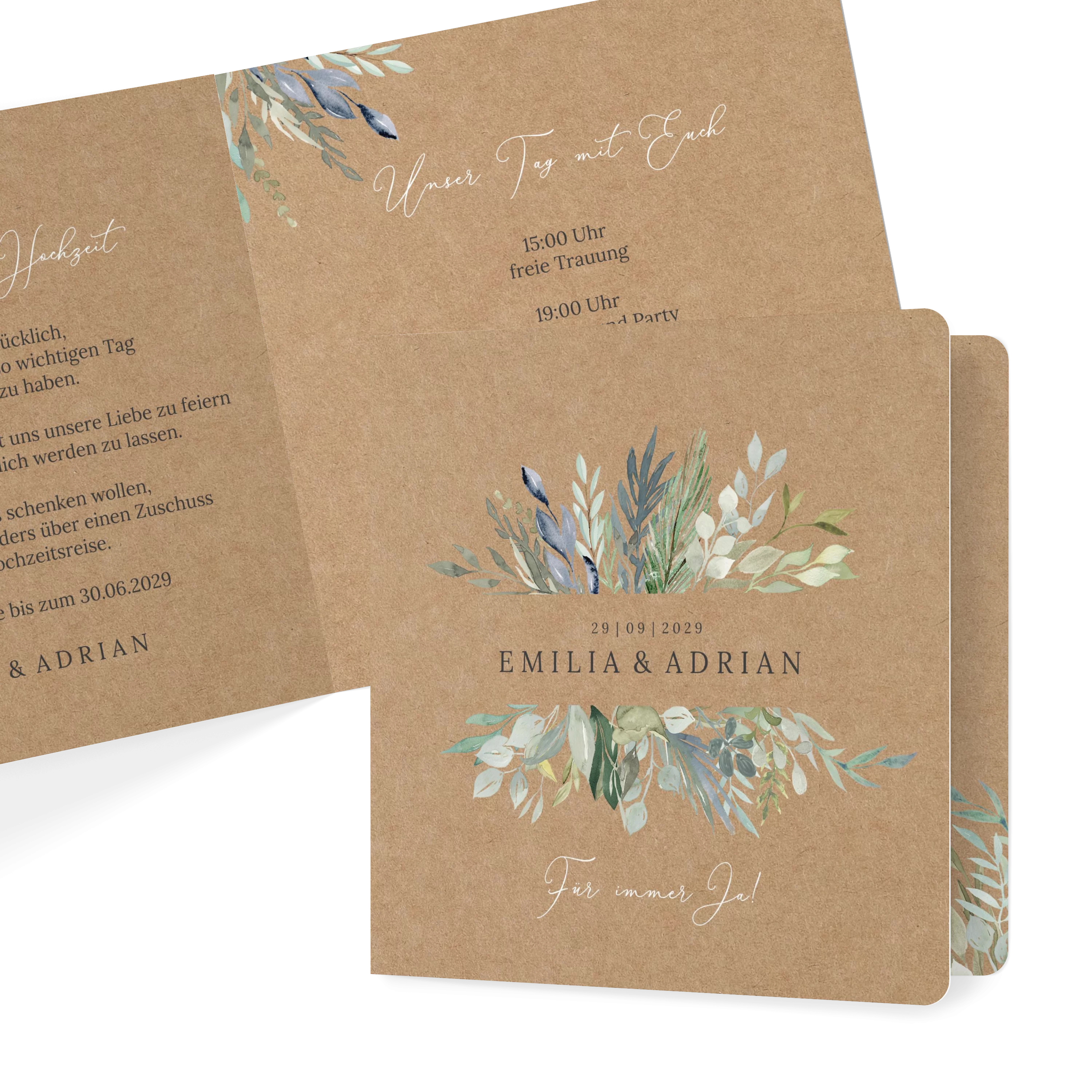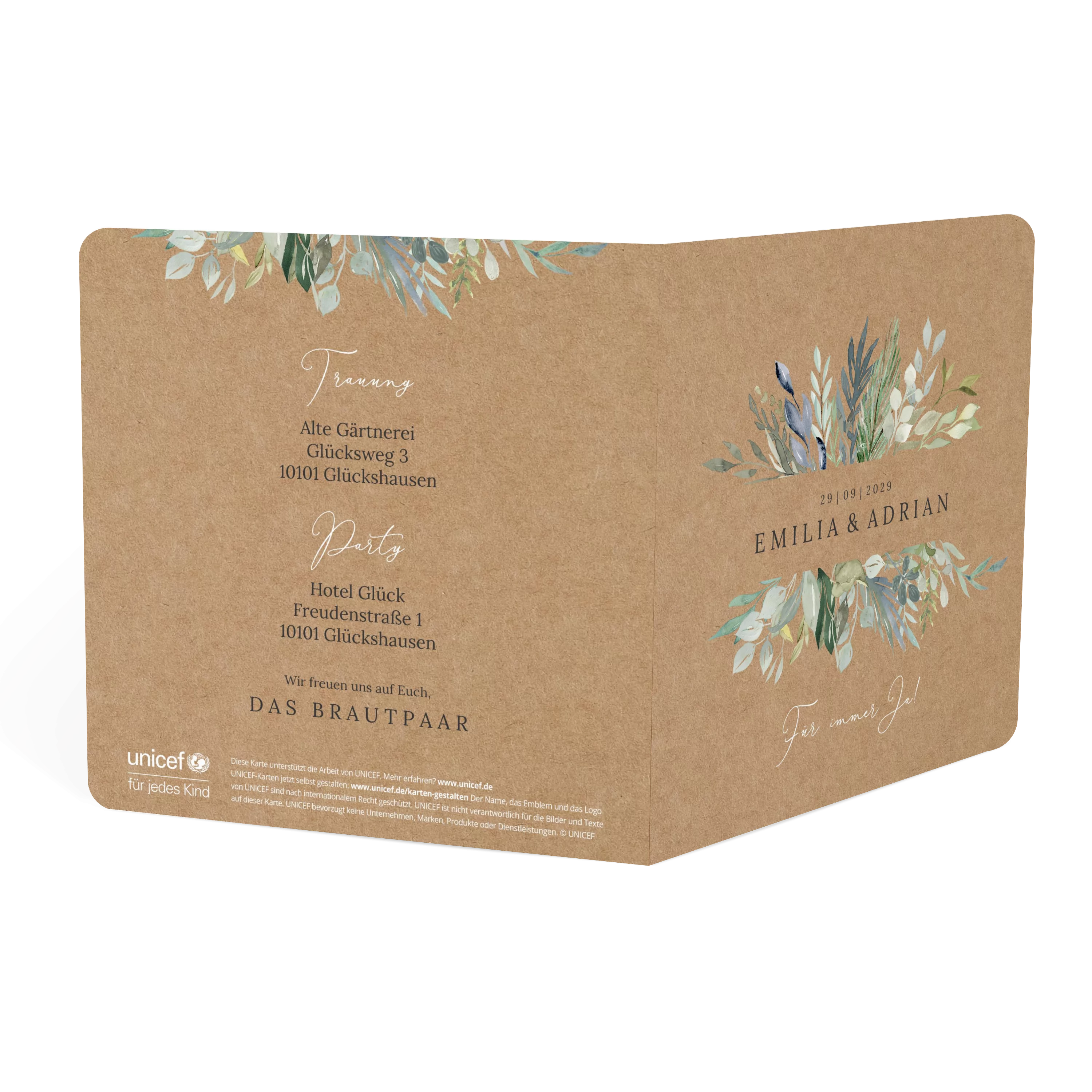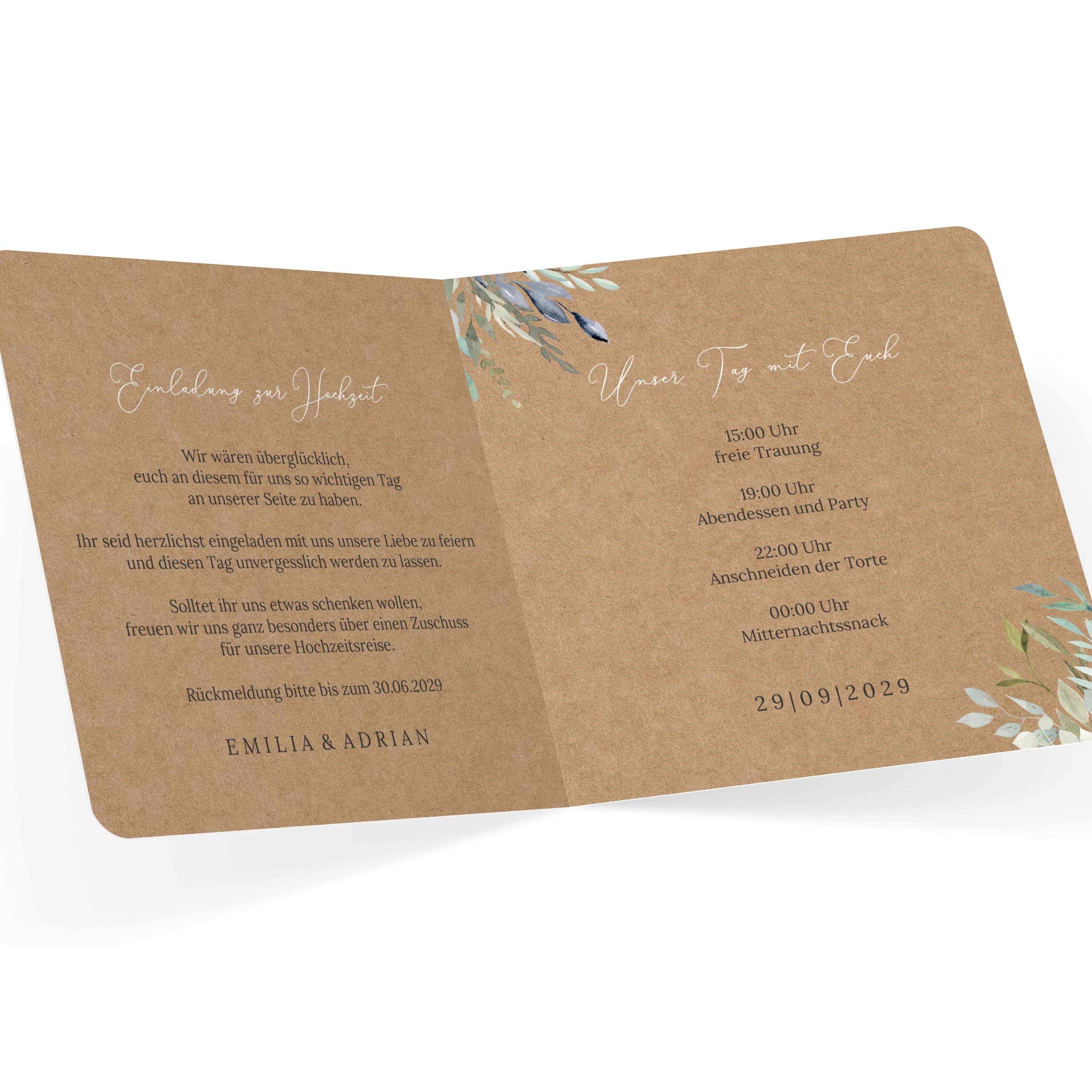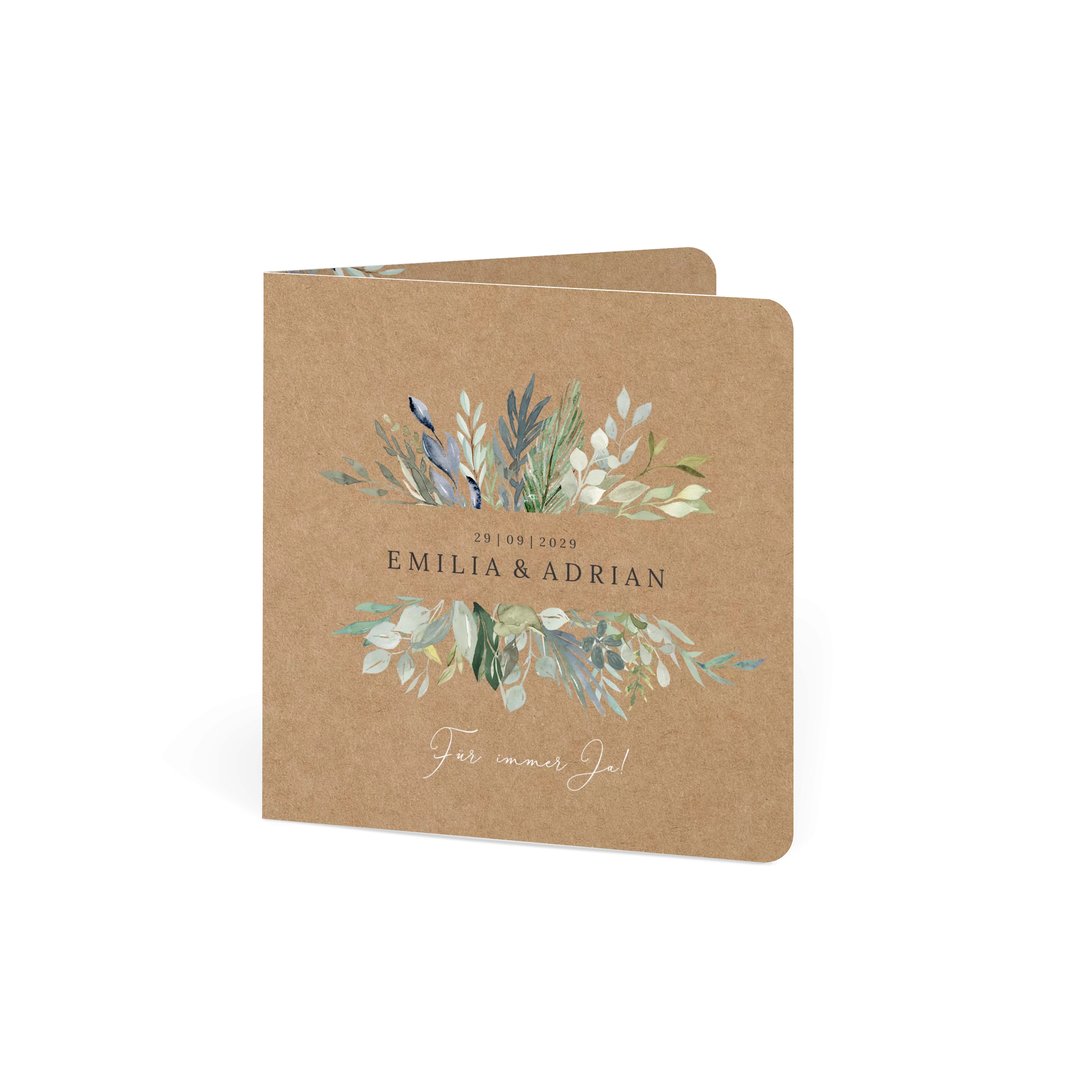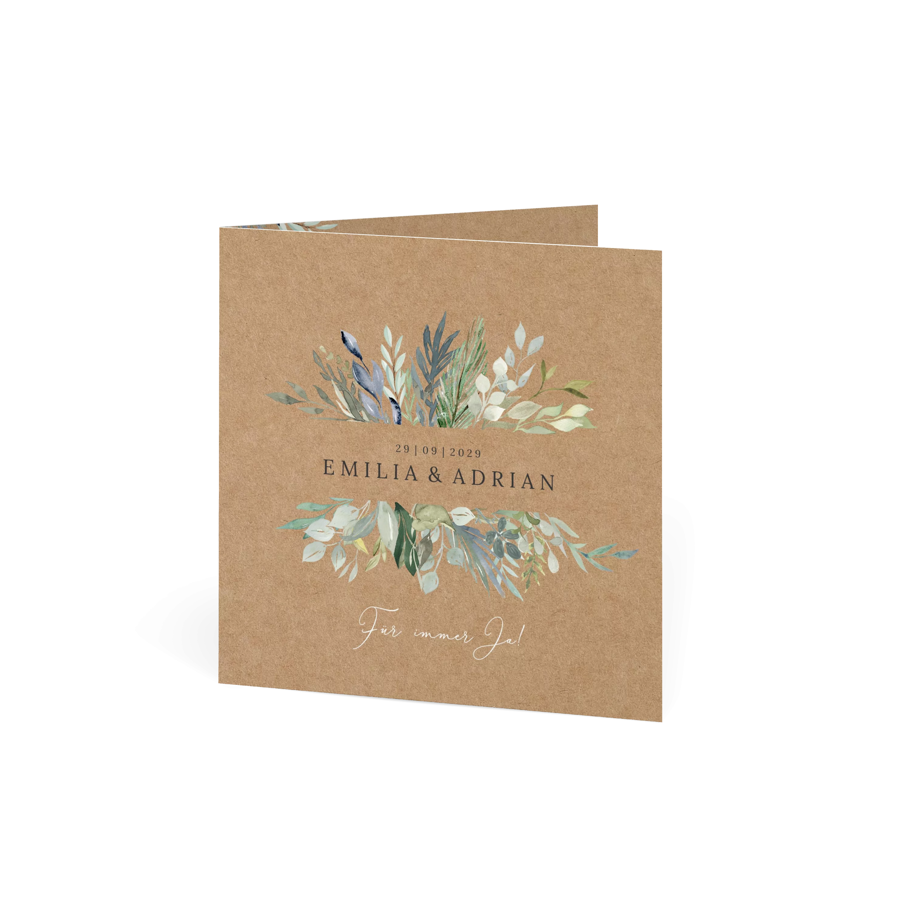 Grüne Blätter, feine Zweige und ein Hauch Eukalyptus – diese Einladungskarte bringt frische Naturtöne und Leichtigkeit in Ihre Hochzeitsankündigung. Minimalistisches Design trifft auf liebevolle Details.