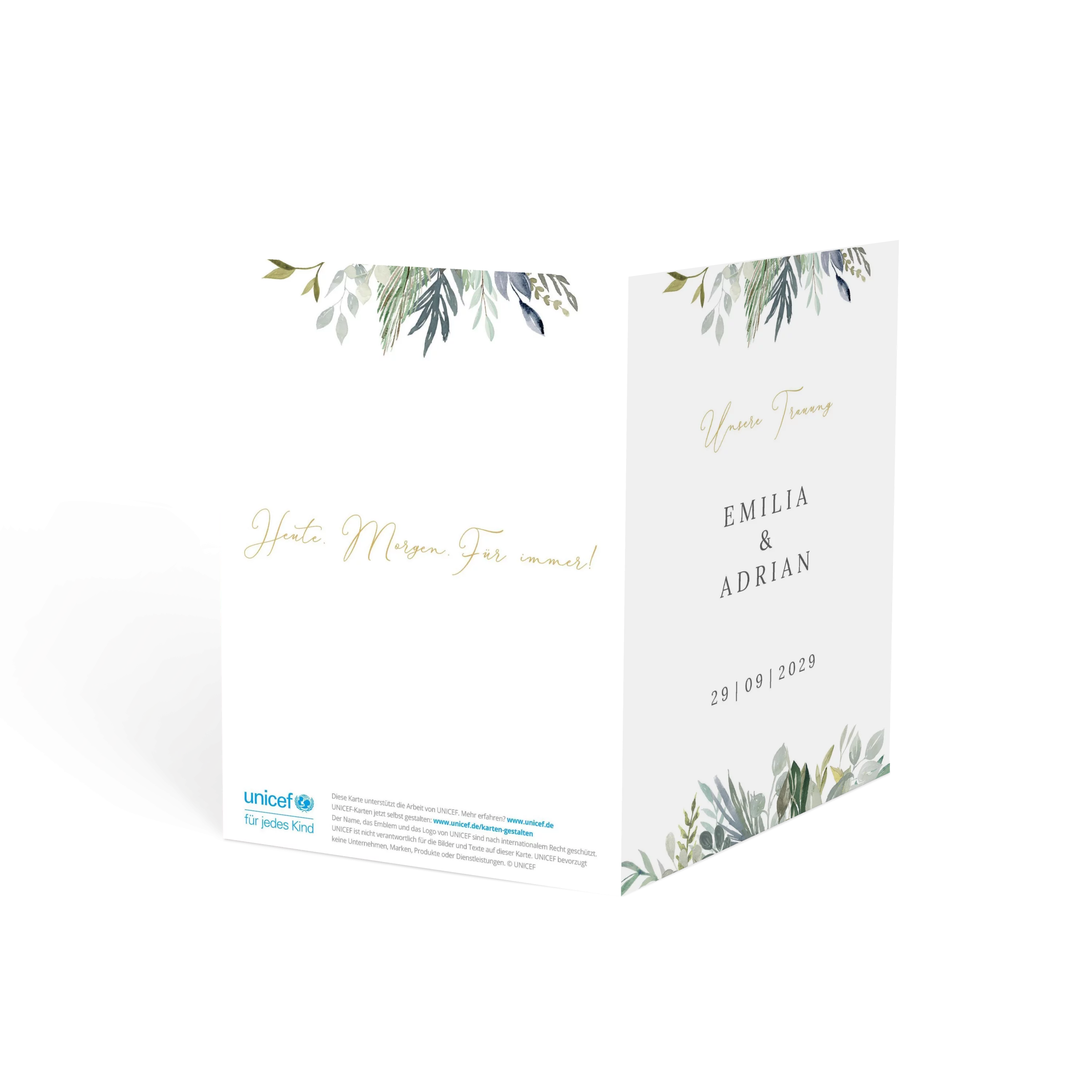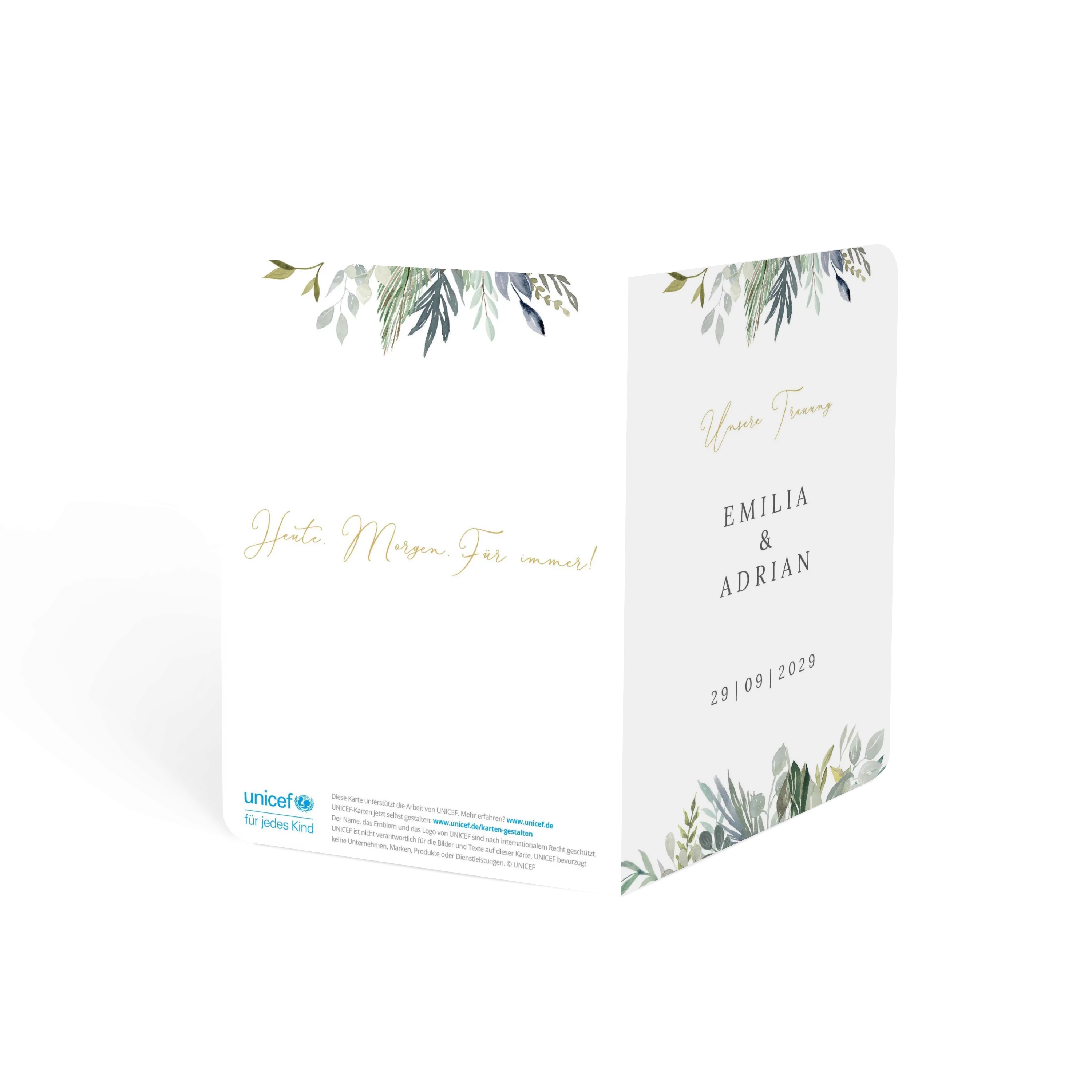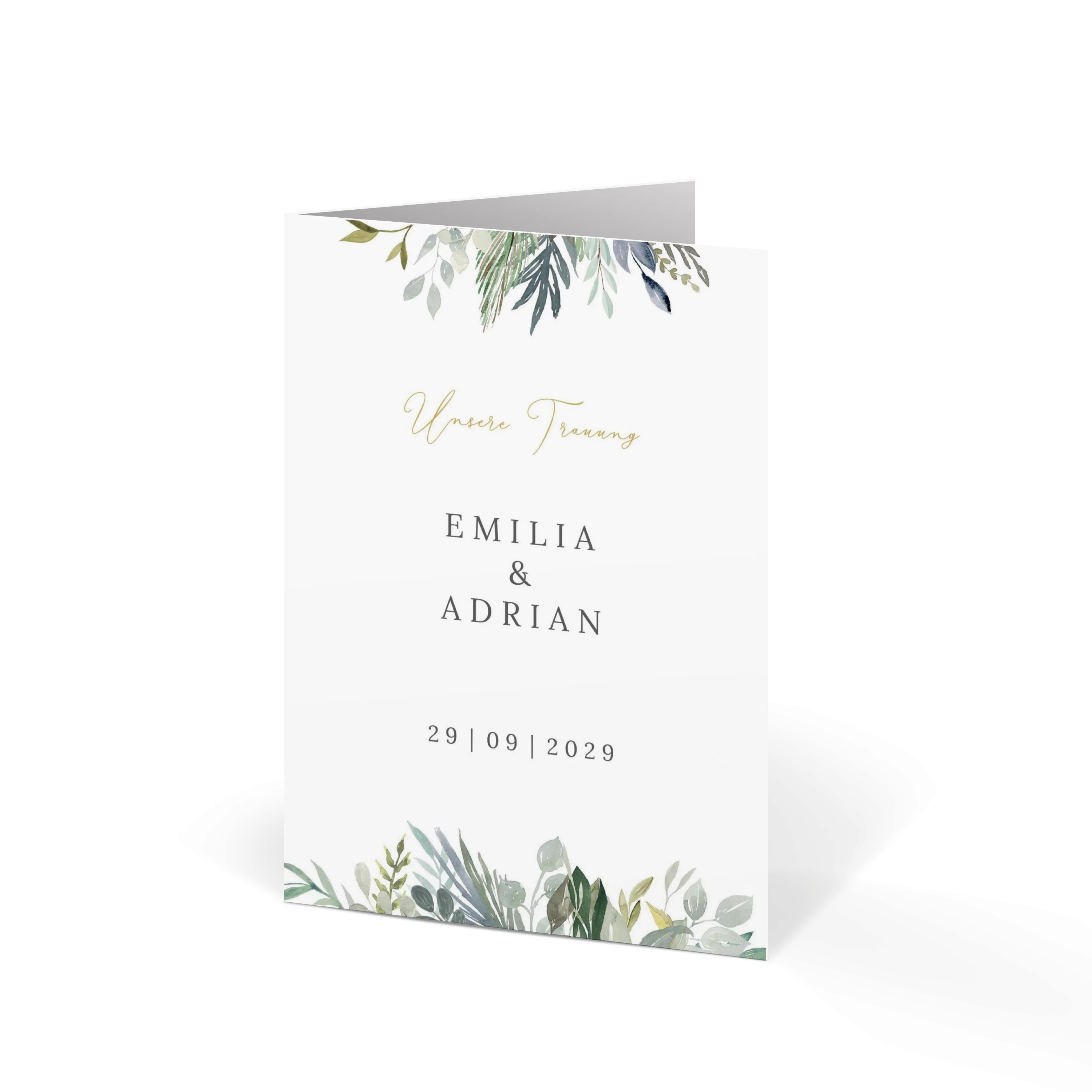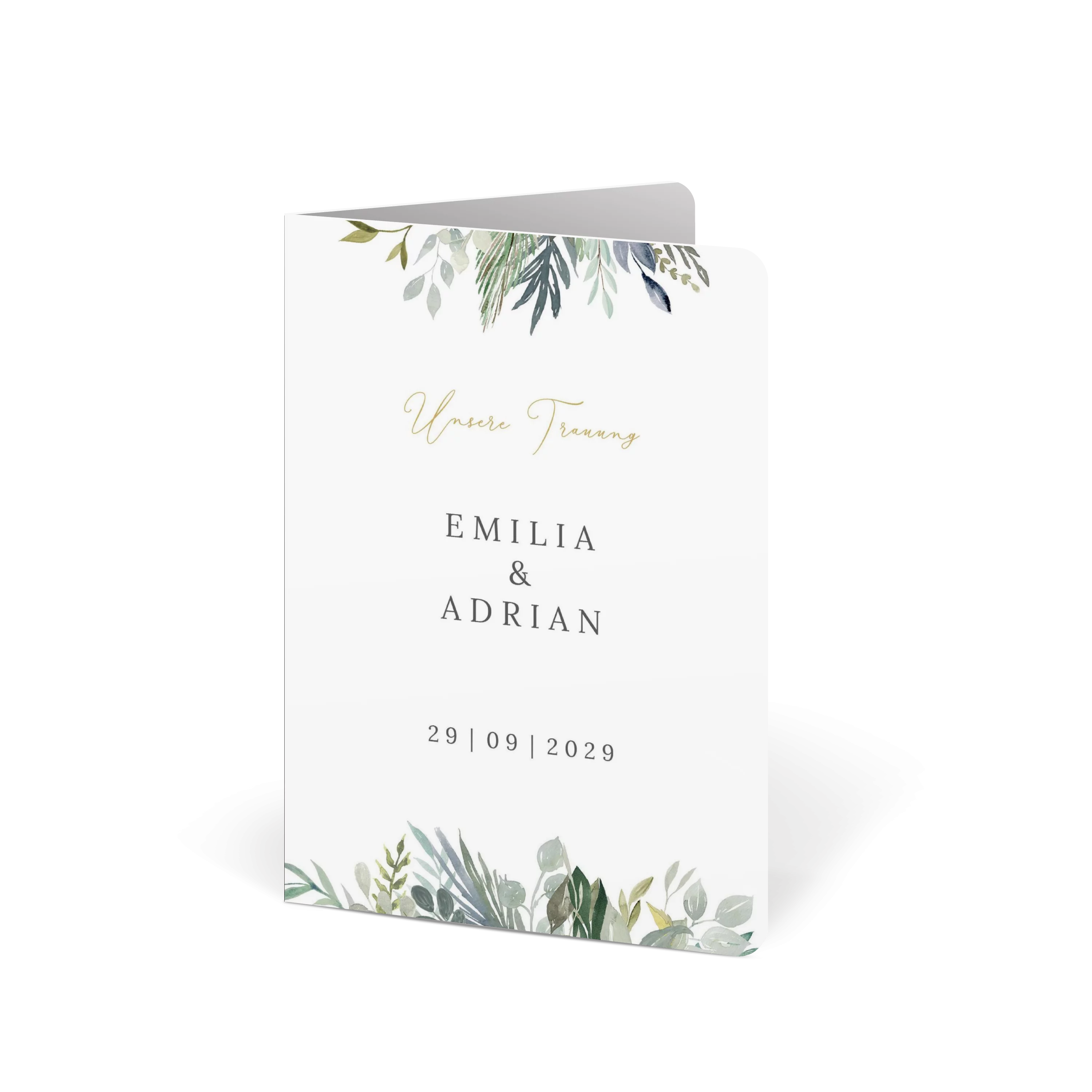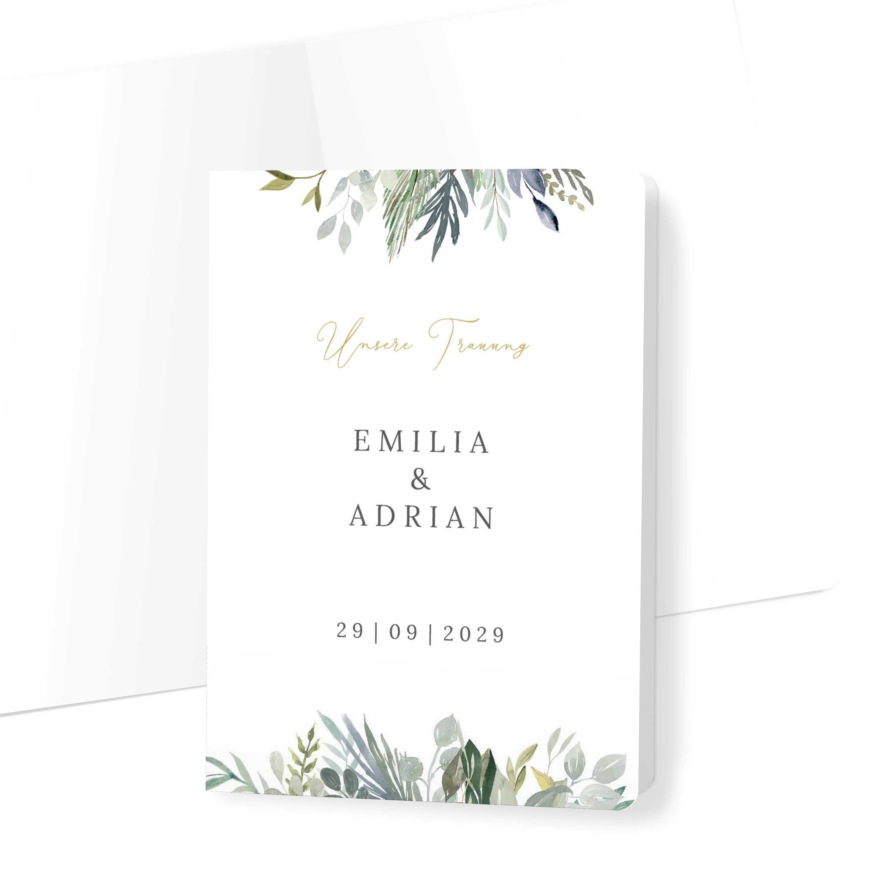 Grüne Blätter, feine Zweige und ein Hauch Eukalyptus – diese Kirchenhefte bringt frische Naturtöne und Leichtigkeit zusammen. Minimalistisches Design trifft auf liebevolle Details. „Wir heiraten“ – und ihr seid dabei!