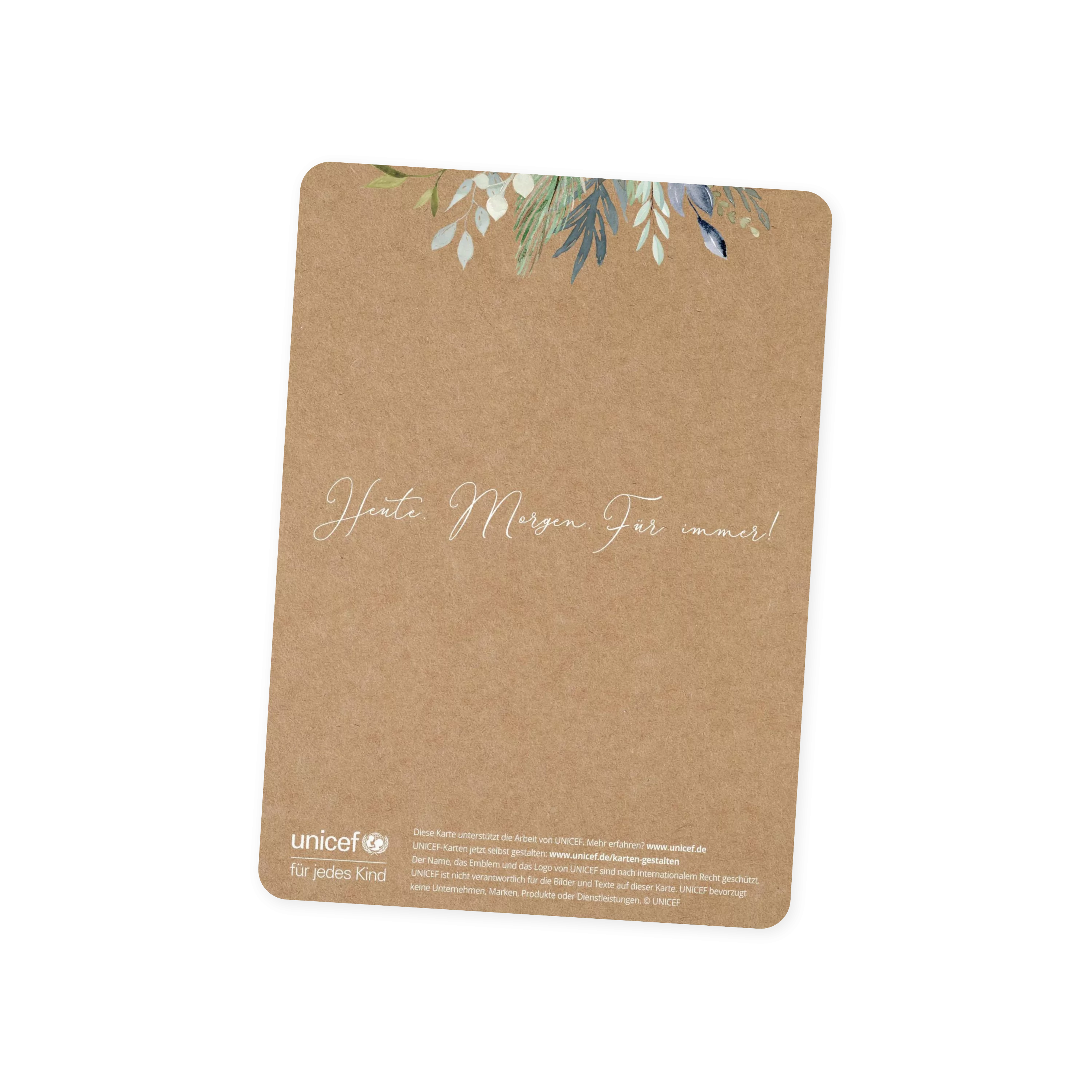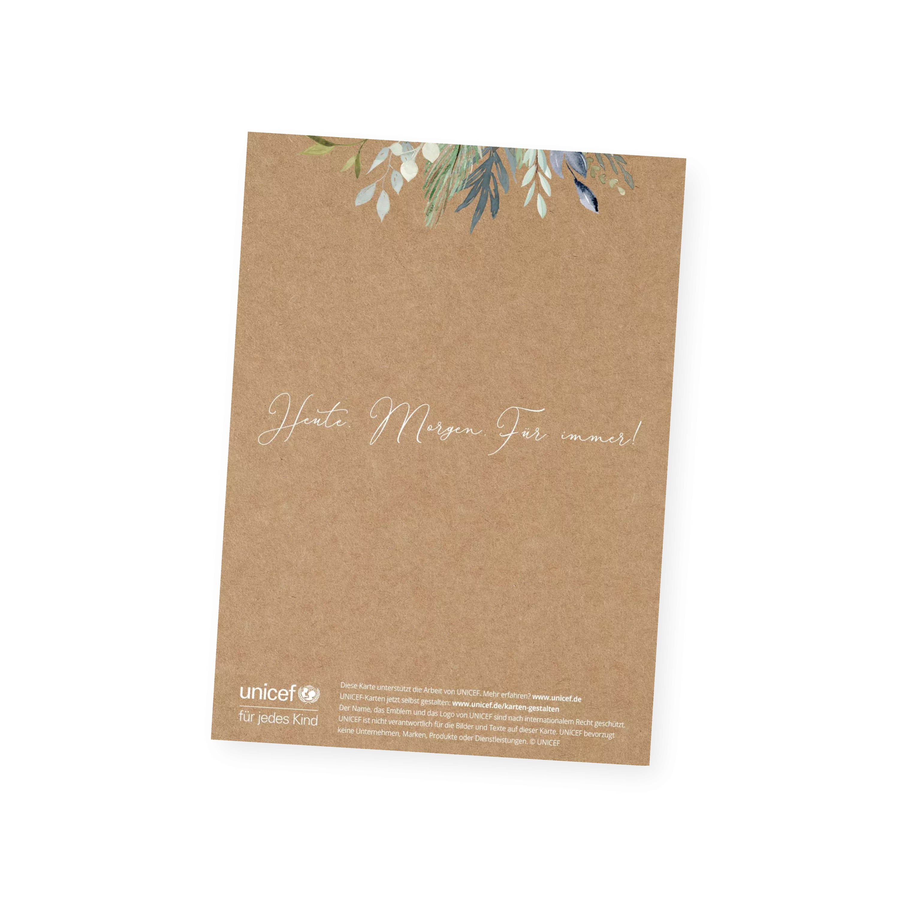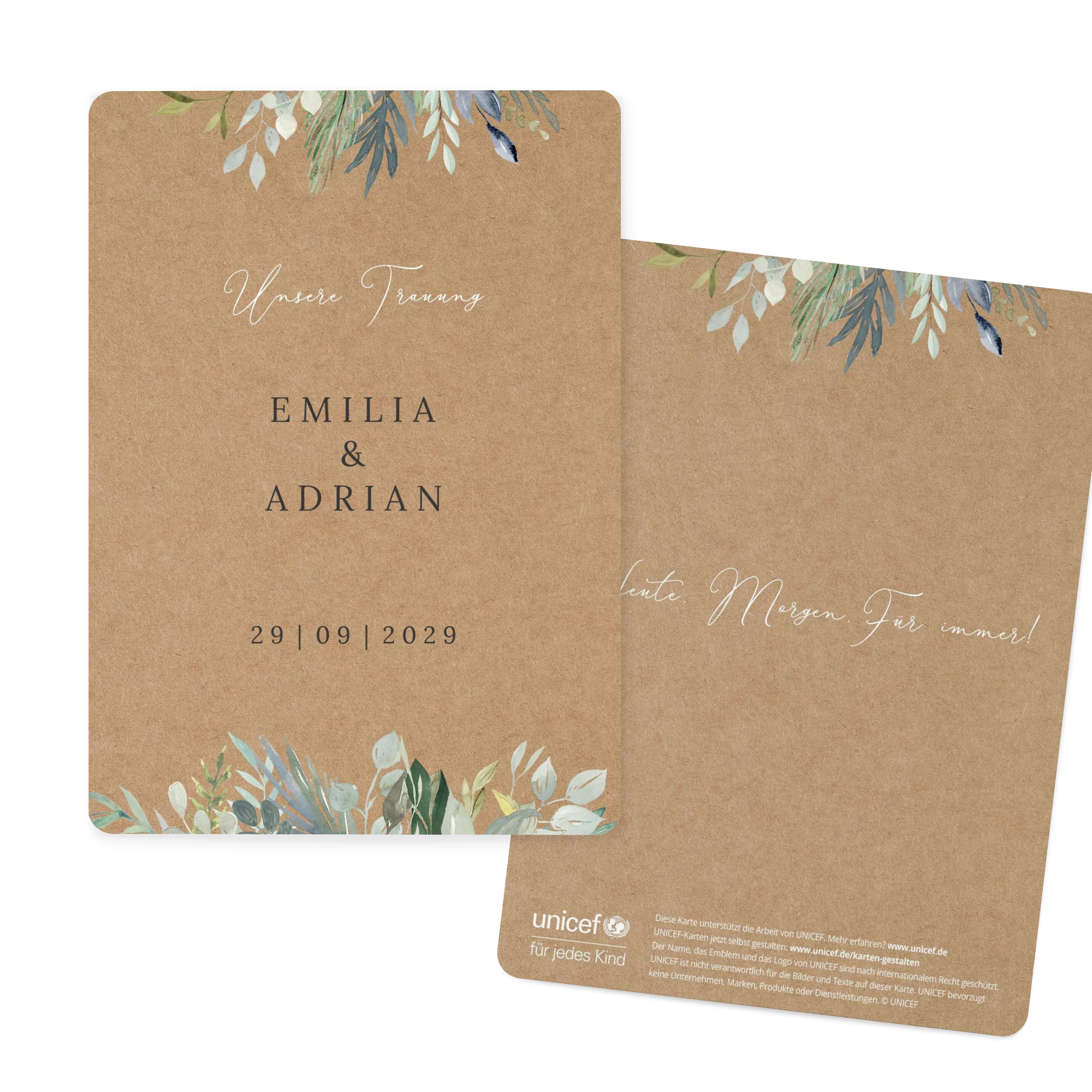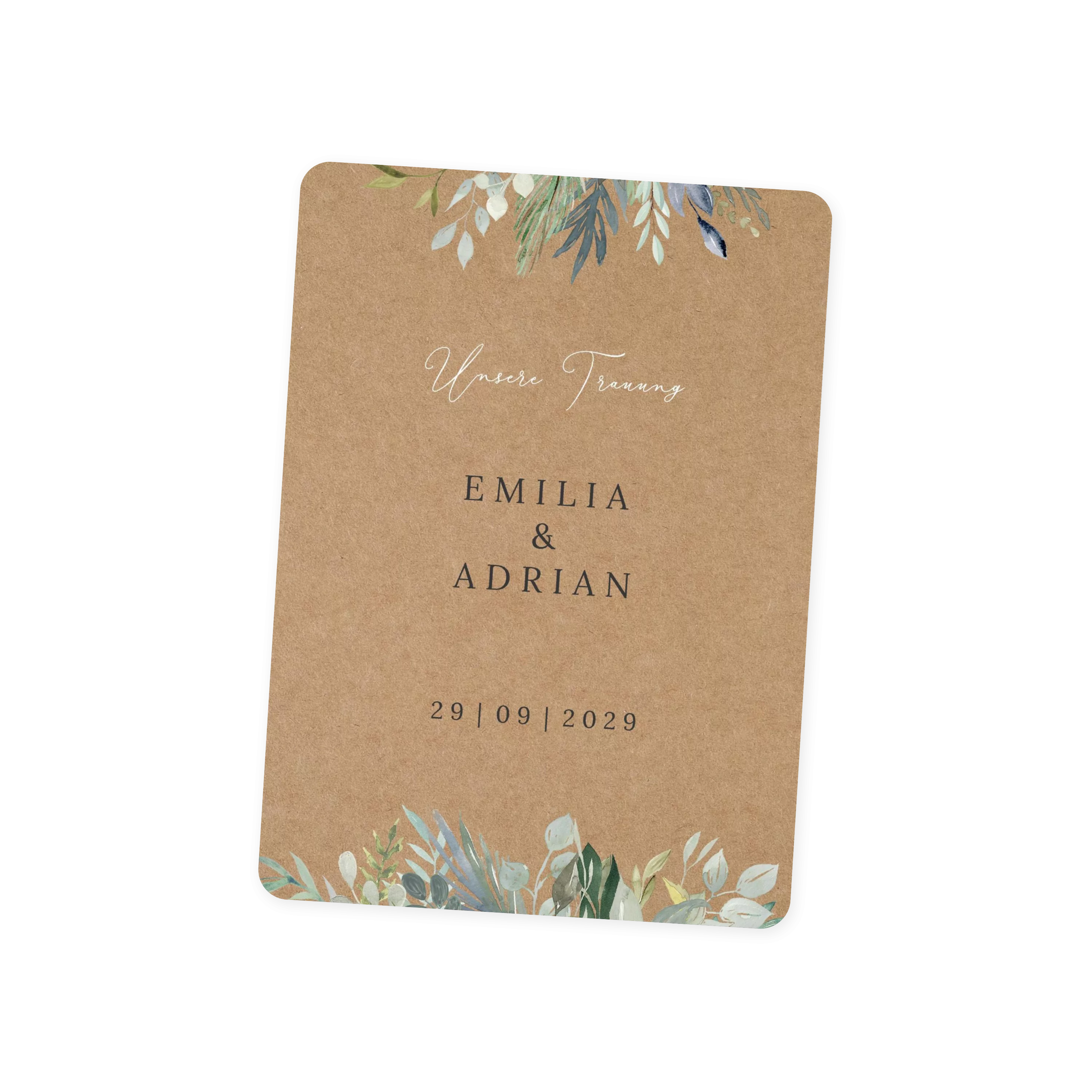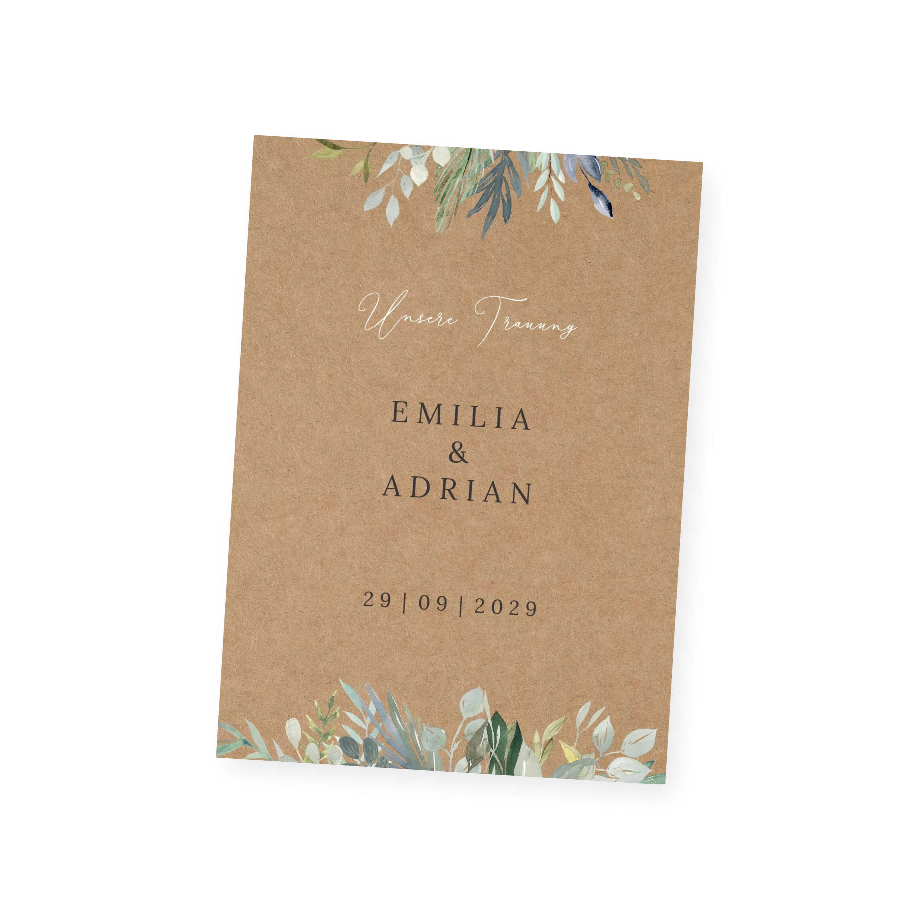 Grüne Blätter, feine Zweige und ein Hauch Eukalyptus – diese Kirchenhefte bringt frische Naturtöne und Leichtigkeit zusammen. Minimalistisches Design trifft auf liebevolle Details. „Wir heiraten“ – und ihr seid dabei!