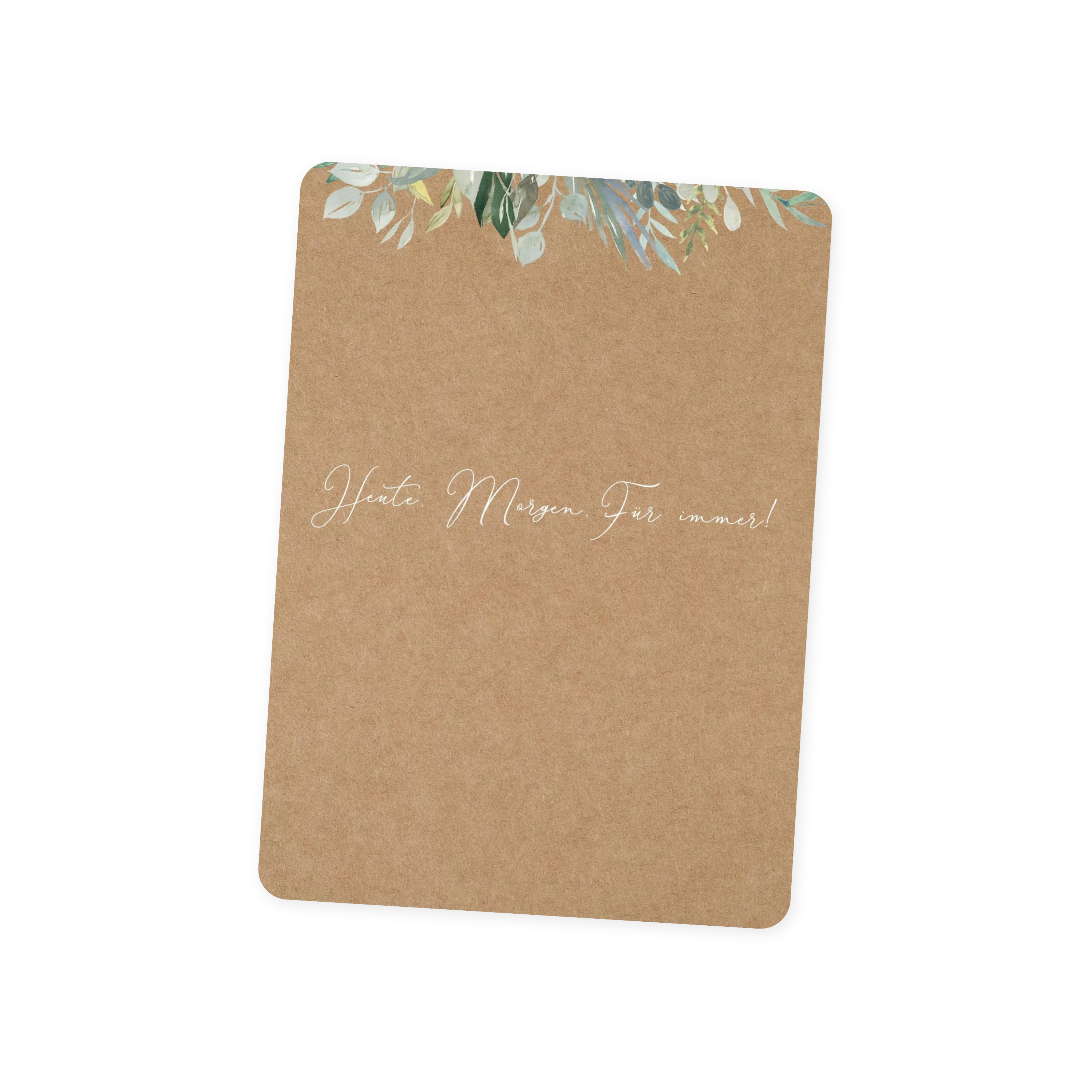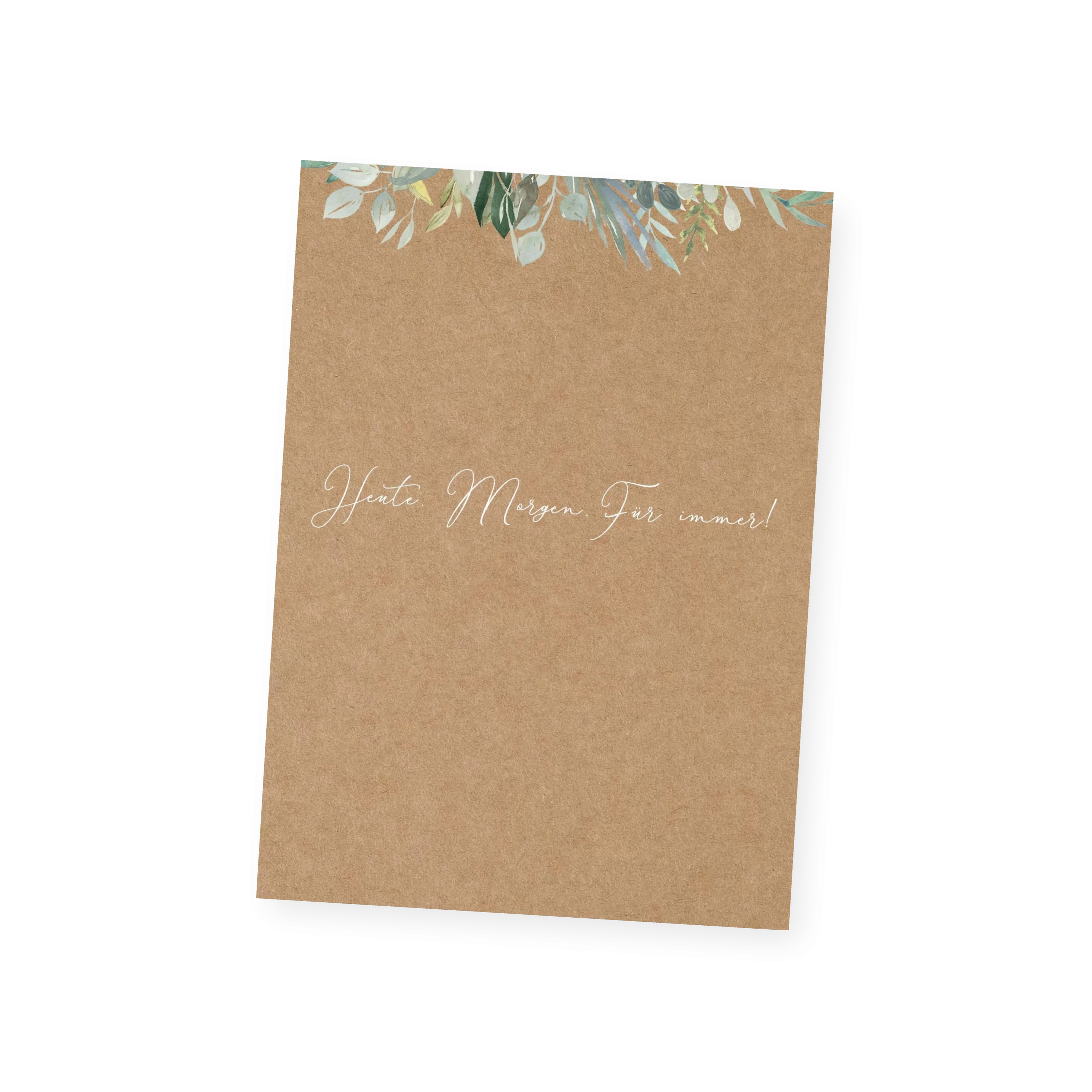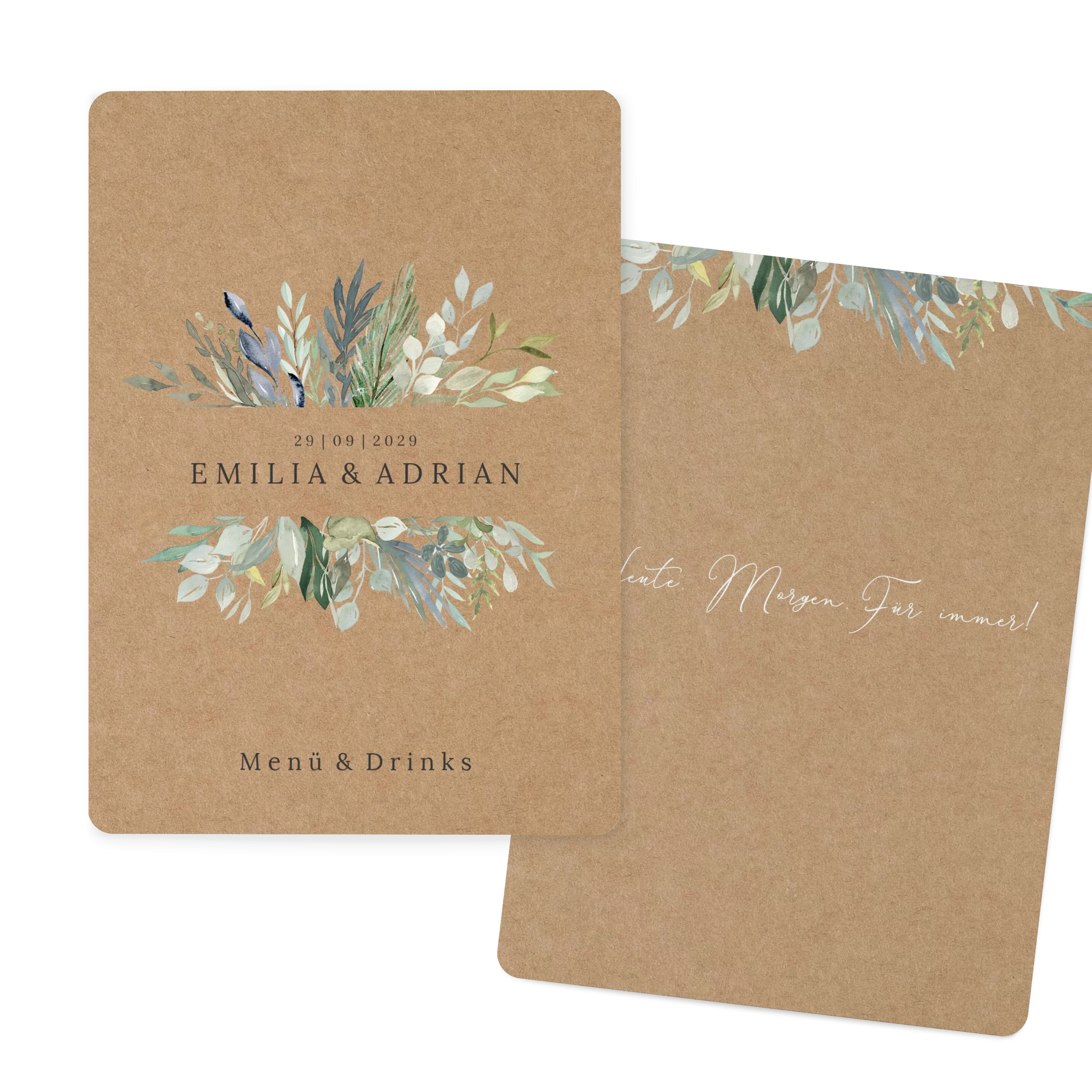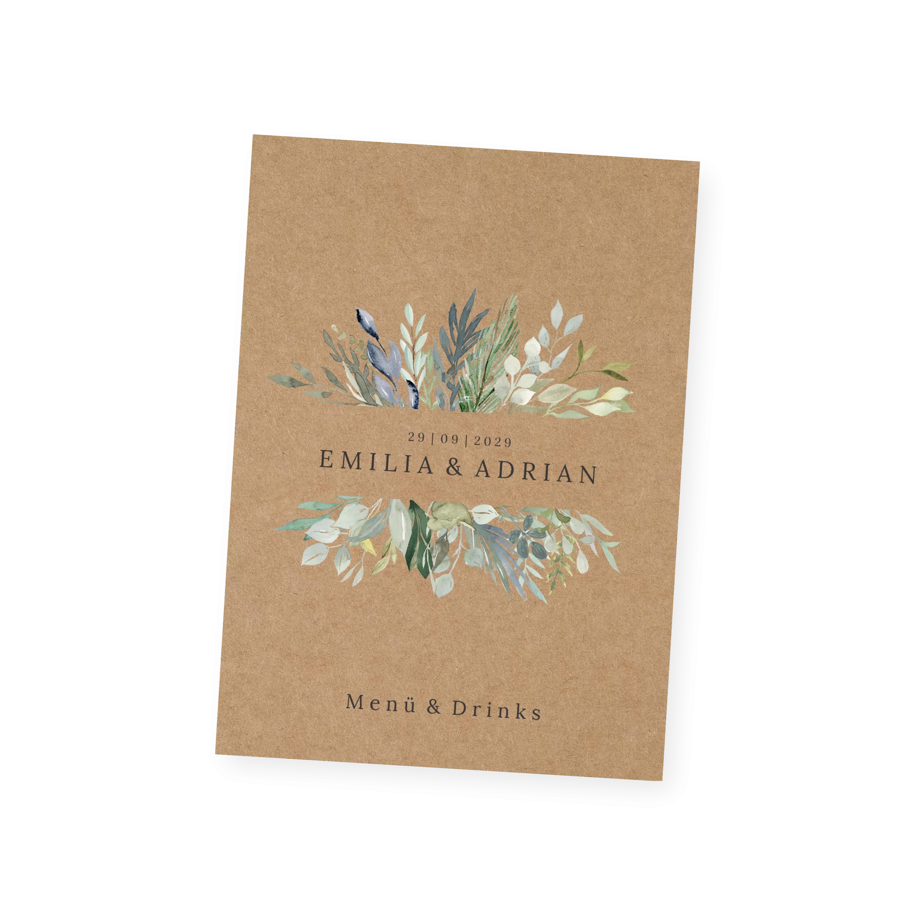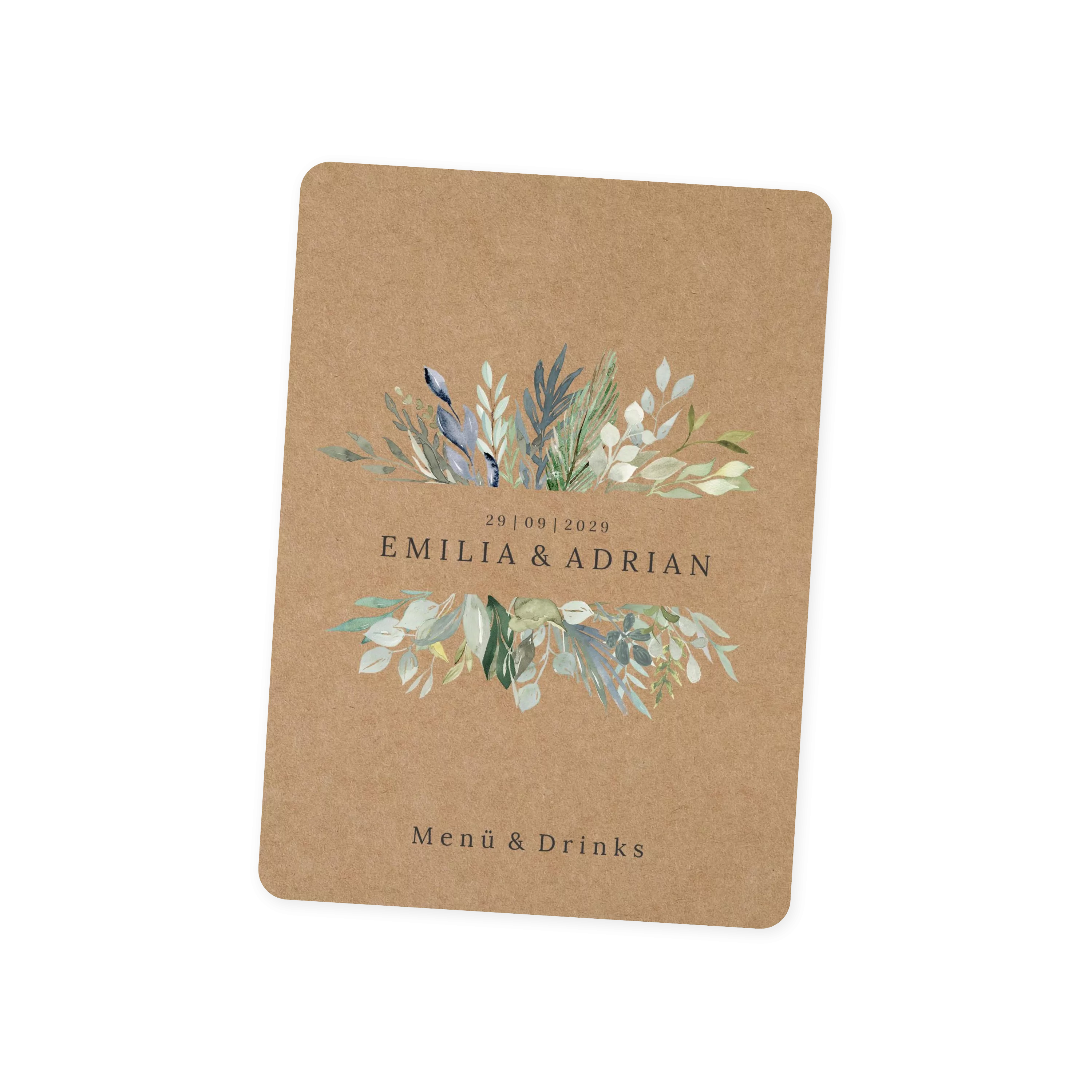 Grüne Blätter, feine Zweige und ein Hauch Eukalyptus – diese Menükarte bringt frische Naturtöne und Leichtigkeit auf den Tisch. Minimalistisches Design trifft auf liebevolle Details.