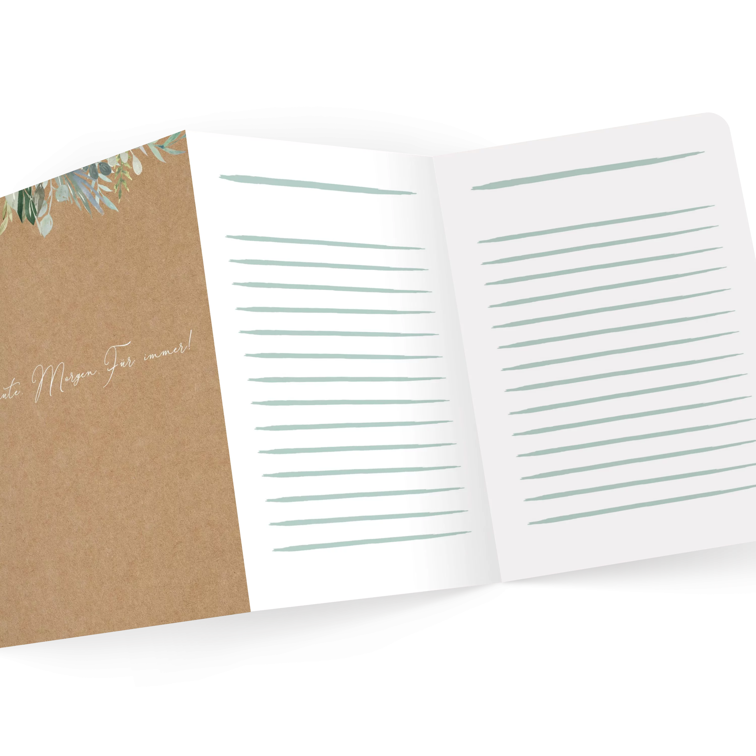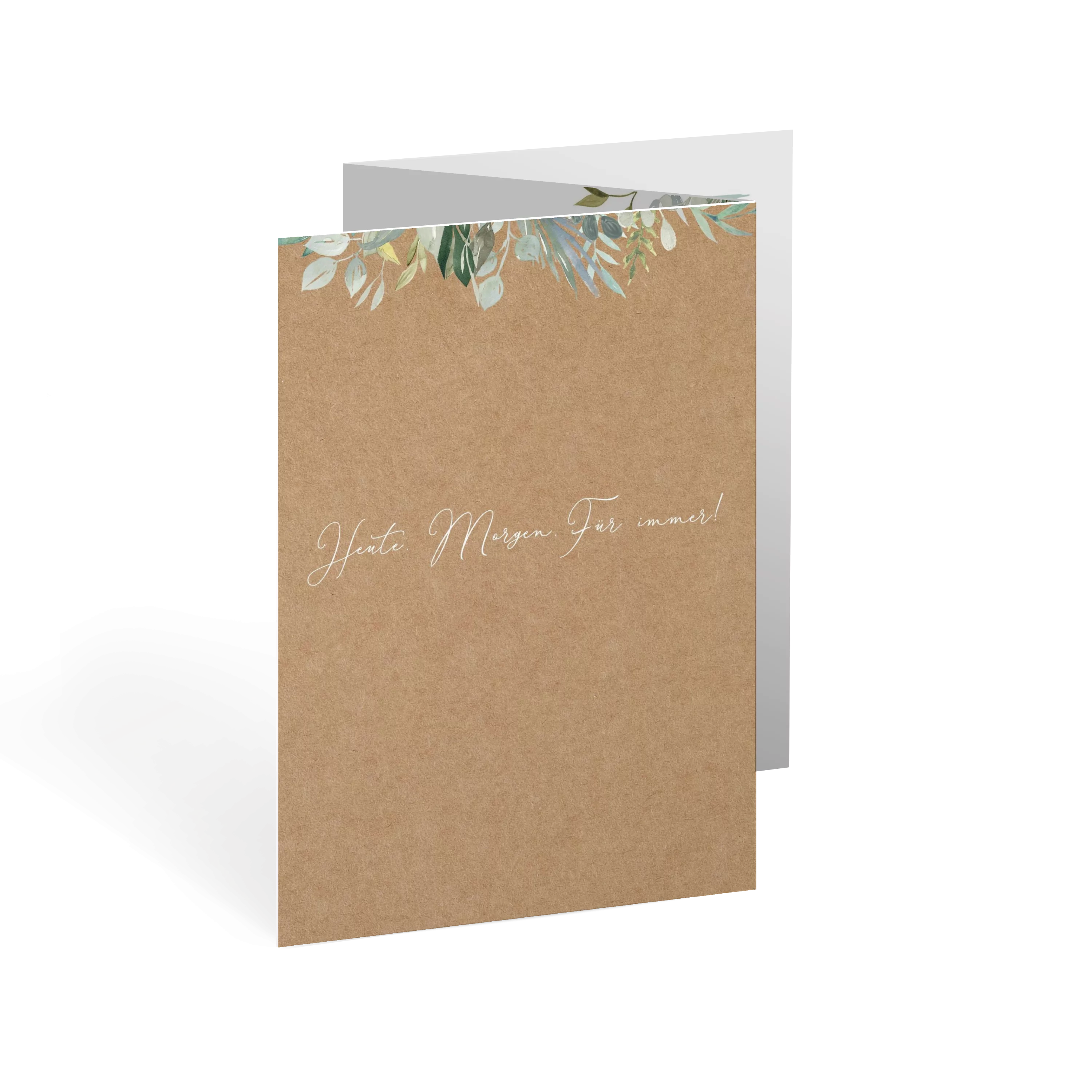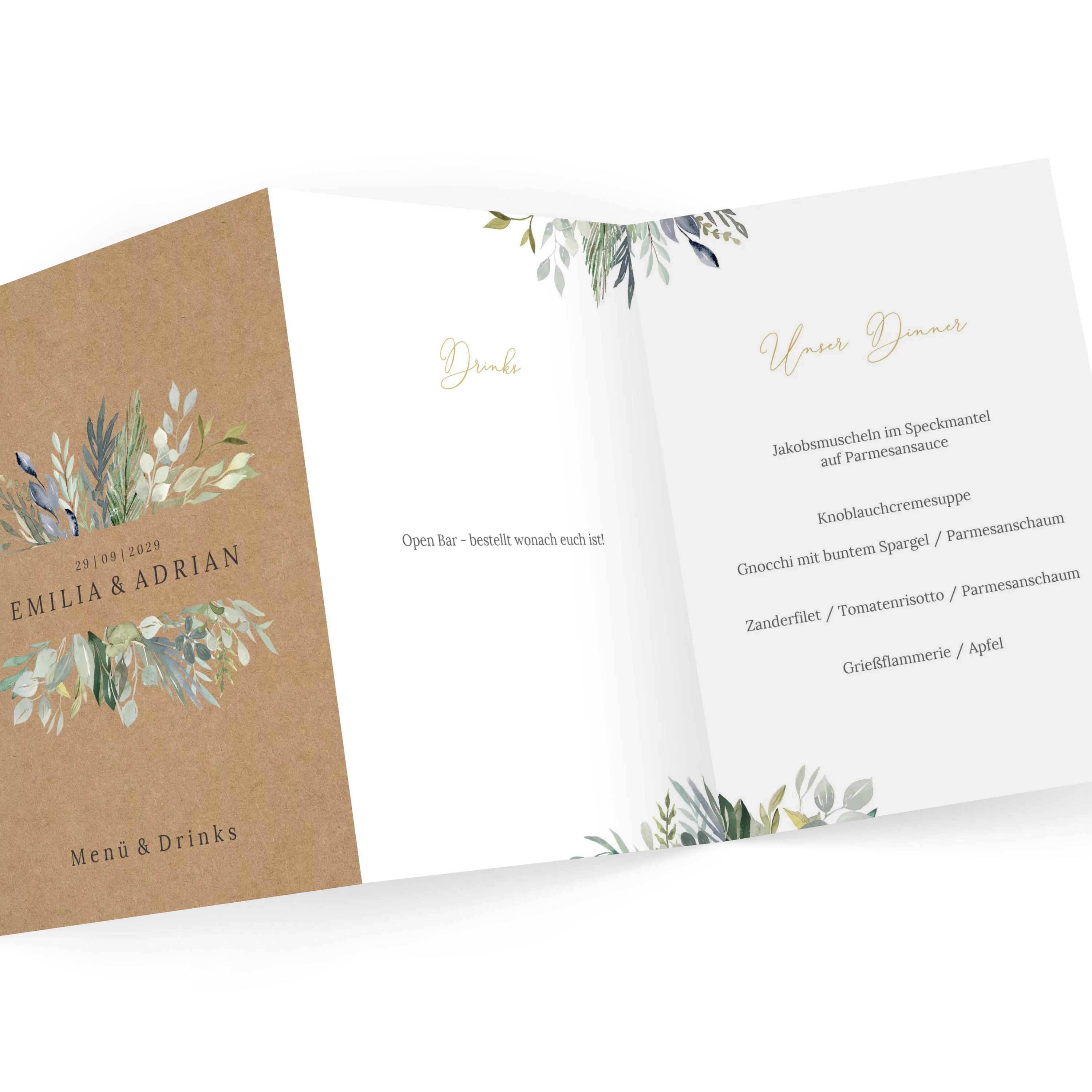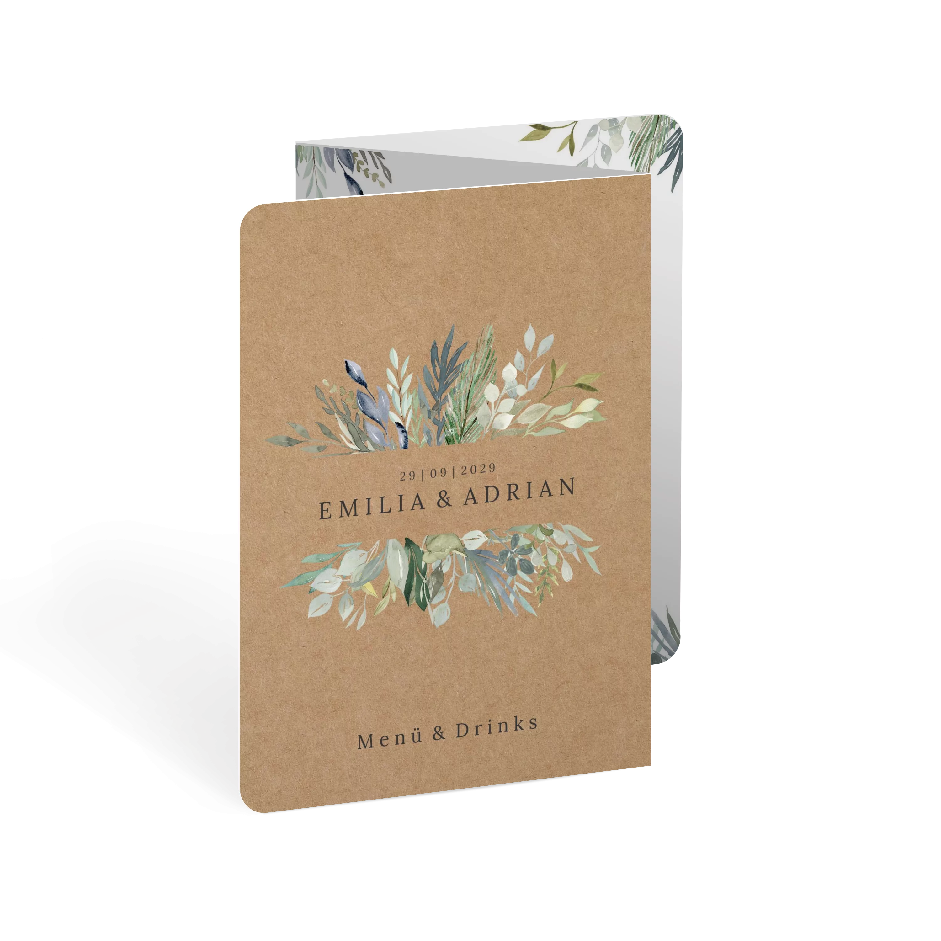 Grüne Blätter, feine Zweige und ein Hauch Eukalyptus – diese Menükarte bringt frische Naturtöne und Leichtigkeit auf den Tisch. Minimalistisches Design trifft auf liebevolle Details.