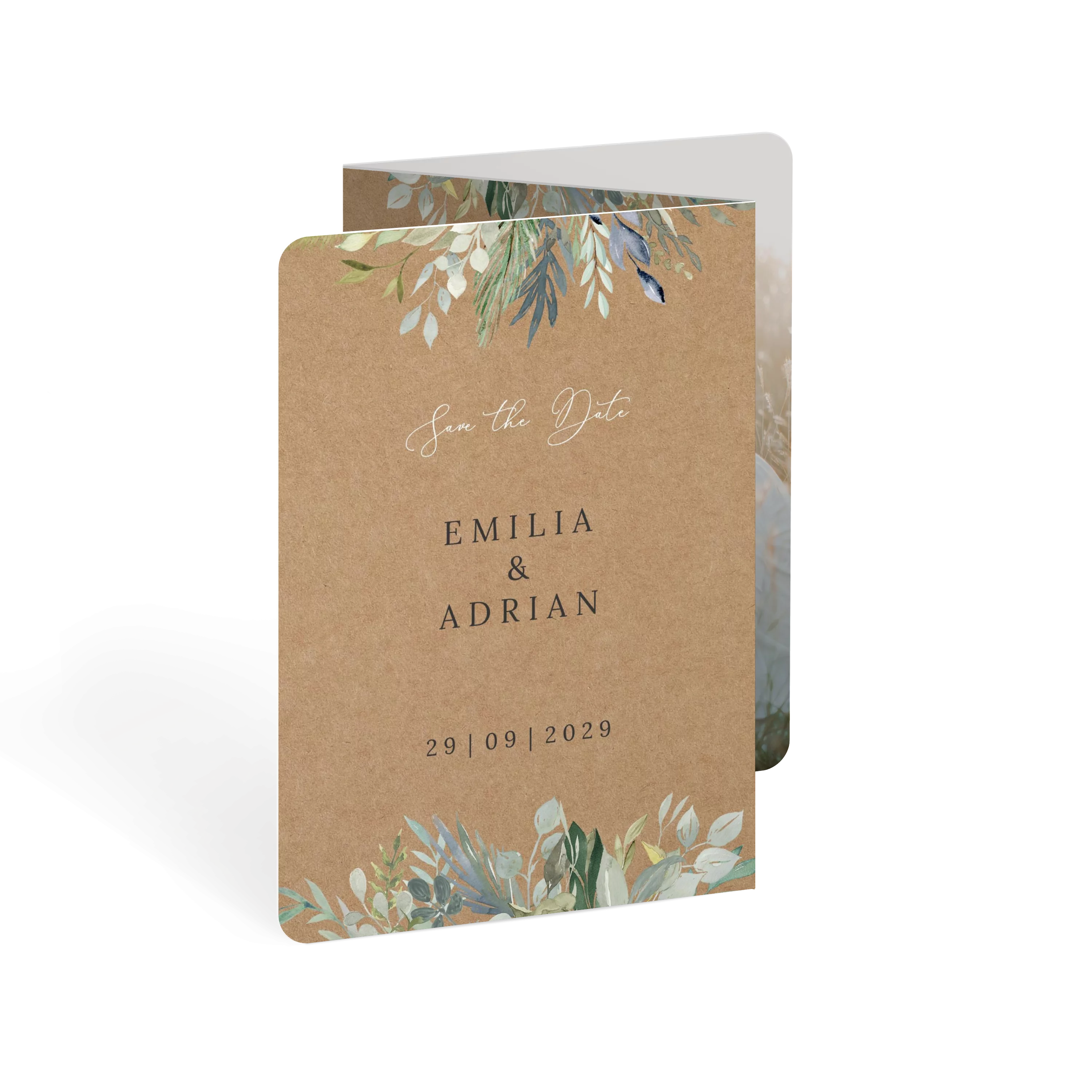 Grüne Blätter, feine Zweige und ein Hauch Eukalyptus – diese Save-the-Date-Karte bringt frische Naturtöne und Leichtigkeit in Ihre Hochzeitsankündigung. Minimalistisches Design trifft auf liebevolle Details.