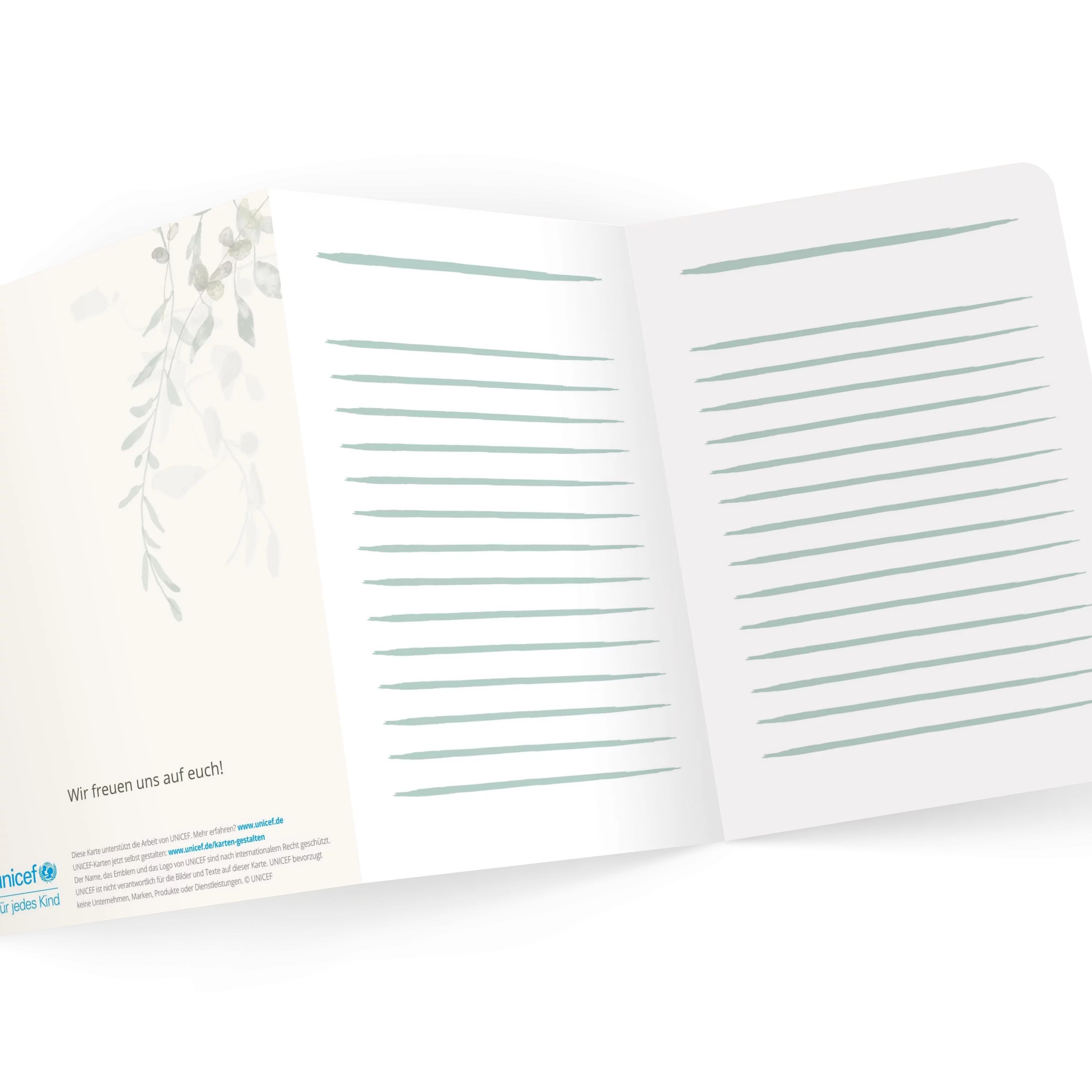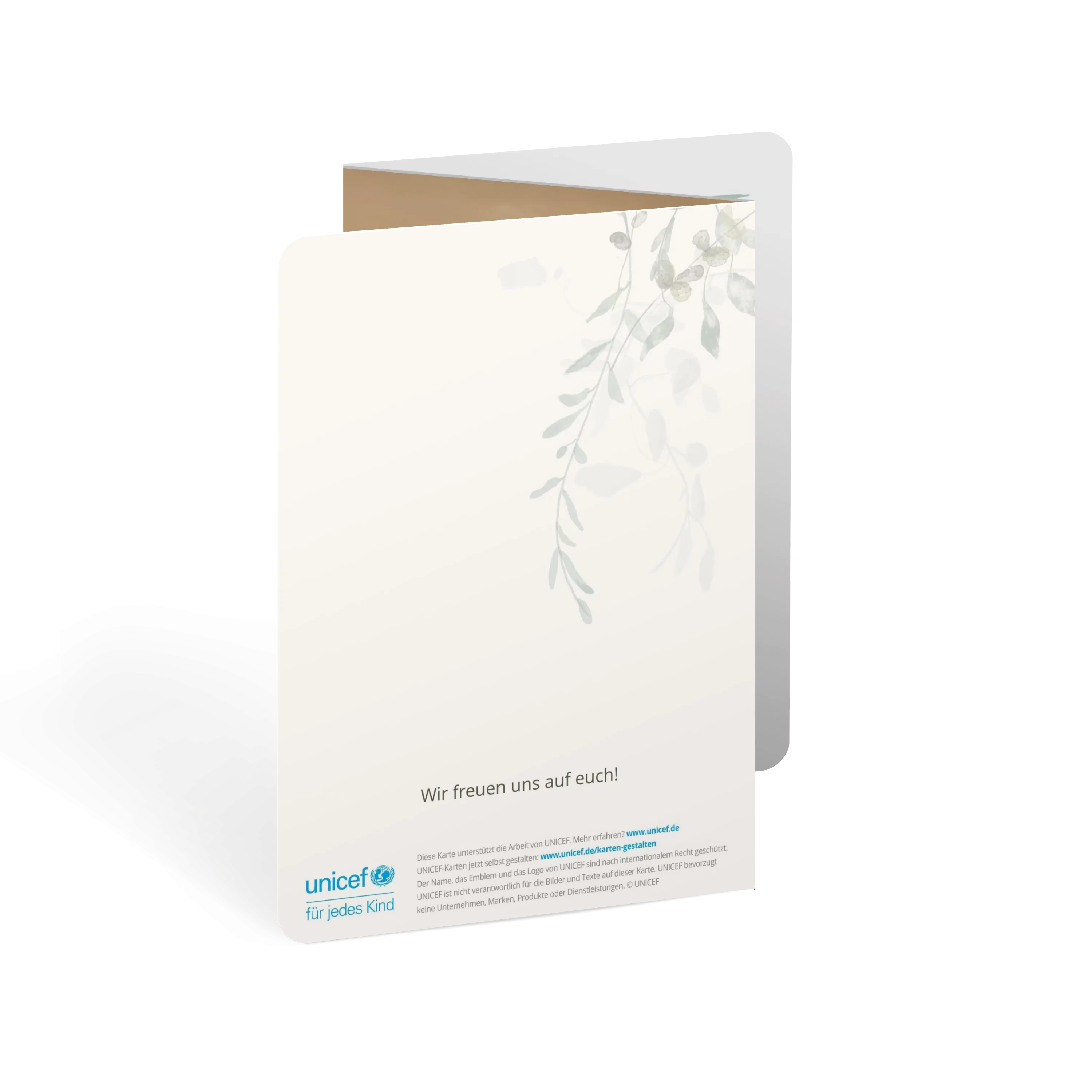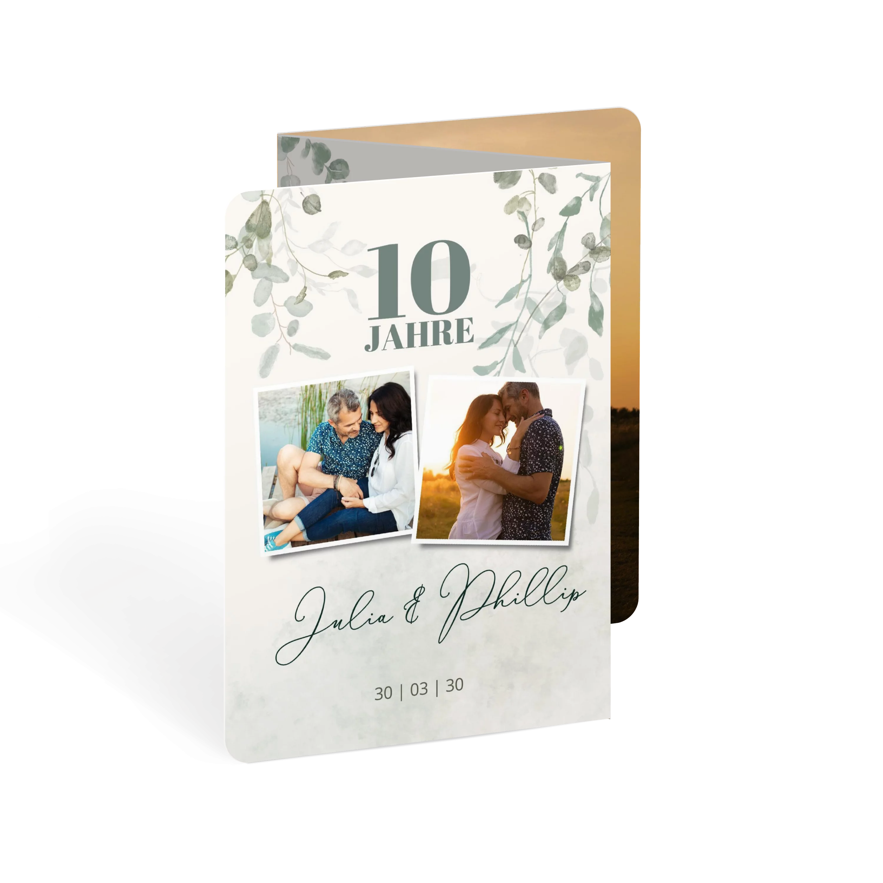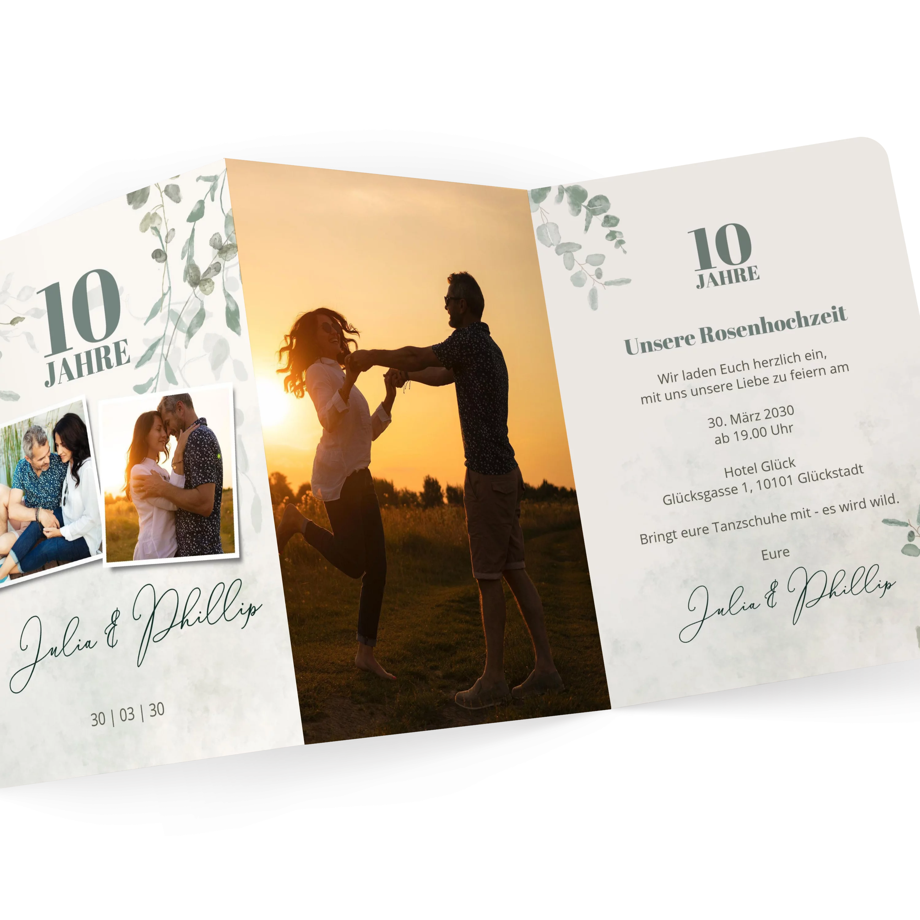 Mit sanften Eukalyptuszweigen und einem modernen Schriftmix ist diese Karte ideal für Einladungen zur Rosenhochzeit. Das Design kombiniert natürliche Grüntöne mit einer eleganten, hellen Hintergrundfläche. Zwei Bildfelder auf der Vorderseite bieten Raum für persönliche Fotos – wahlweise farbig oder in Schwarz-Weiß.