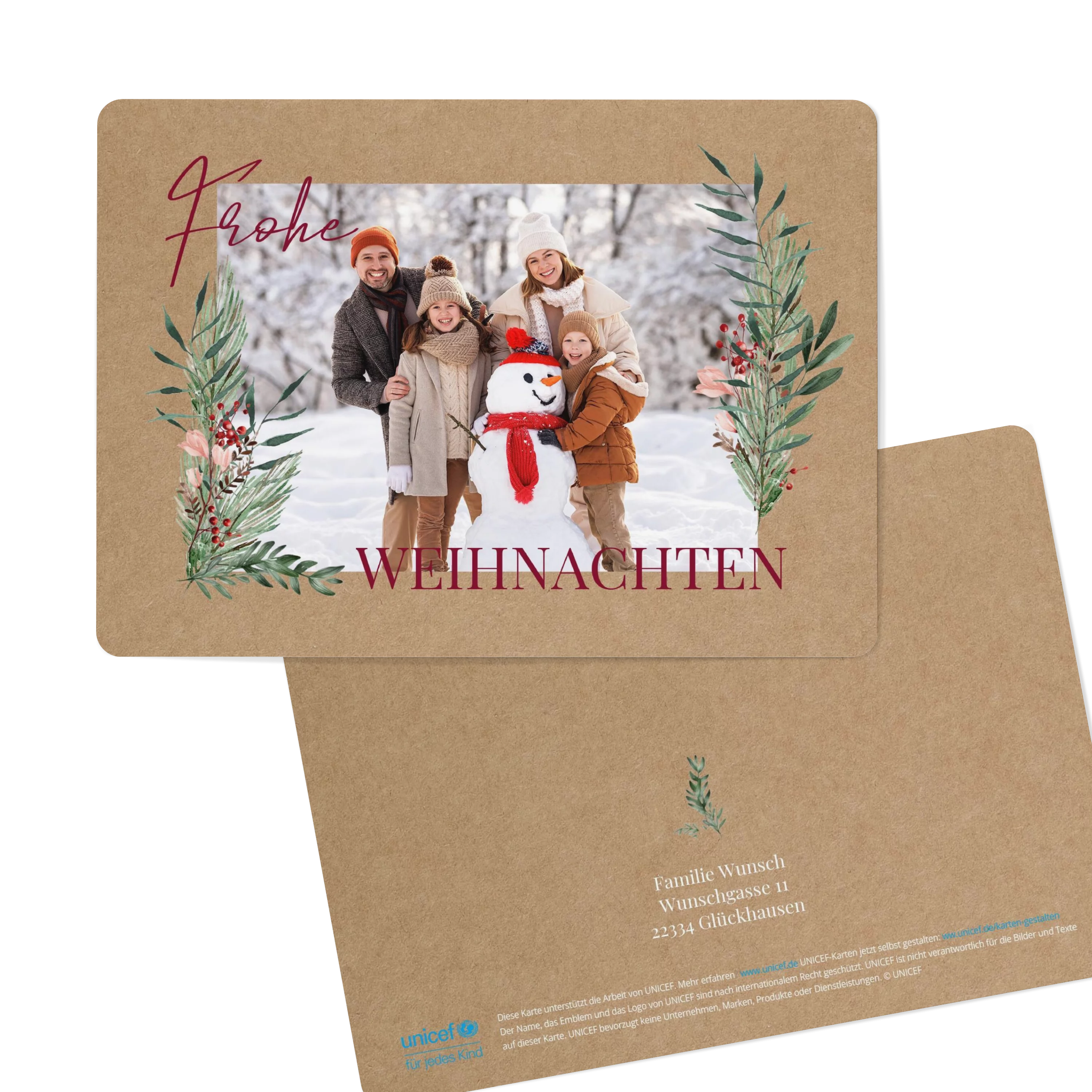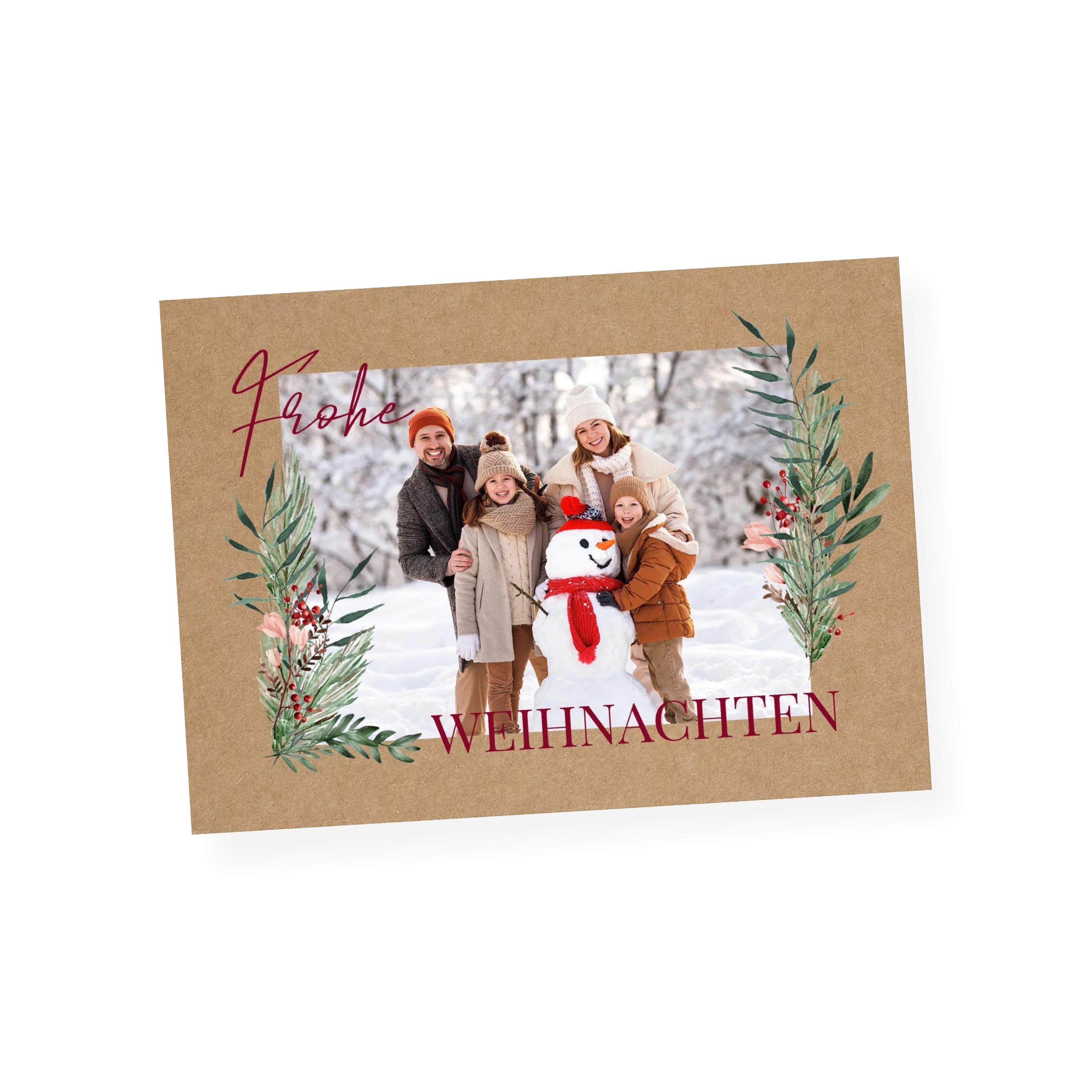 Auf rustikalem Kraftpapier wird Ihr Lieblingsbild von grünen Zweigen mit roten Details umrahmt. Ebenfalls dunkelrot strahlt eine weihnachtliche Botschaft.