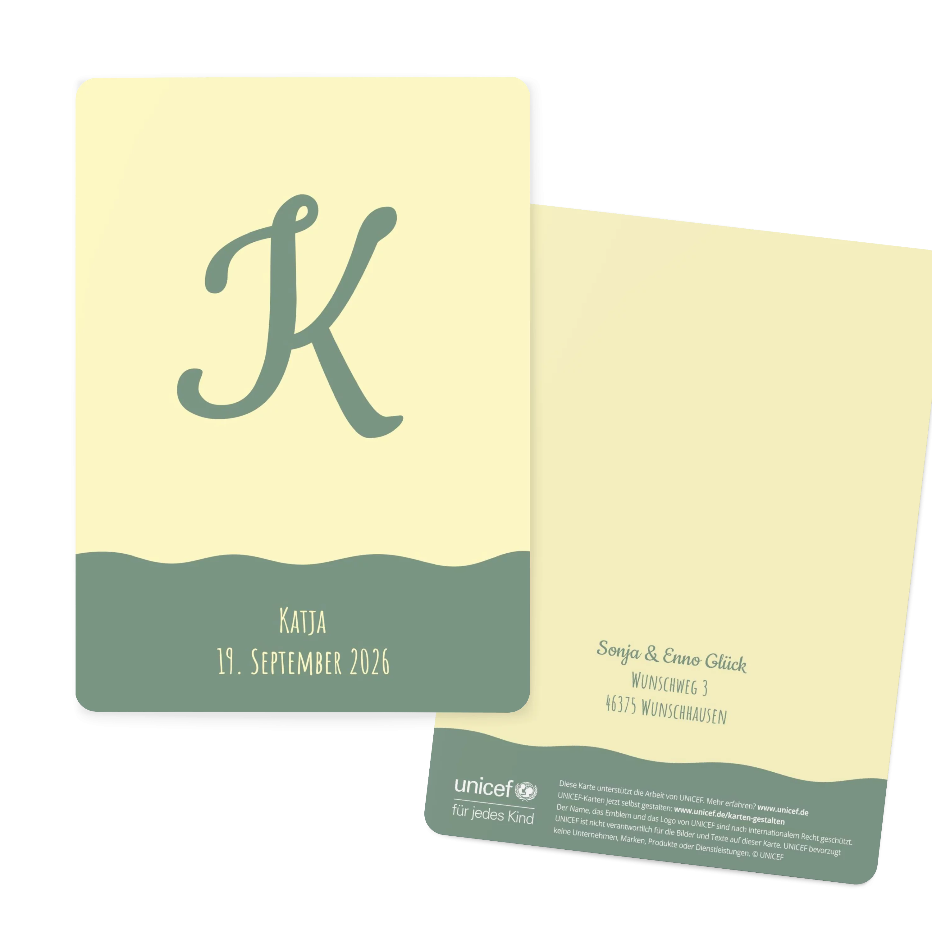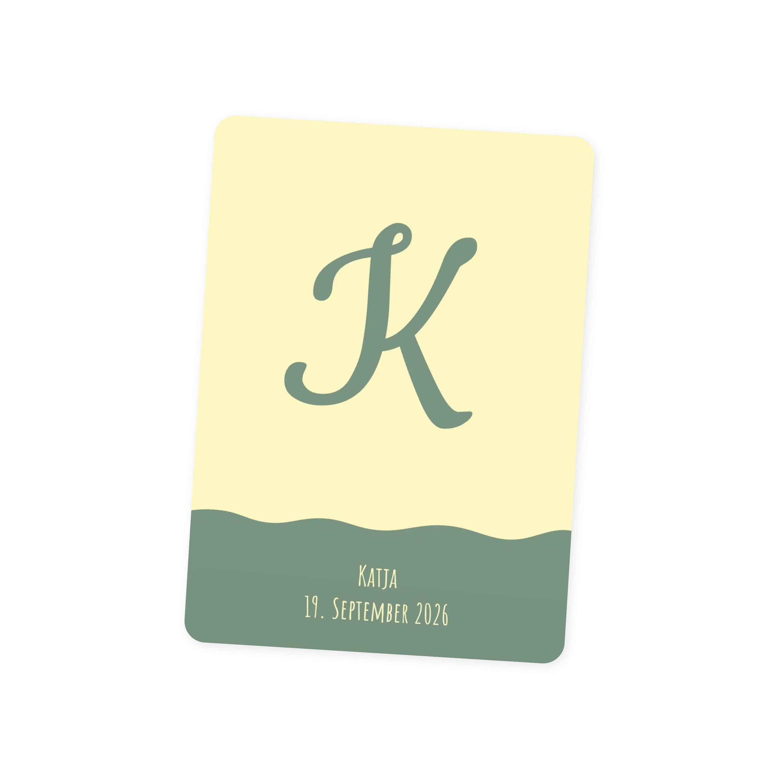 Diese Karte setzt auf klare Gestaltung mit weichen Kanten: Der Anfangsbuchstabe Ihres Babys steht im Mittelpunkt, darunter der Vorname und das Geburtsdatum. Die wellenartige Zweiteilung bringt Bewegung ins Design, das in Rosa und Mint – oder alternativ in frischem Gelb-Grün – erhältlich ist. Eine schlichte, moderne Wahl für Ihre Geburtsnachricht.