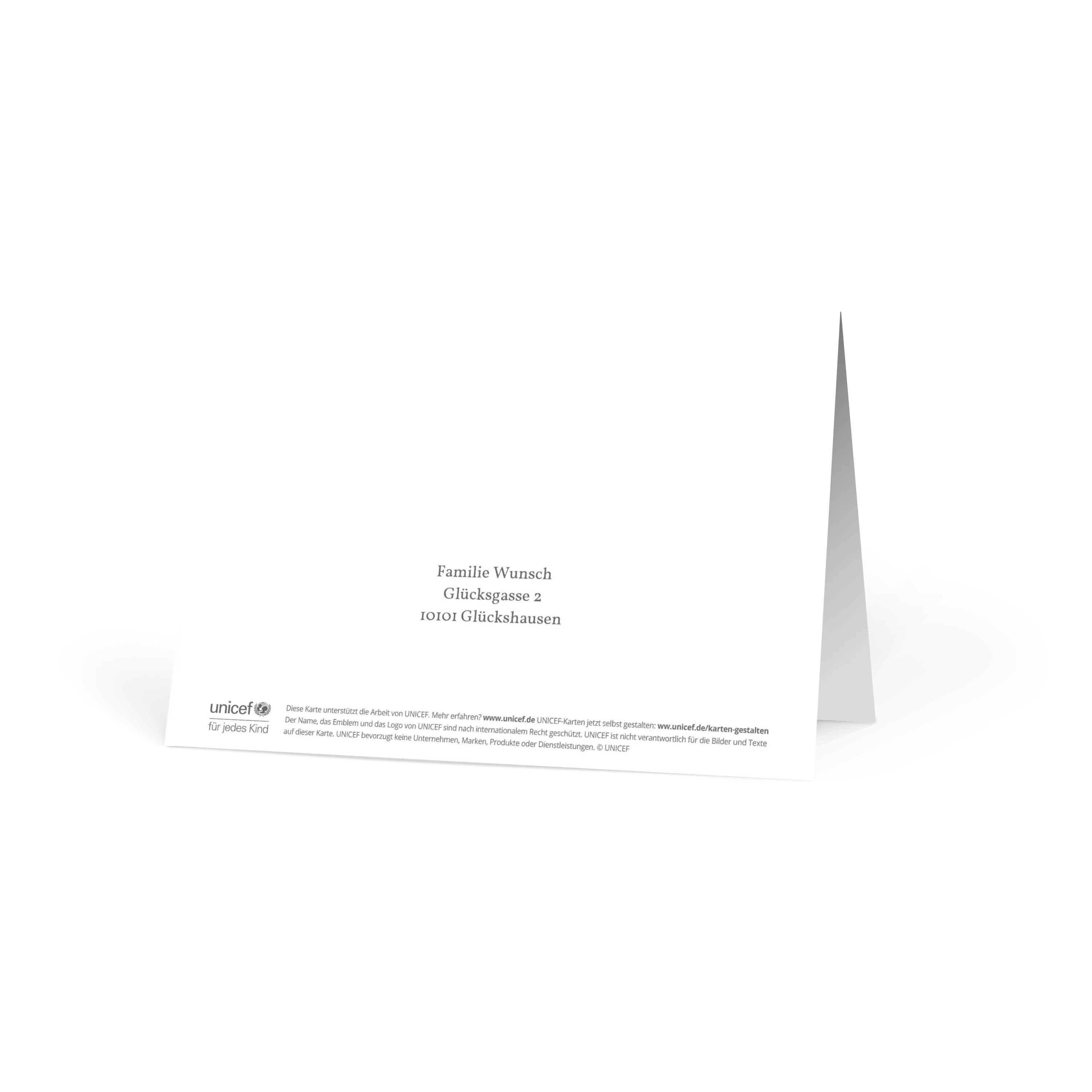 Alle UNICEF-Karten werden unter Einhaltung strenger internationaler Richtlinien hinsichtlich Qualität, Sicherheit, sozialer Verantwortung und Umweltschutz hergestellt. Denn UNICEF ist den Kindern und ihren Familien verpflichtet.