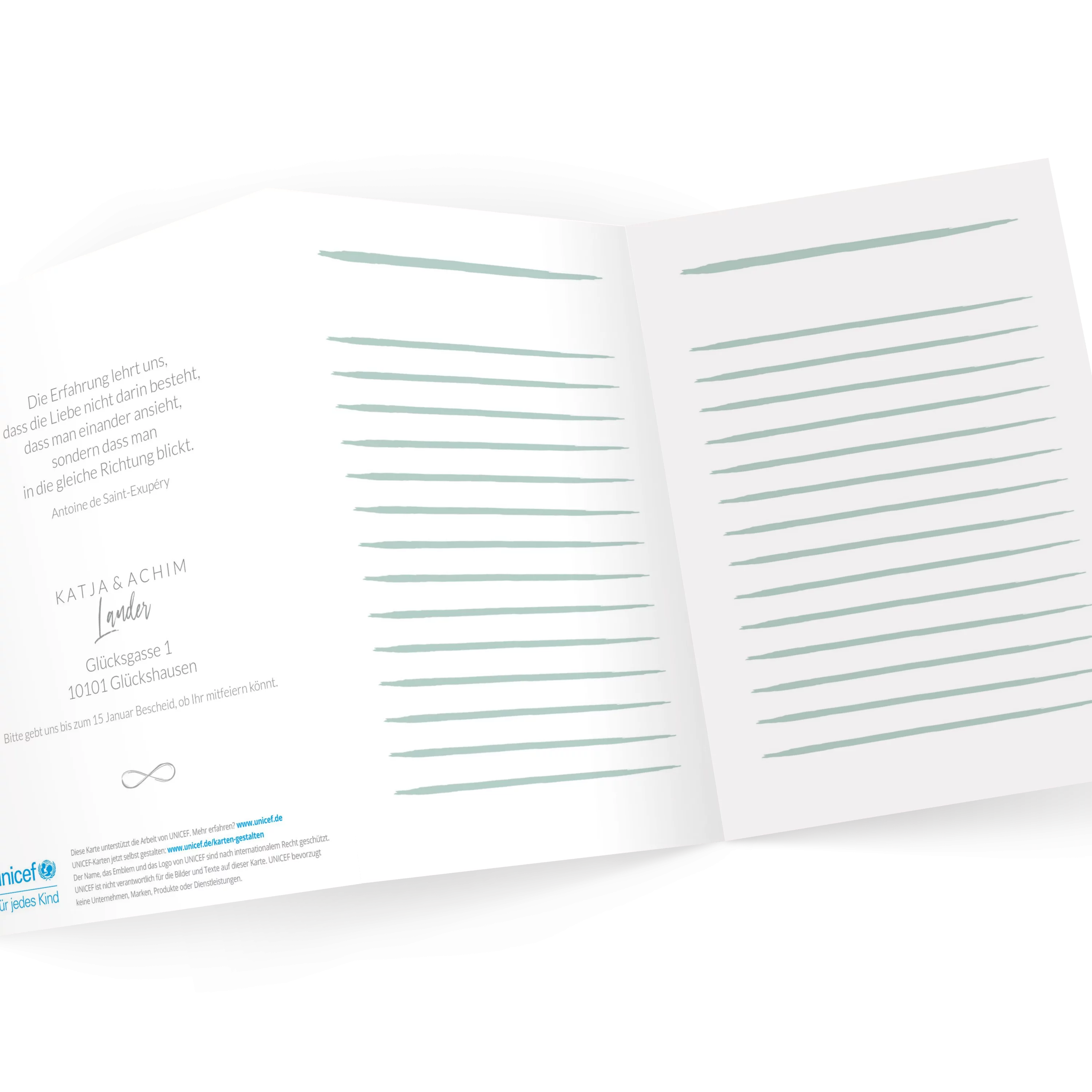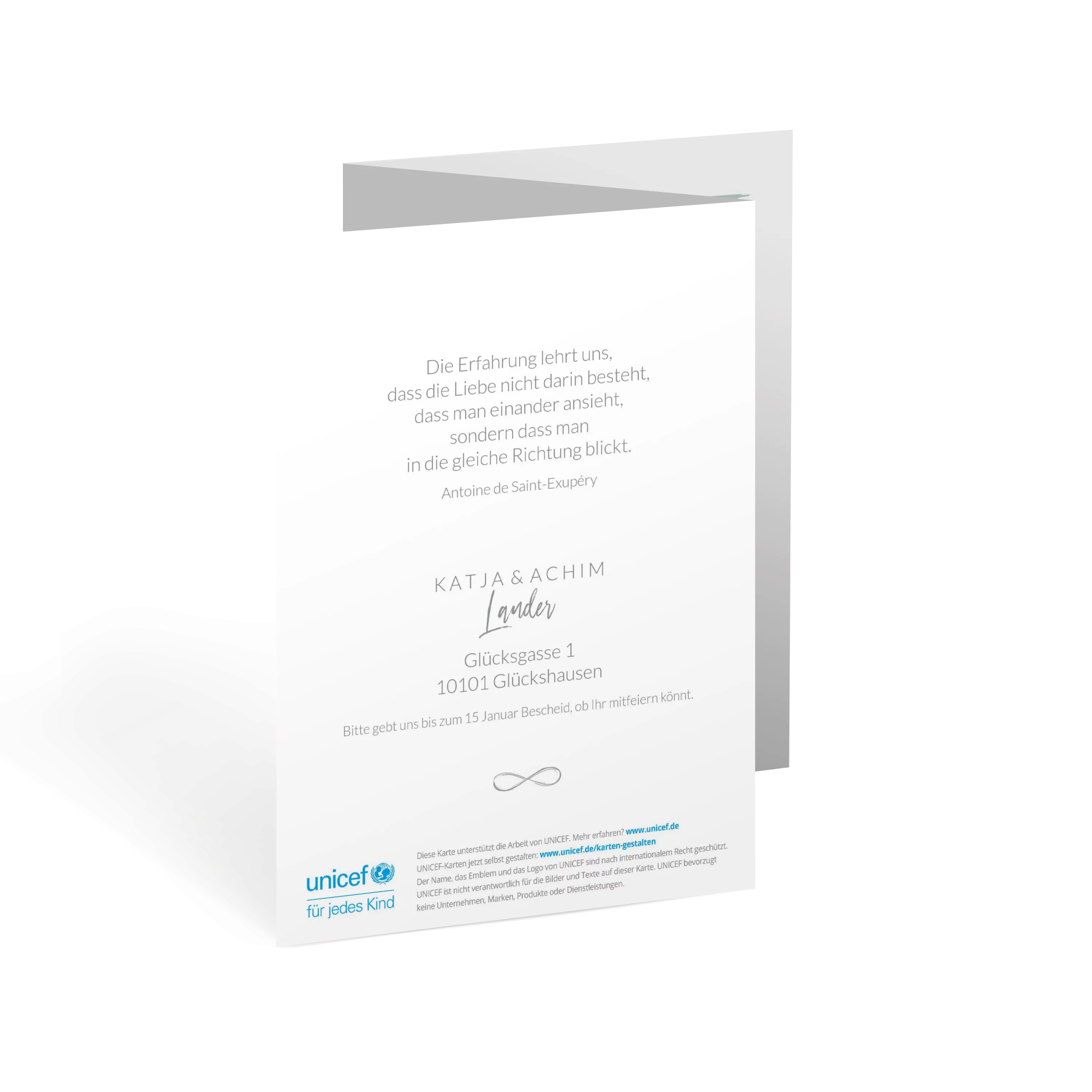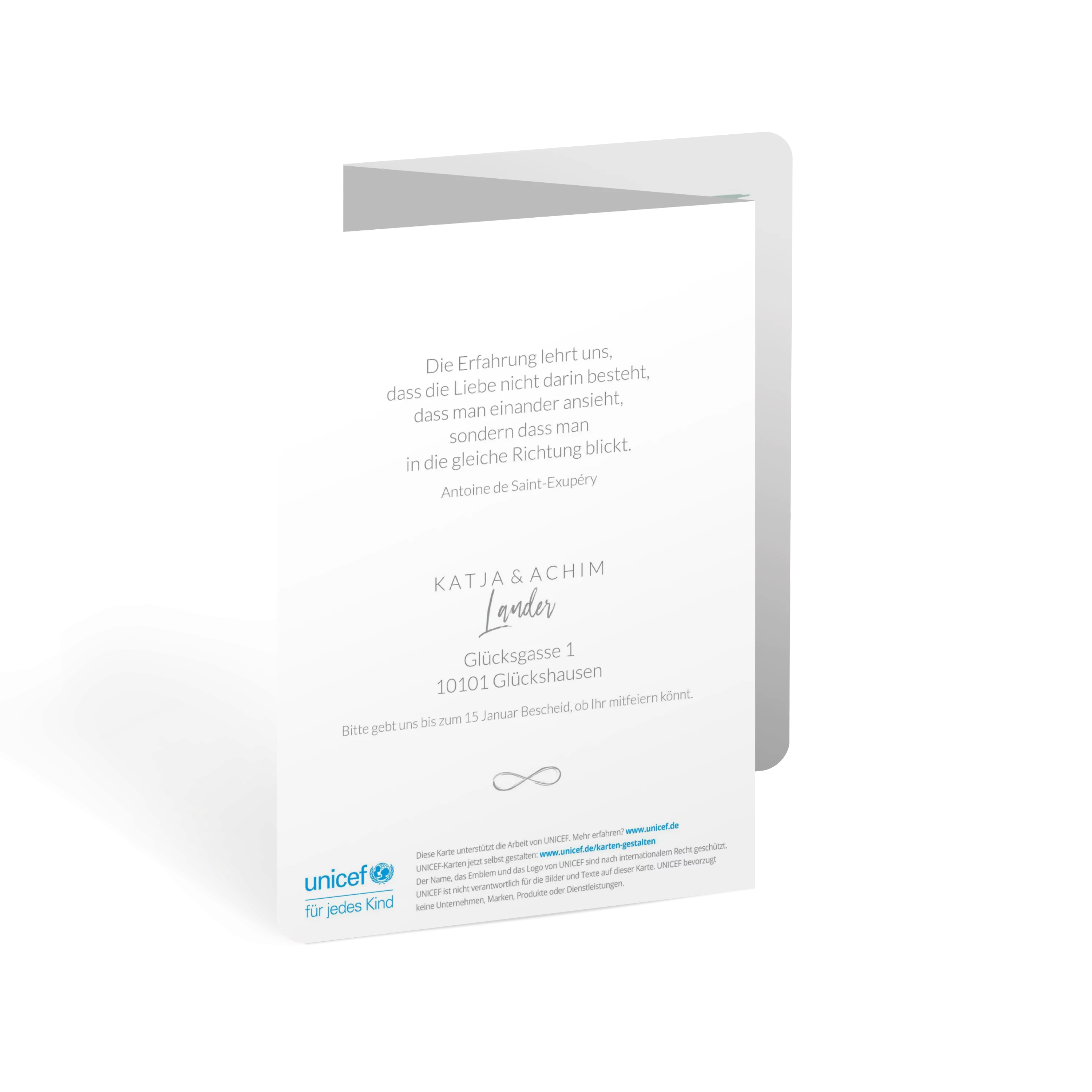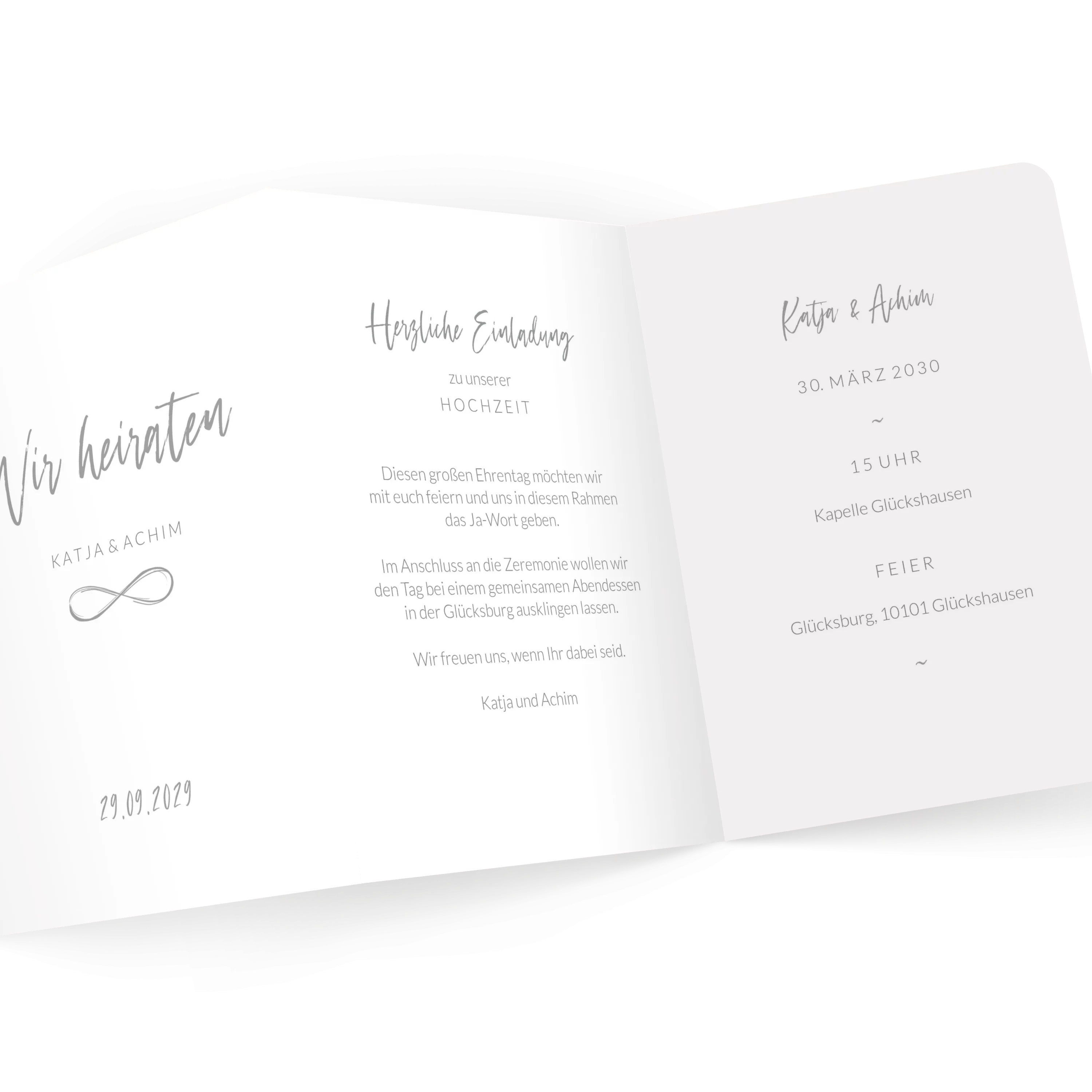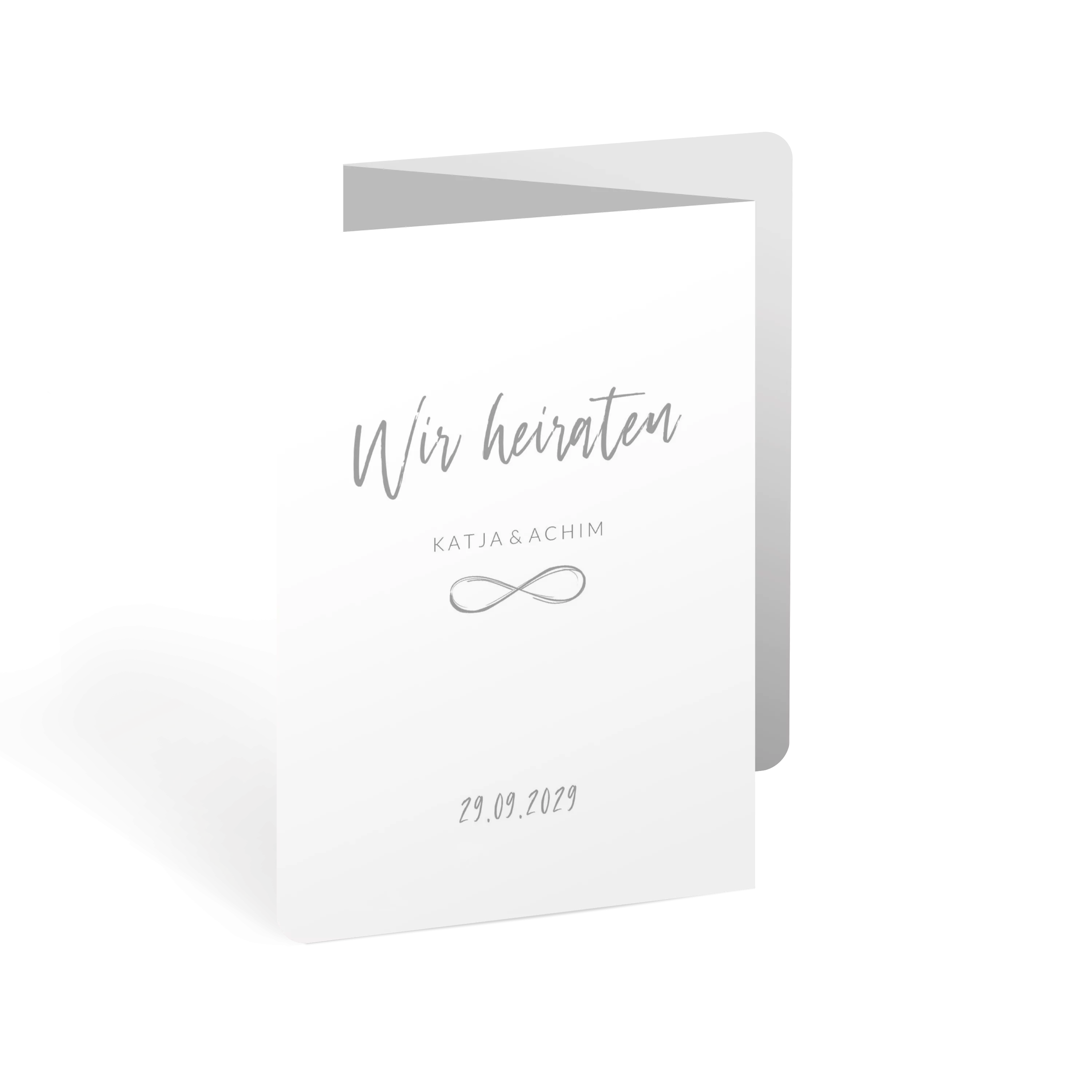 Schlichte Eleganz trifft auf tiefe Bedeutung: Diese minimalistische Hochzeitskarte mit Unendlichkeitssymbol und feiner Typografie feiert die Liebe – klar, modern und zeitlos. Für alle, die leise Töne sprechen lassen möchten.