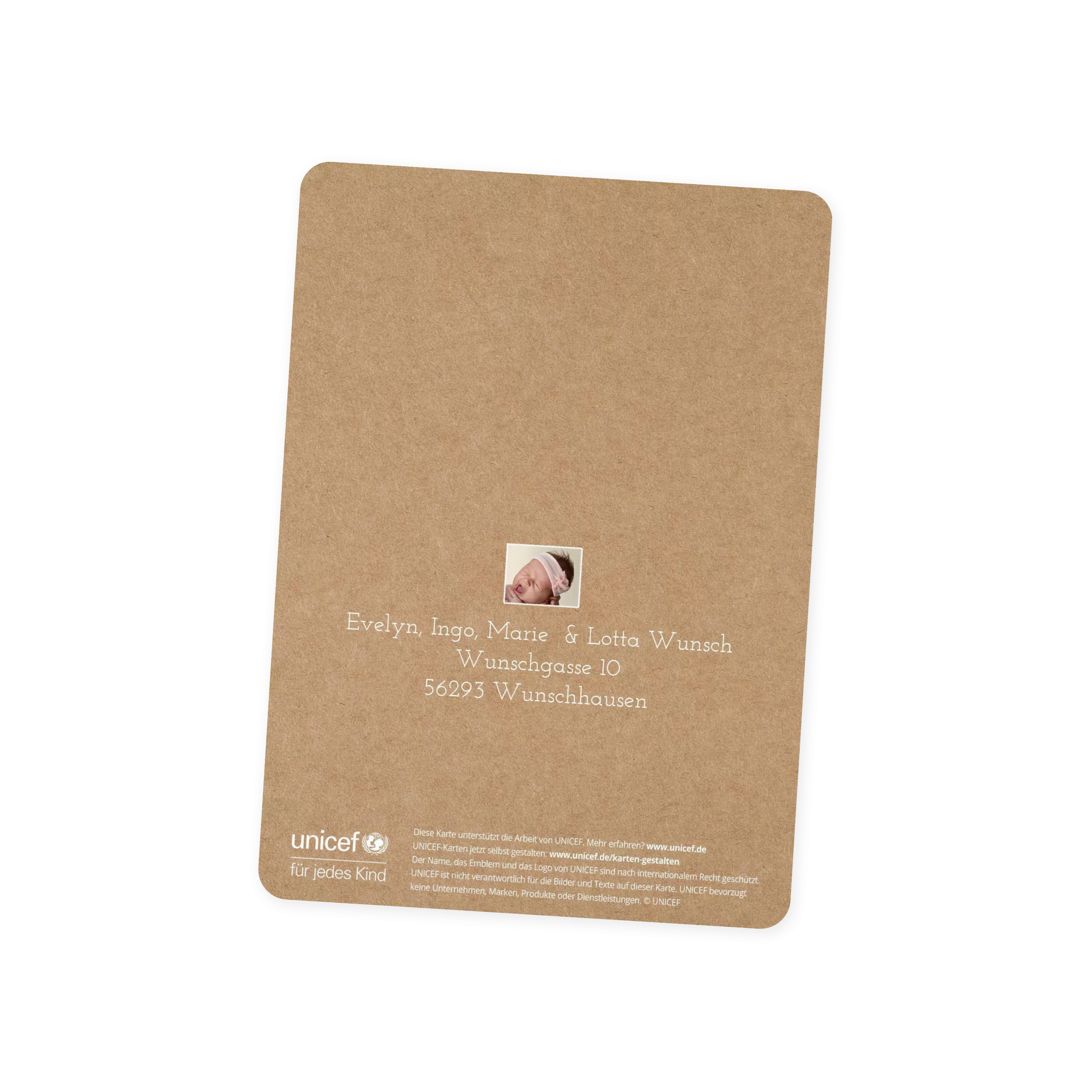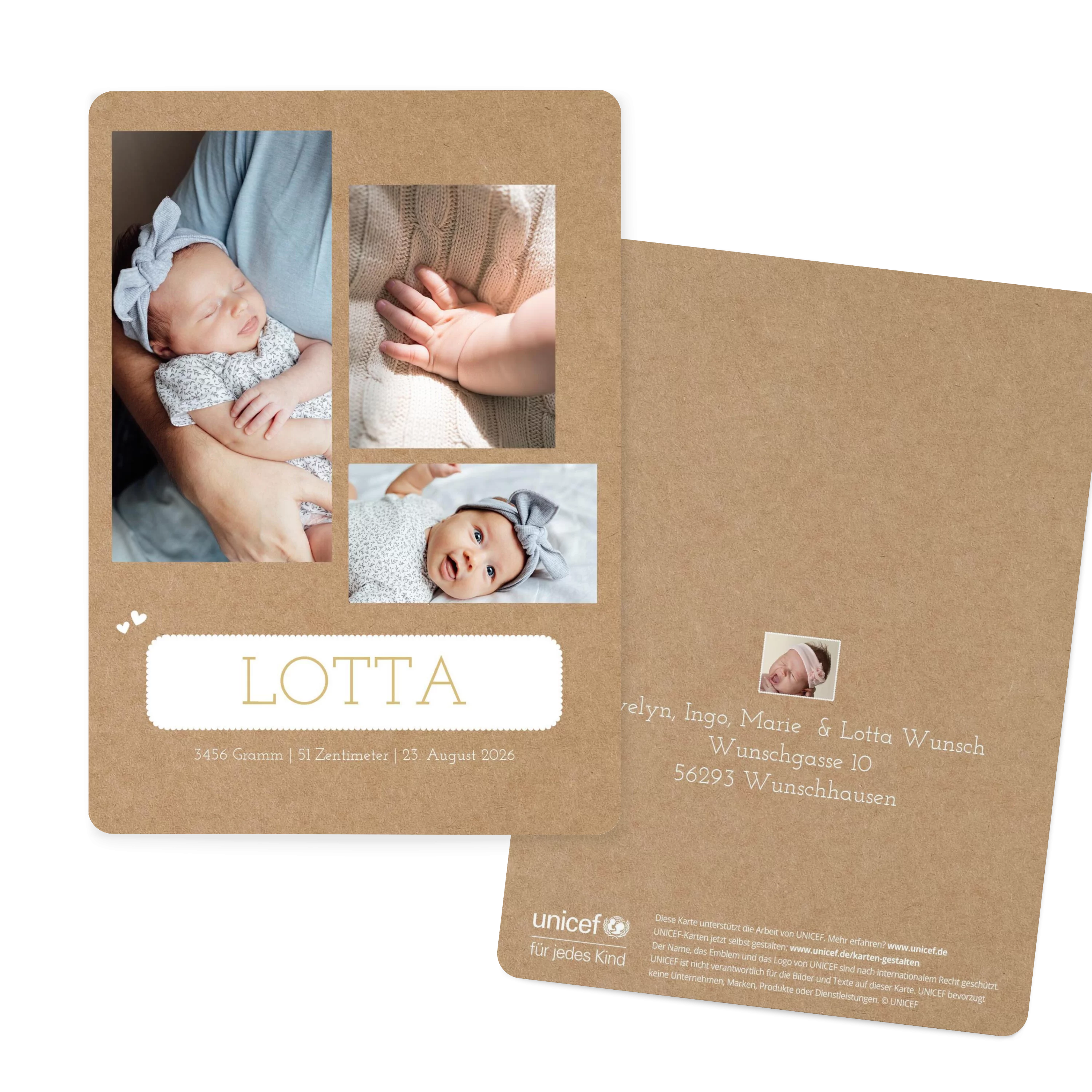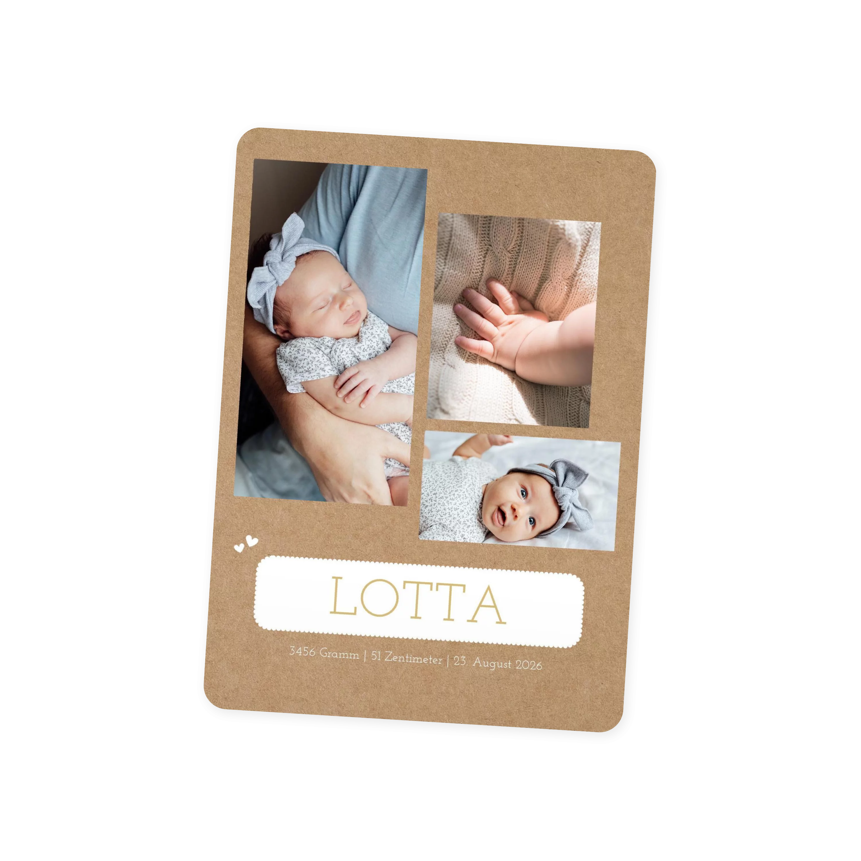 Diese Geburtskarte vereint eine natürliche Kraftpapier-Optik mit einer klaren, modernen Aufteilung für drei eigene Fotos. Der weiße Namensrahmen und kleine Herzsymbole setzen liebevolle Akzente – eine persönliche Karte mit handgemachtem Charakter.