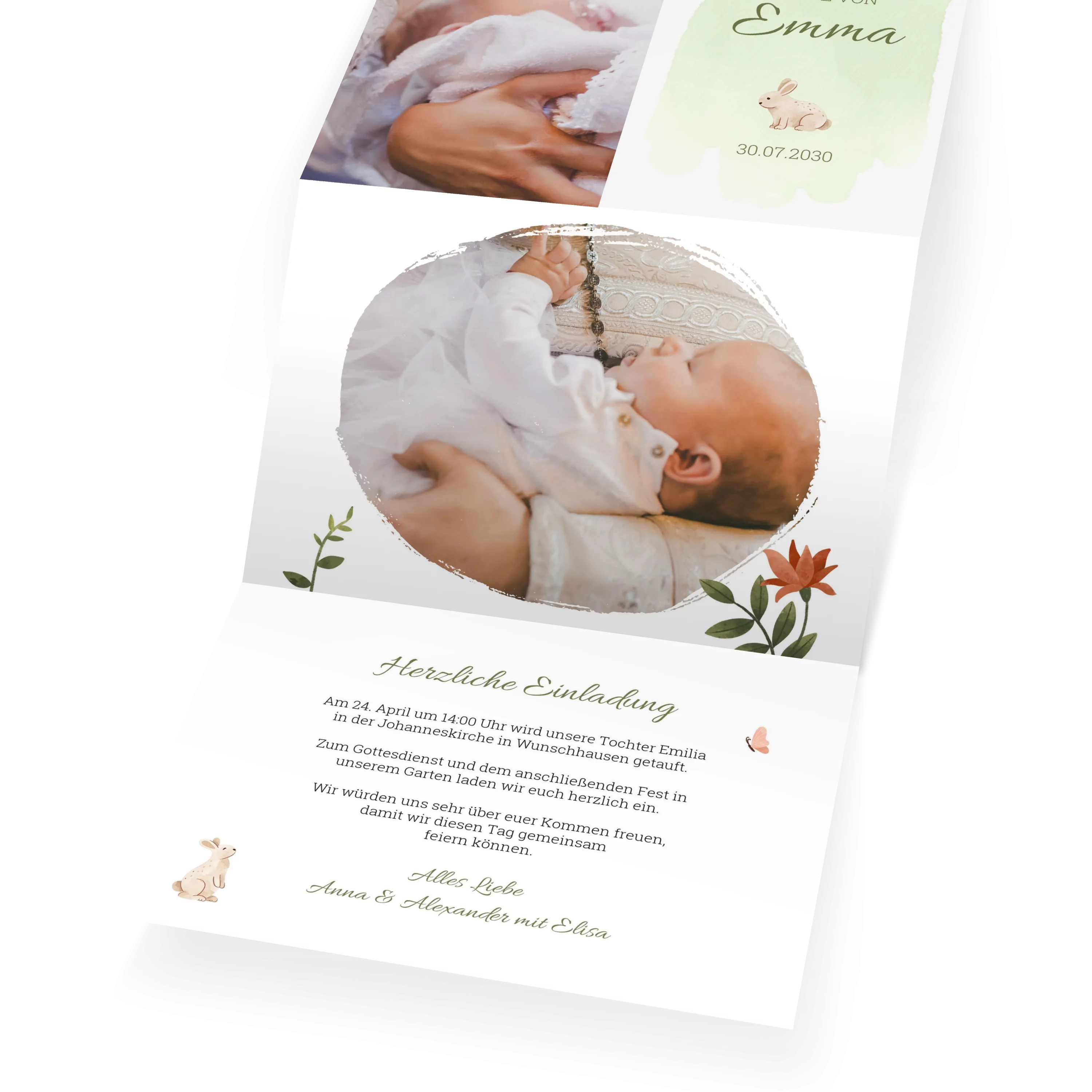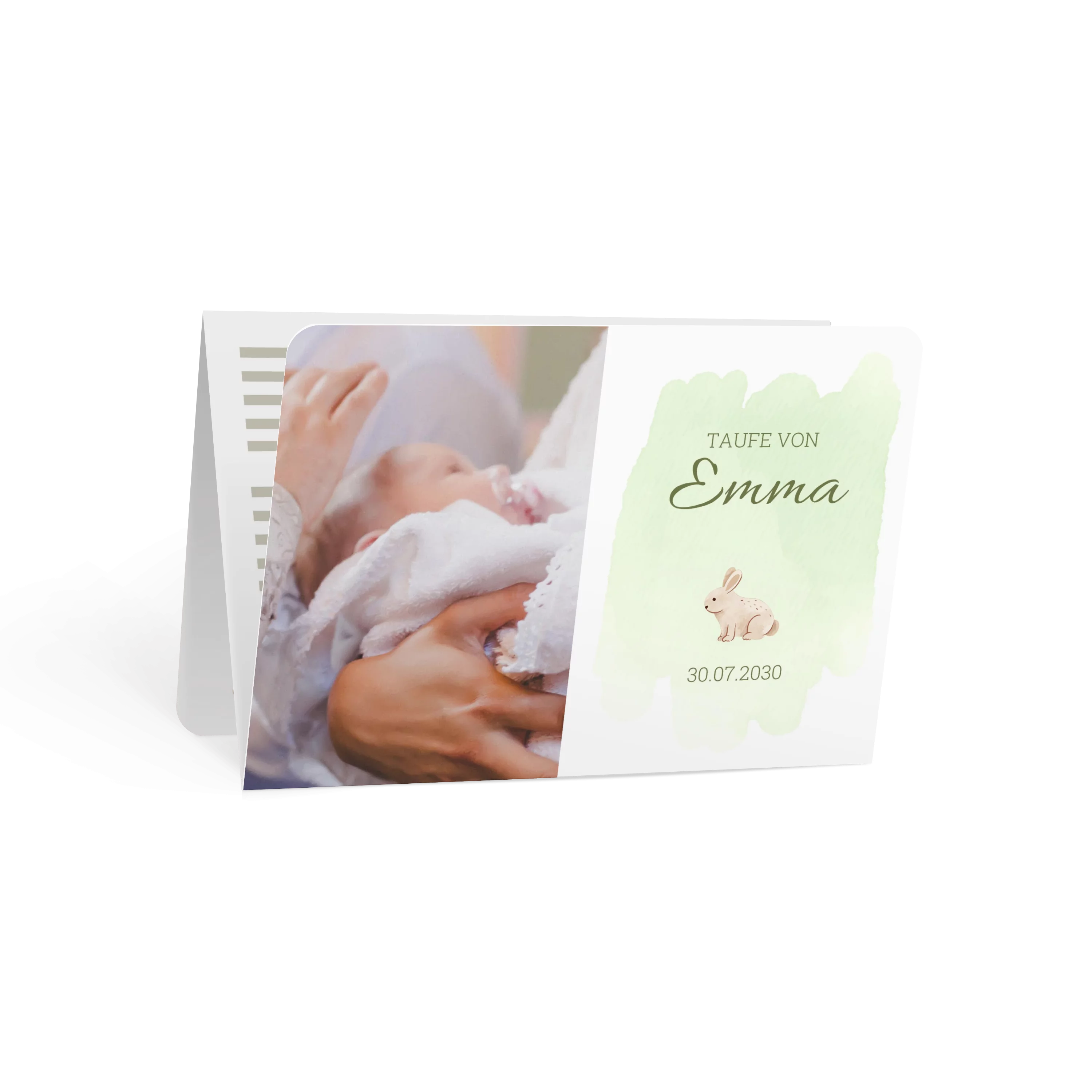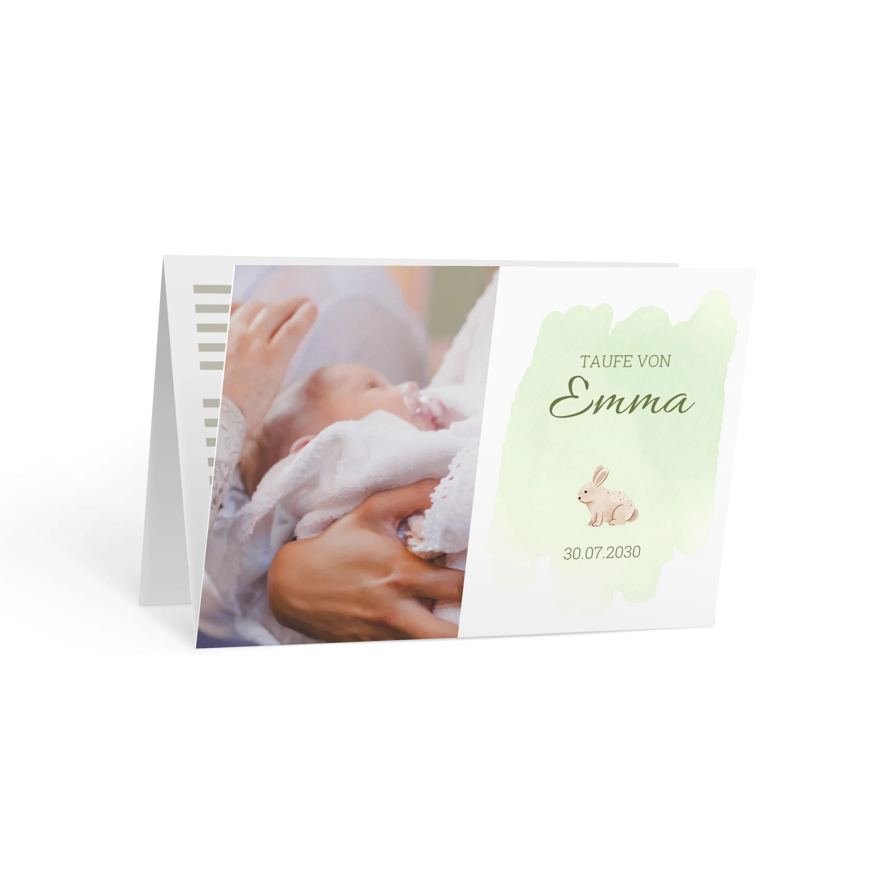 Ein sanfter Aquarellhintergrund in Mintgrün trifft auf zarte Typografie und ein kleines, liebevoll gezeichnetes Häschen. Die rechte Seite ist klar gestaltet, während links ein großes Foto Raum für einen persönlichen Taufmoment bietet – ruhig, weich und charmant.