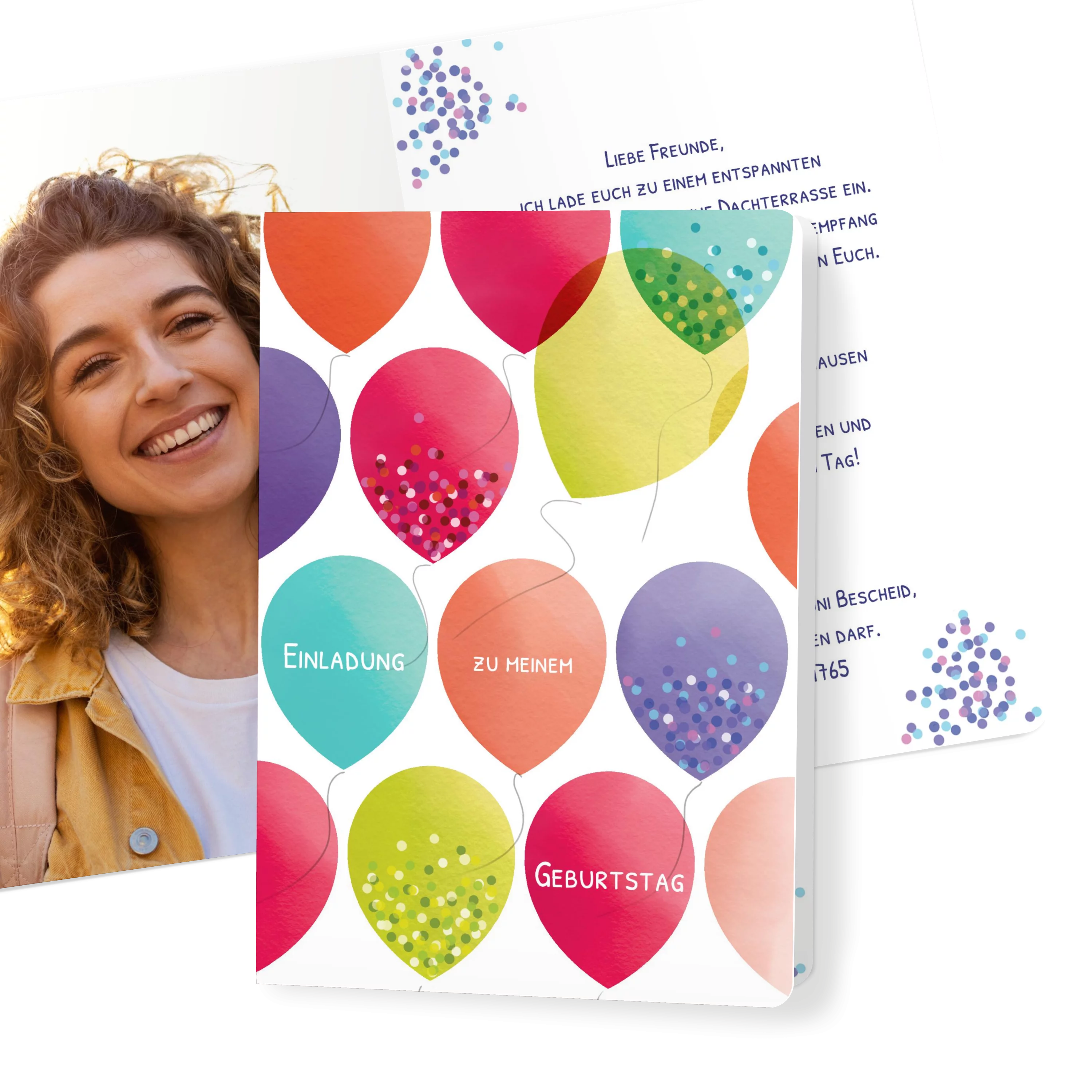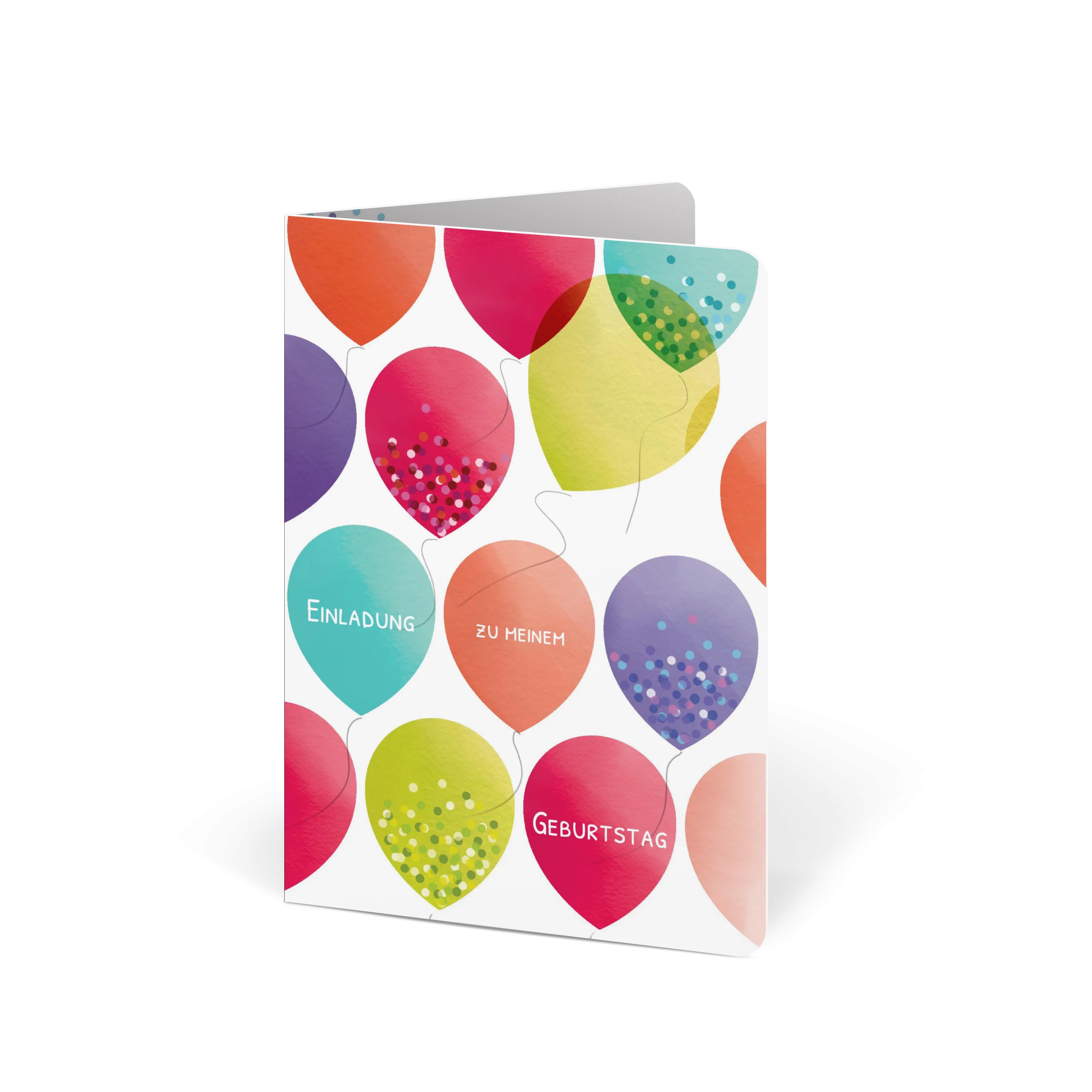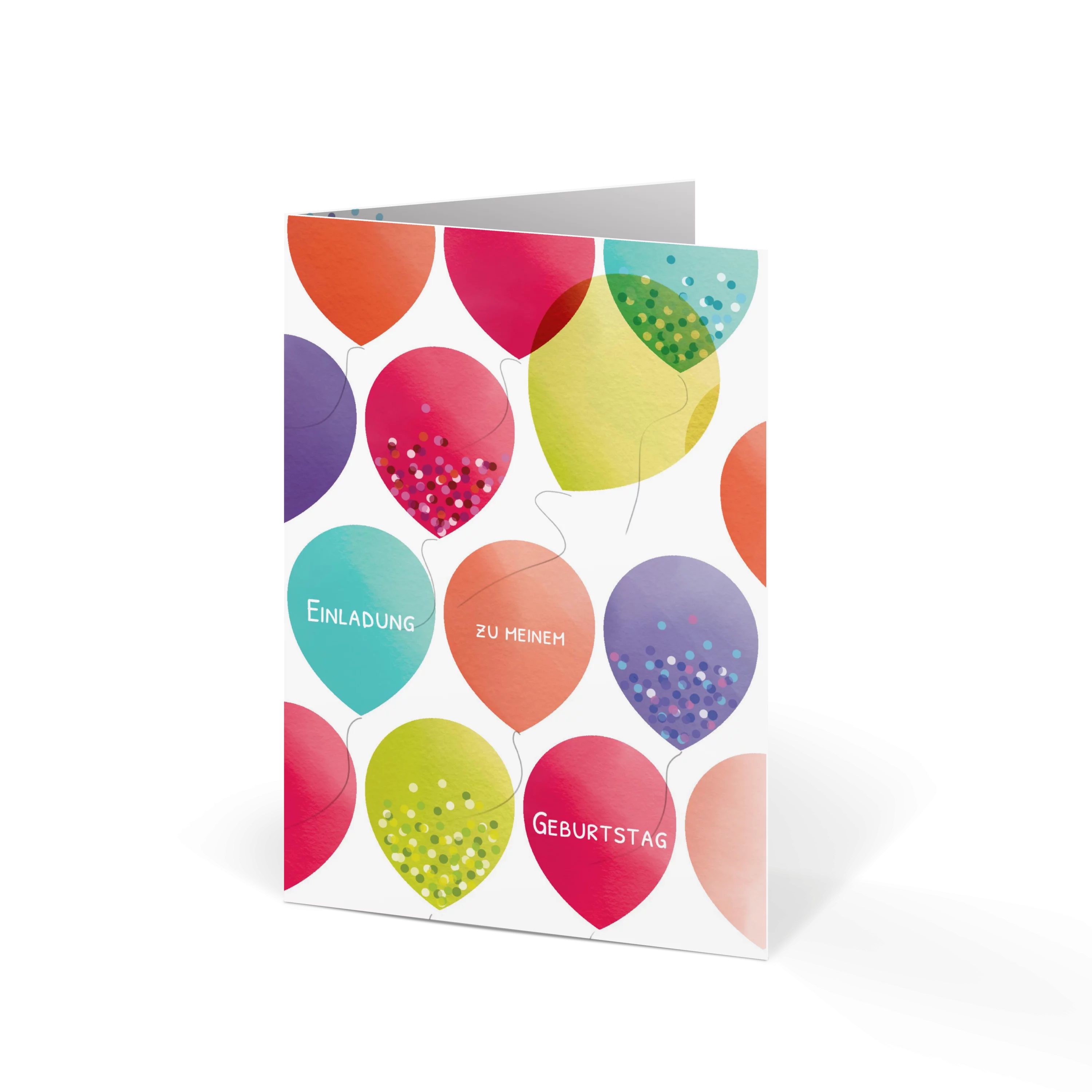 Mit dieser Einladungskarte in leuchtenden Farben und fröhlichem Konfetti-Muster kommt garantiert Partystimmung auf. Die bunten Ballons auf weißem Hintergrund sind perfekt, um Gäste zu einem fröhlichen Geburtstagsfest einzuladen.