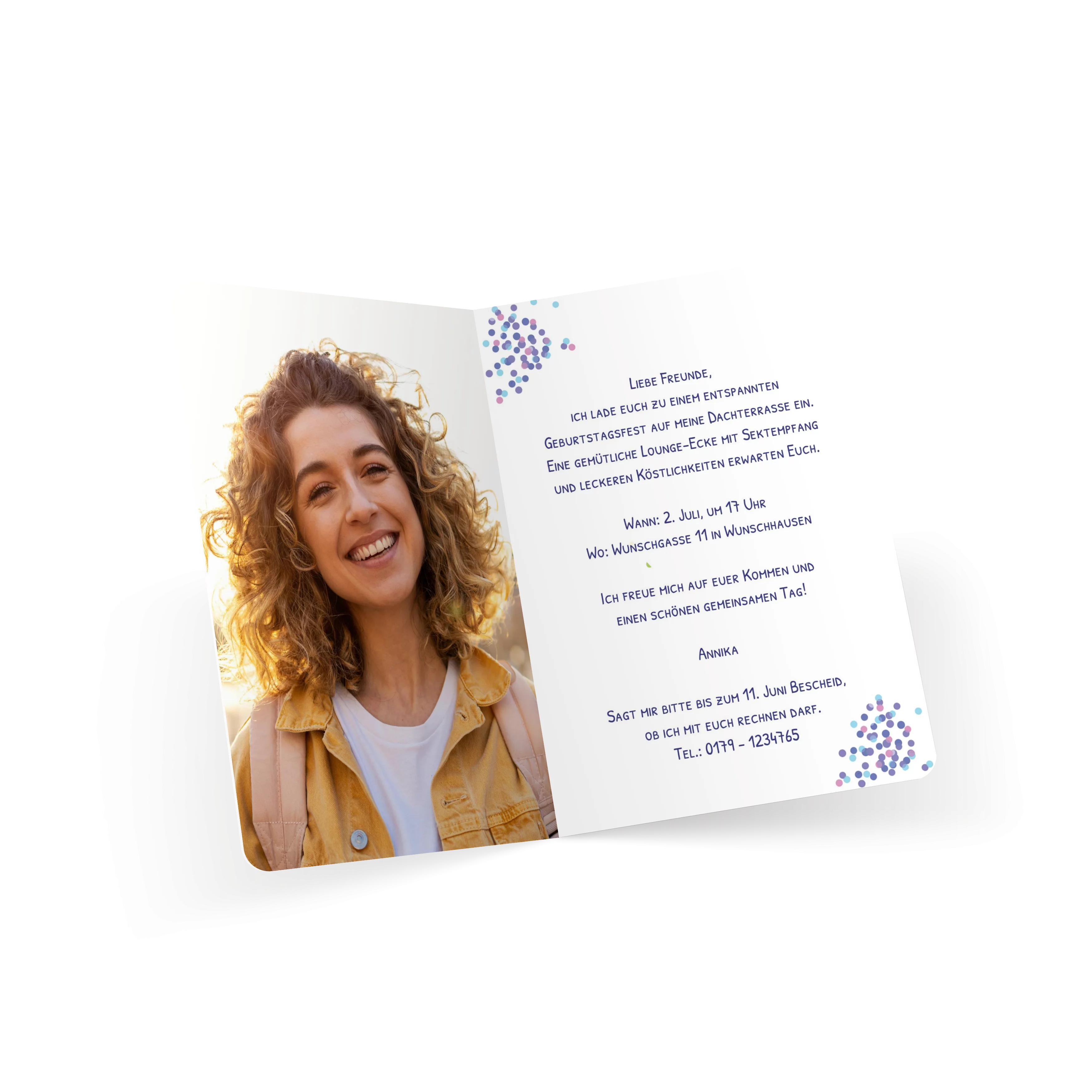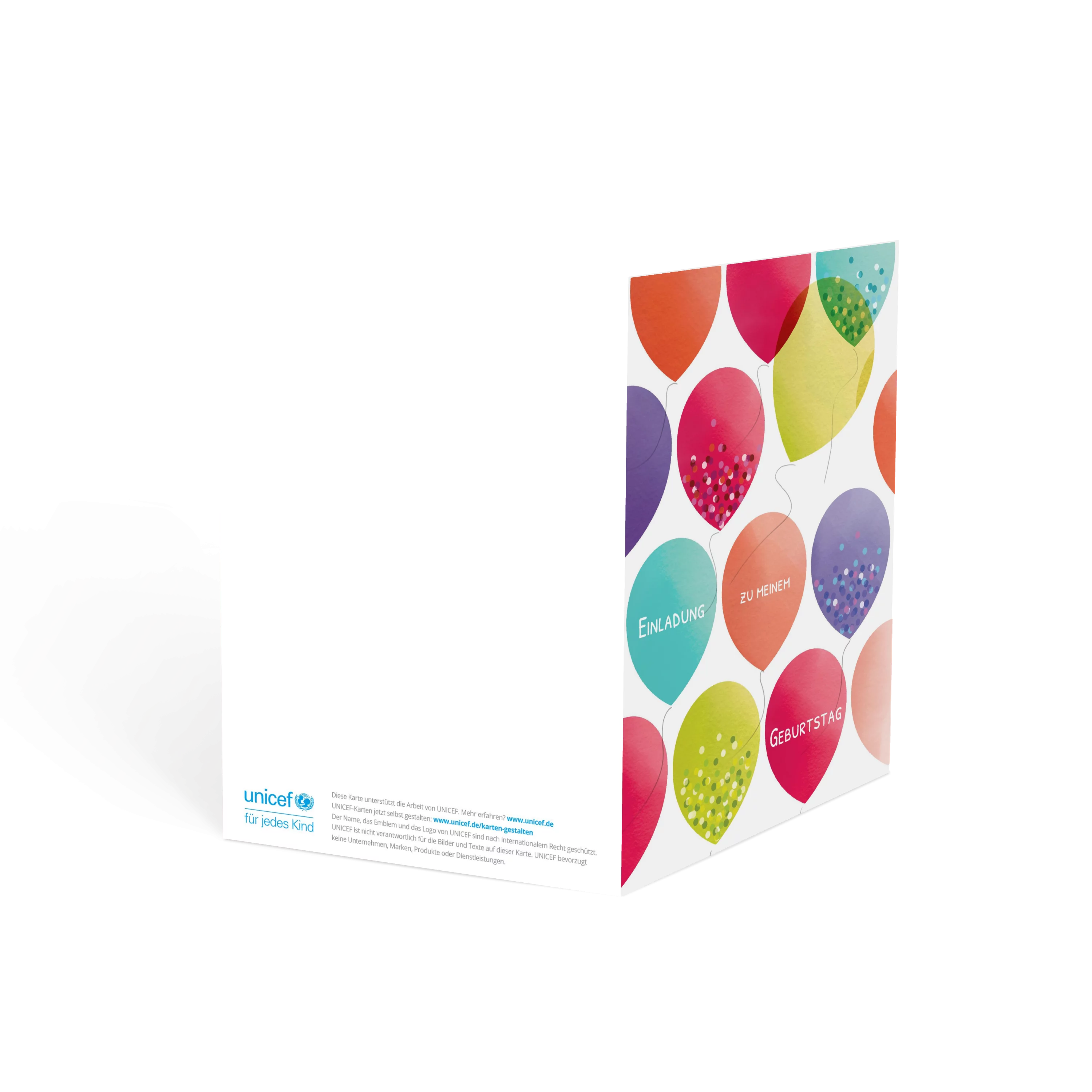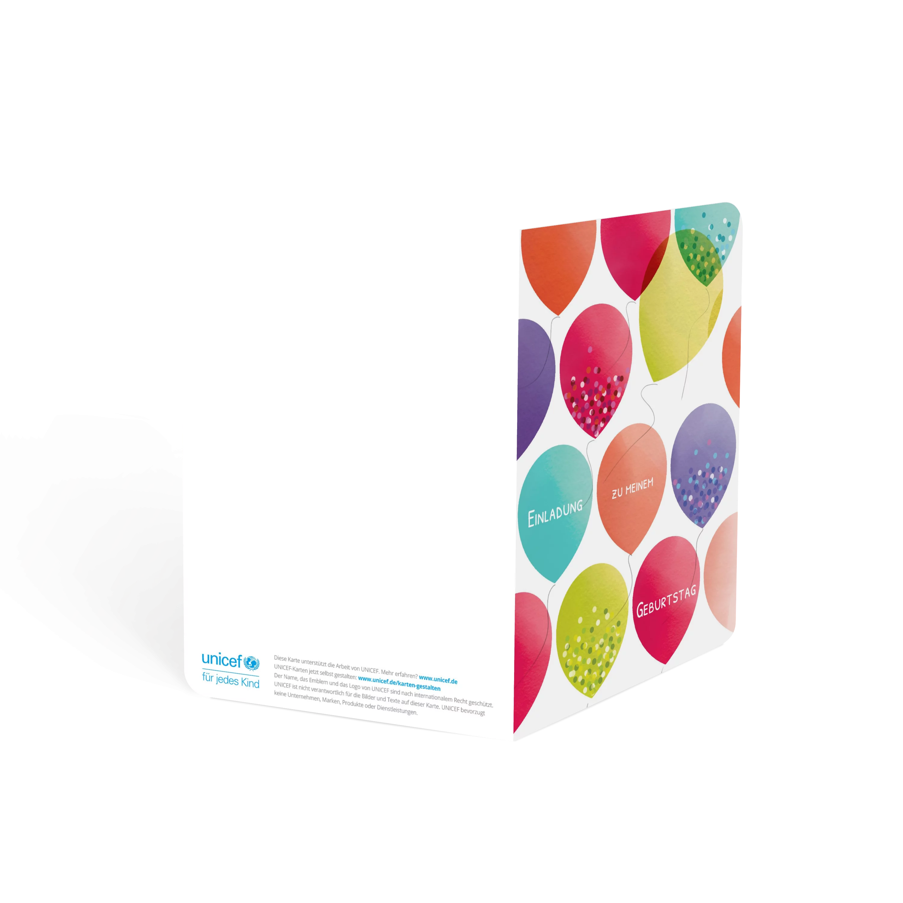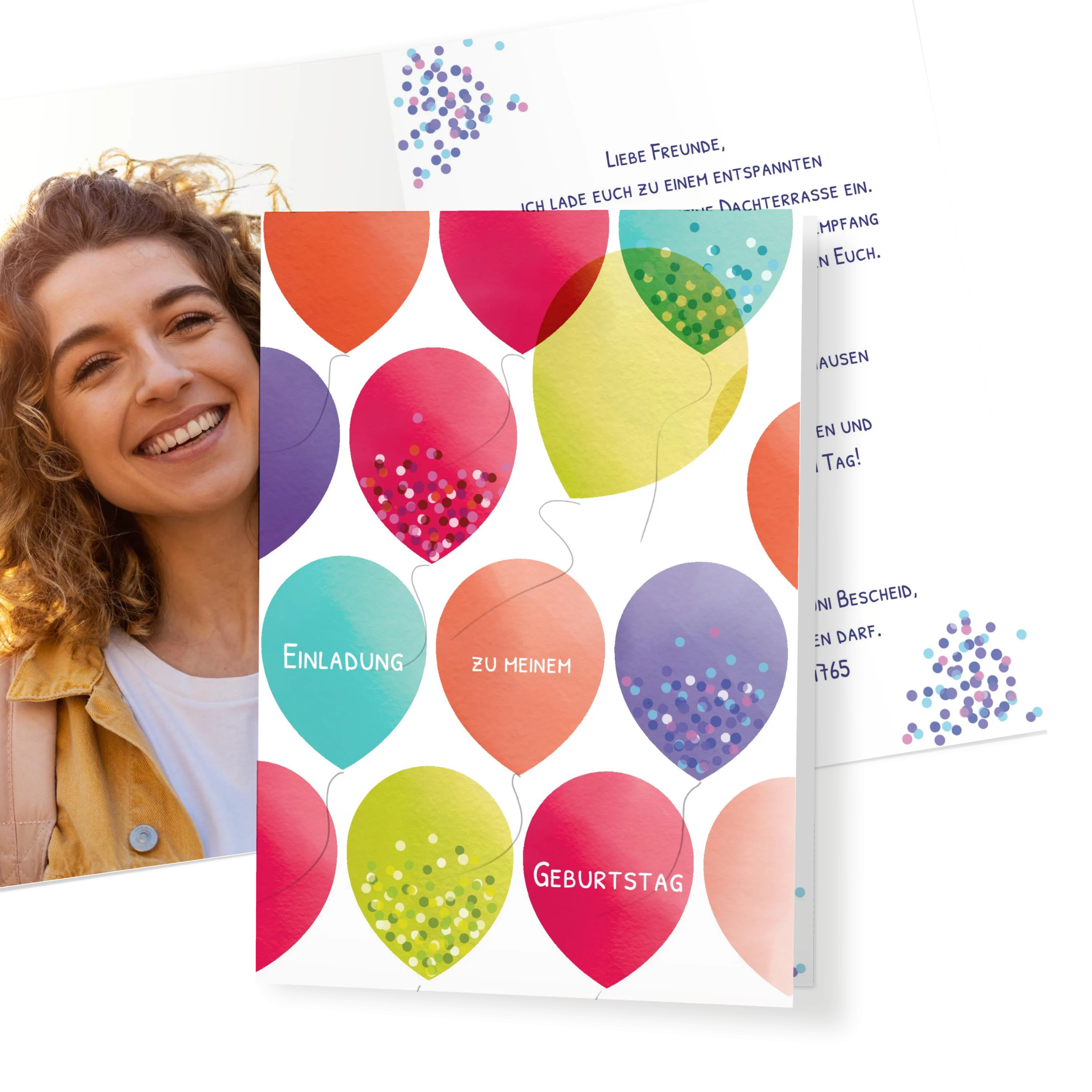 Mit dieser Einladungskarte in leuchtenden Farben und fröhlichem Konfetti-Muster kommt garantiert Partystimmung auf. Die bunten Ballons auf weißem Hintergrund sind perfekt, um Gäste zu einem fröhlichen Geburtstagsfest einzuladen.